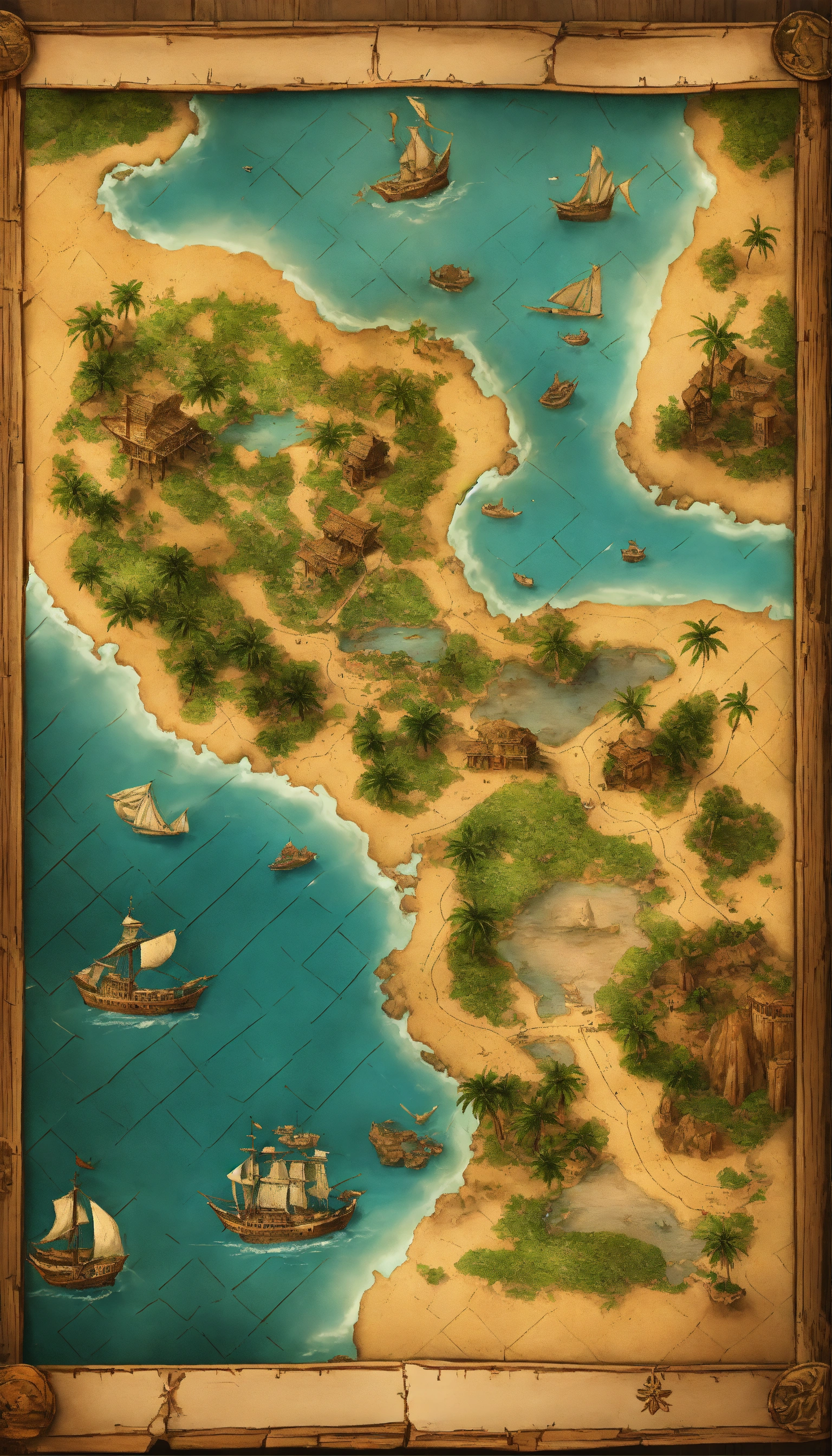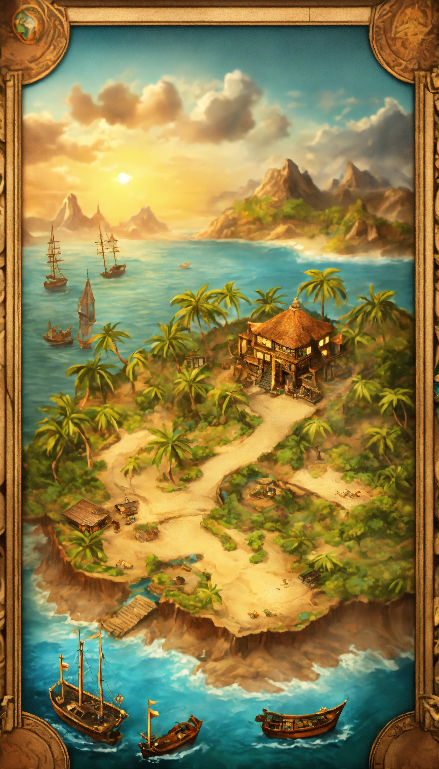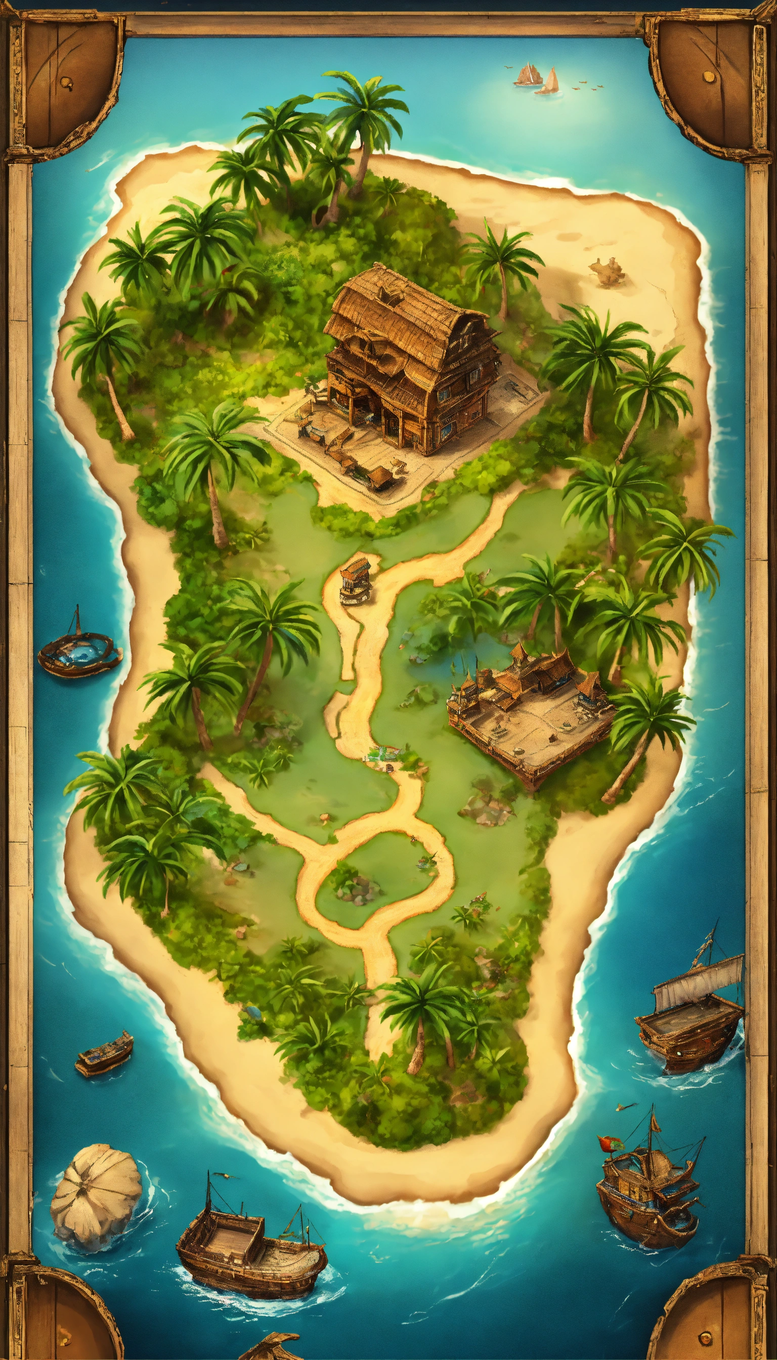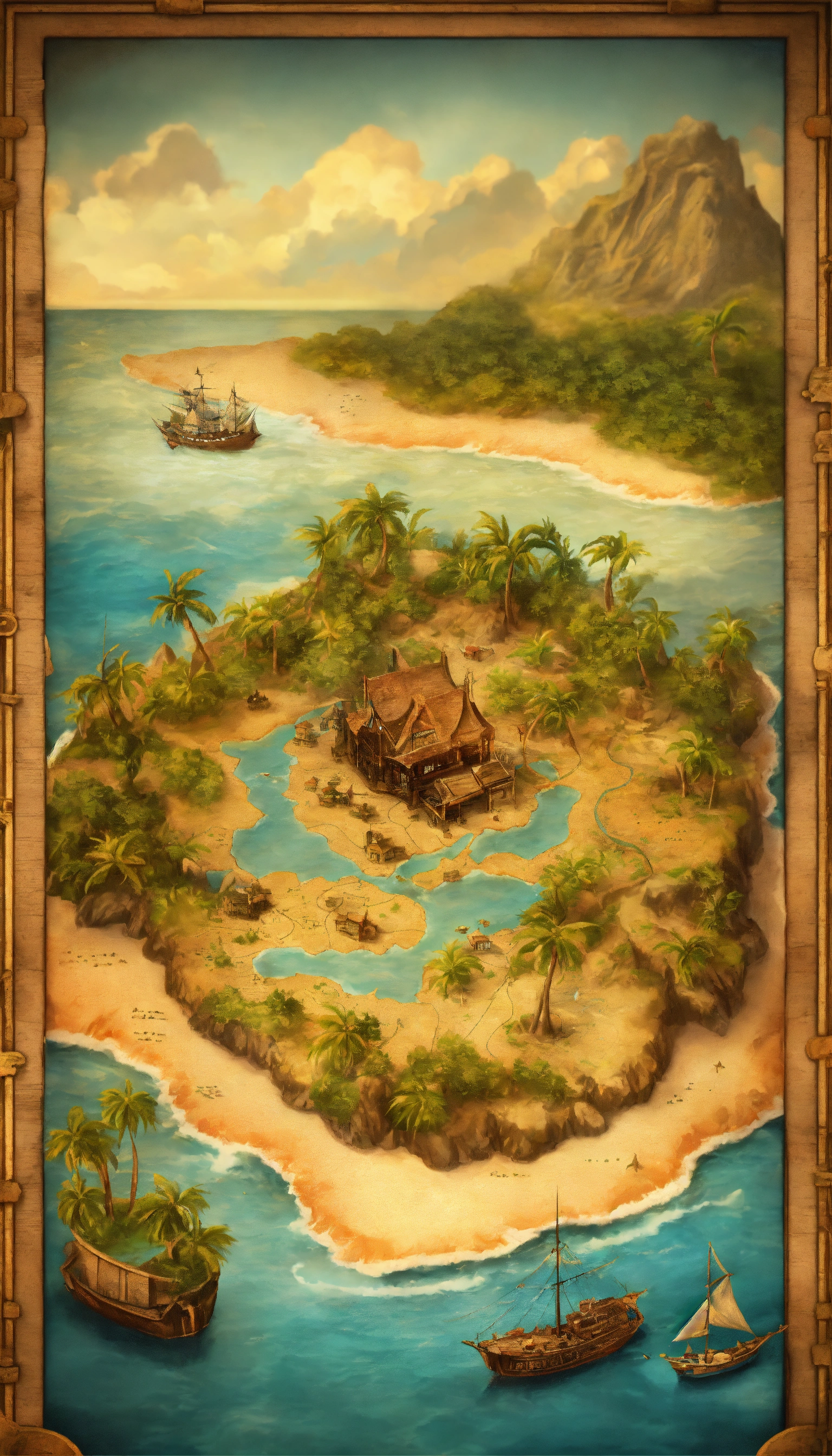 An old ancient map, ocean with palms on a island, 8k, detailed hd, realistic, board game type with treasure chest on it