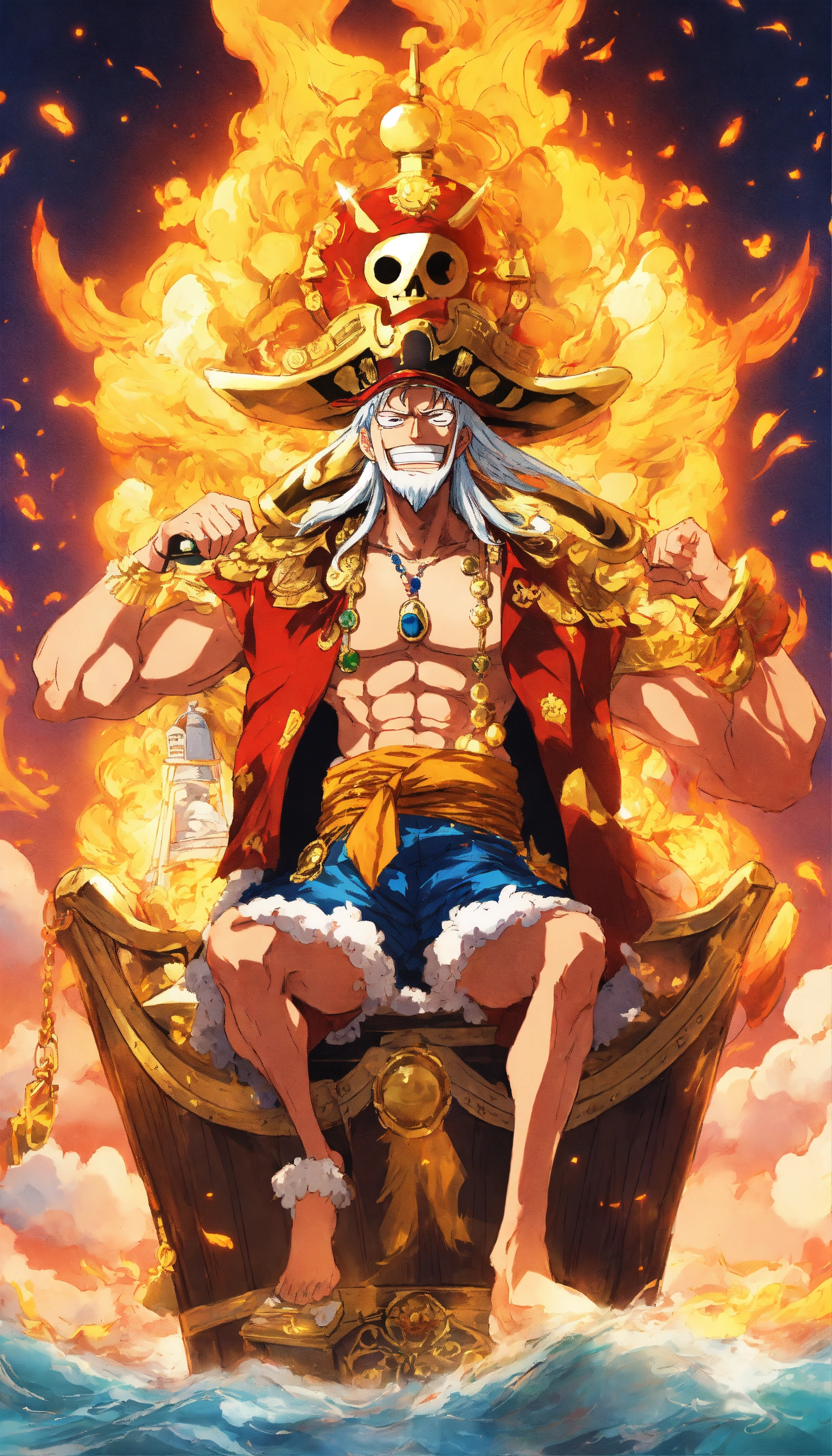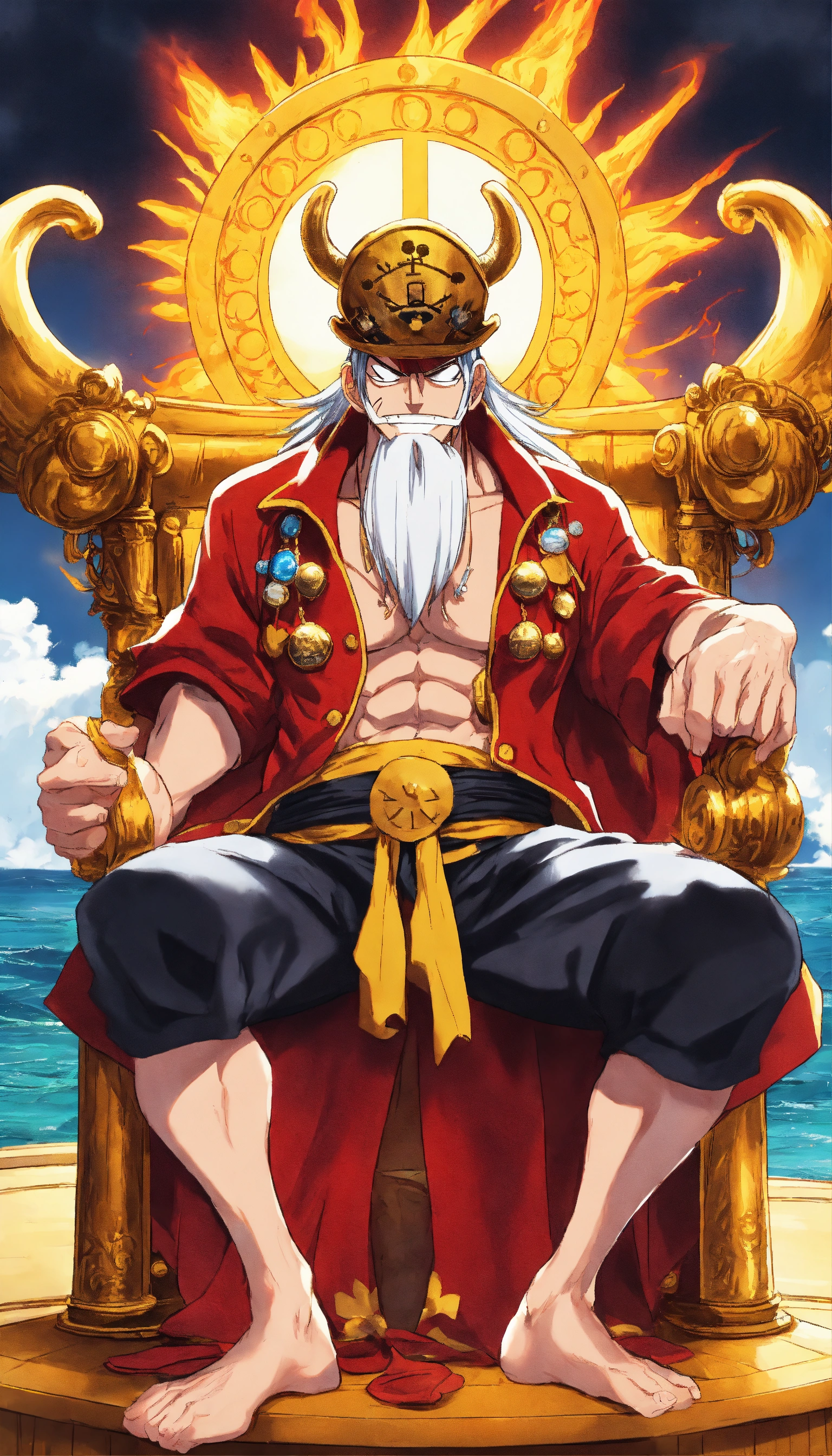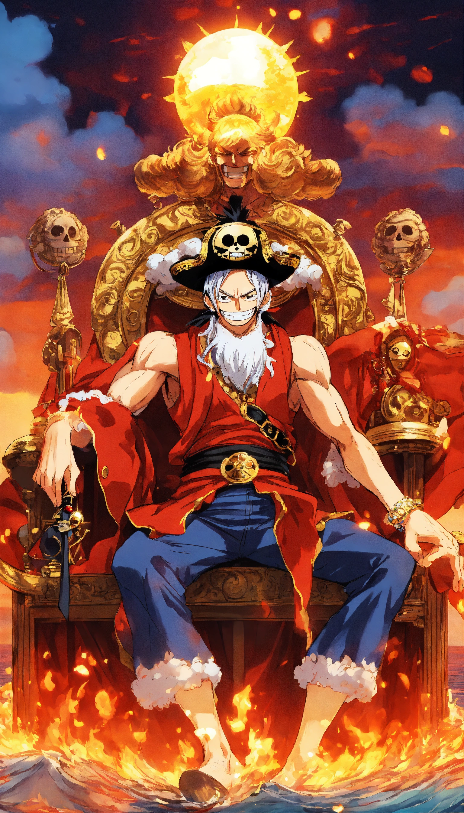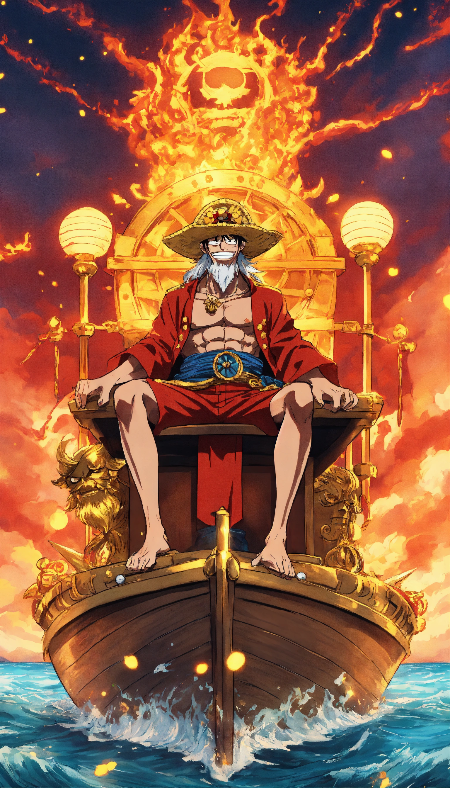 Smiling old luffy as pirate captain from one piece with long white pointed hair and horns with a muscular physique dressed as the sun god from one piece with jewels and gilding sitting on a throne in a boat sailing on a sea of fire color manga drawing eiichiro oda
