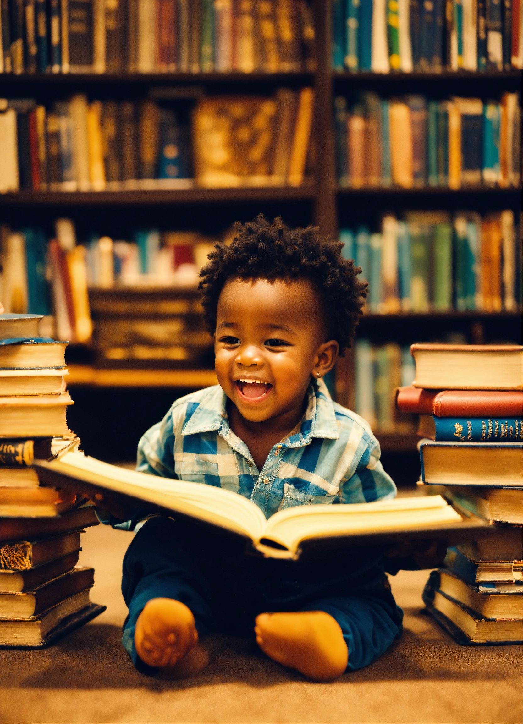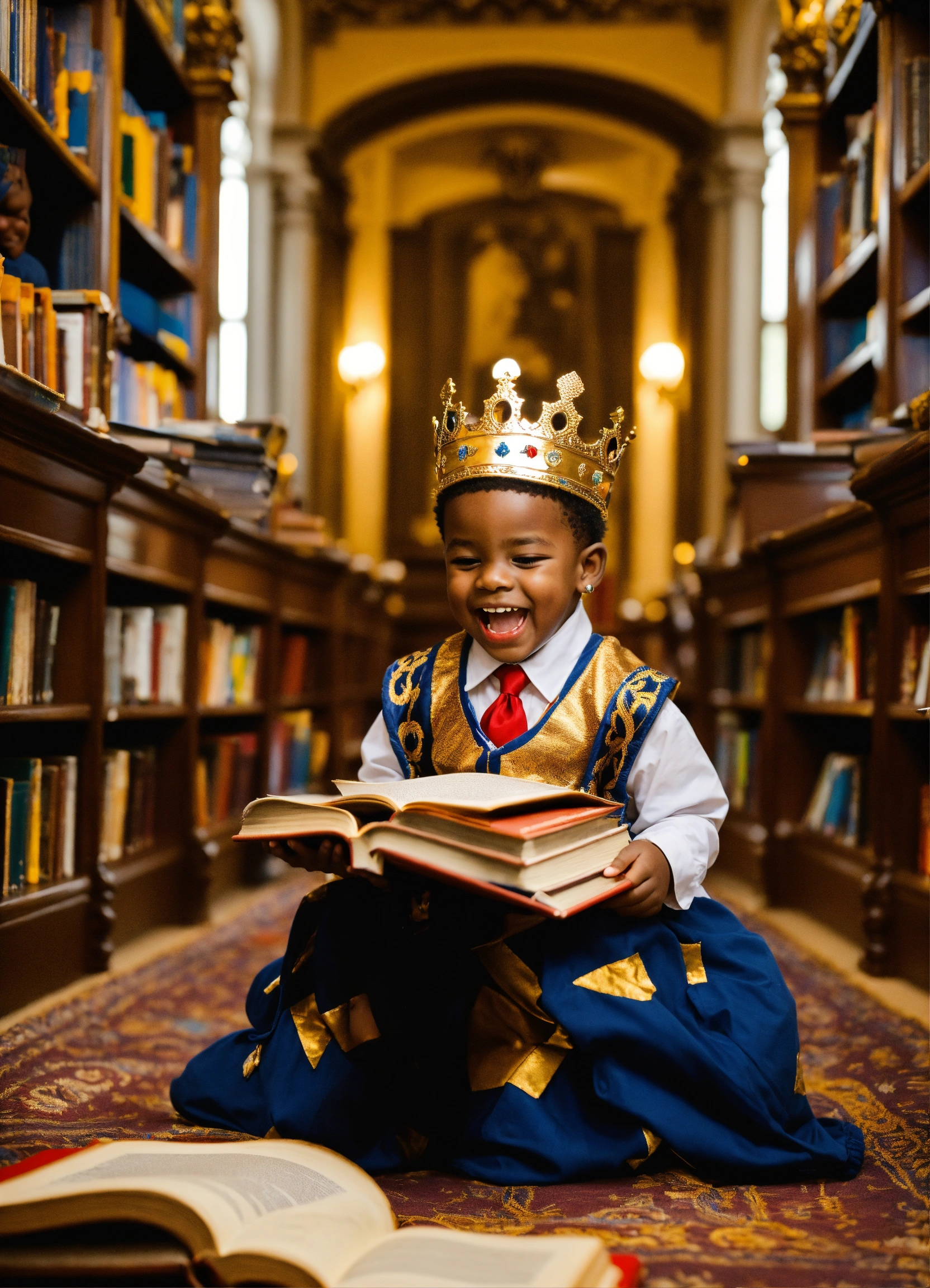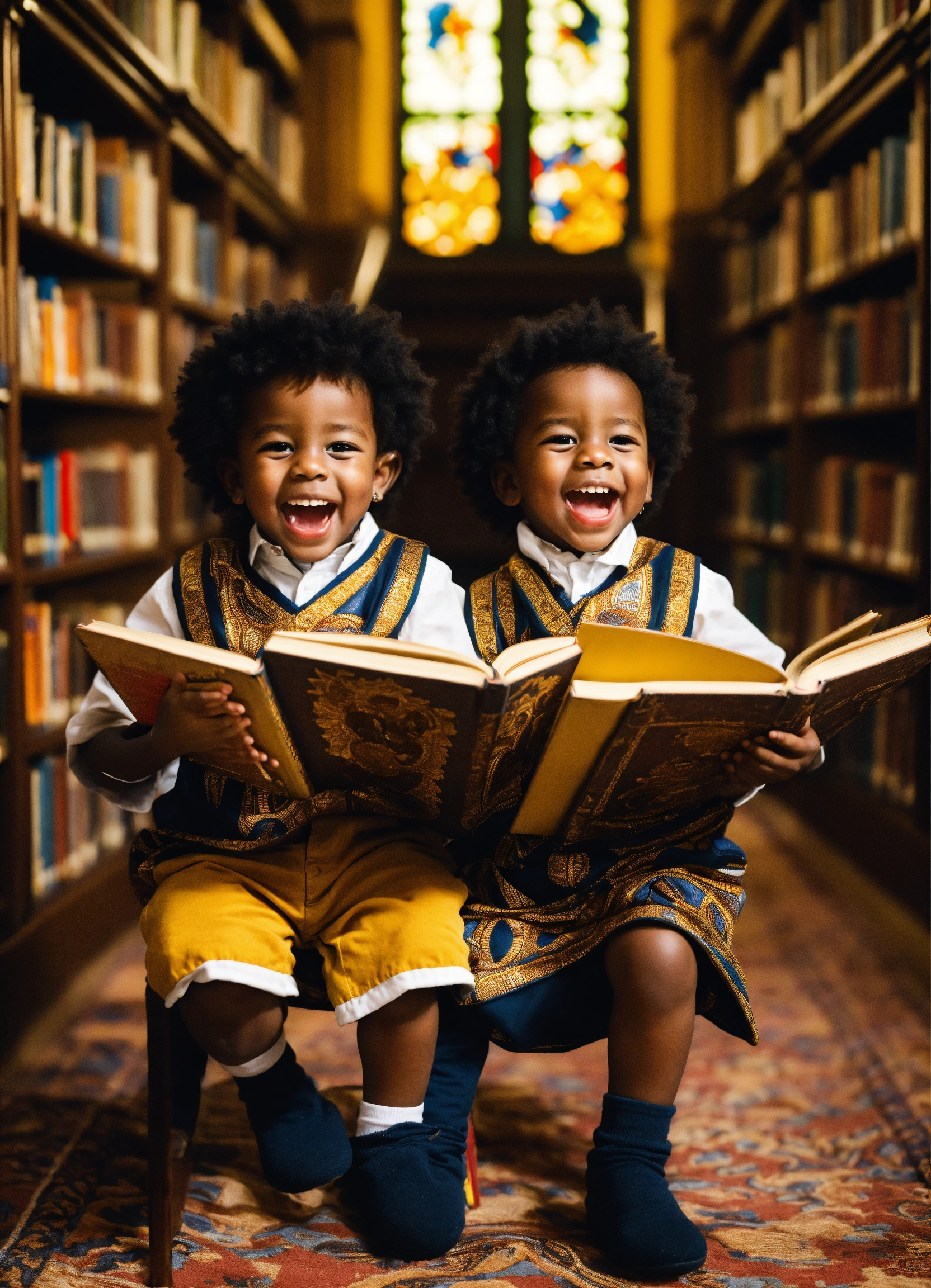 Very beautiful dark skinned african american toddler boys dressed as kings roaring with laughter with books all around them in a library