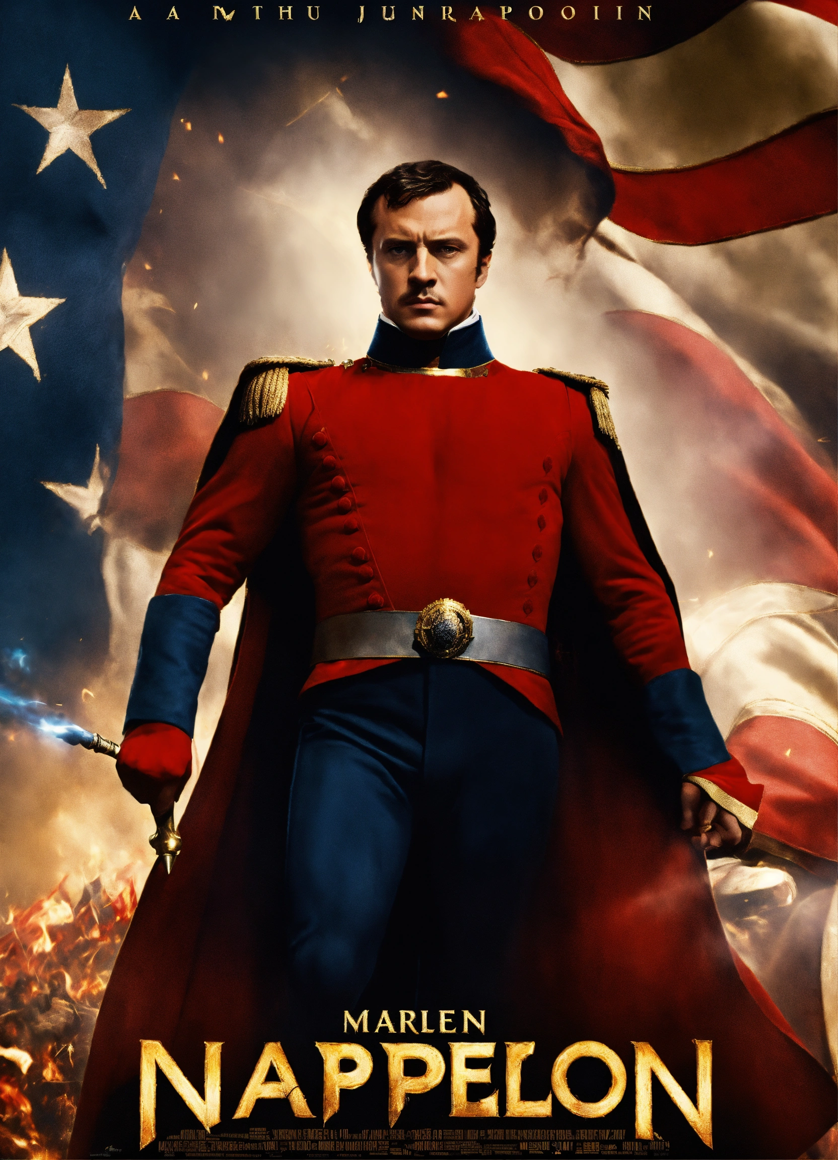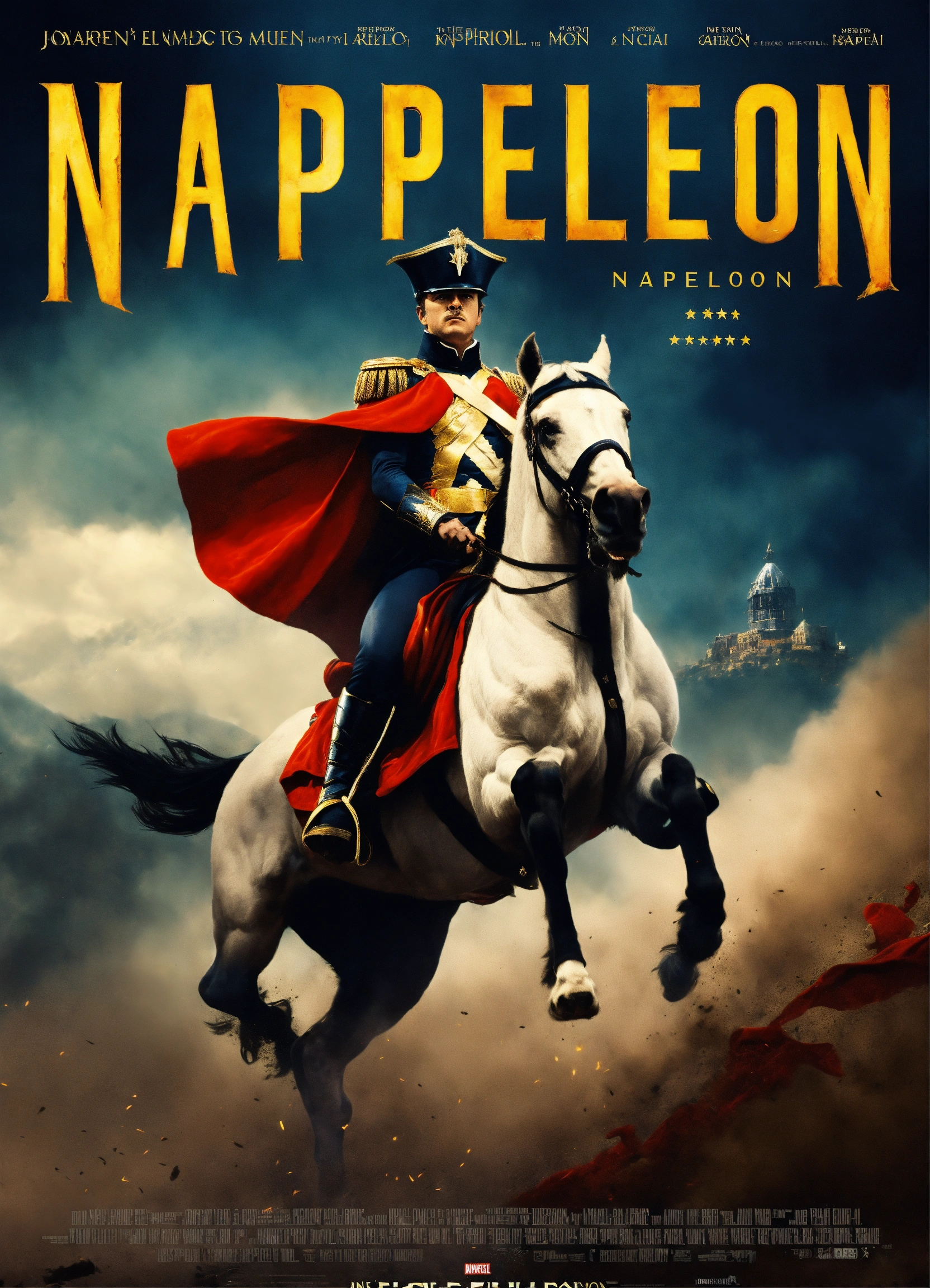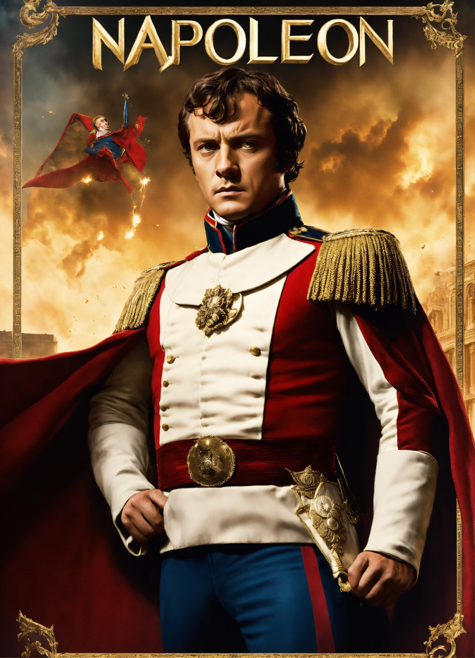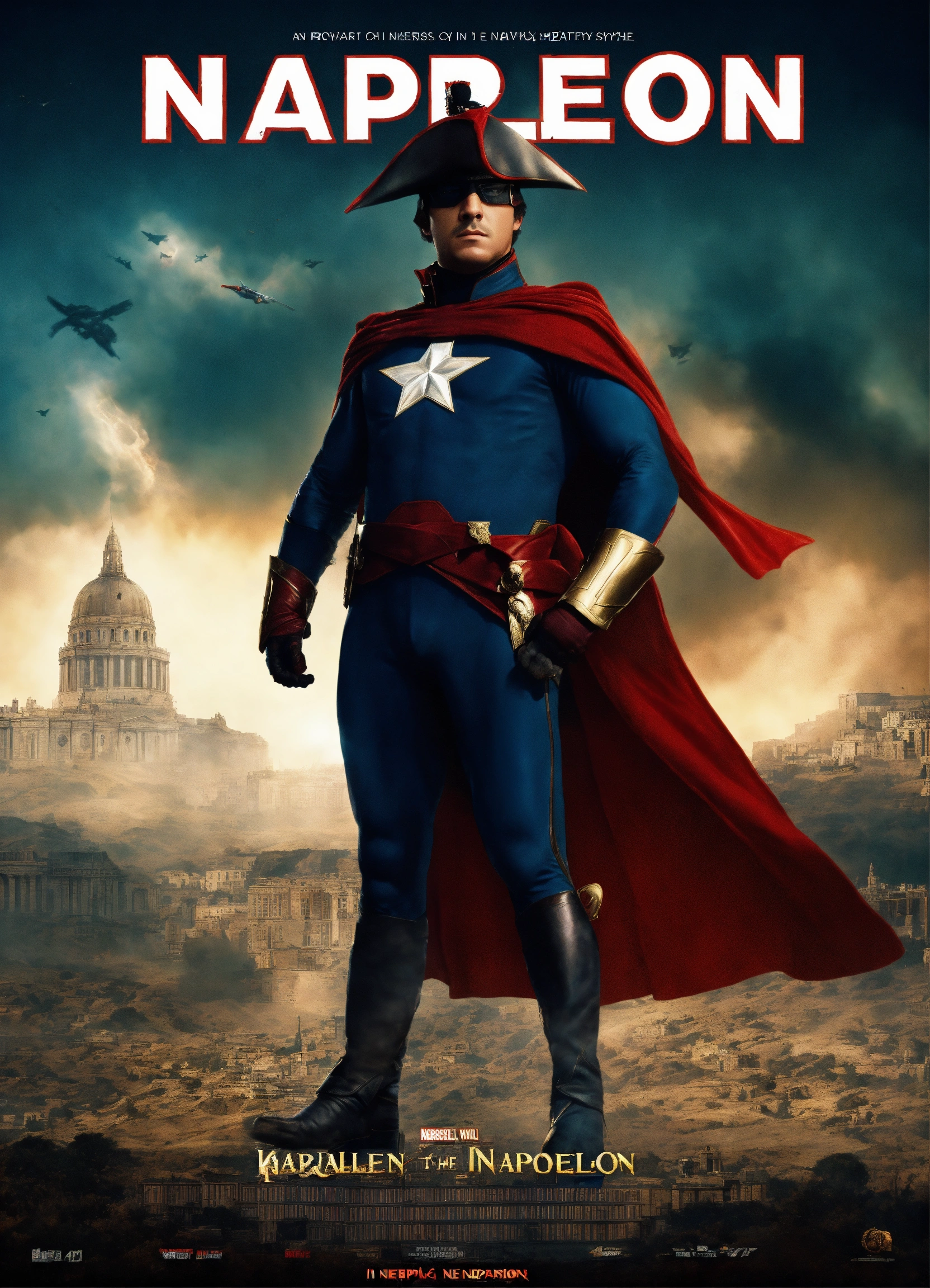 In the style of a marvel movie, a movie poster about "napoleon" showing him as a superhero. spell "napoleon" correctly.