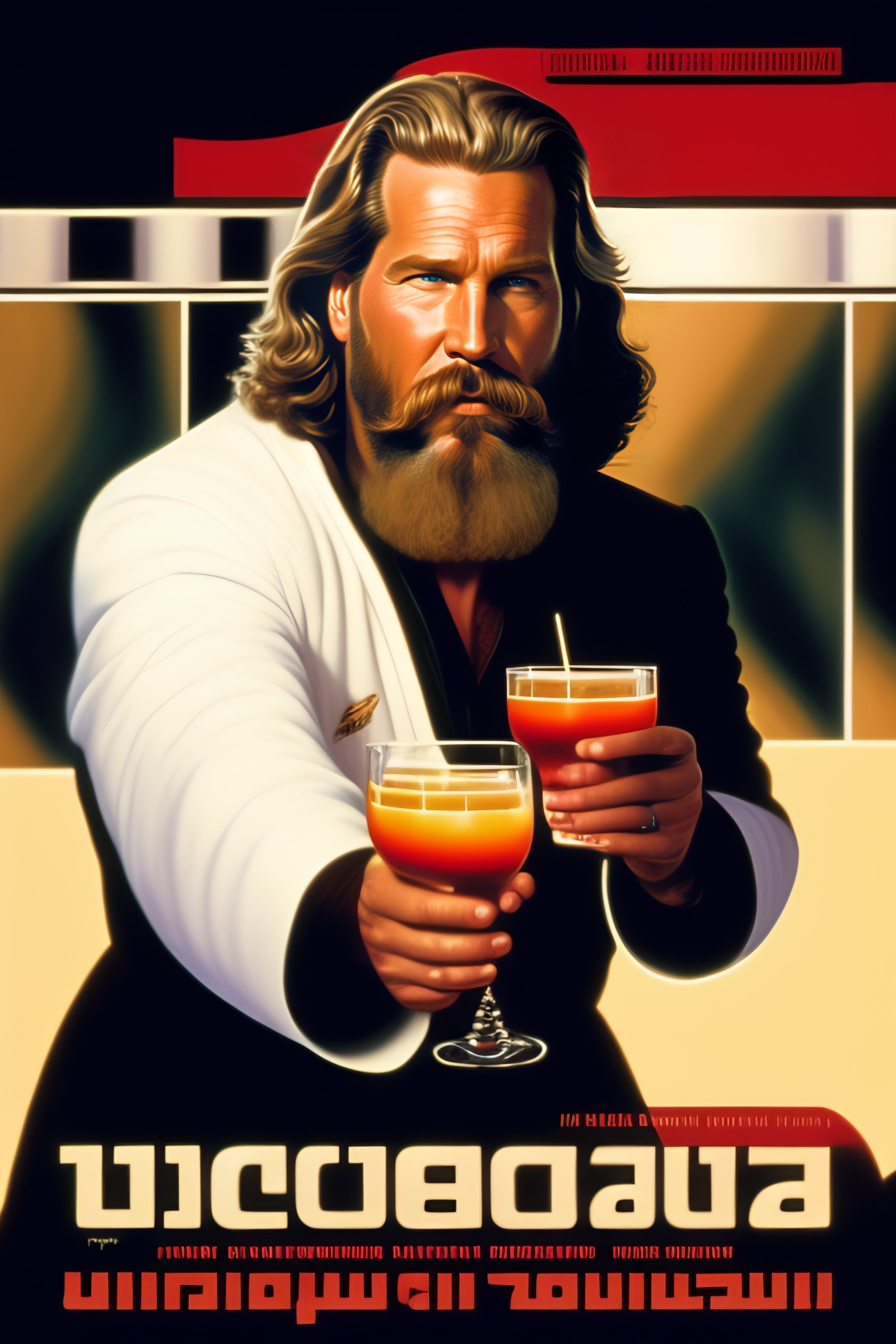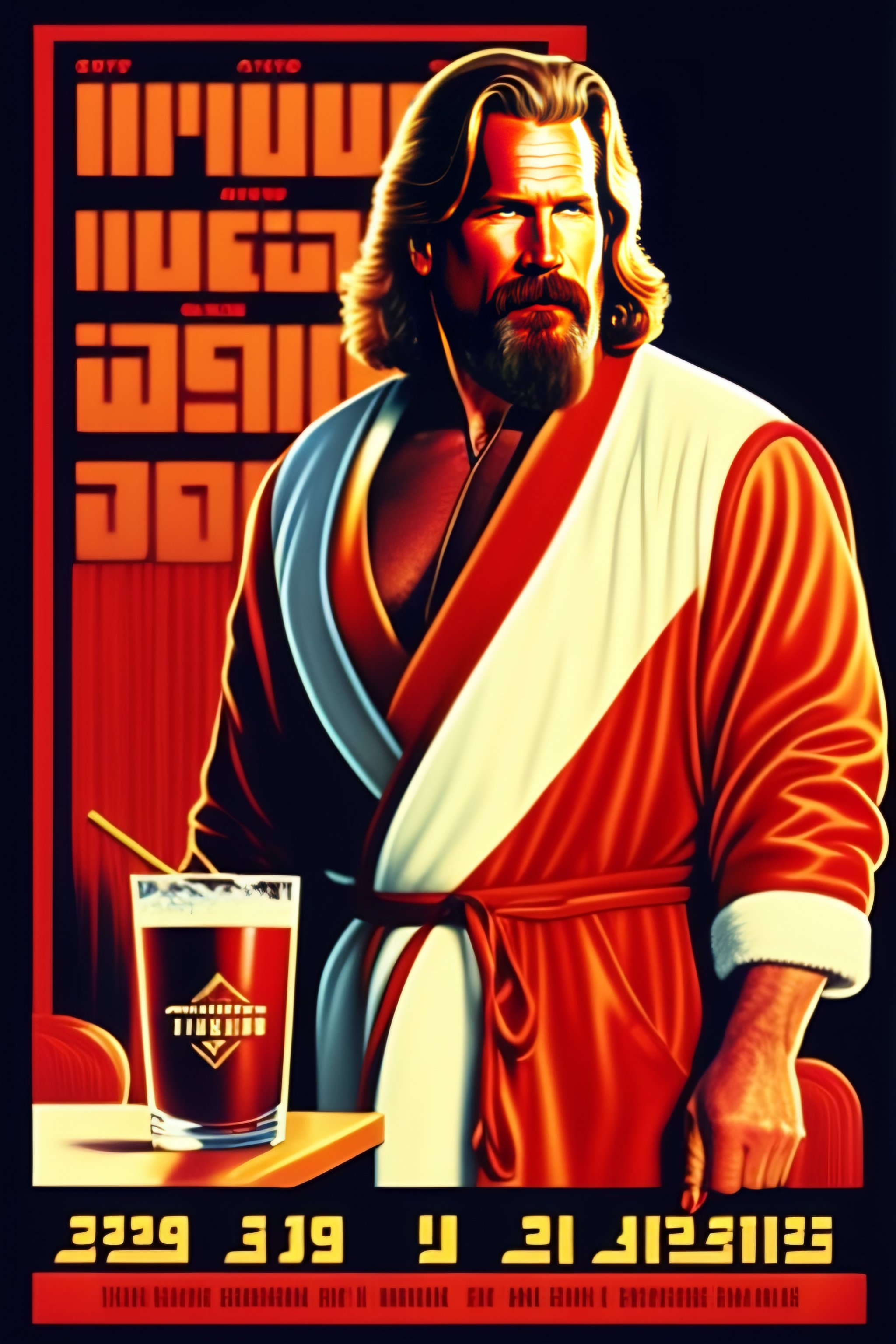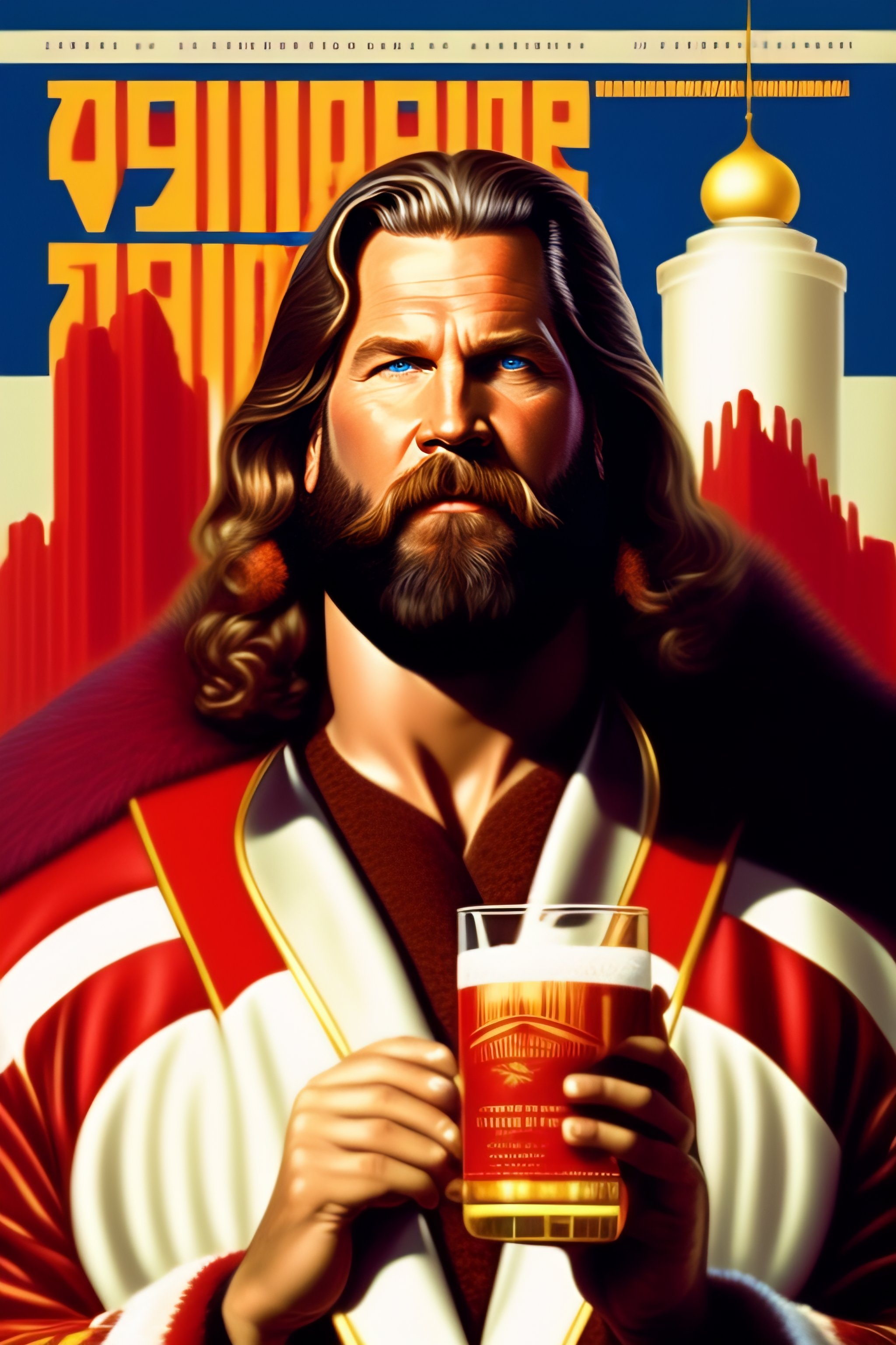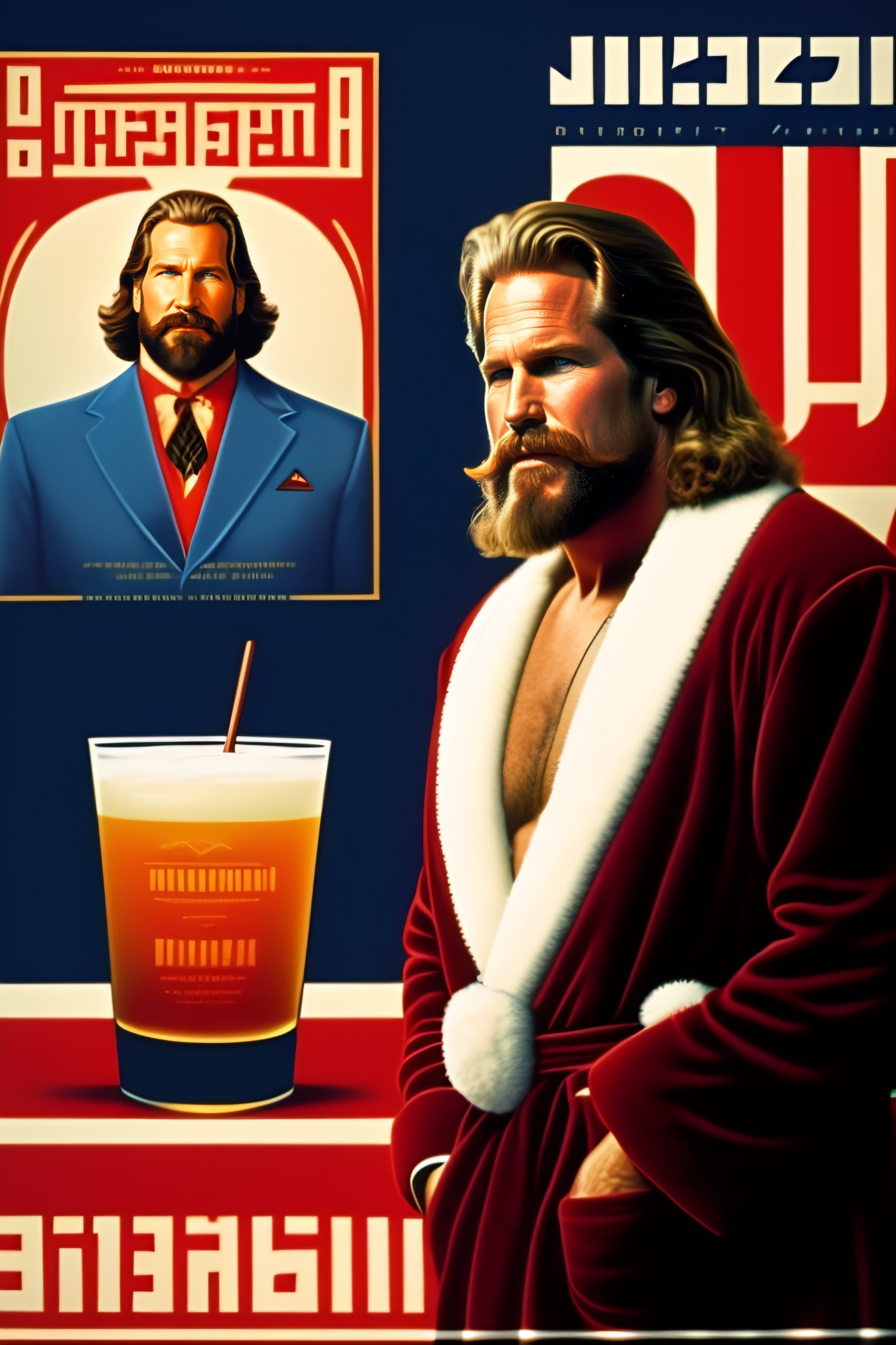 Jeff bridges, big lebowski in a bathrobe drinking a white russian cocktail, soviet propaganda poster, full-figure image, shouting, shouting