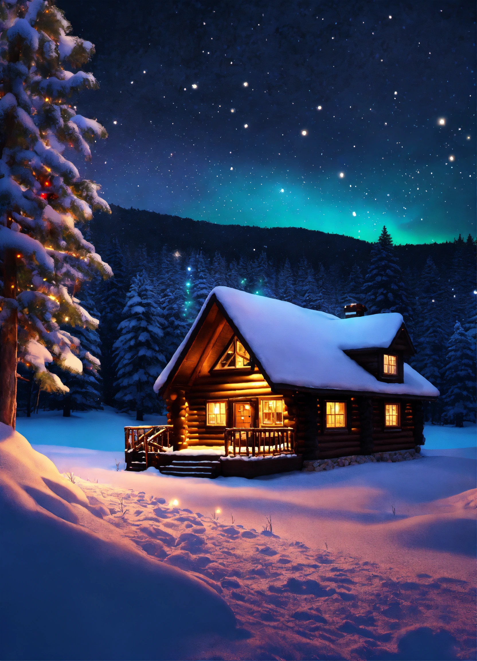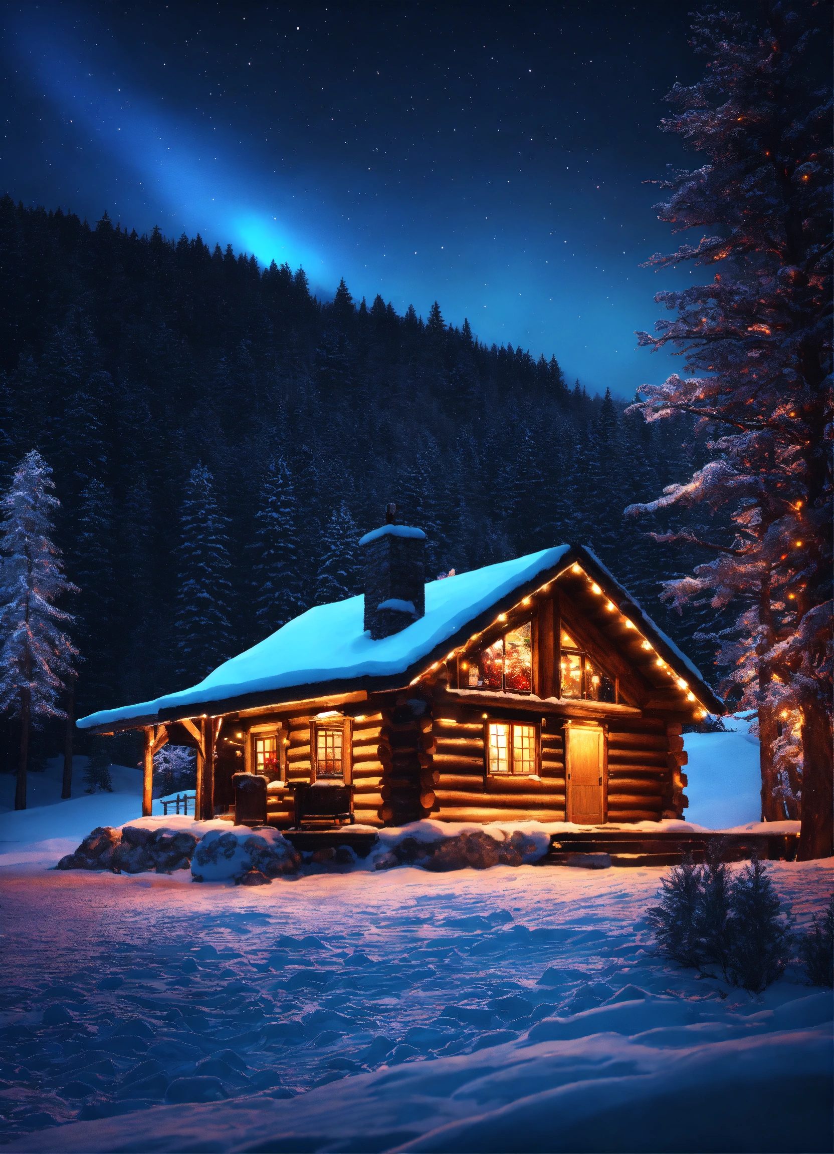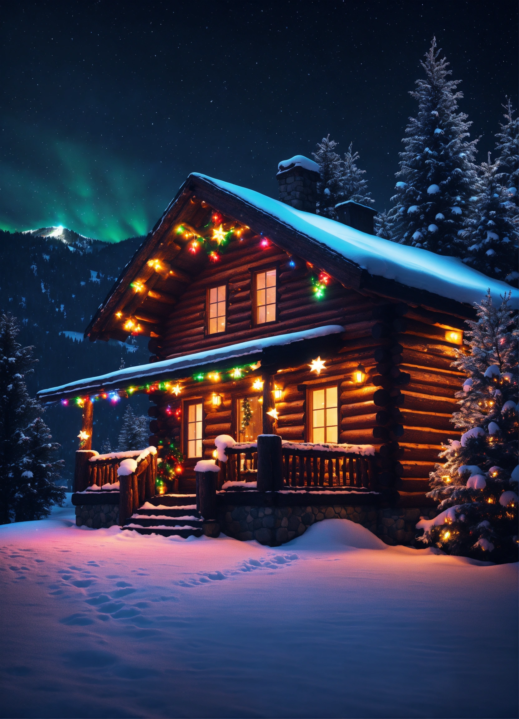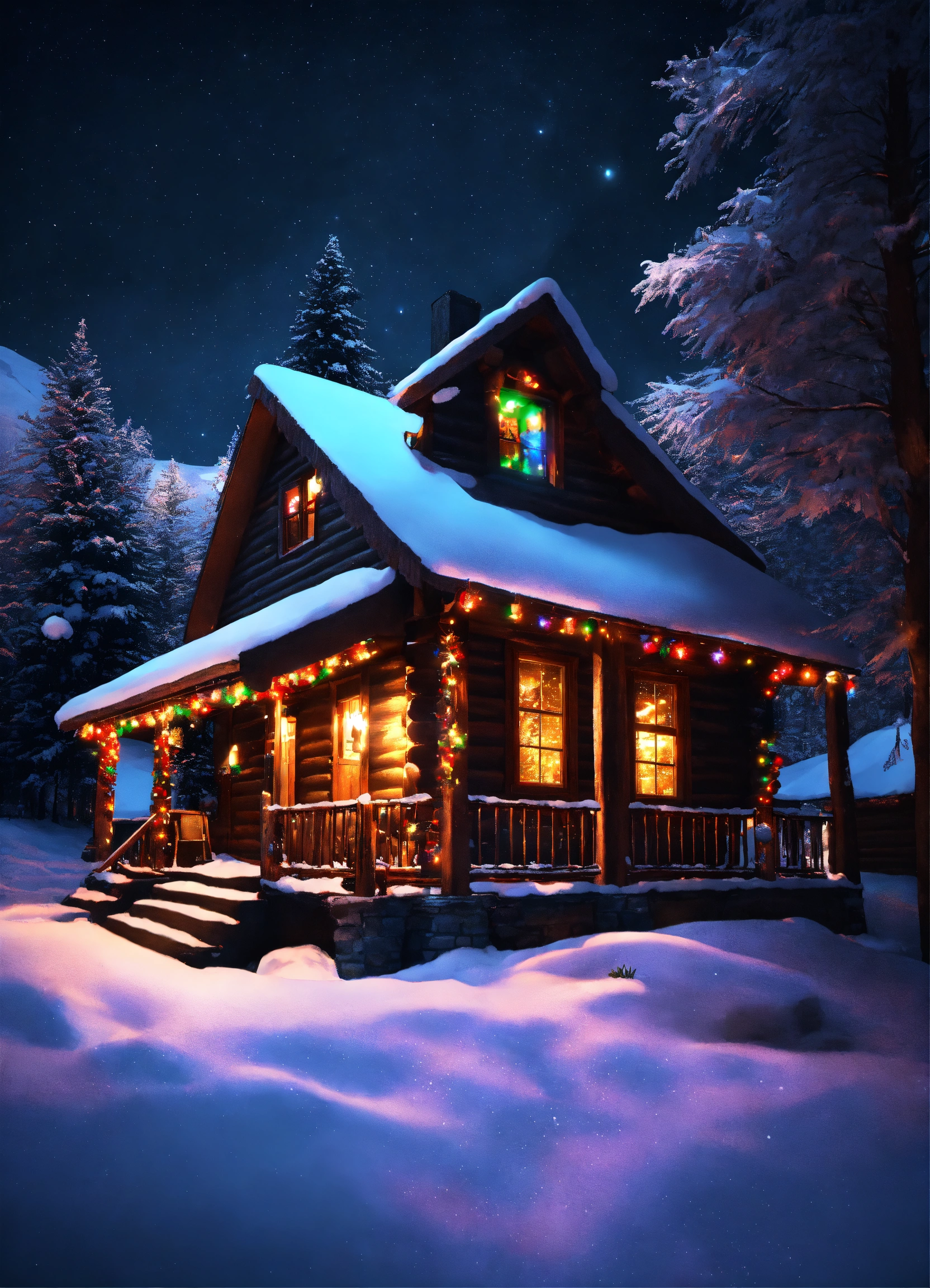 Quaint log cabin in the mountains with bright colorful christmas lights on the house and the trees around. winter time, snow, dark black sky with stars, high contrast, high-quality, hyperrealistic, 8k