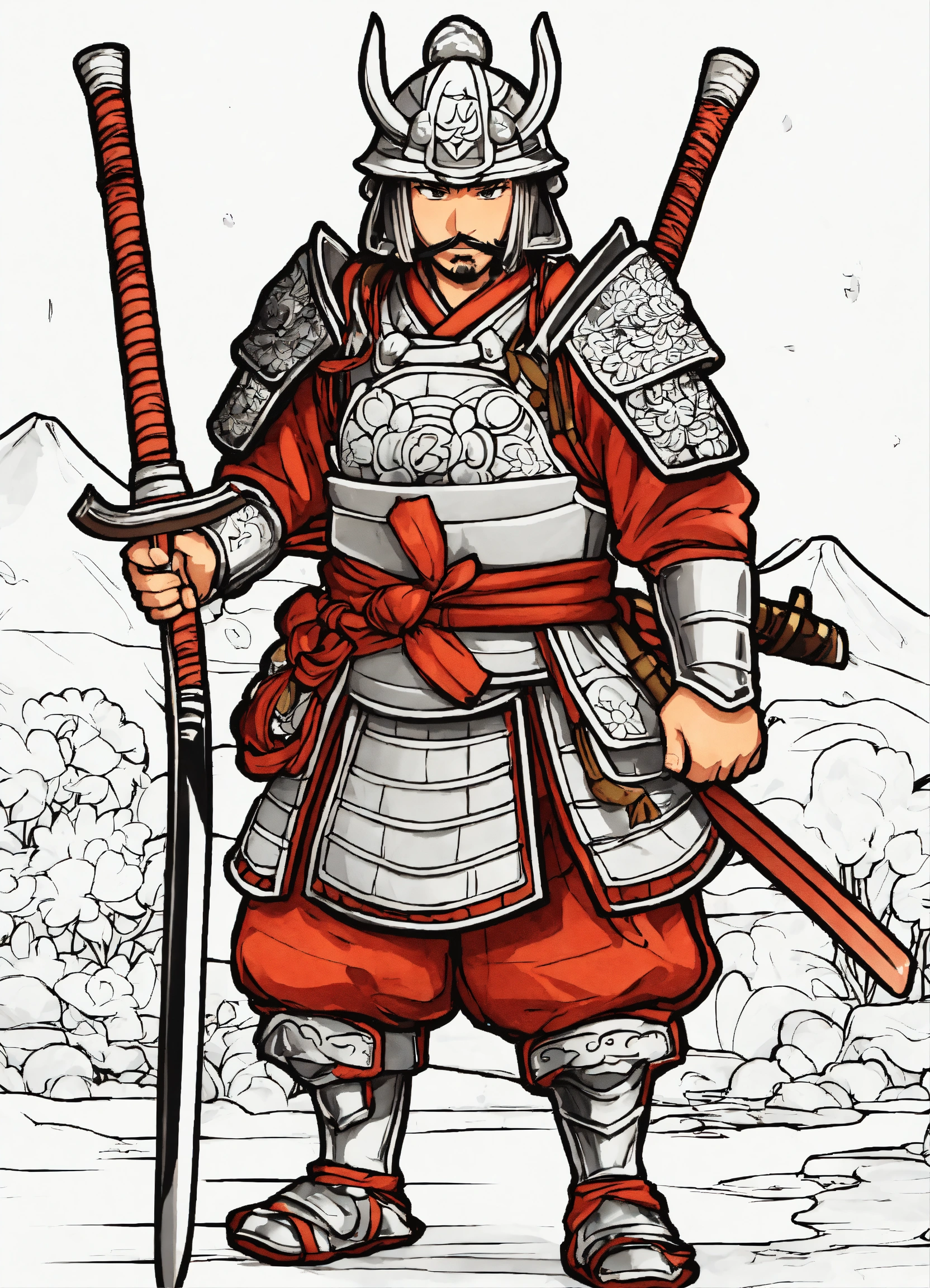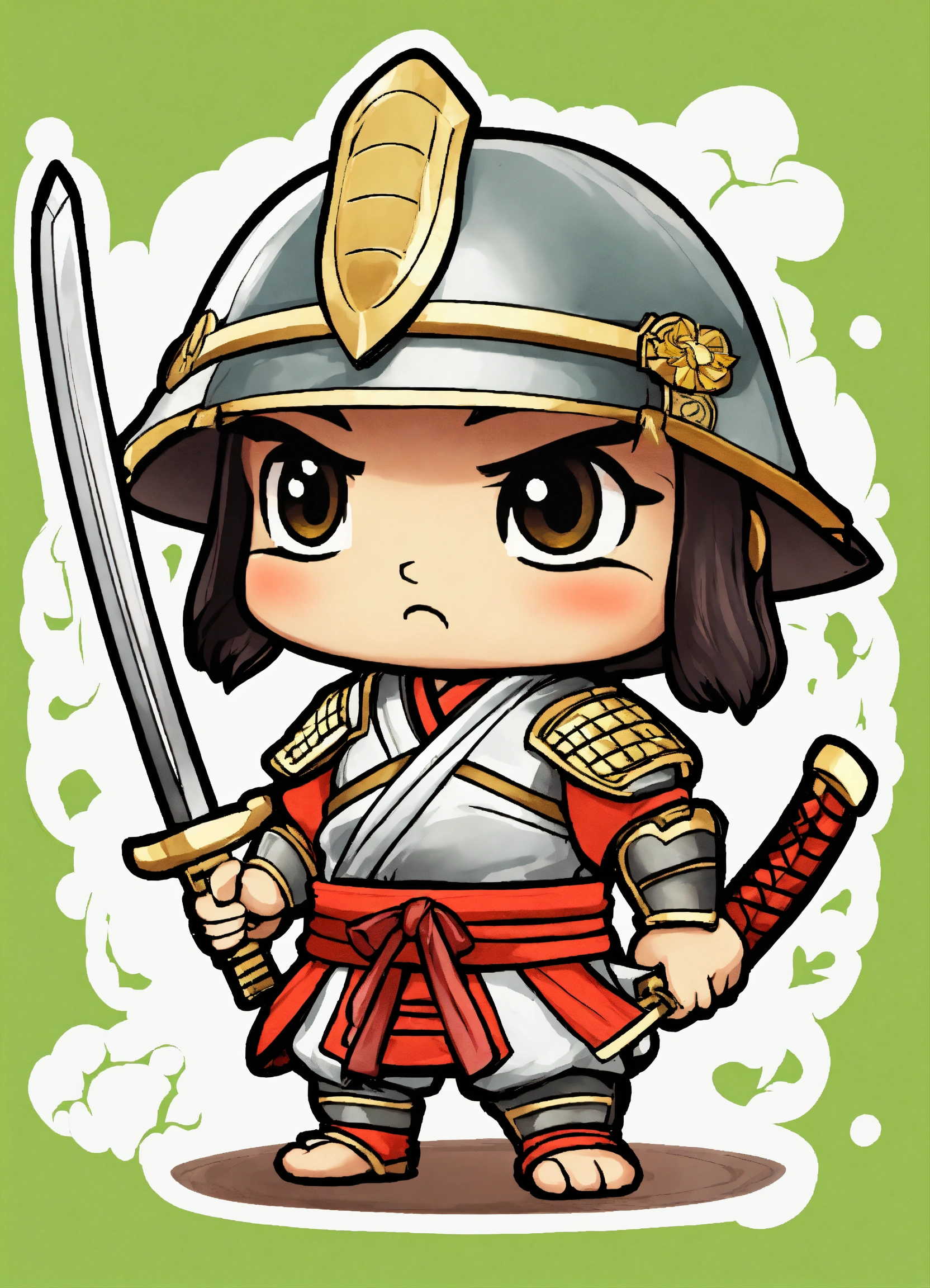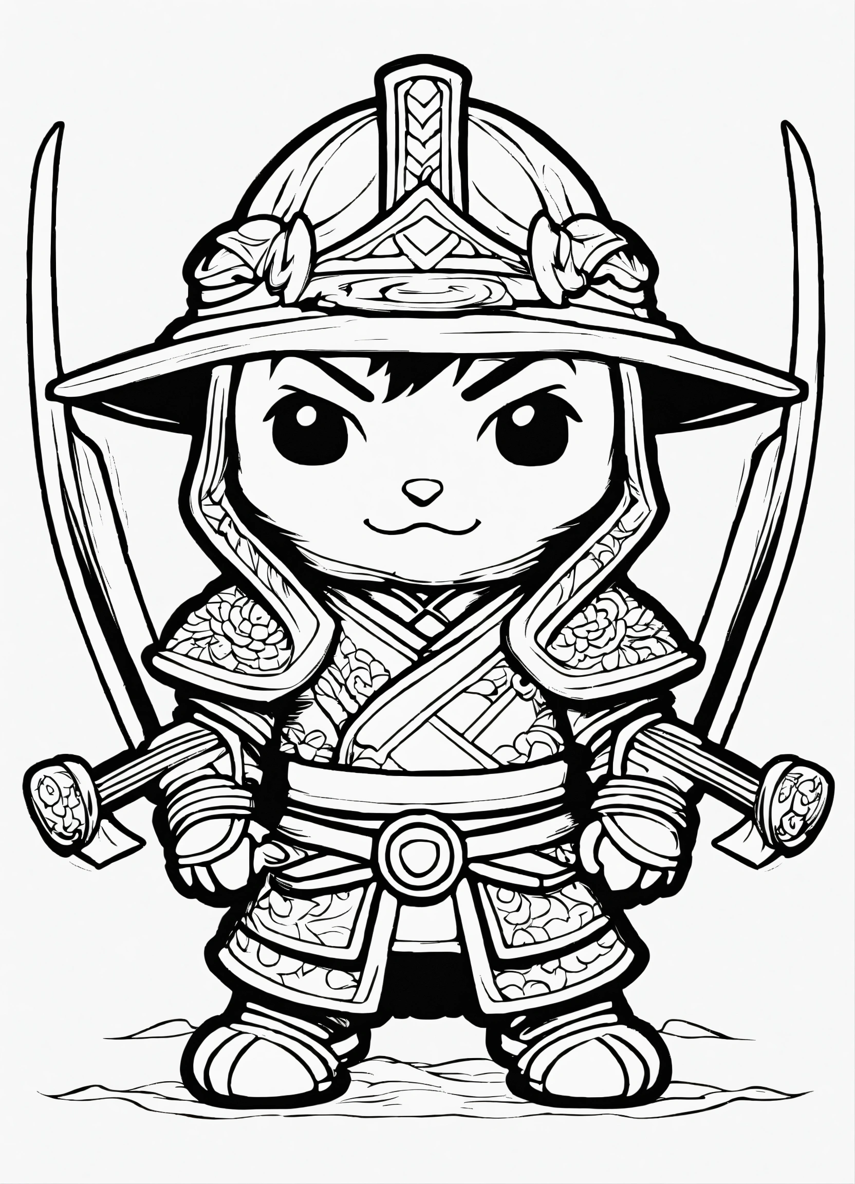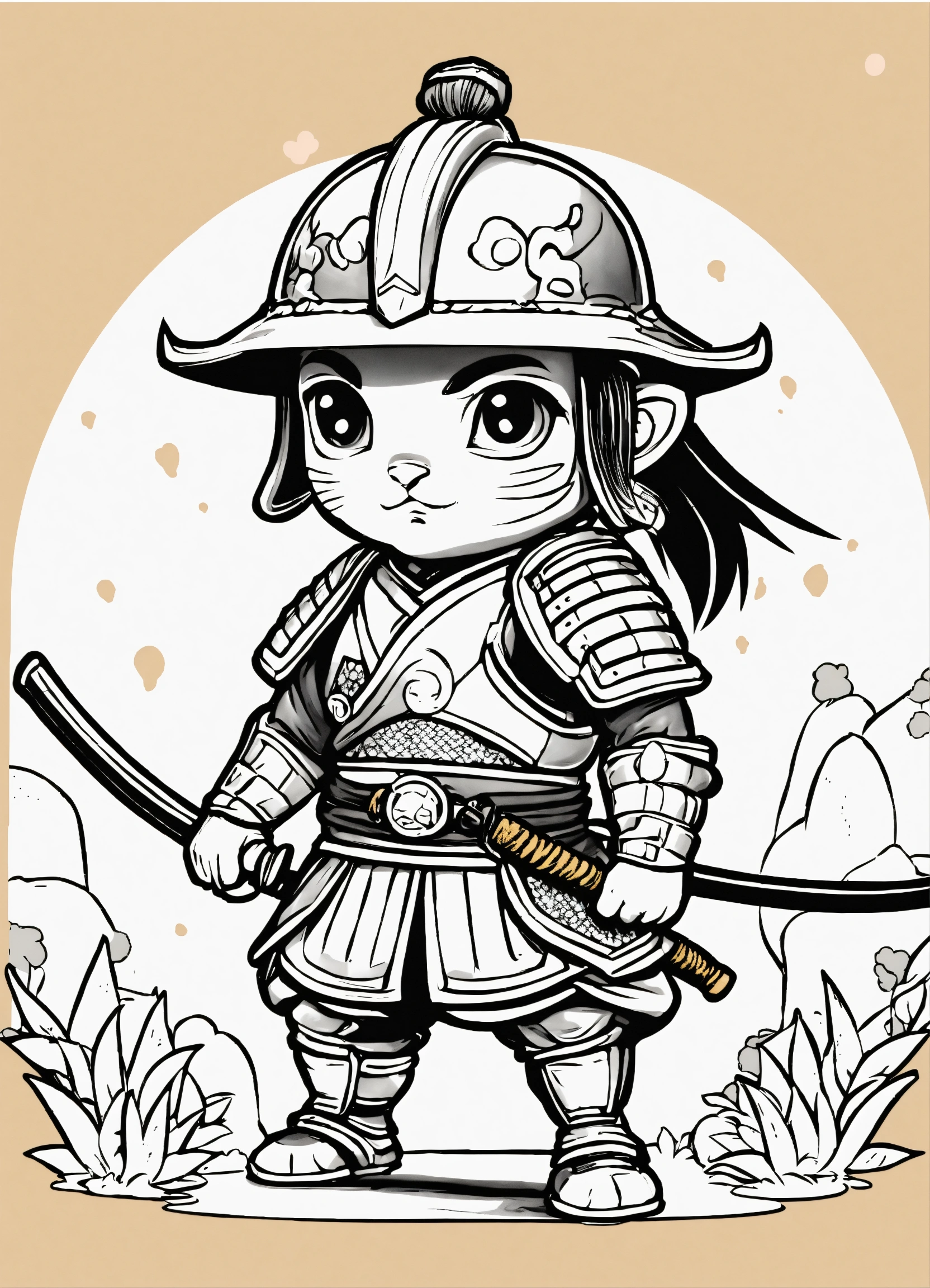 Generate a cute samurai warrior illustration, resolution, cartoon-sticker style with clear lines on a pure white background suitable for a children's coloring book.