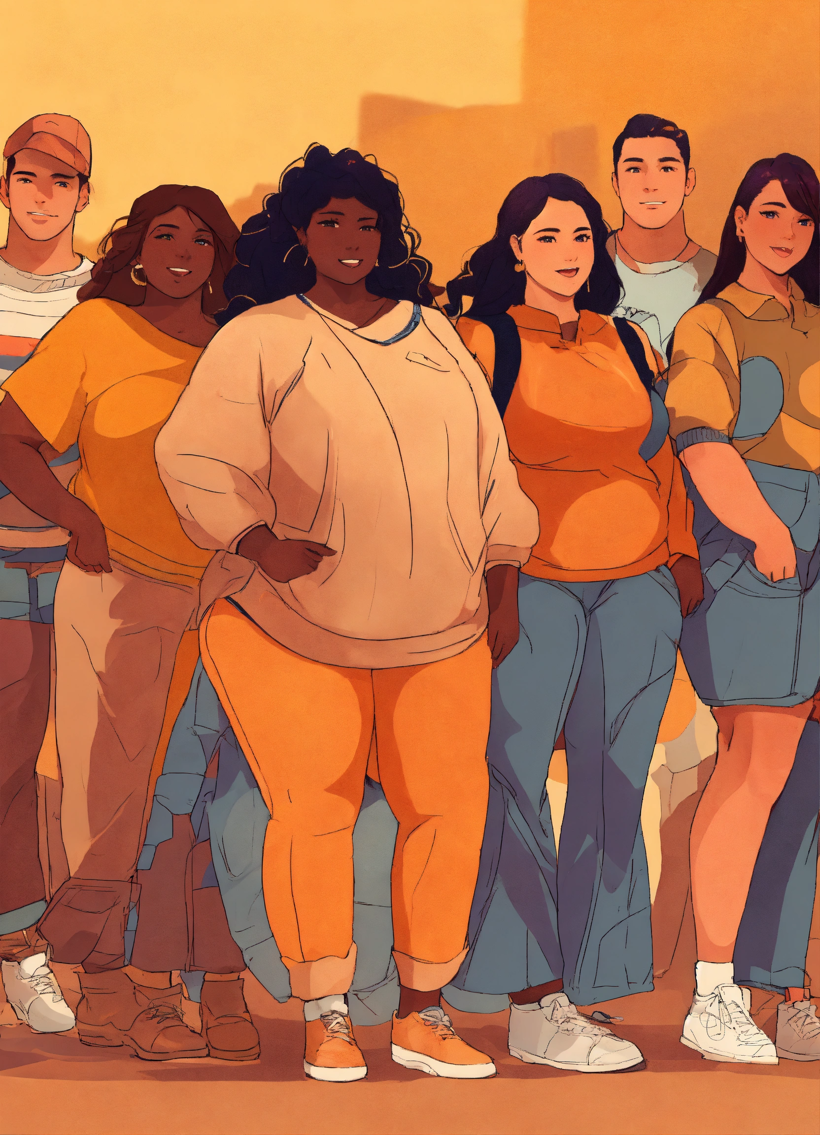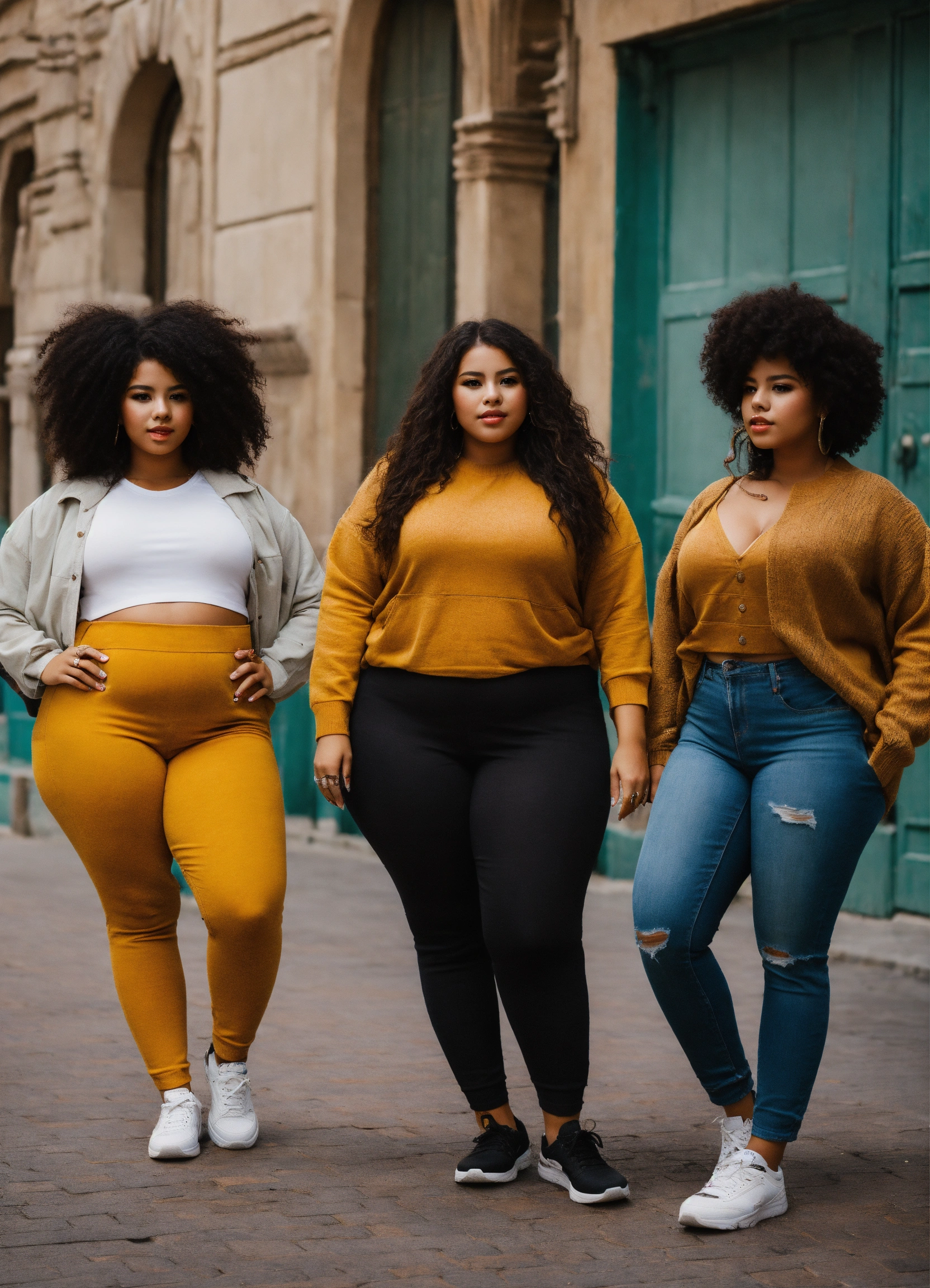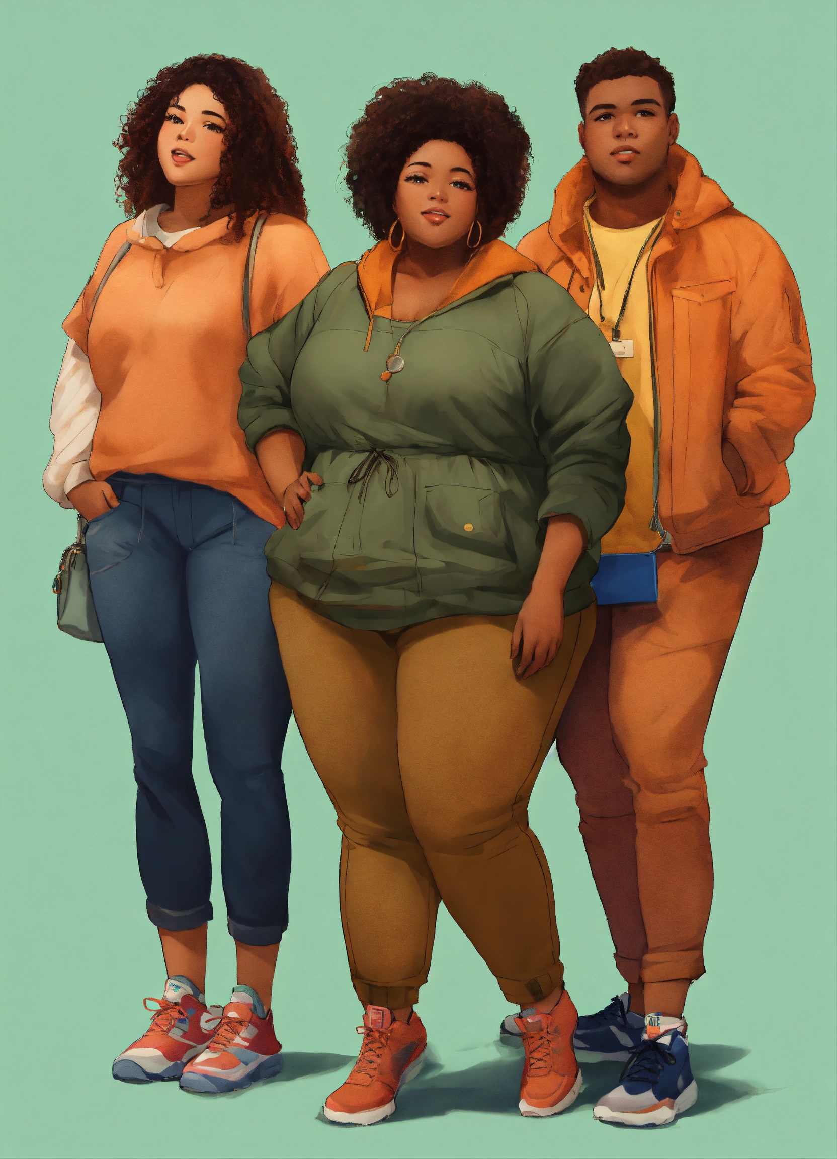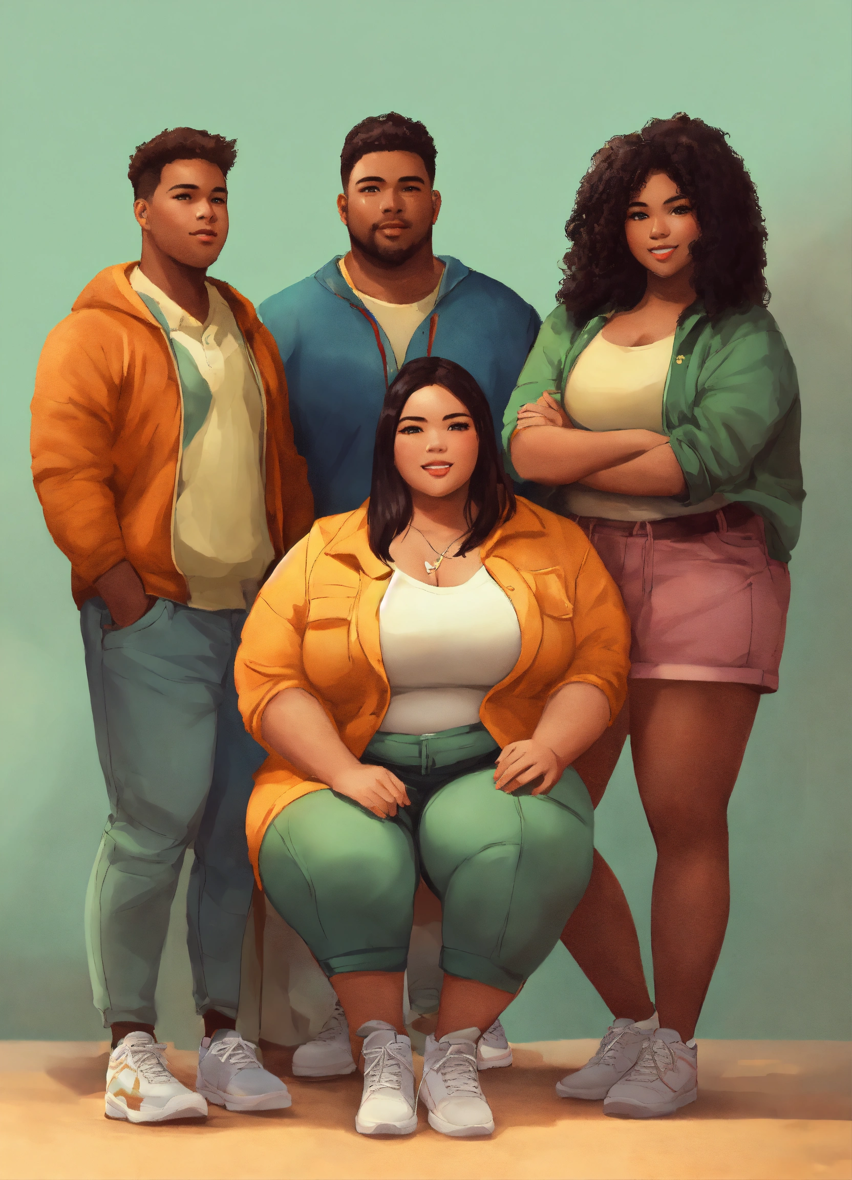 Group of plump young people south america casual outfit mid station, everyday clothes, man and female, diverse group, cool coutfits, light layers