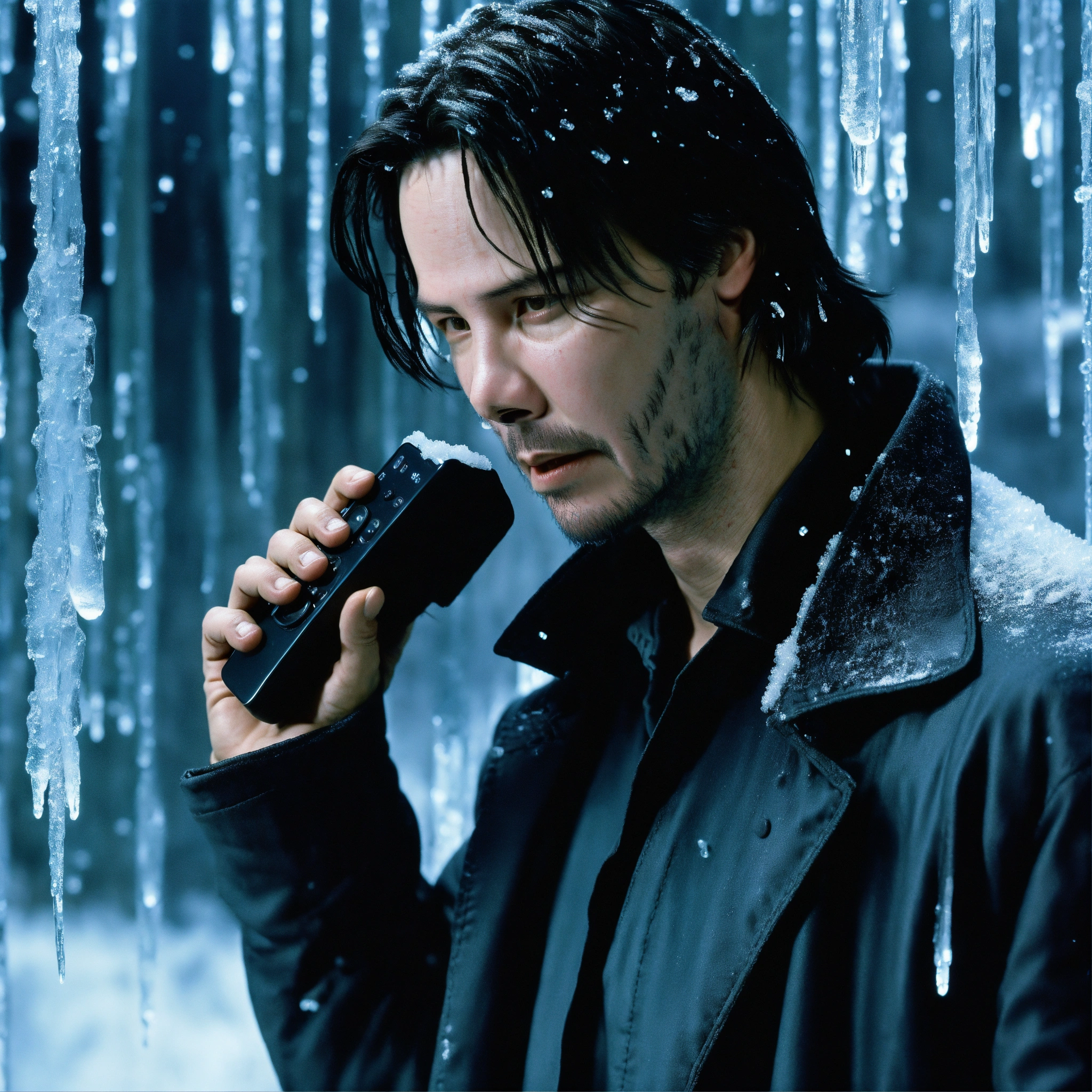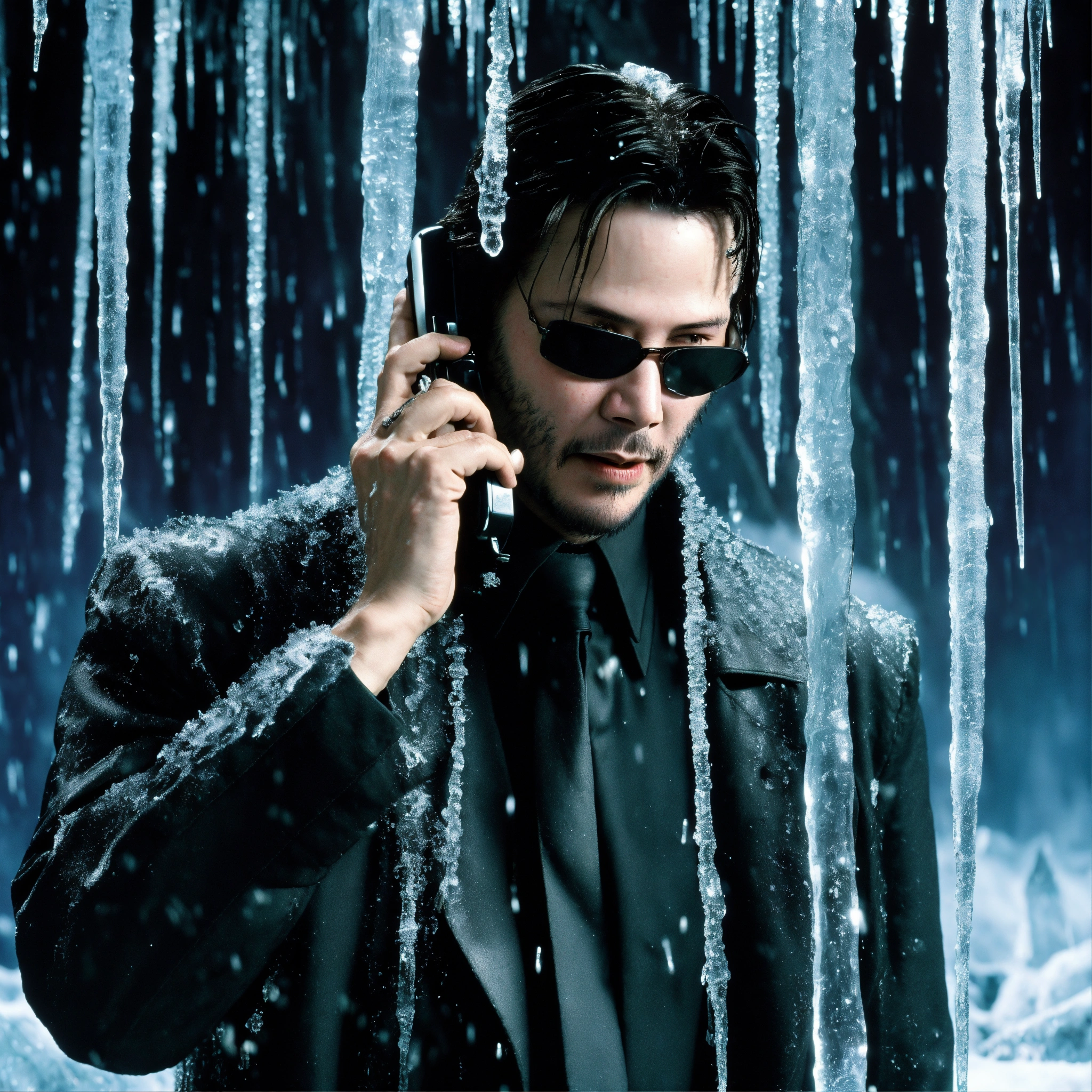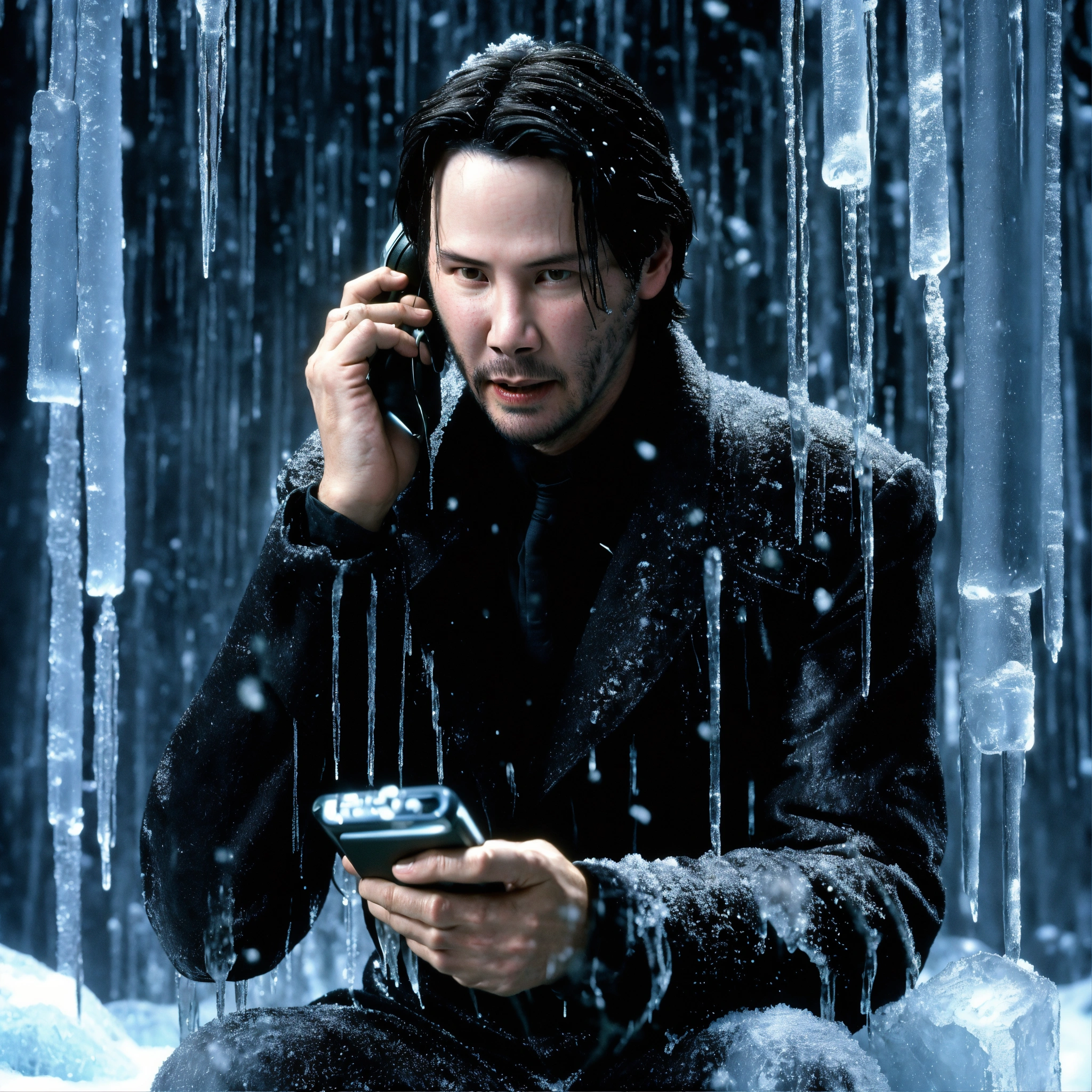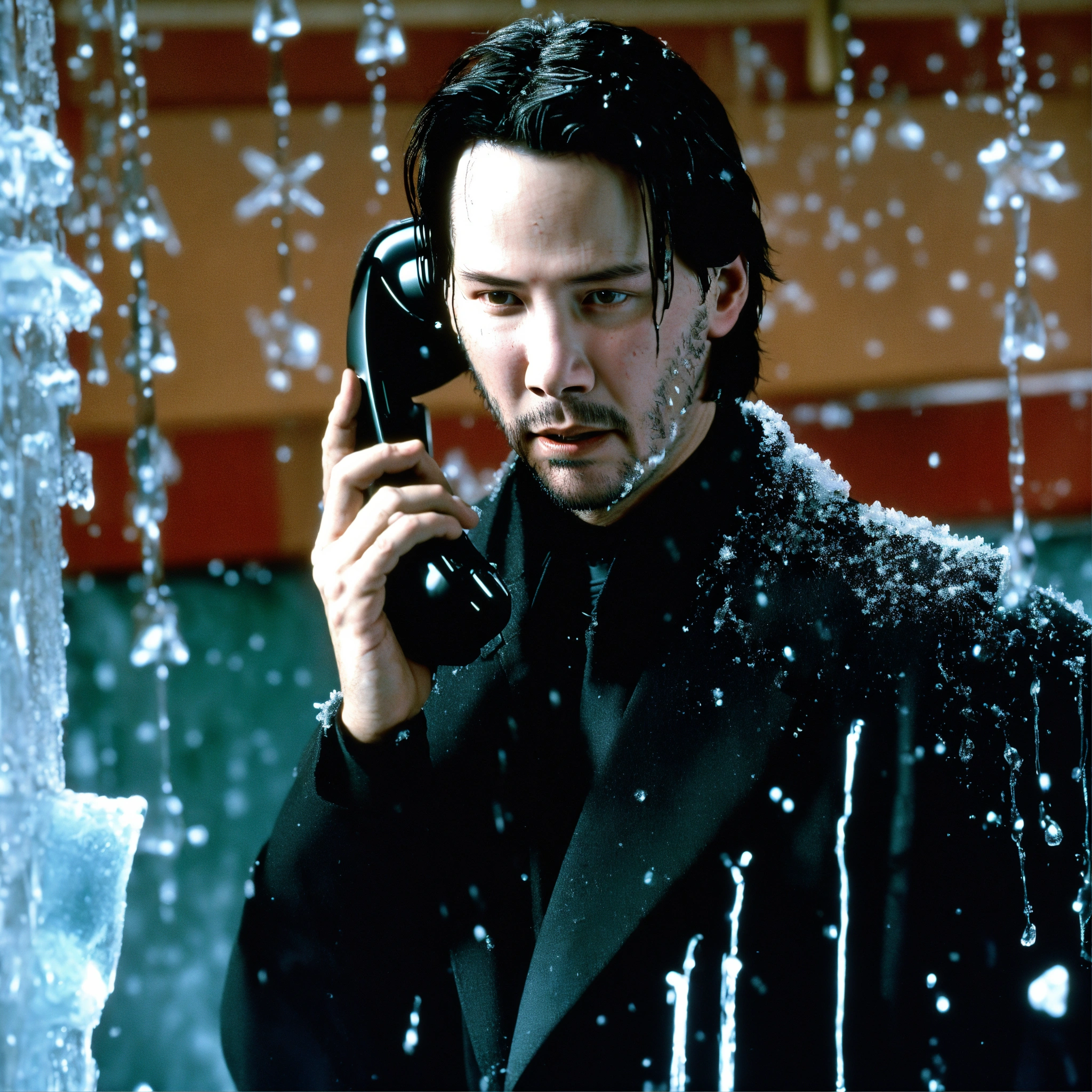 Young keanu reeves as neo from the matrix is frozen, he is calling on an ice phone, all iced around, the phone is covered with icicles