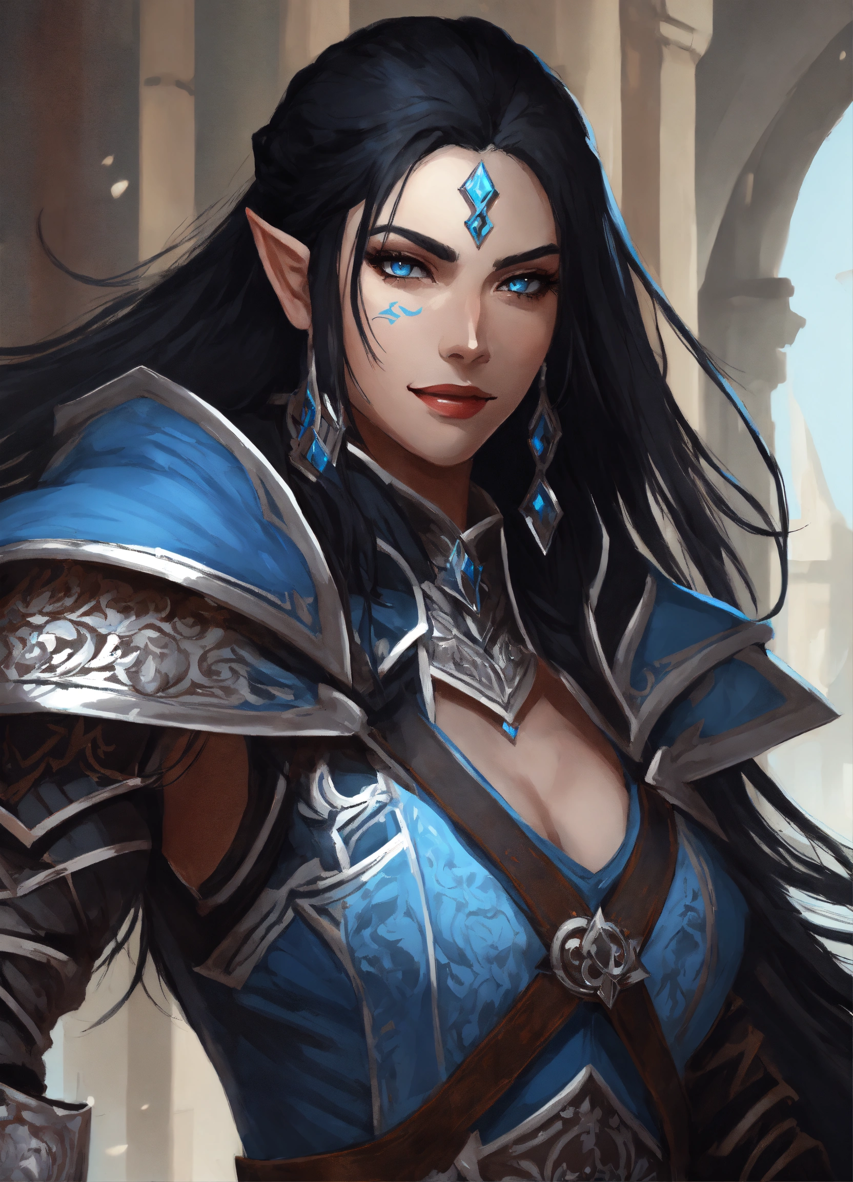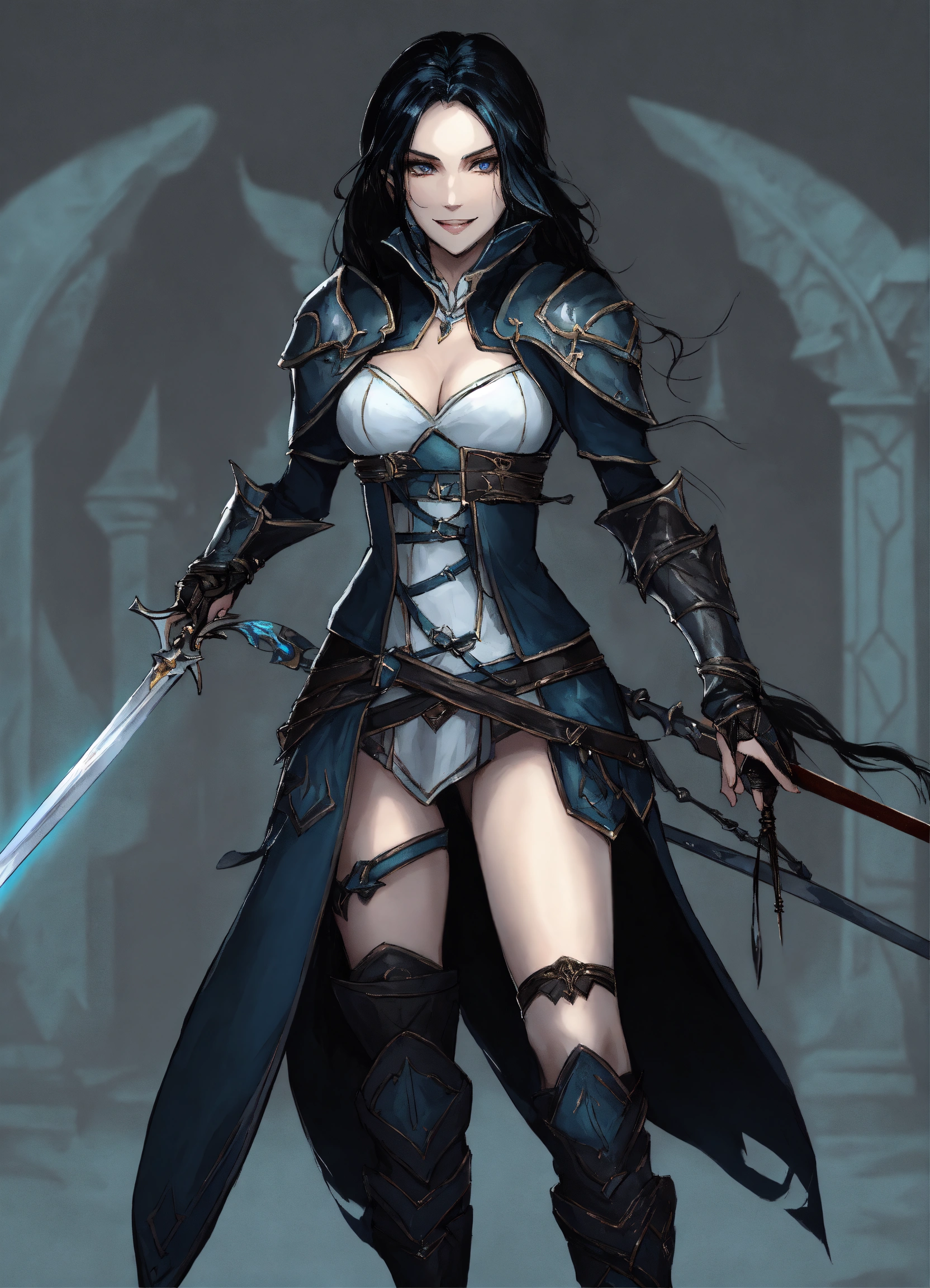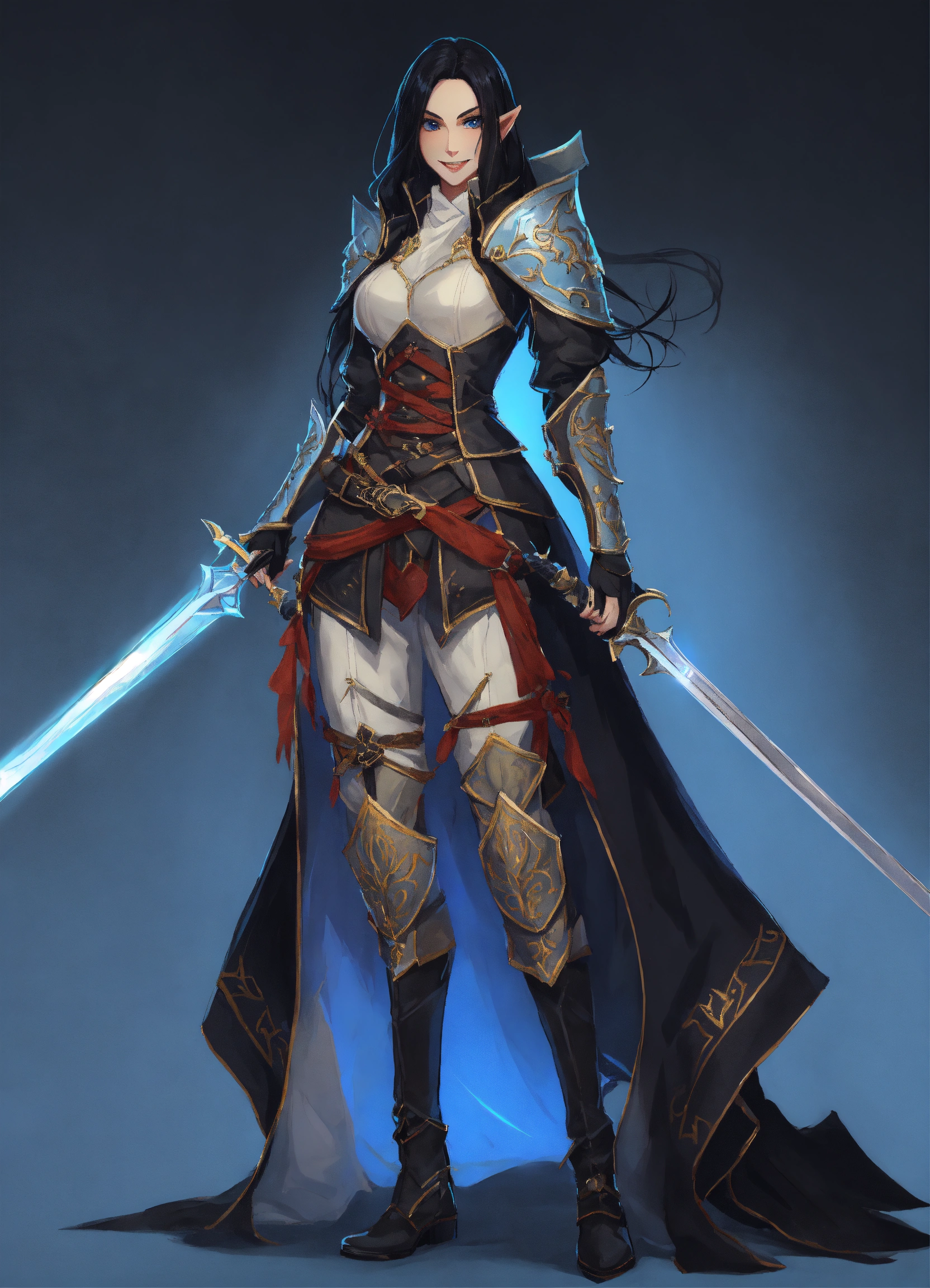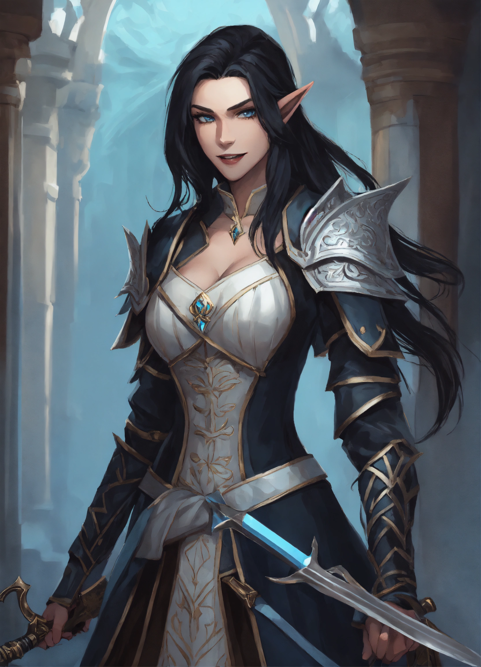 Female white half-elf, pathfinder art style full body portrait head to toe very long straight black hair dual wielding rapiers evil smile, evil look main colors black, and very light blue backround dark palace