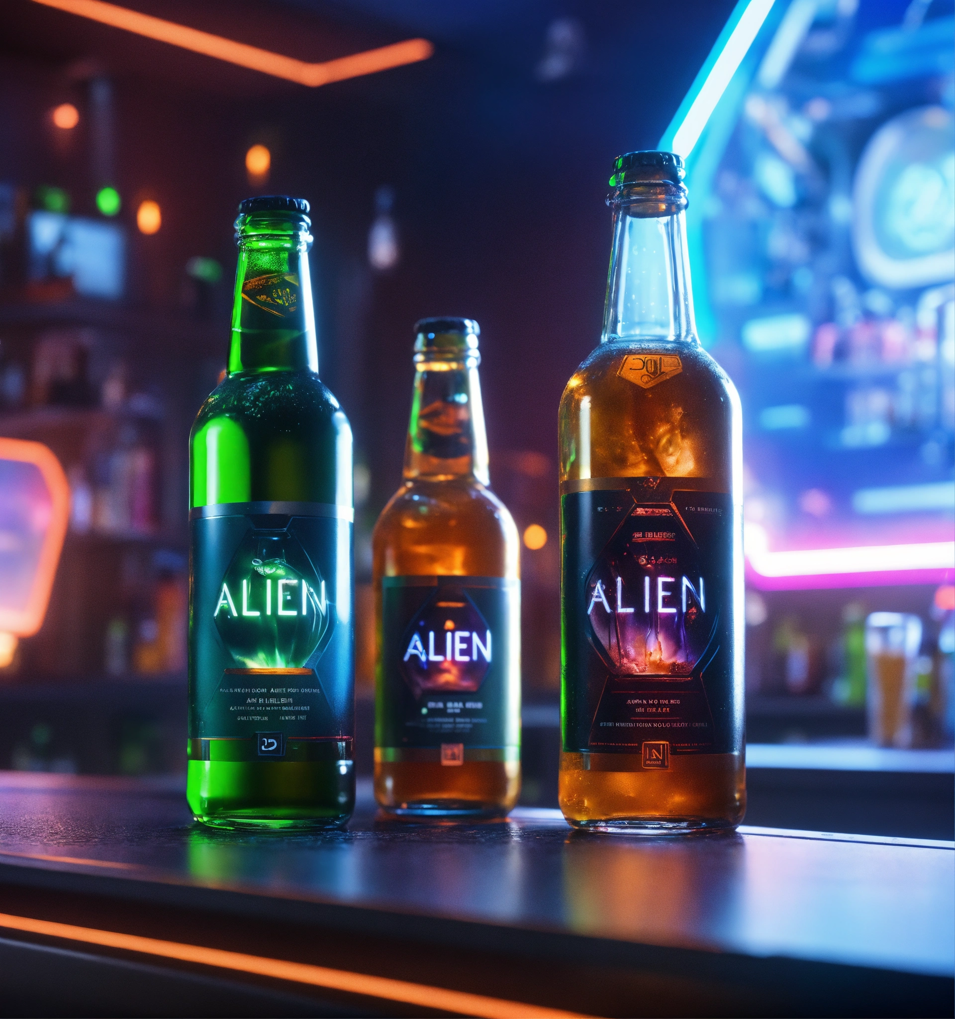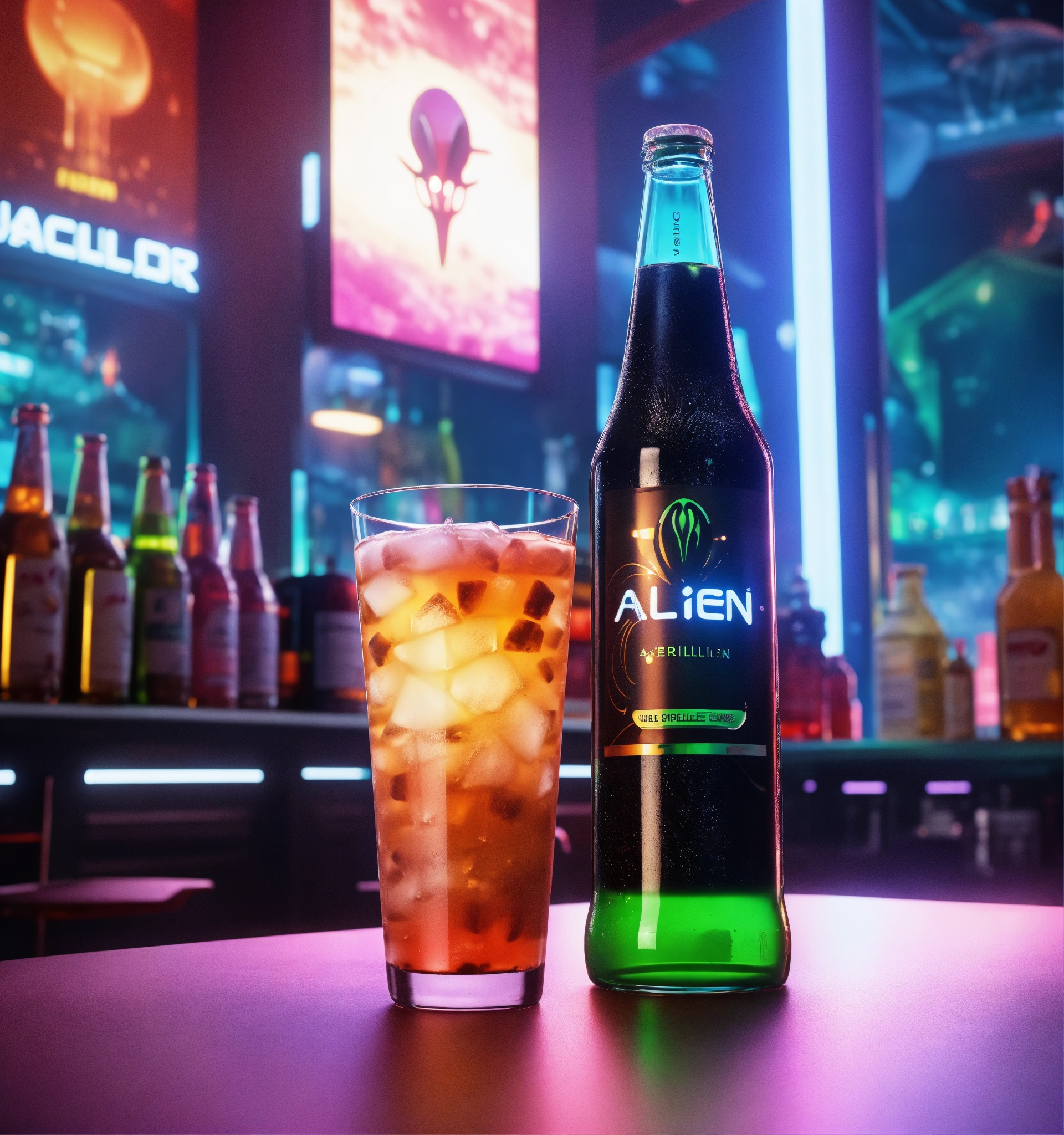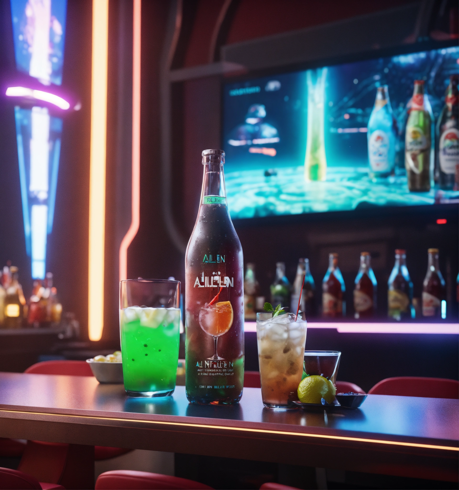 Close up of bottle and alien drinks in front of a vertical display ad poster on the wall in a futuristic space port bar, 8k, unreal engine