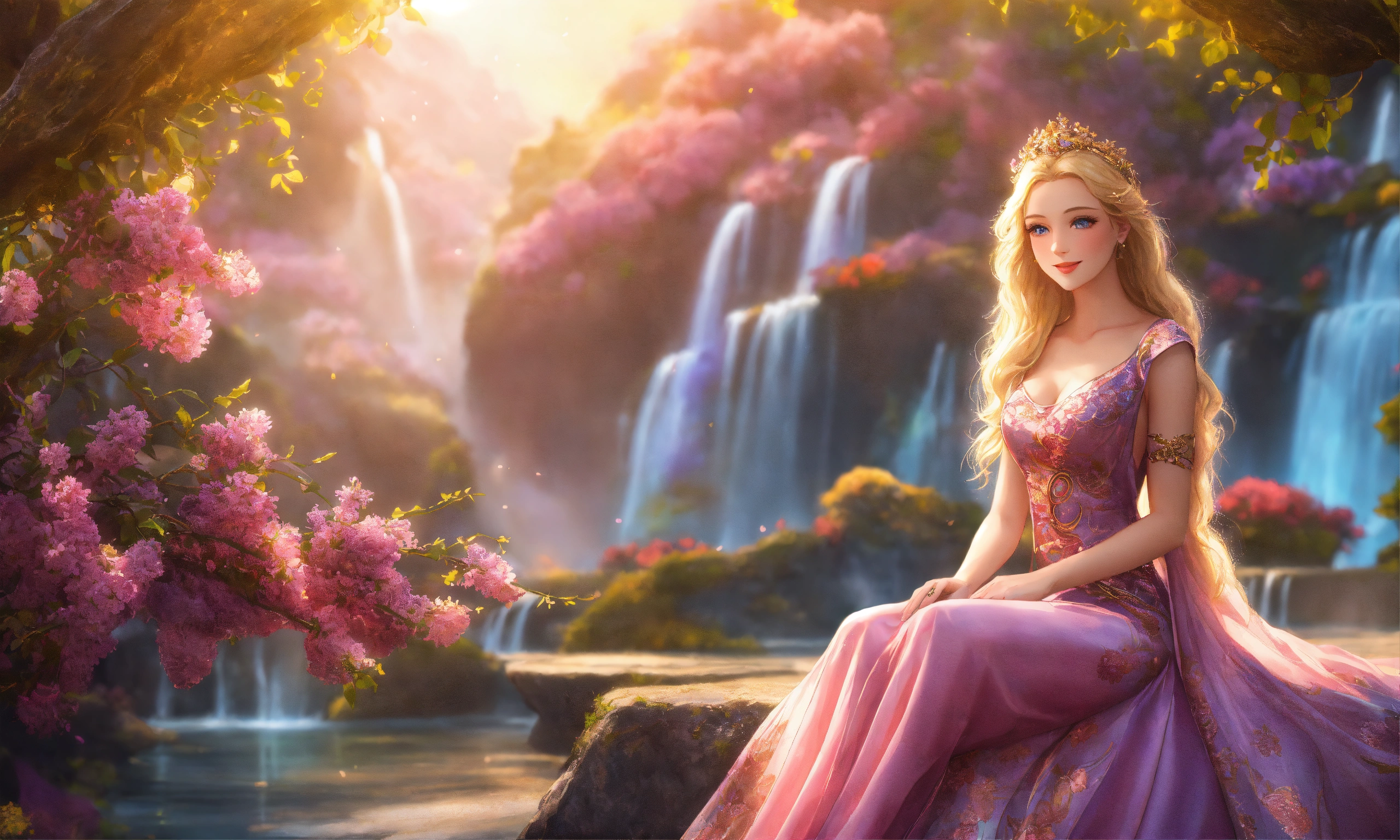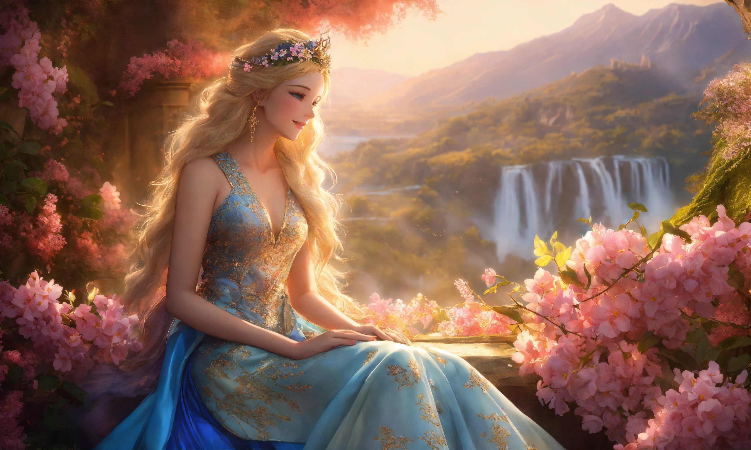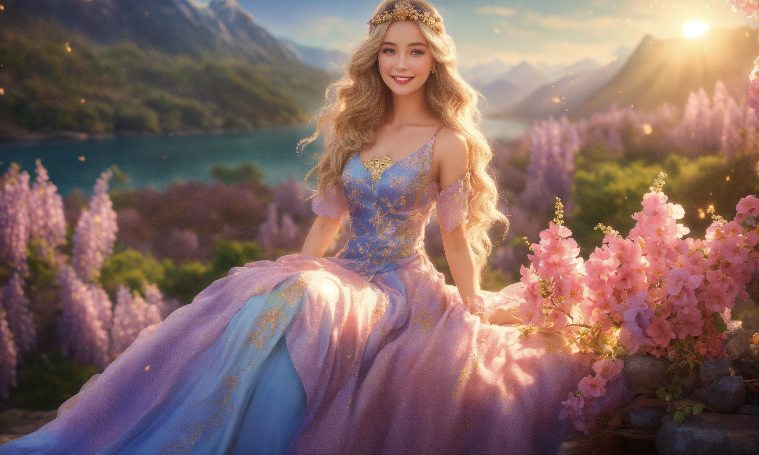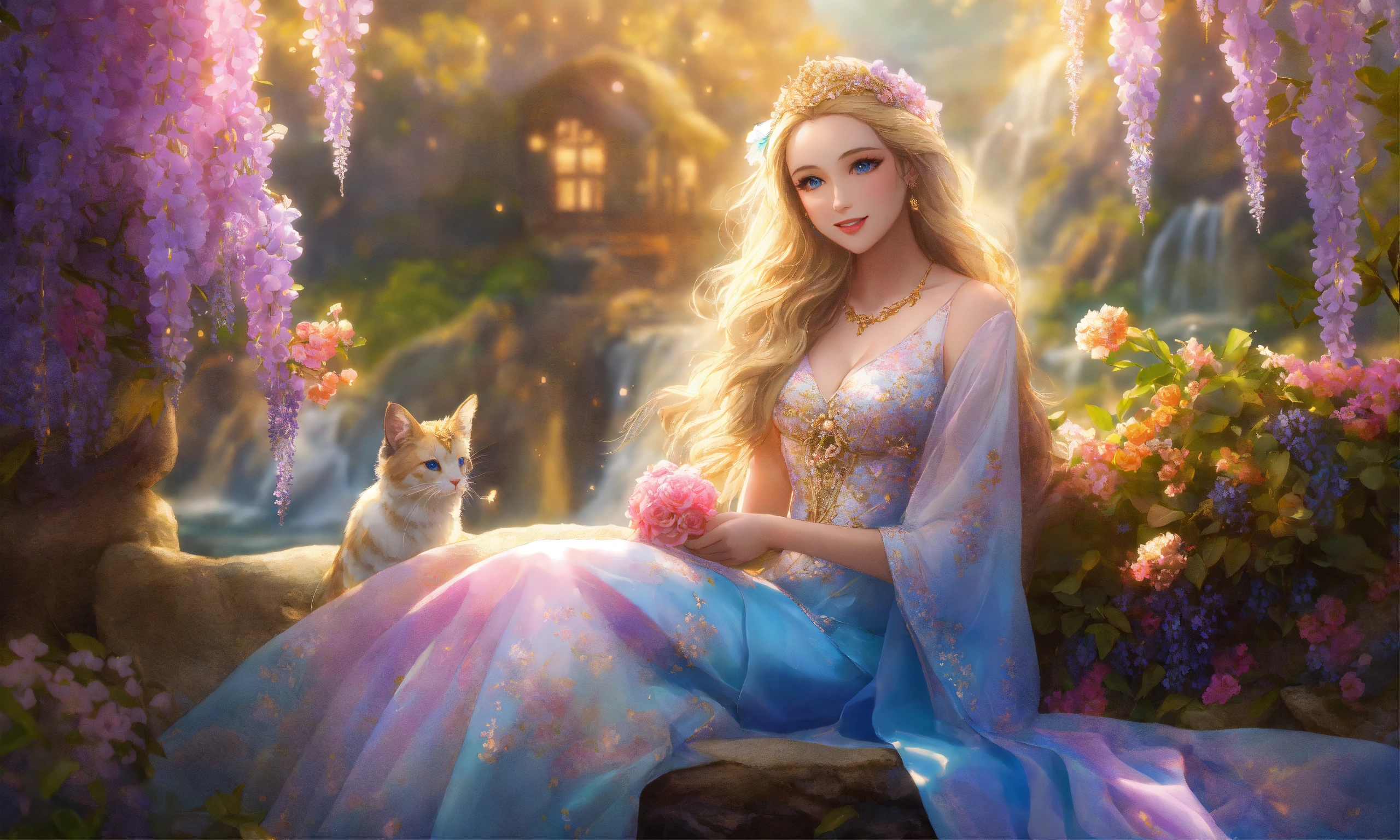 Beautiful princess of the stars smiling blonde with blue eyes with iridescent wings and with clothes rich in colors and precious stones with gold fabrics and silks of soft colors, brocade, very sharp images 16k and an environment of flowers with waterfalls and mountains, create a heavenly world with pastel landscapes covered with flowers and trees covered with realistic wisteria, photorealists colorful vintage pastel, sunlight by candlelight natural light, oriental, ogive, flowery, wisteria, complex sharp image fine octane details unreal engine ultra realistic 16k cinema
