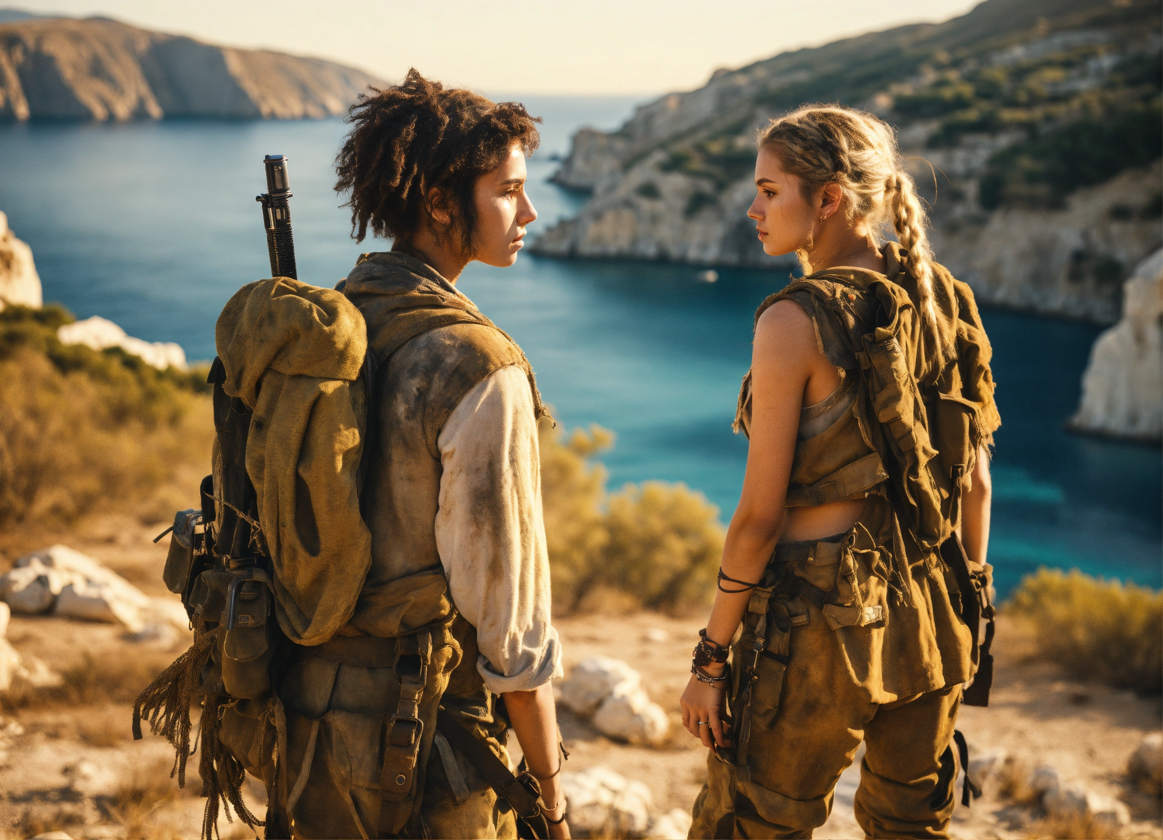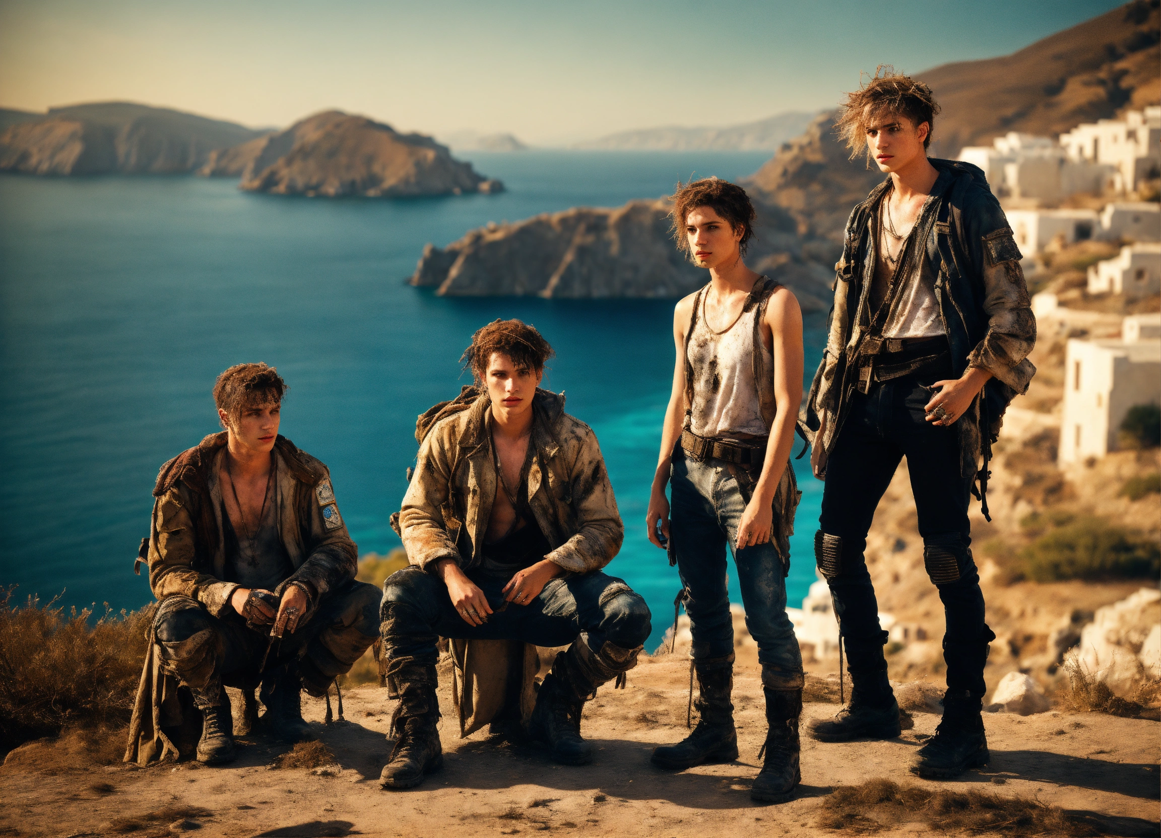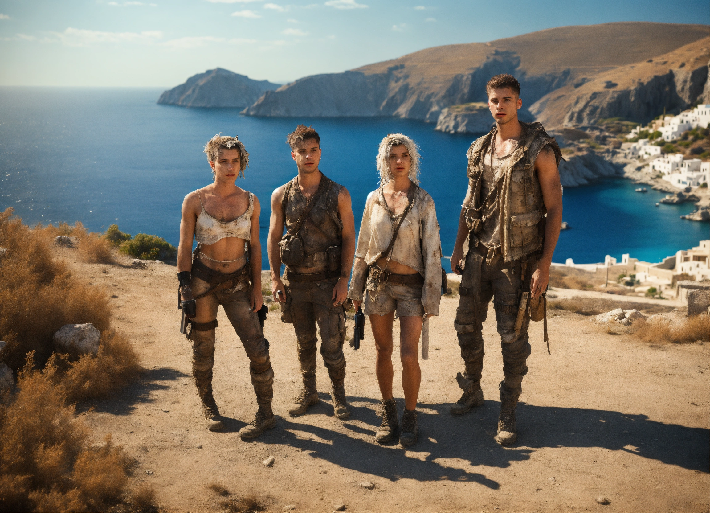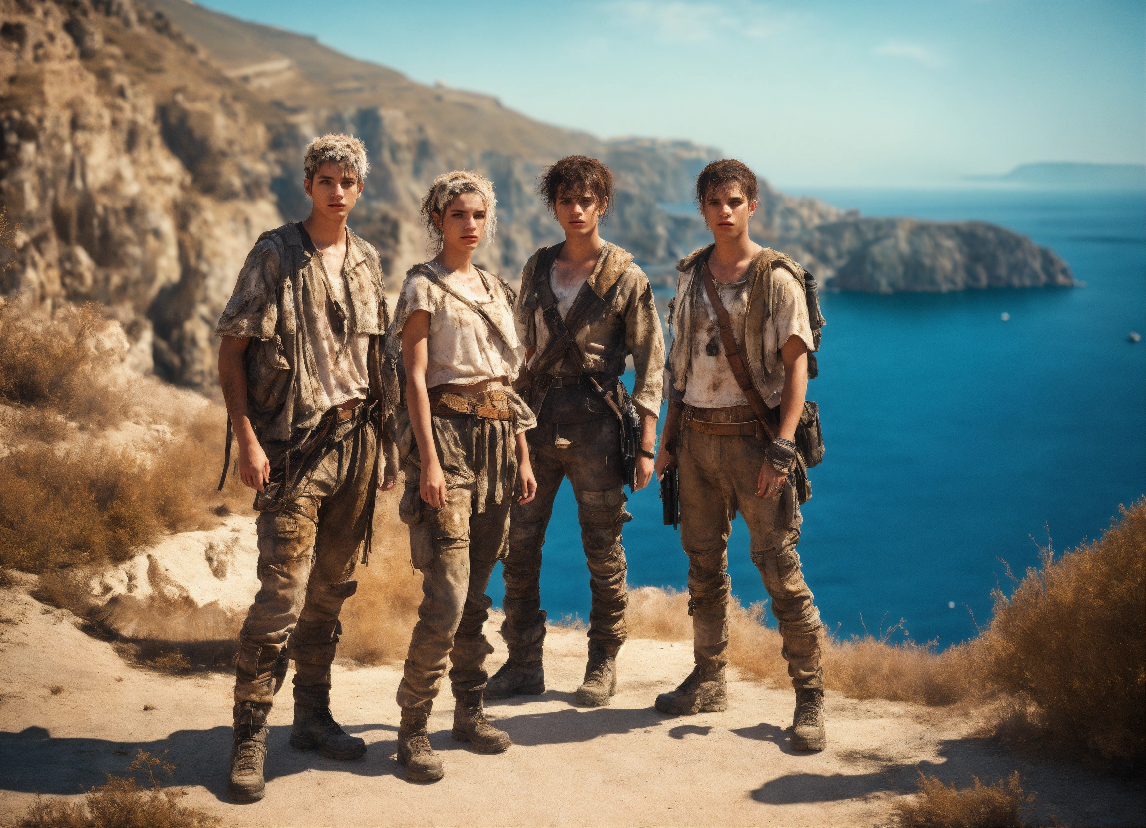A realistic photo of four different white young survivors dressed in ragged post-apocalyptic clothing, in the background a greek cove, with a deserted landscape, sunny, hyperdetailed, hyperrealistic, 8k