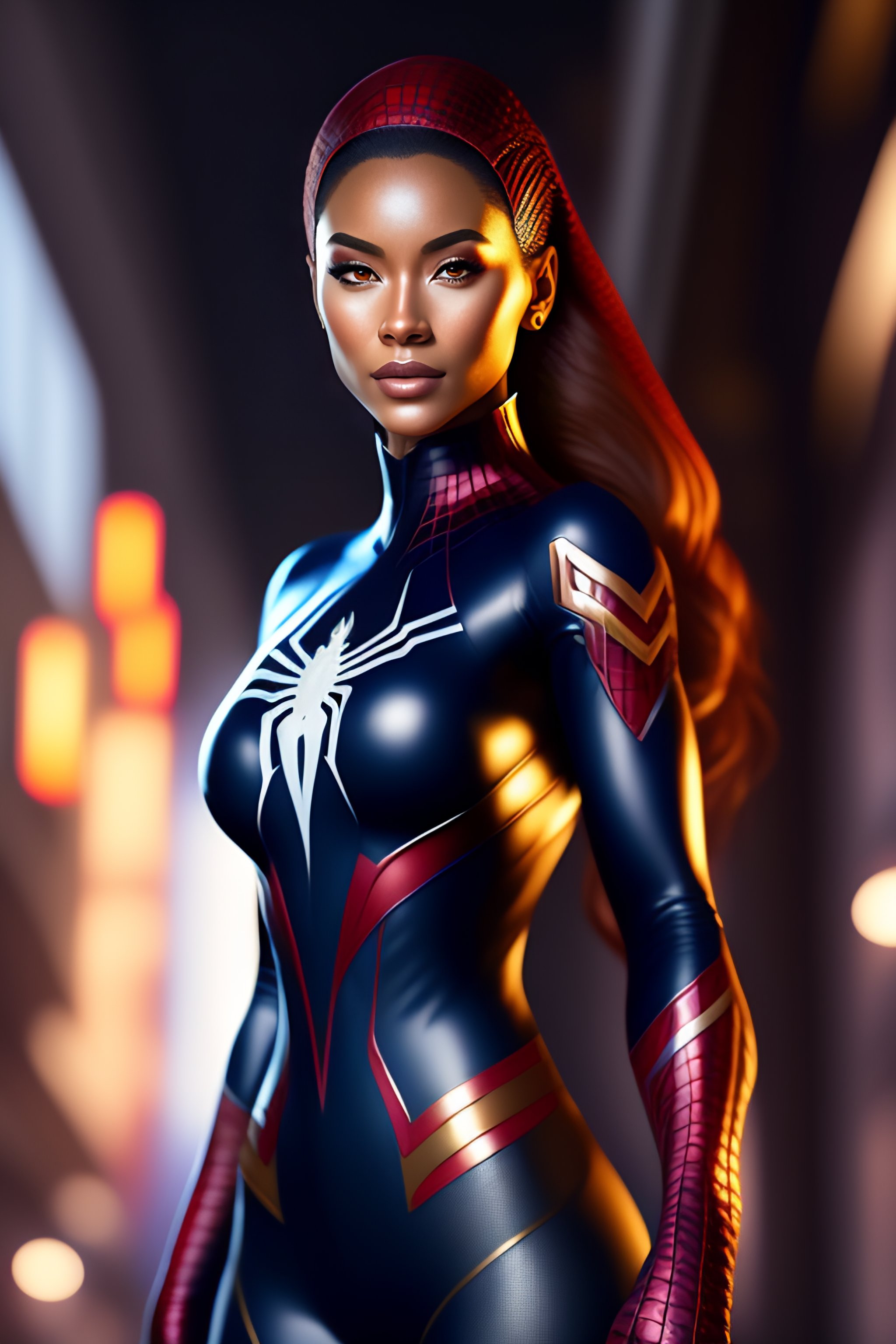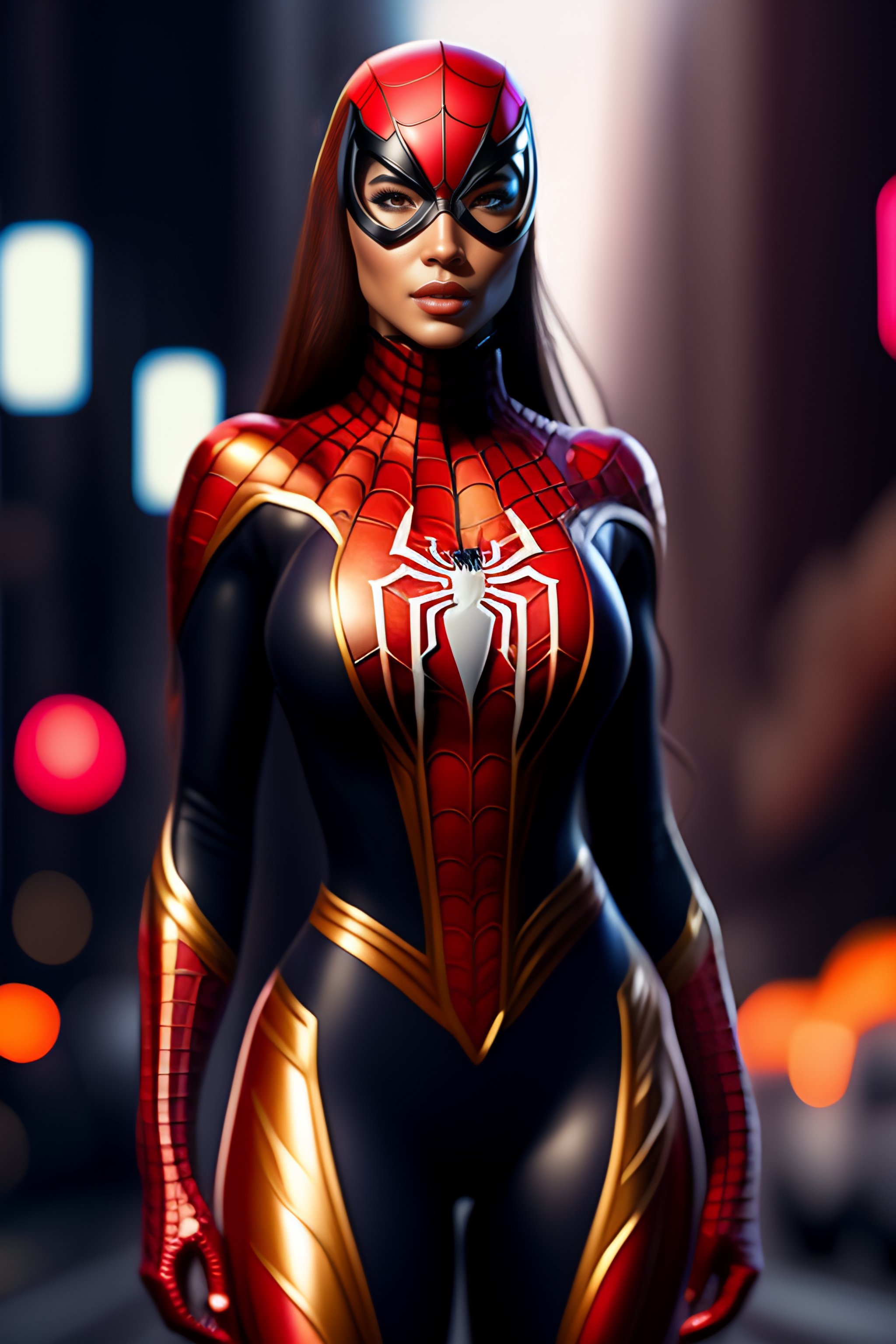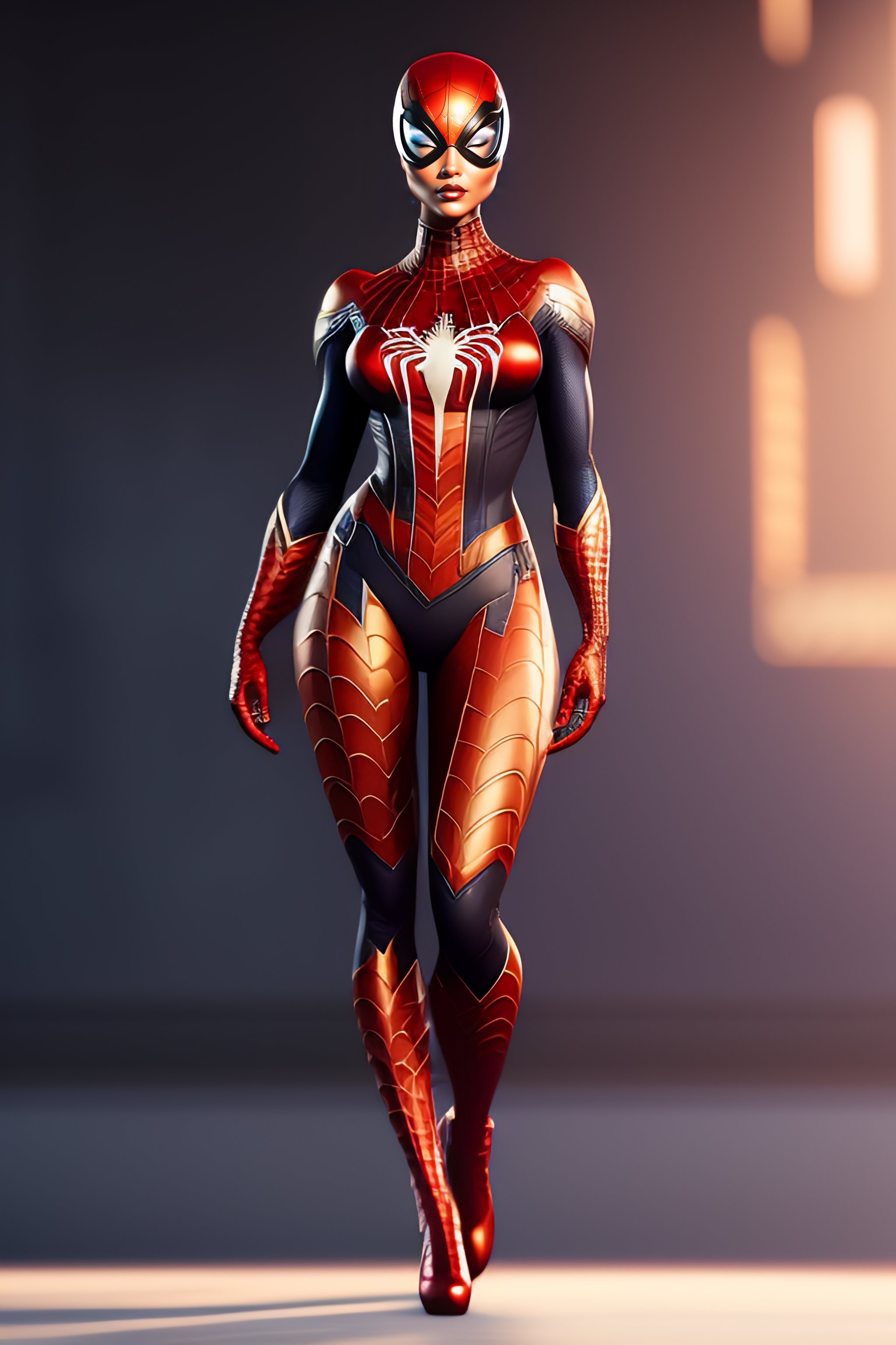 A female version of spider-man in full body view, dream-like art, smooth lighting, artgerm, artstation, full body shot, 8k, cinematic lighting, photoreal, full body view, octane render, ultra-resolution, full body view