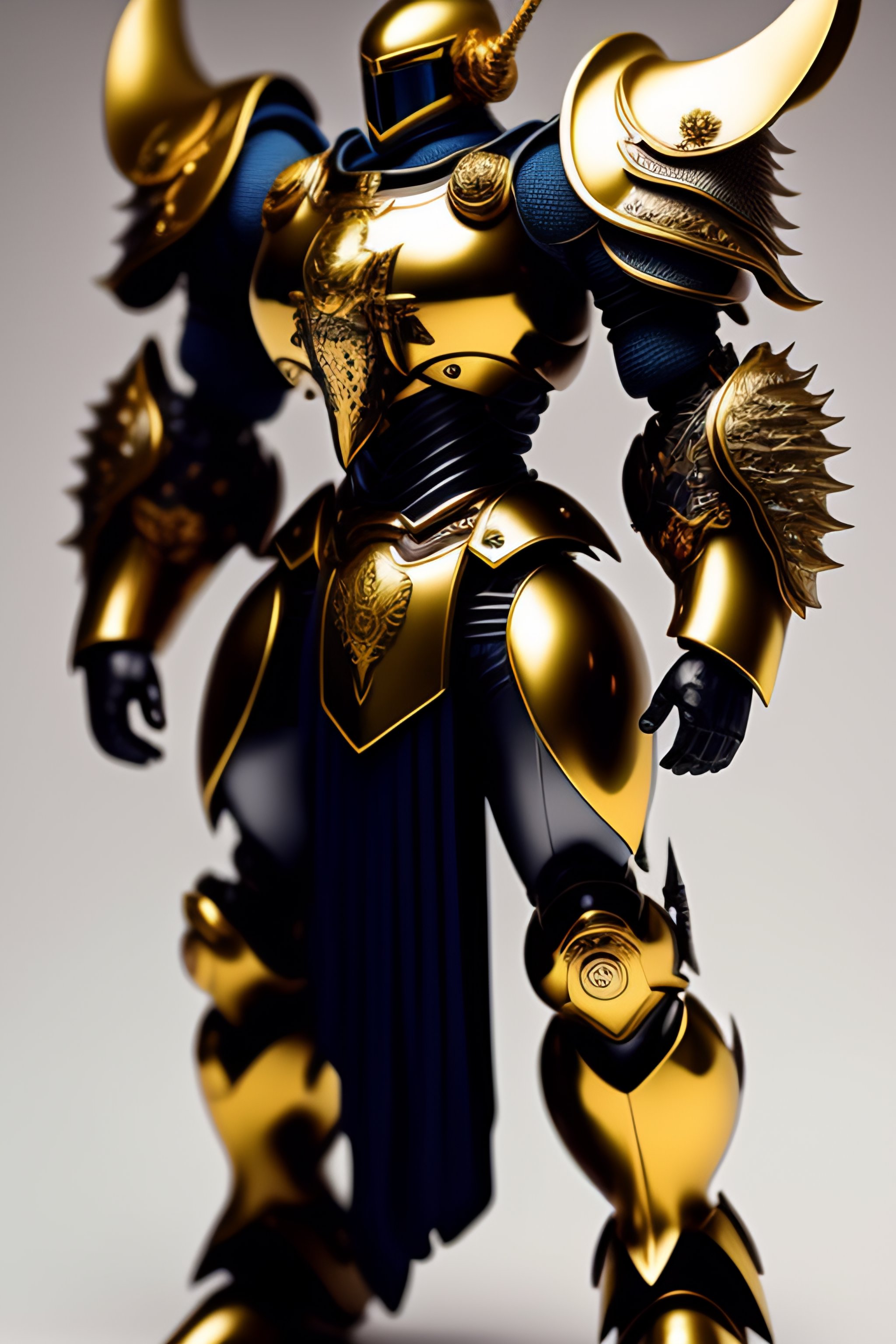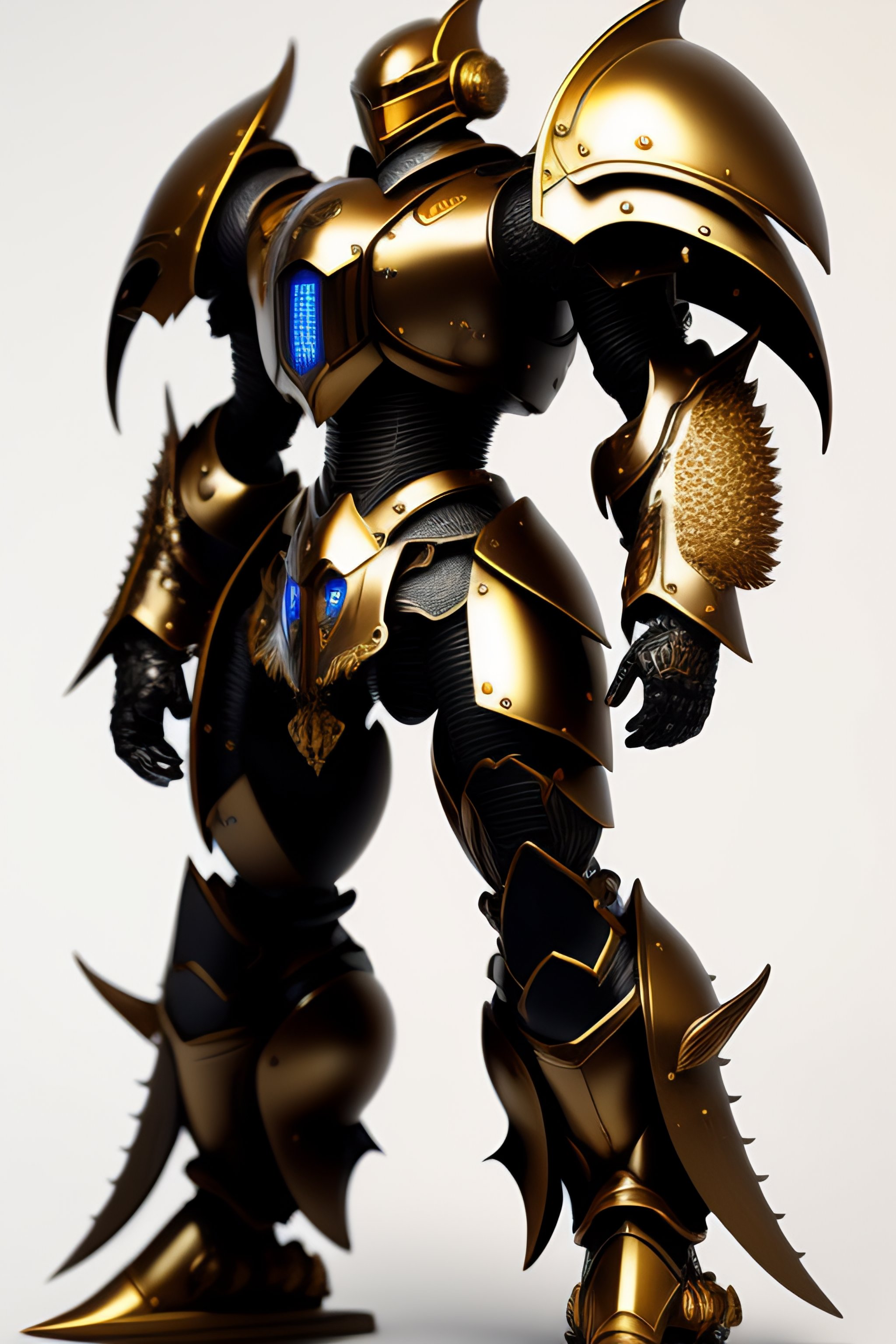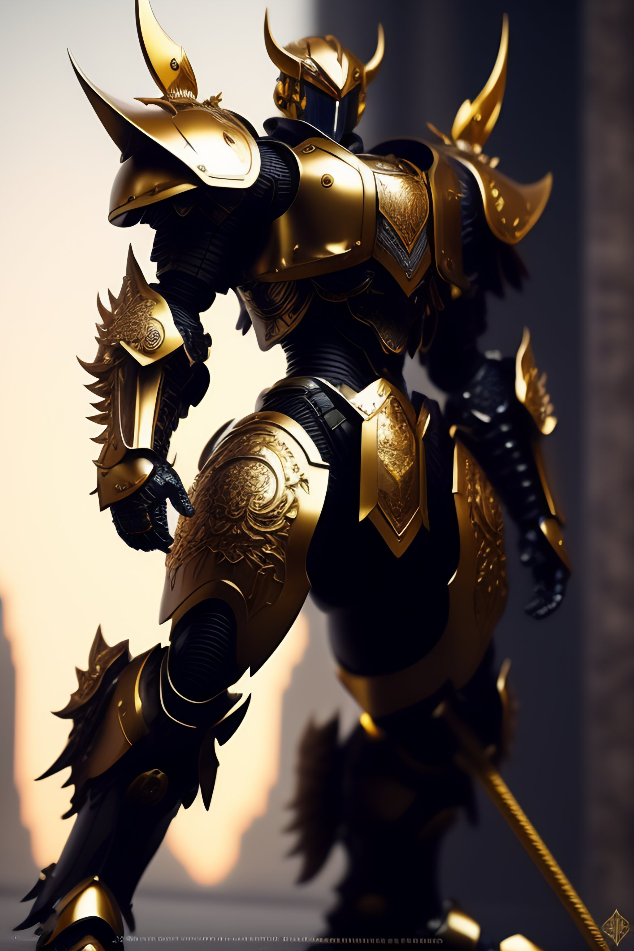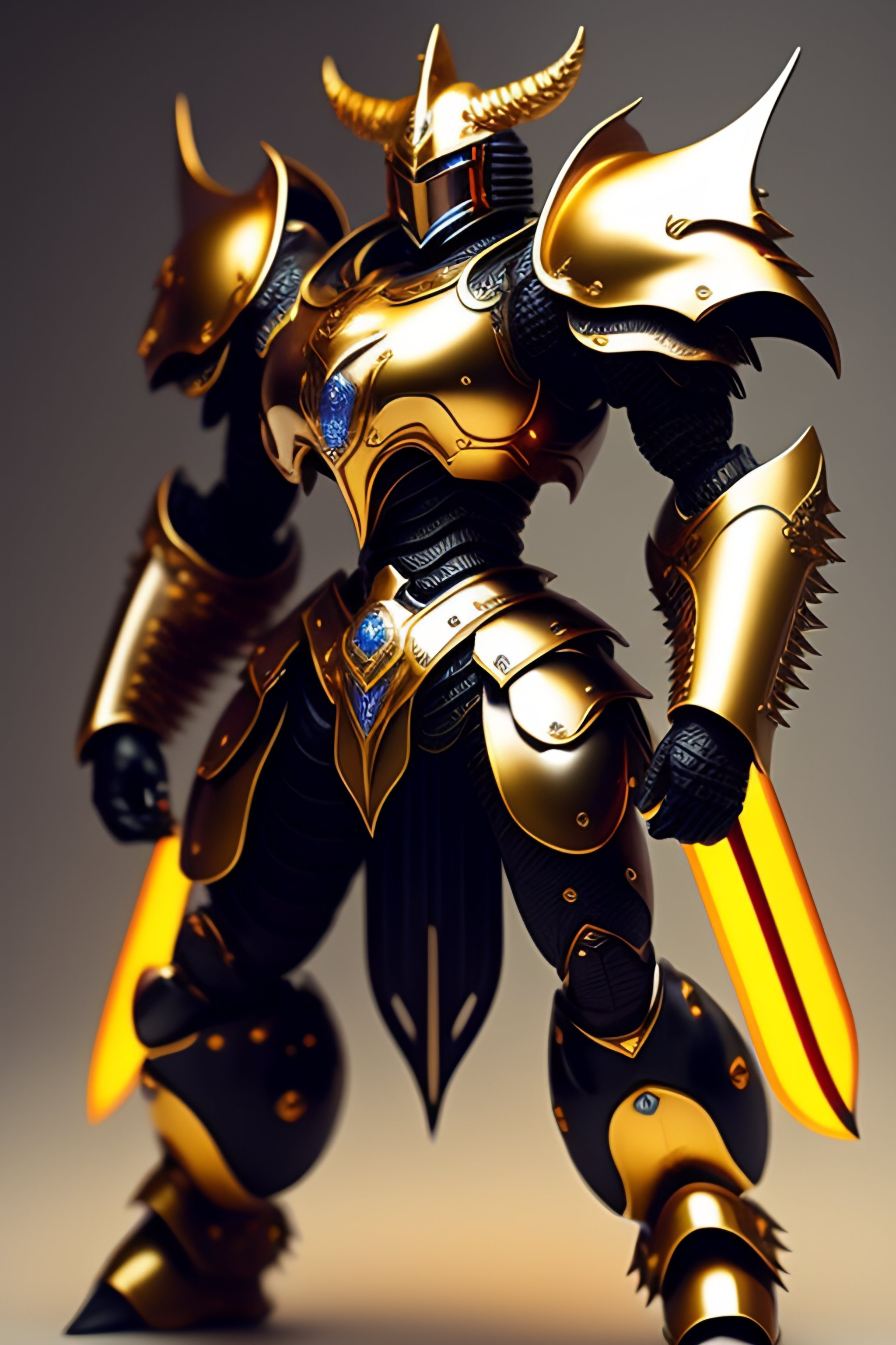 Berserk knight mecha-armor orned with a lot of light, hyperrealistic, highly detailed, sci-fi, full body with a katana and a wakizashi, gothic art, gold and titanium, art by nicolas dujols and lim chuan shin, lot of spike