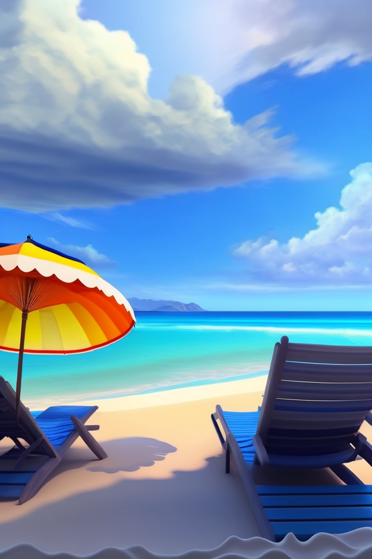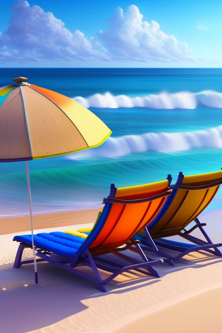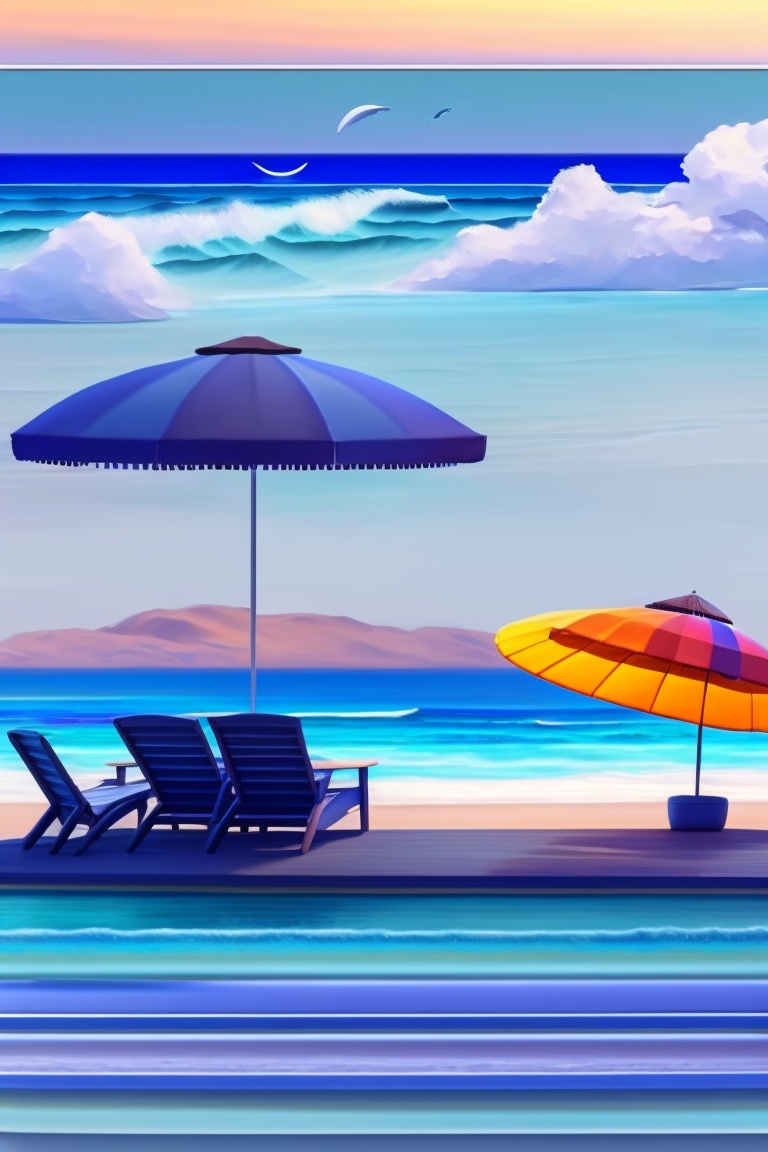 Endless ocean with dark blue waves, bright umbrellas and lounge chairs scattered throughout the area, white sandy beach washed by waves, contours of high mountains surrounding the beach, feeling of freedom and openness, relaxing sound of the surf and waves, bright colors and shades reminiscent of summer and relaxation, atmosphere of peace and tranquility, memories of past trips to the beach and enjoying the sea breeze, pleasant warmth of the sun felt on the skin, realistic style, realism, 4k