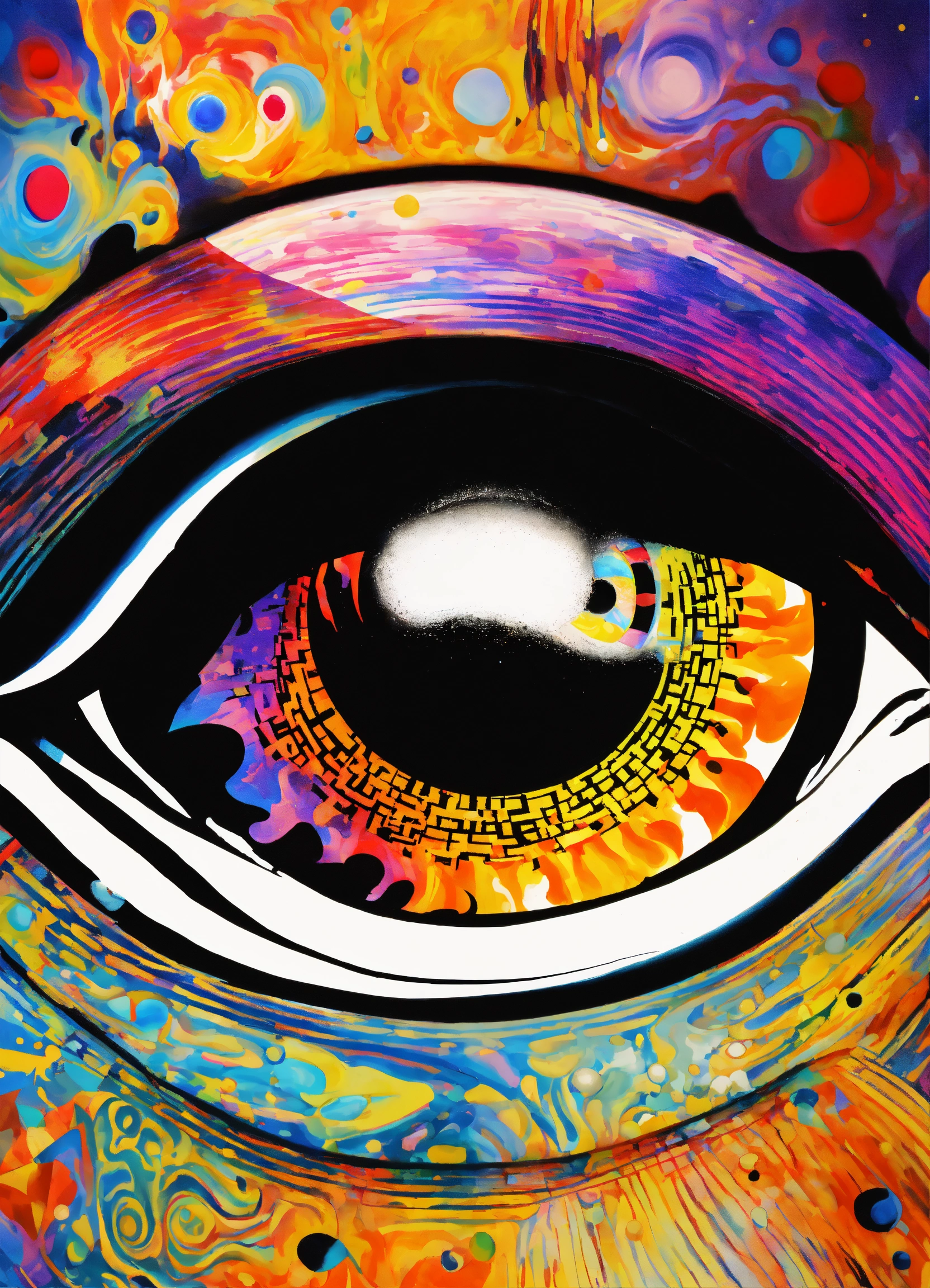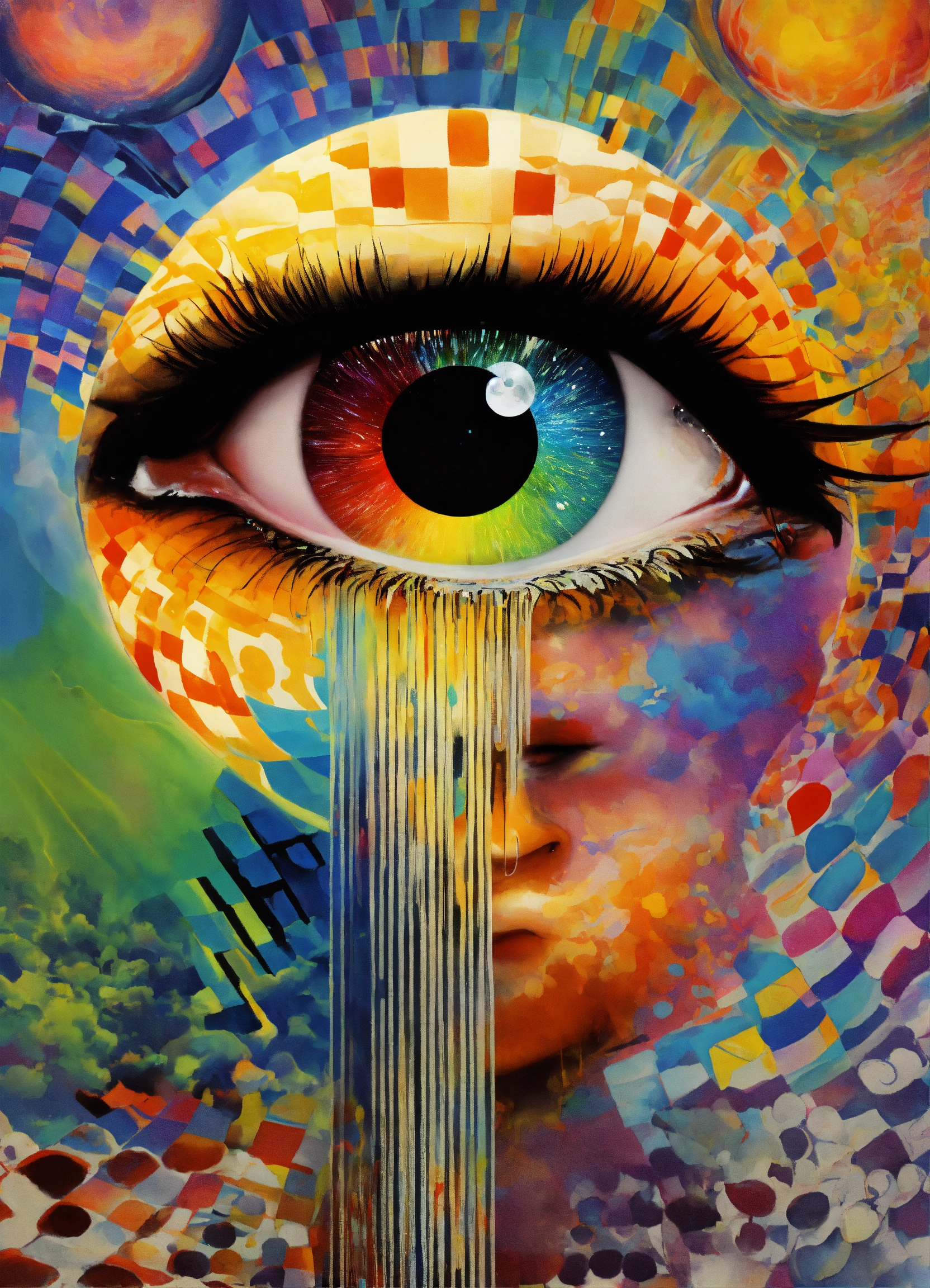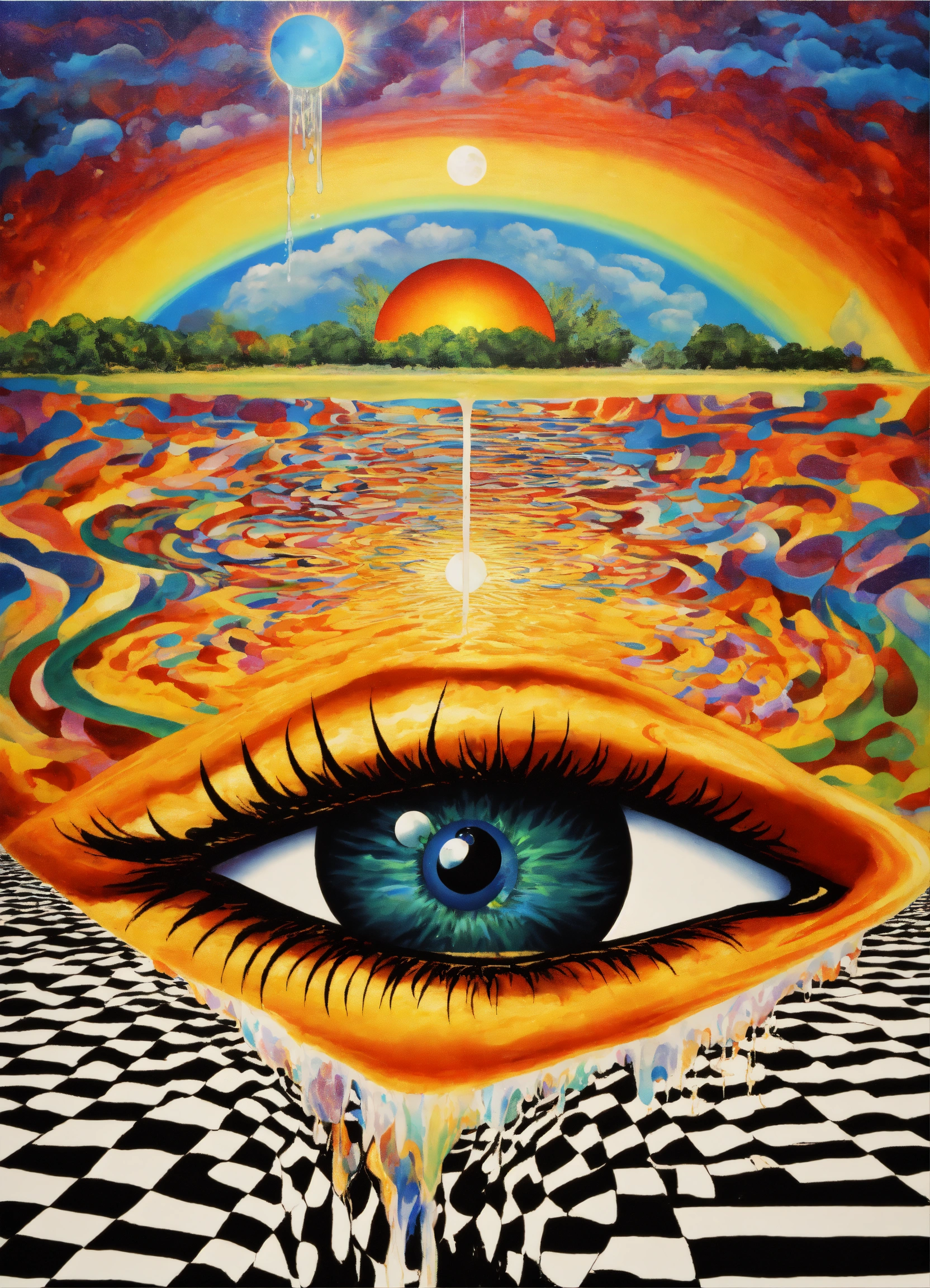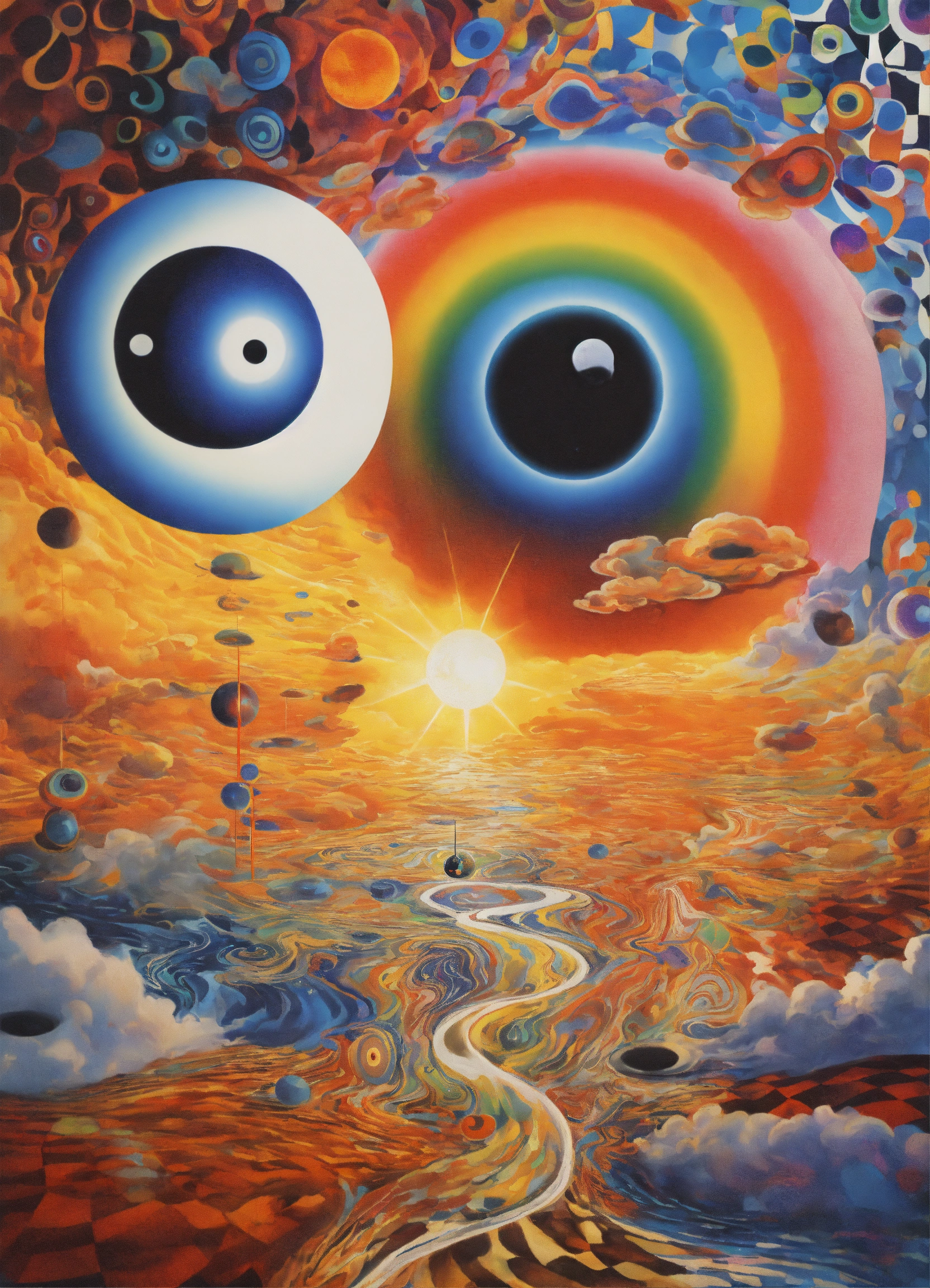 Maddive eye emerging from a human head containing.abstract psychedelic vortex, sun merging into melting eyeball merging into yingyang, dream dimension merging into nebula merging into sun, rainbow geometrical clouds dripping, the four corners of the universe, wavy black and white checkerboard patterns dripping by mc escherjapanese vintage poster, oriental, big sun, abstract psychedelic vortex, sun merging into melting eyeball merging into yingyang, dream dimension merging into nebula merging into sun, rainbow geometrical clouds dripping, the four corners of the universe, wavy black and white checkerboard patterns drippin