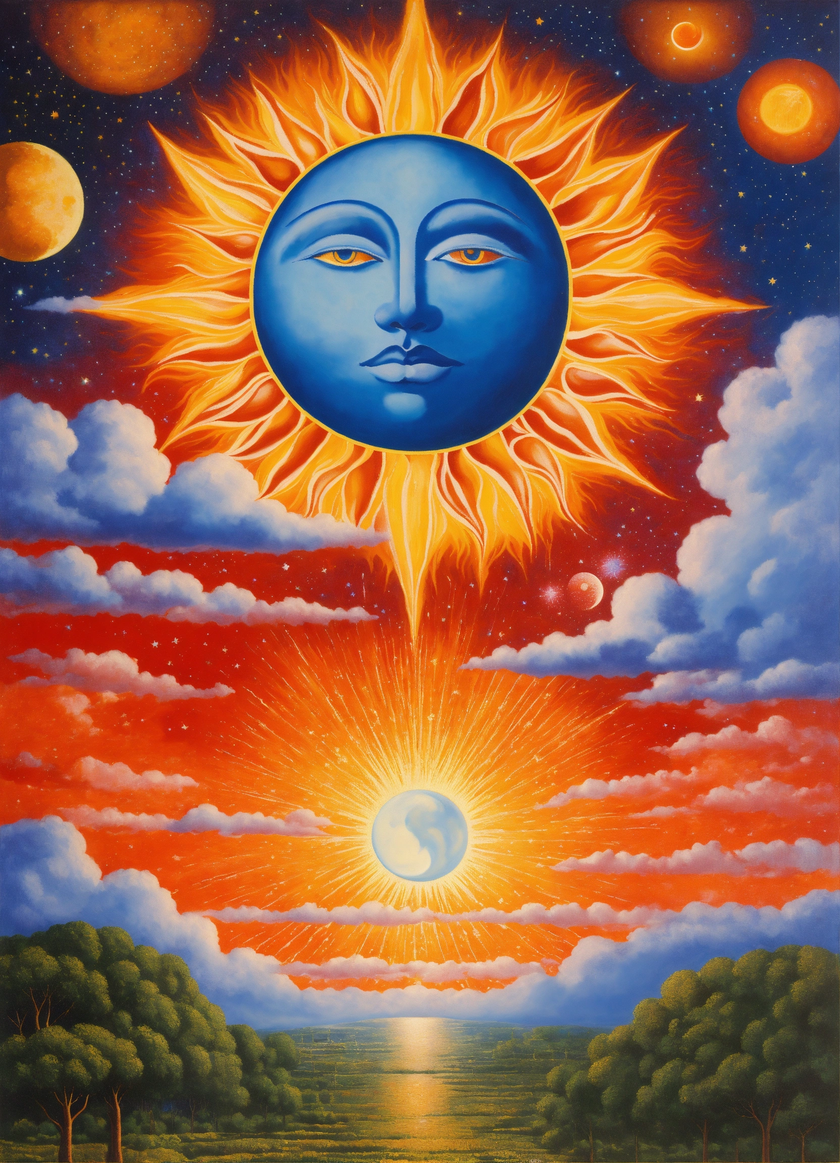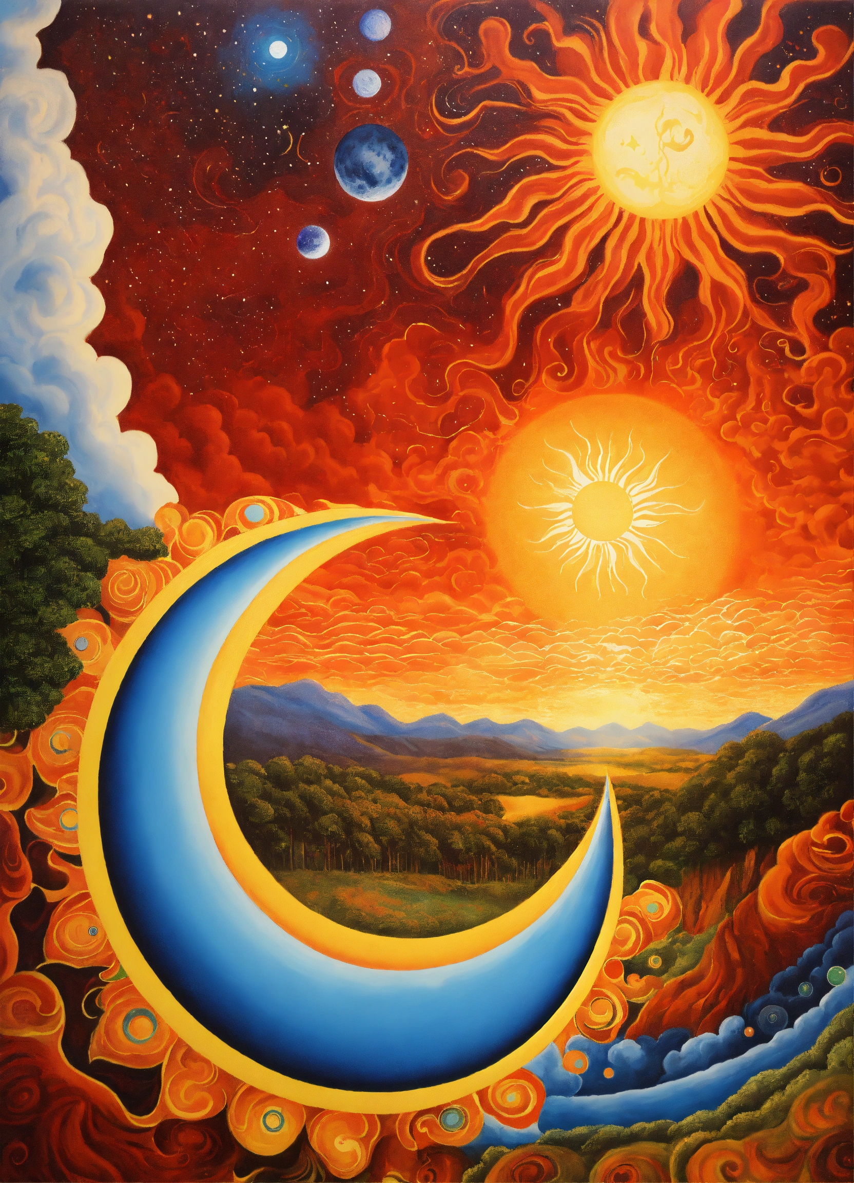 Cosmic energy, sun and moon background, aboriginal psychedelic art, in the drem dimensions, painted by rene magritte, night and day, stars and clouds