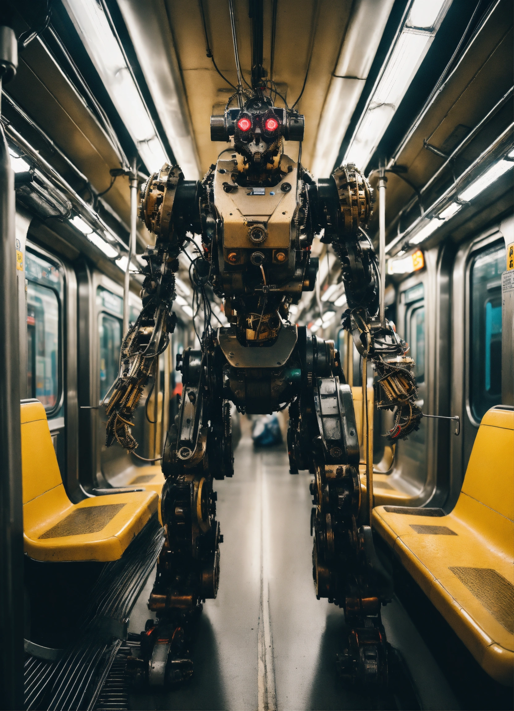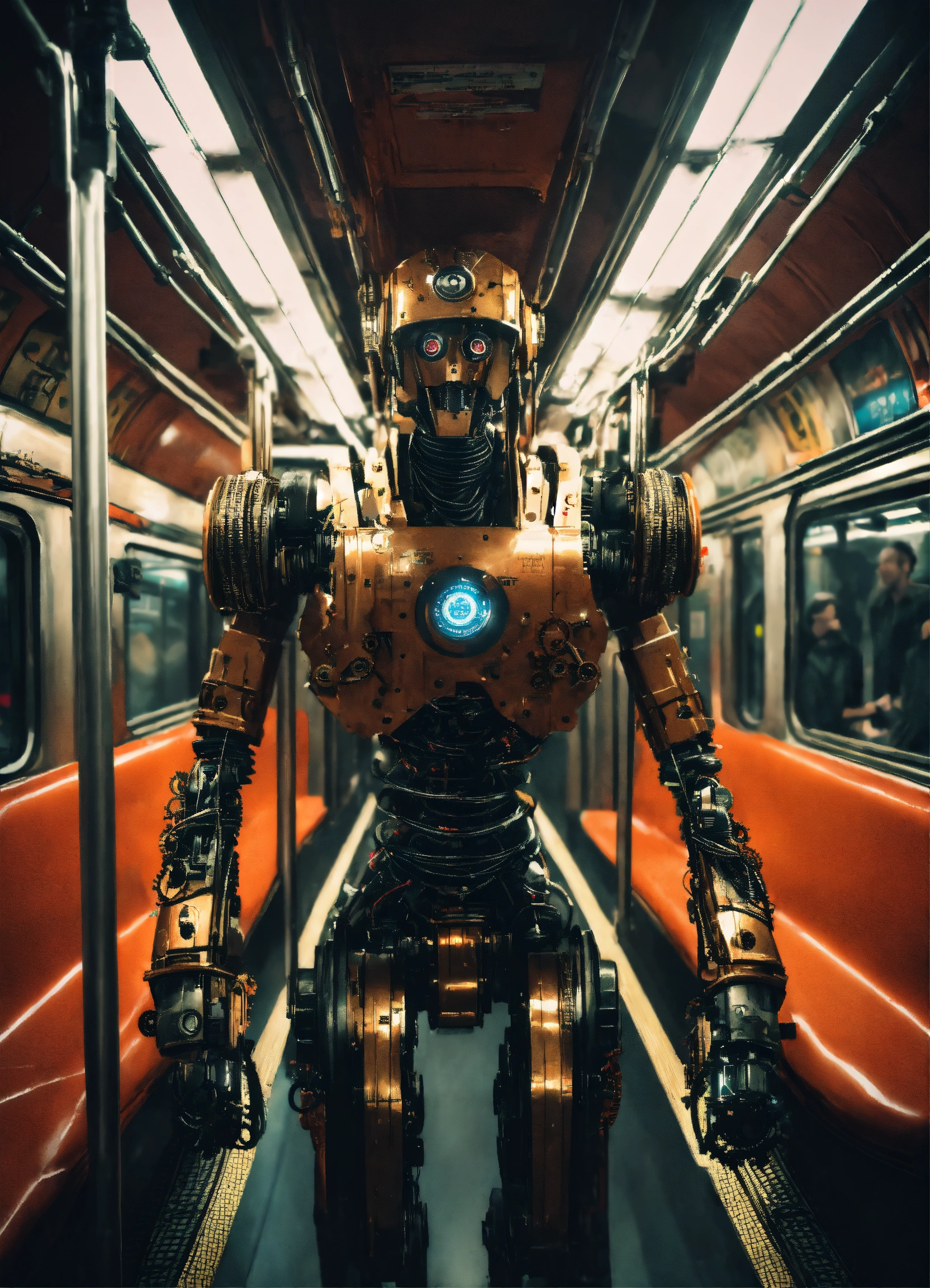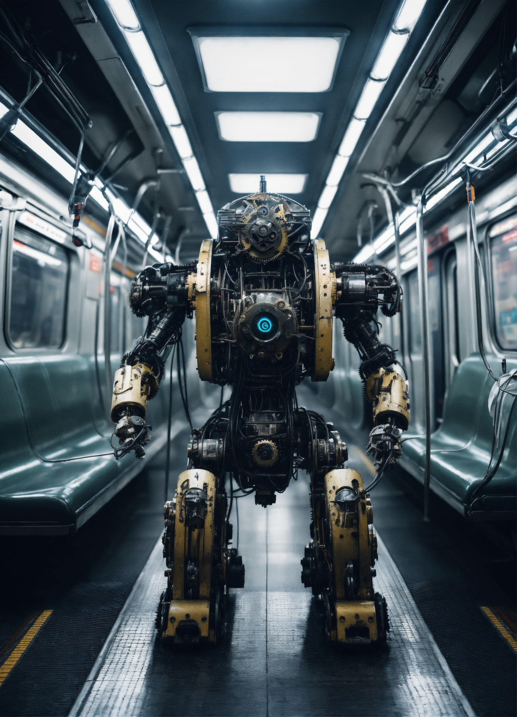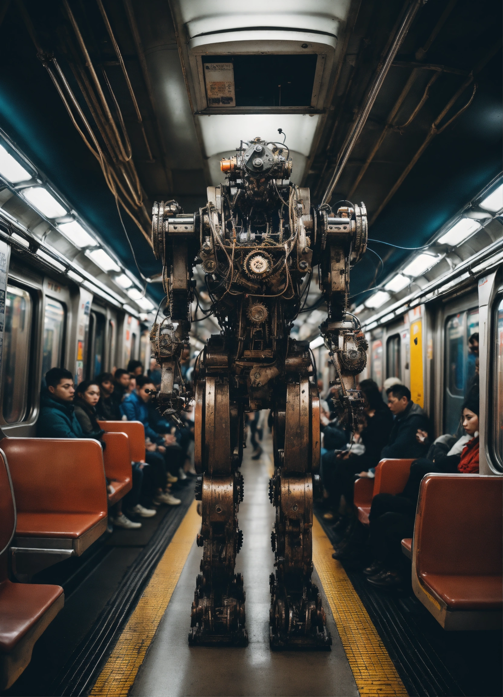 Dark aesthetic, futuristic mechanical robot with (gears and wires), commuting in a very crowded subway train during rush hour, stunning wide-angle environmental portrait photo, 8k