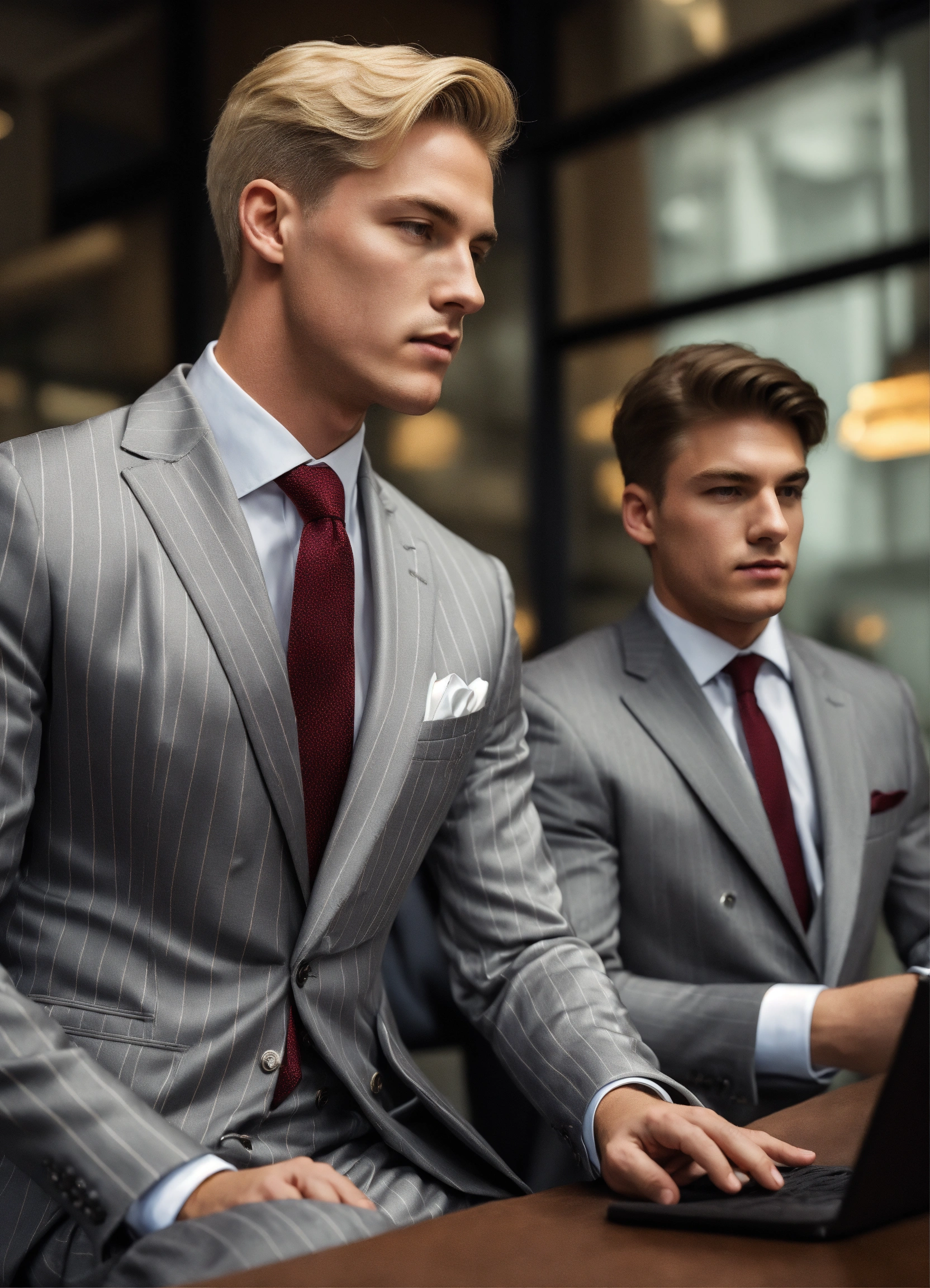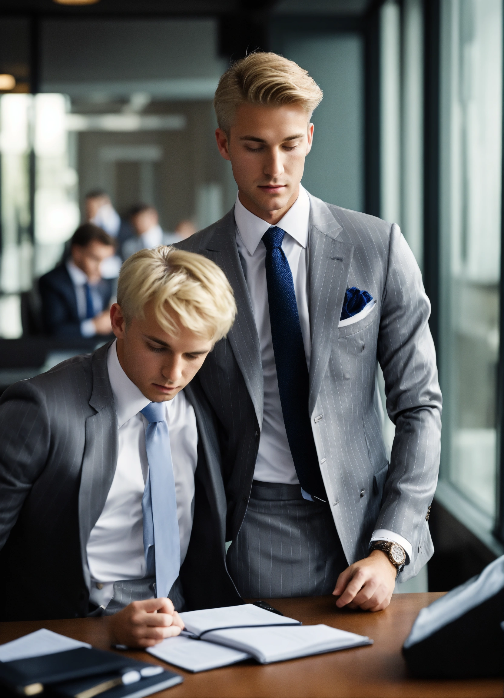 A young blonde male lawyer in light grey satin pinstripe double breasted suit, supervising his young male employee