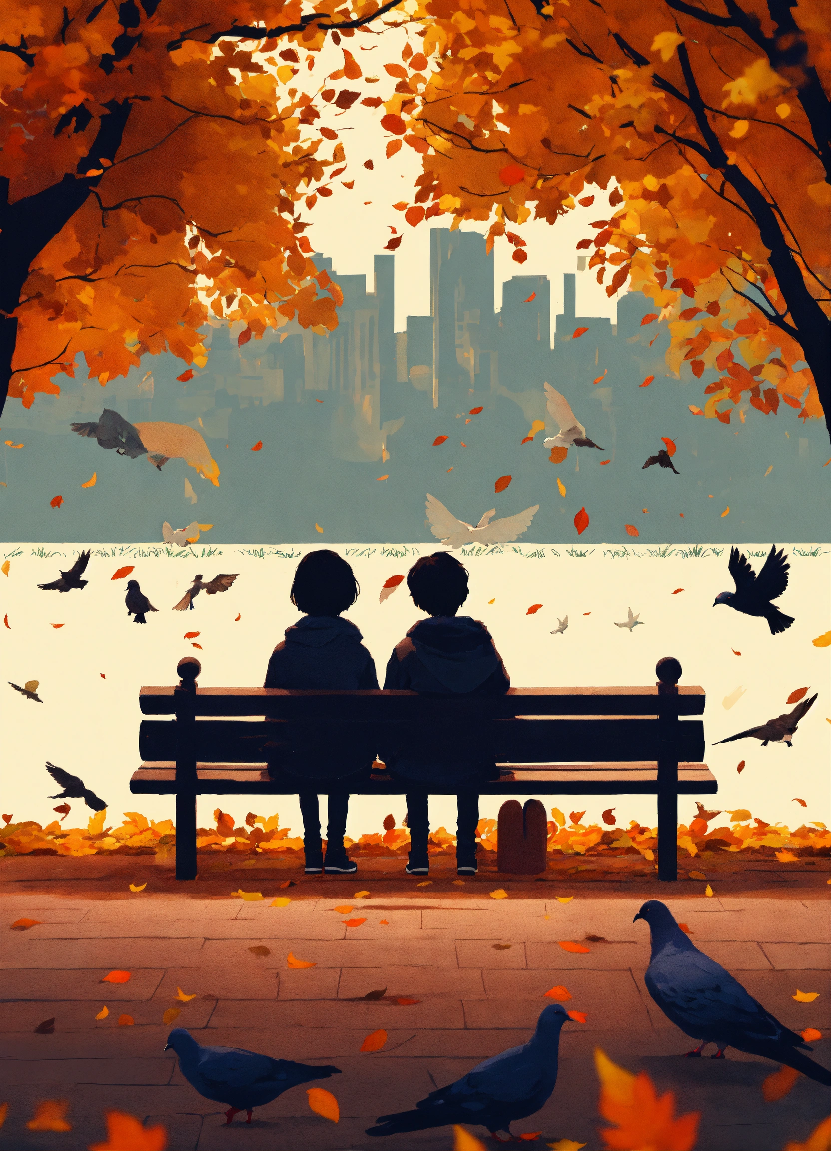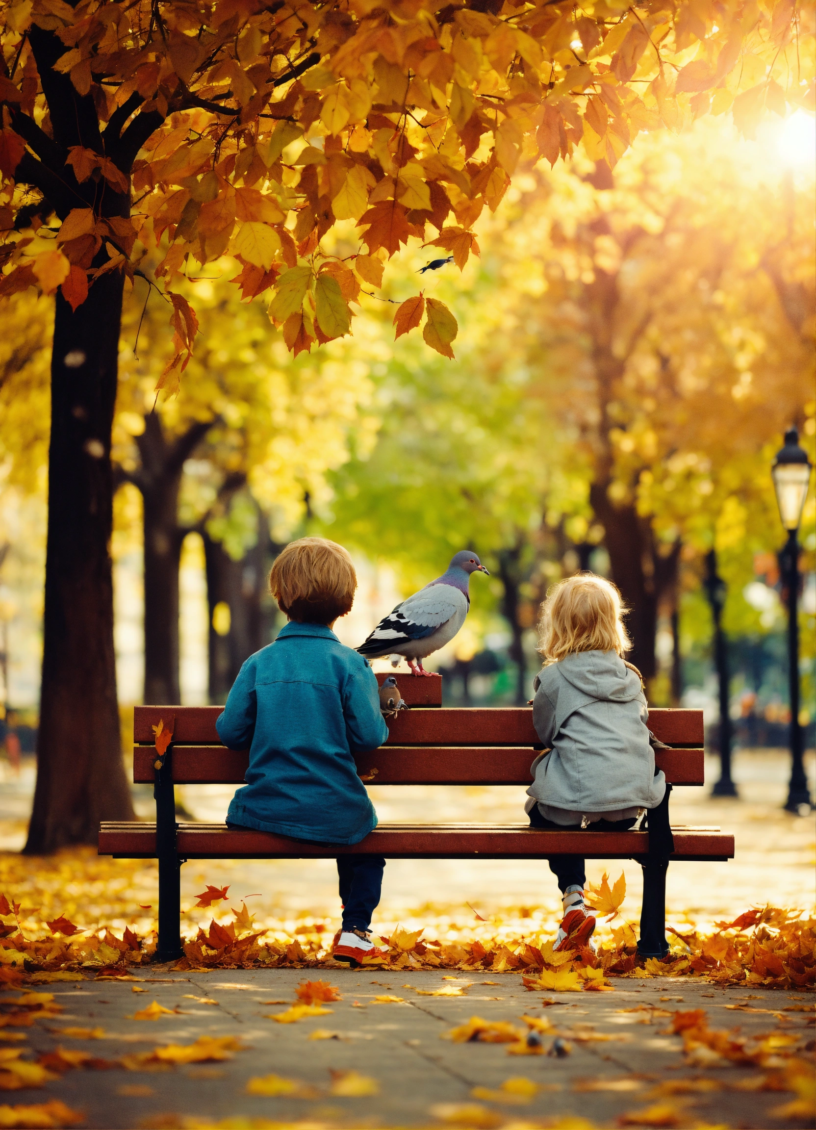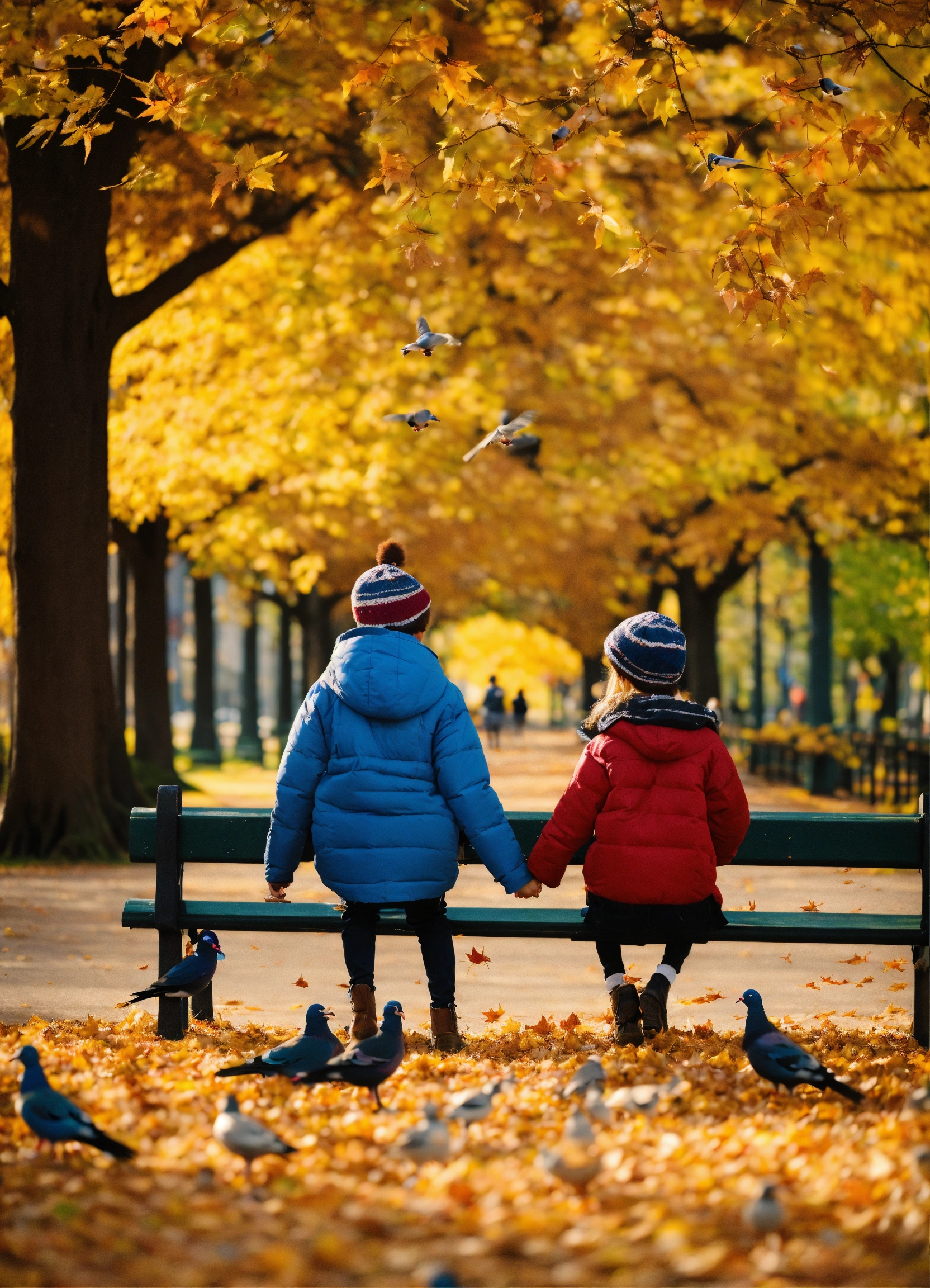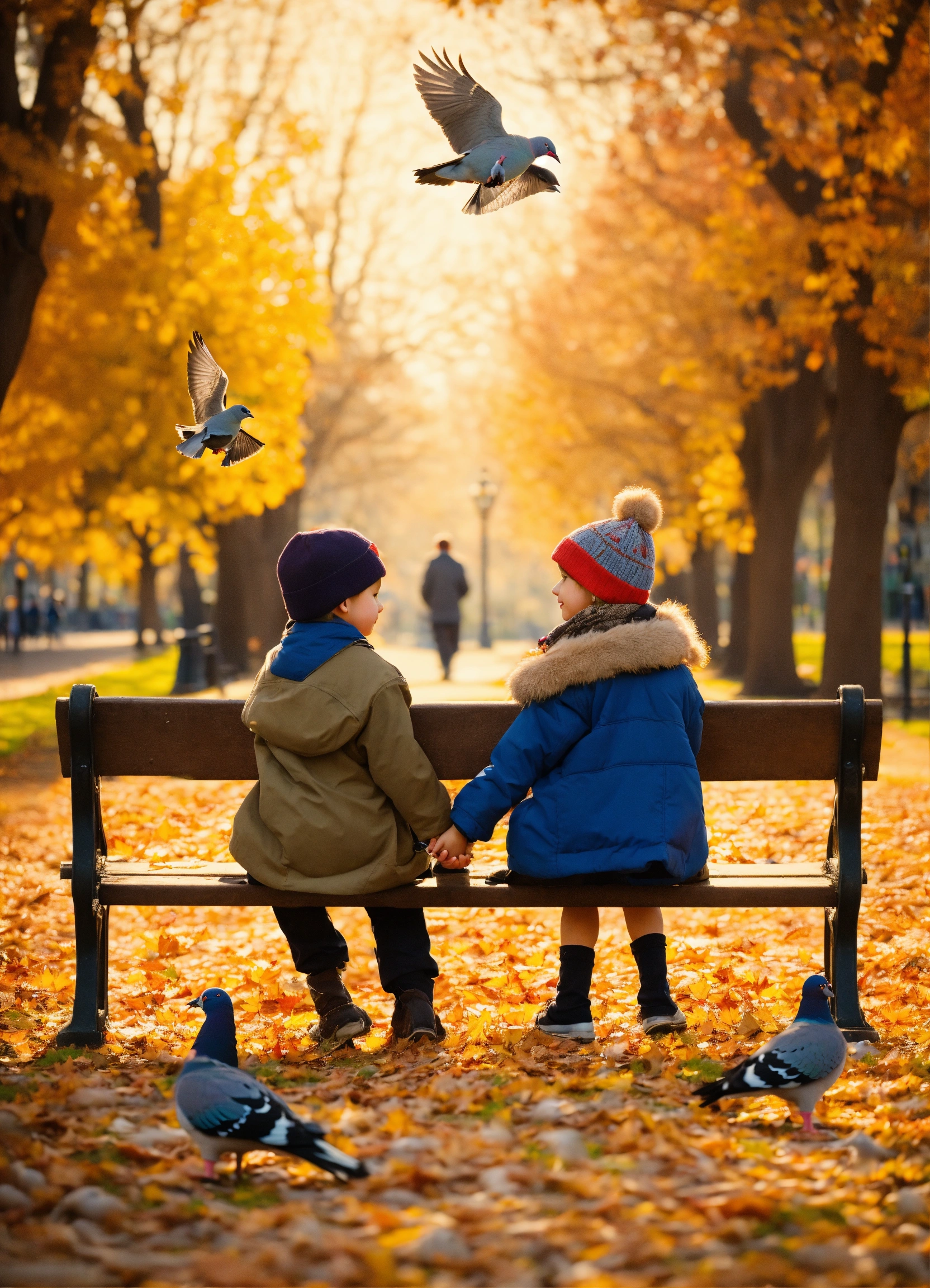 Boy and girl holding hands sitting on park bency with pigeons in park with bench autumn trees and leaves on ground