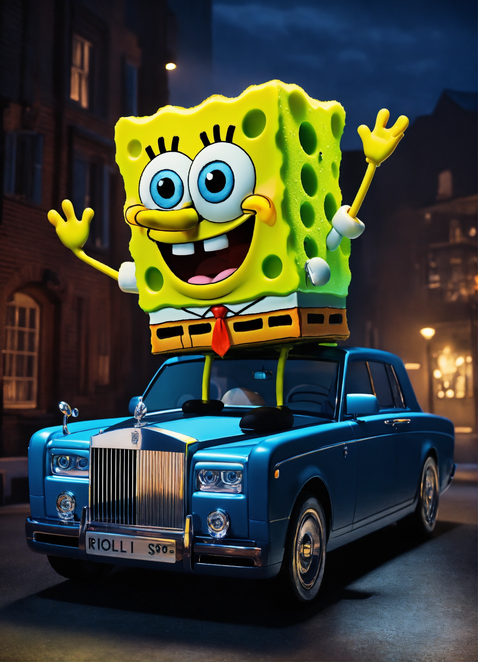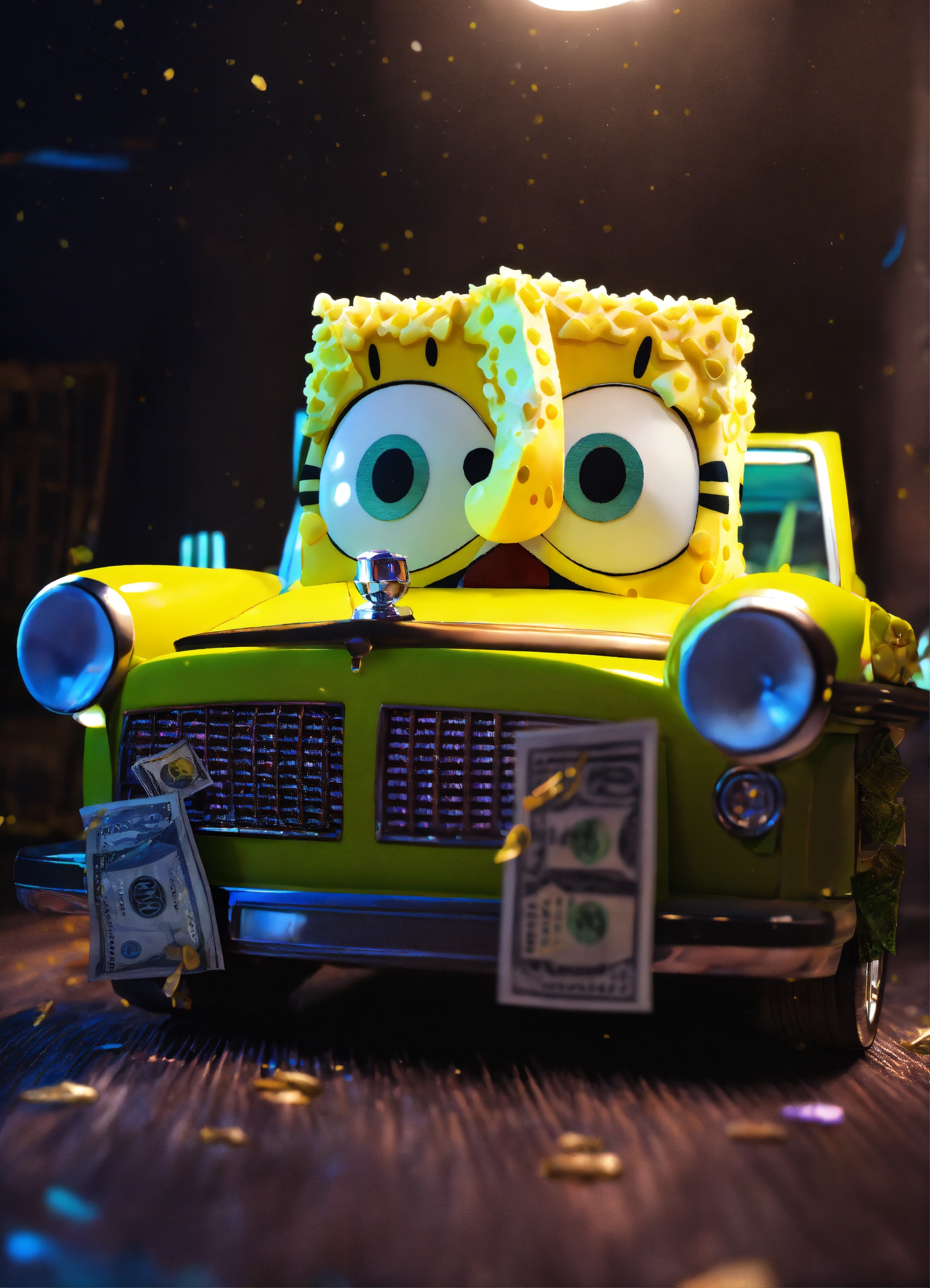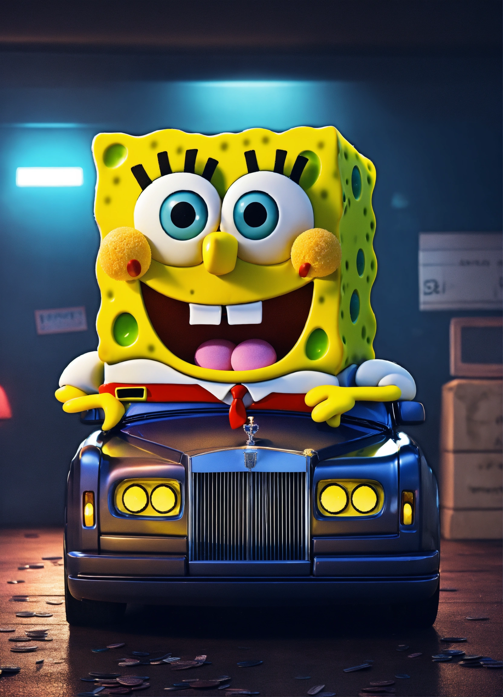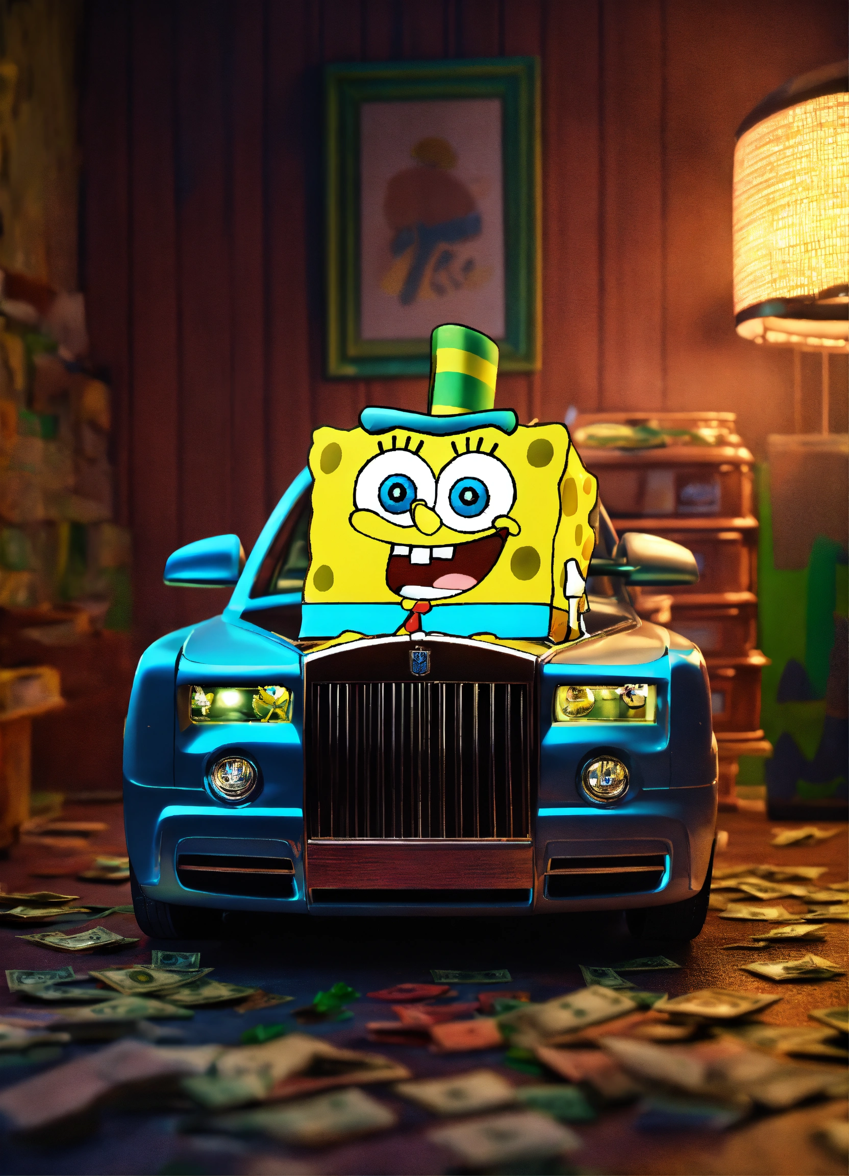 3d spongebob squarepants flexing cash on top of a rolls royce in a dark room