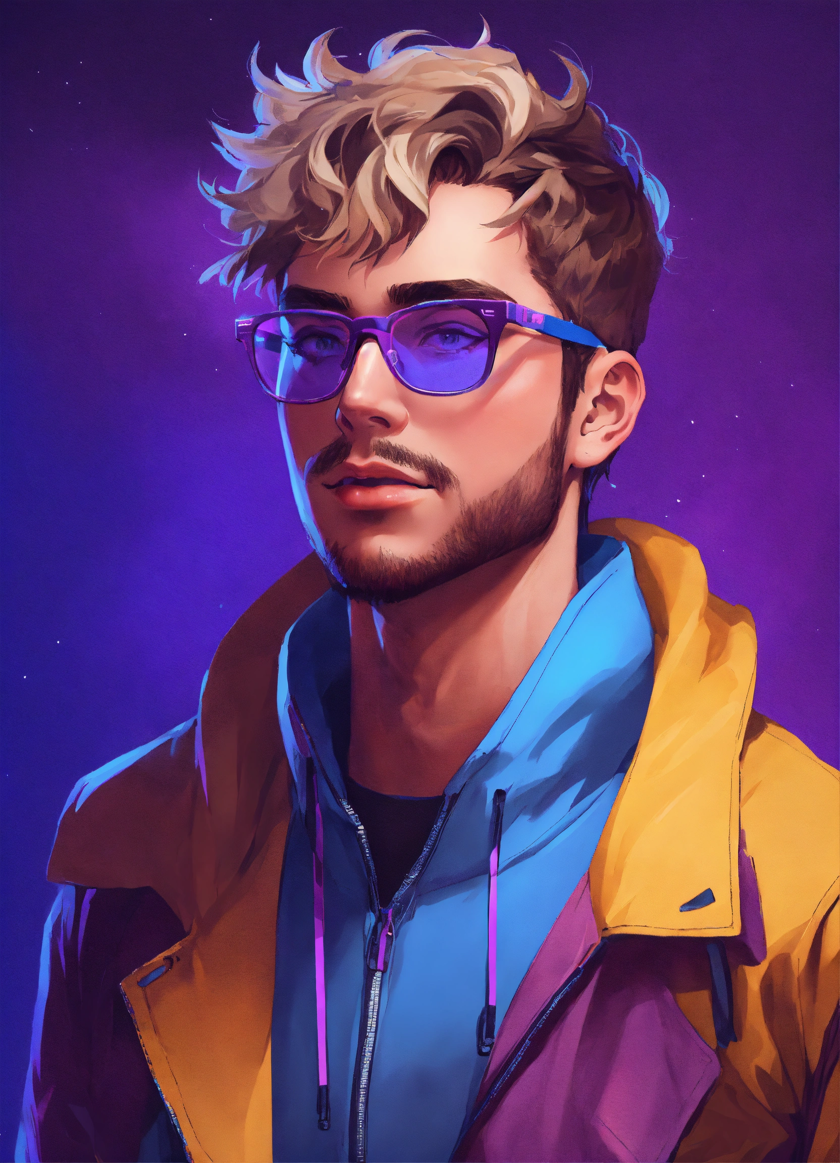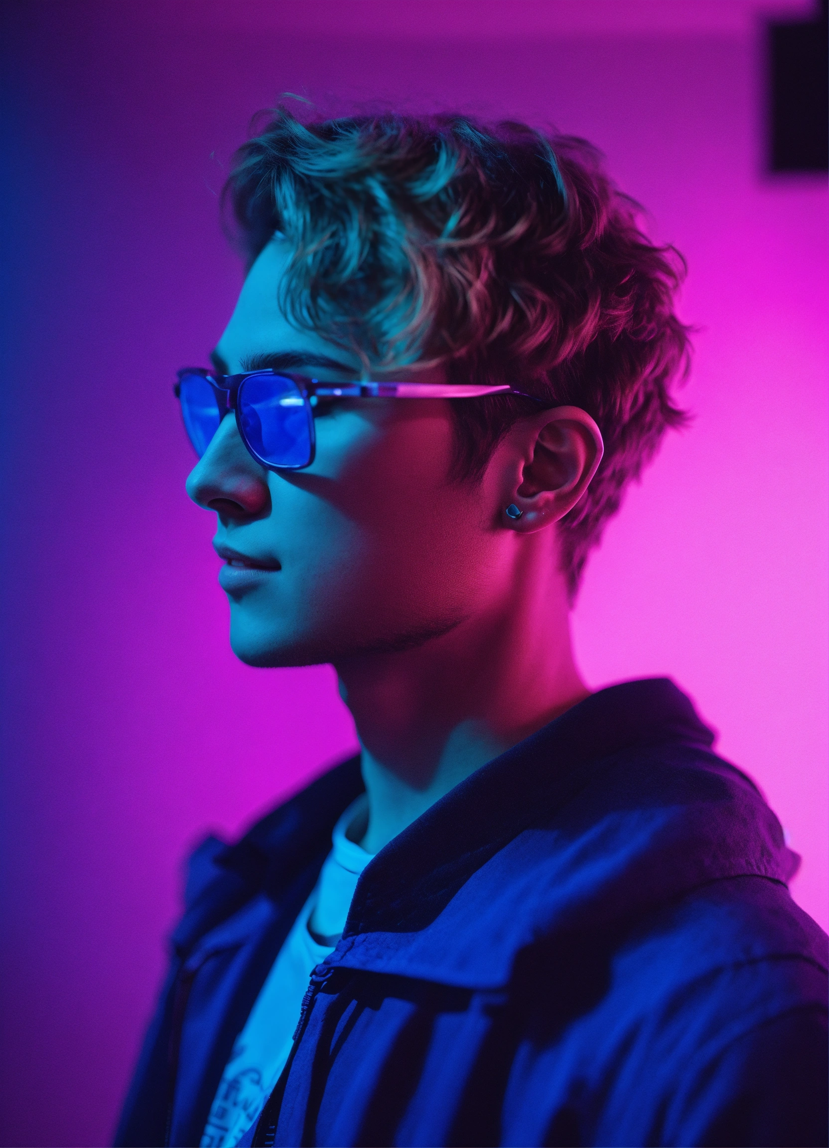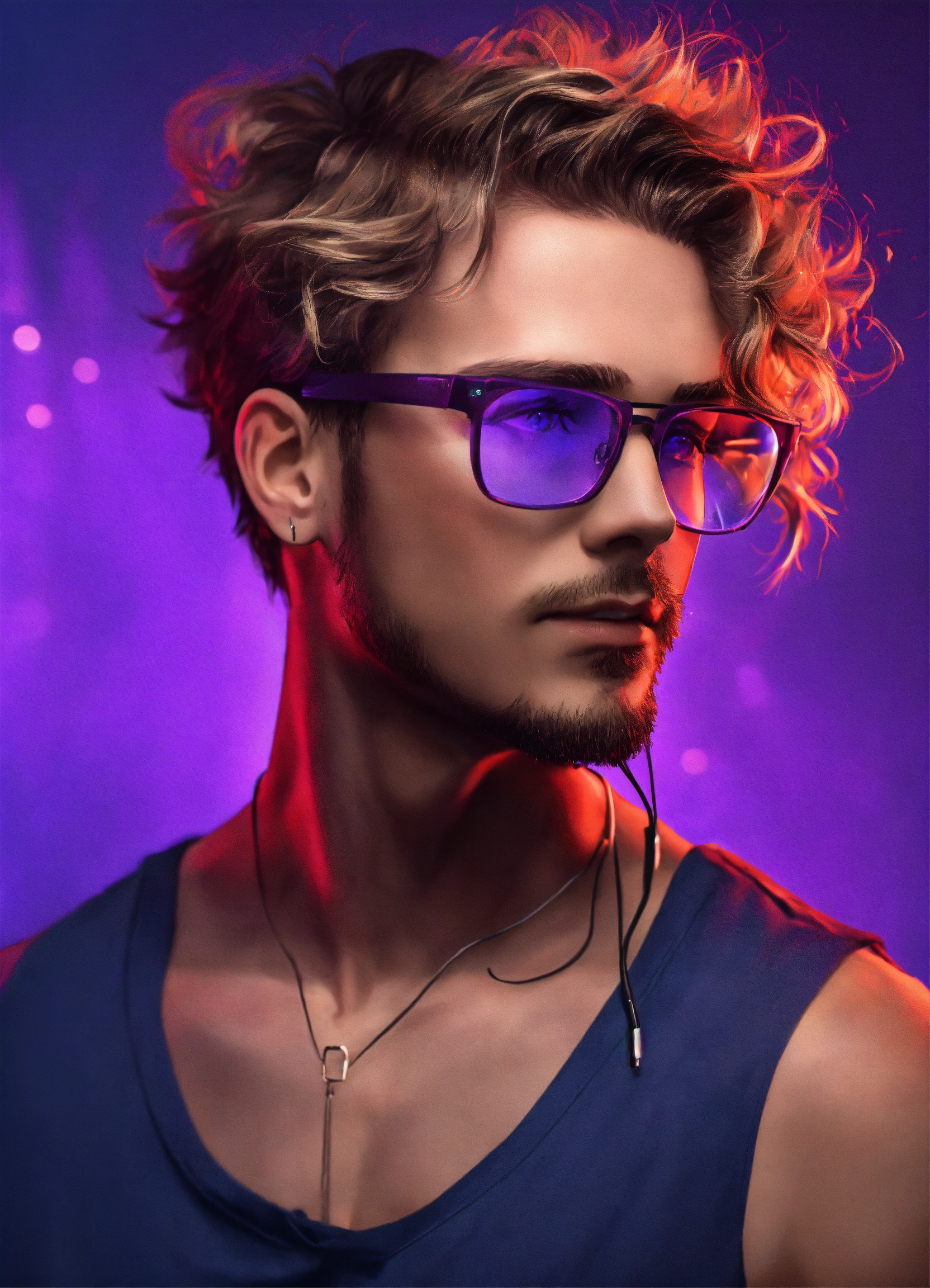 A male gaming streamer with dark blonde hair with short wavy hair and wearing blue light glasses with a nice jawline with a purple background and only from the shoulders up from the side angle\