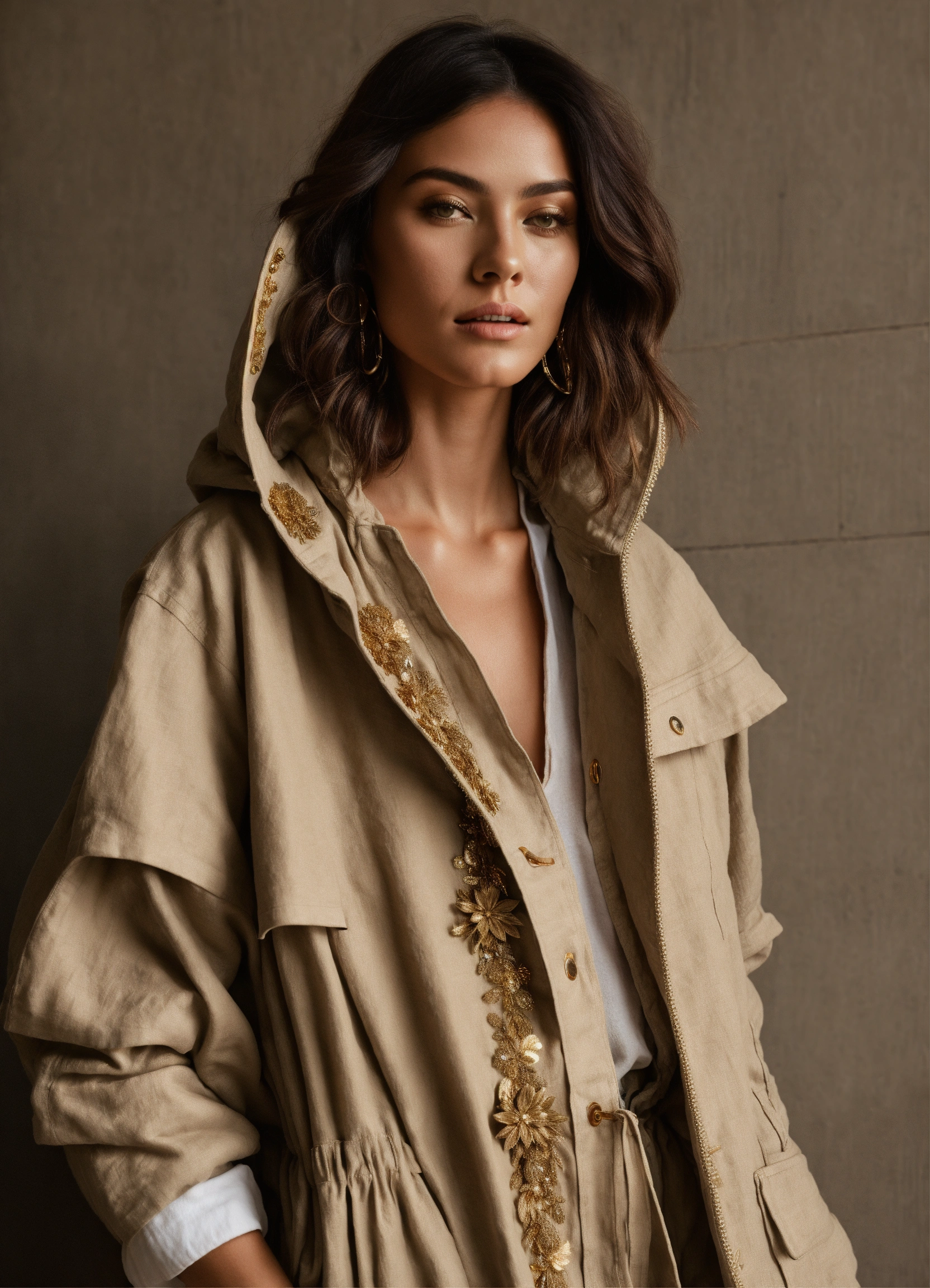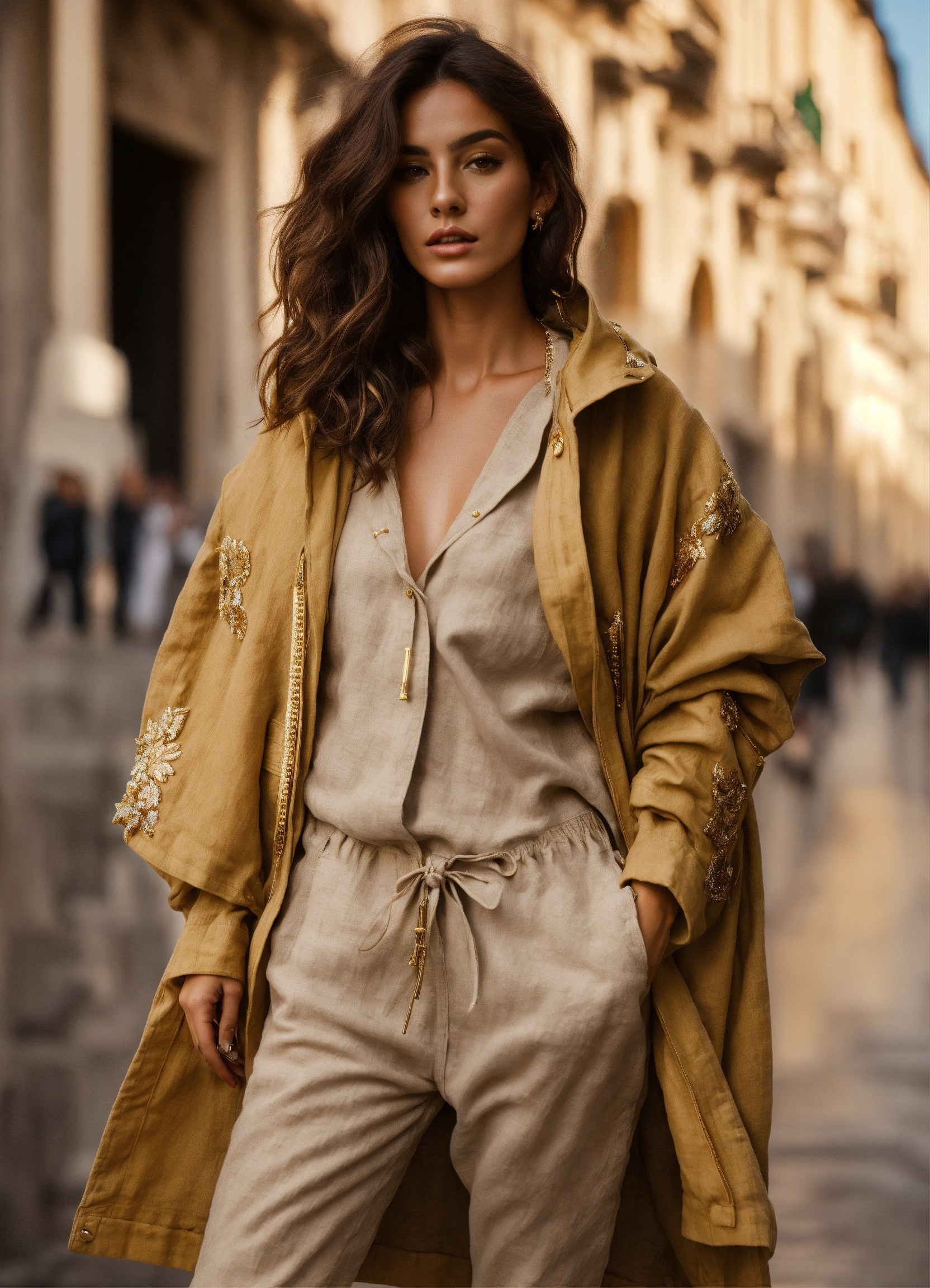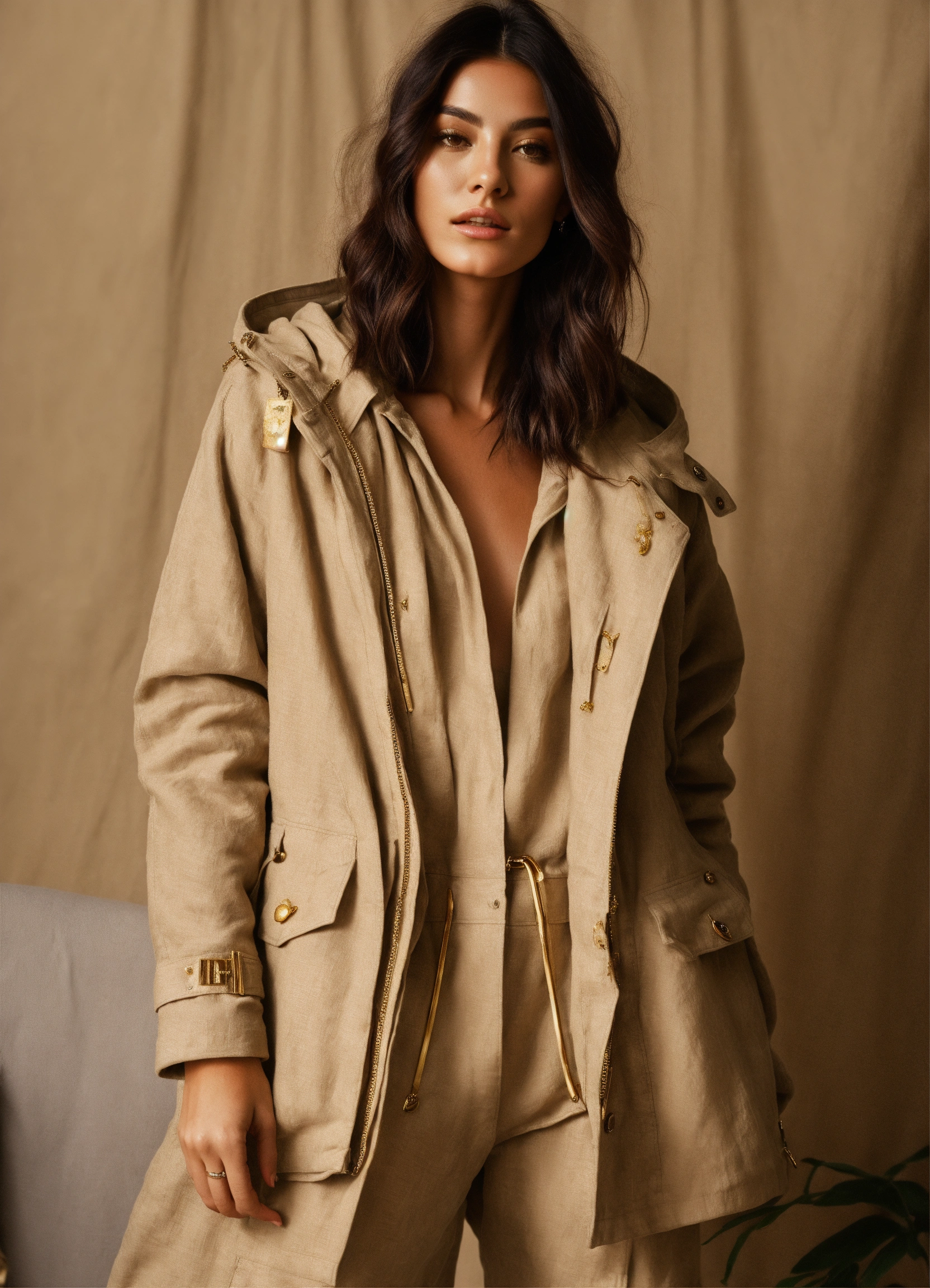Ultra realistic full body photo of an italian female model wearing beige linen summer parka embellished w8th gold details