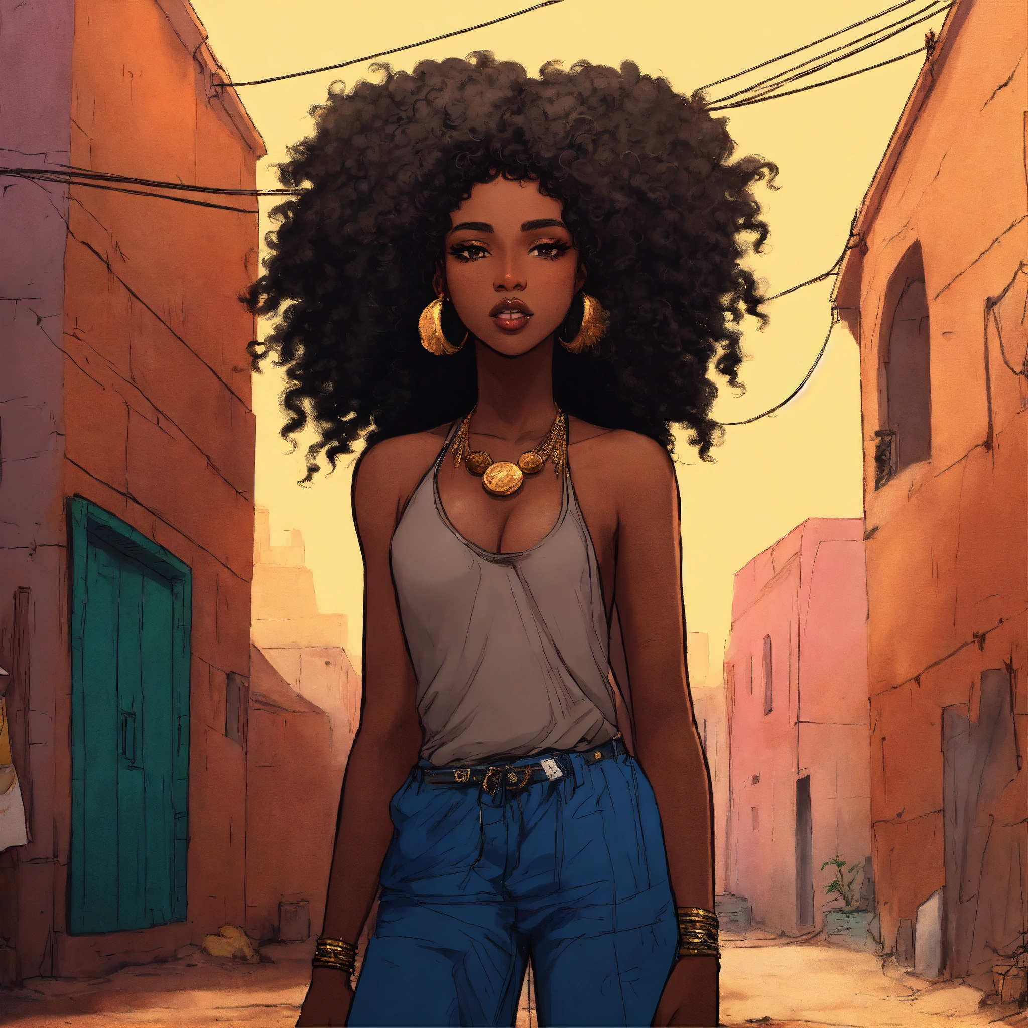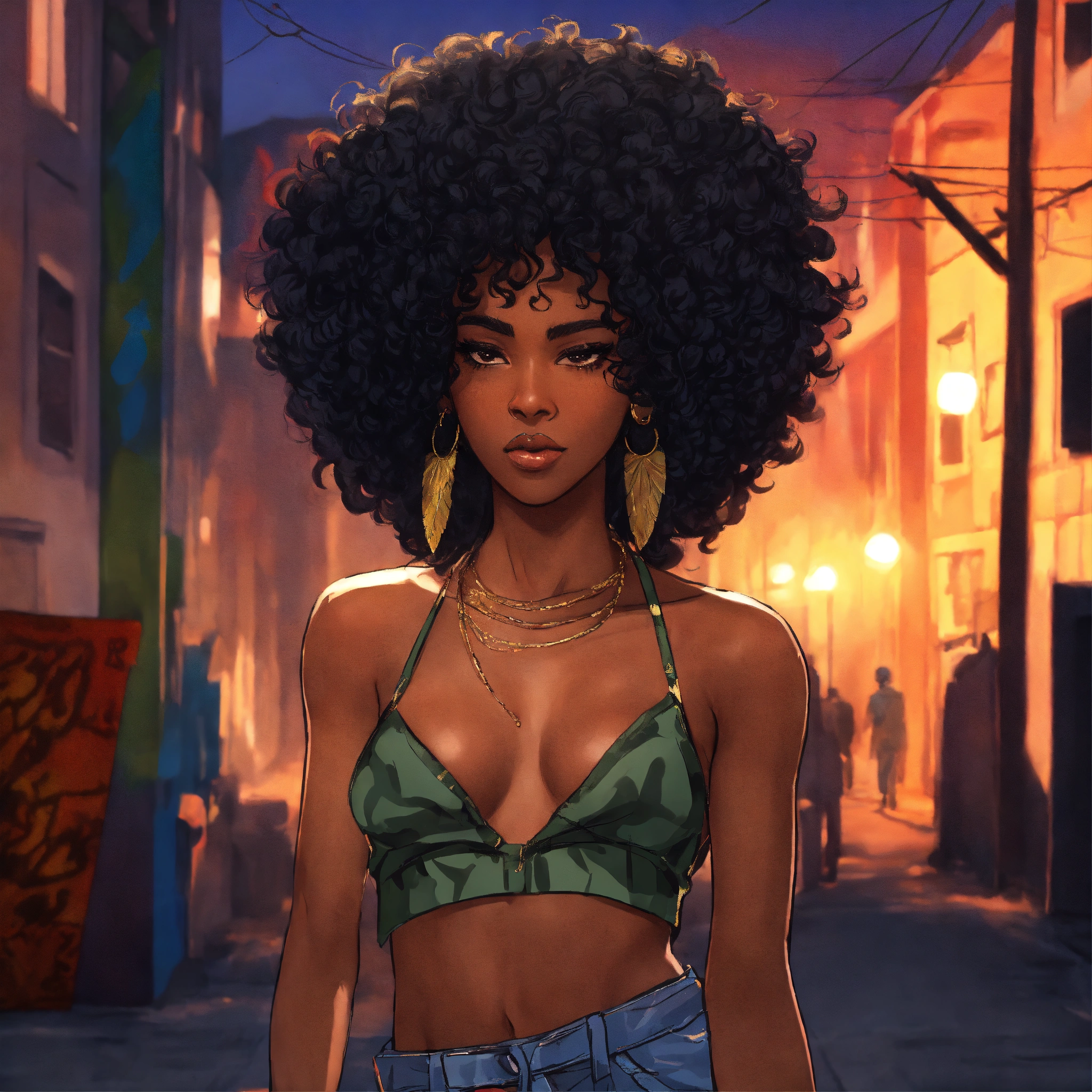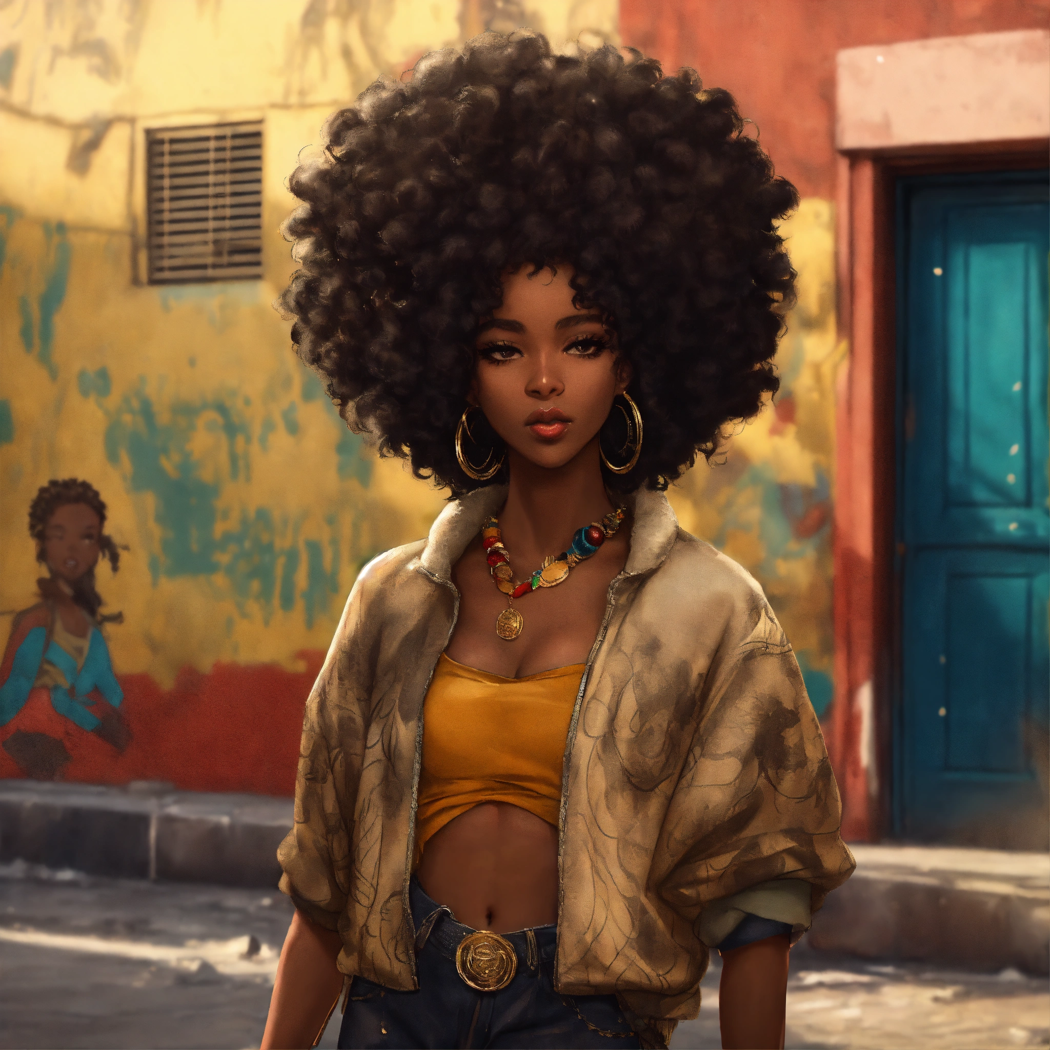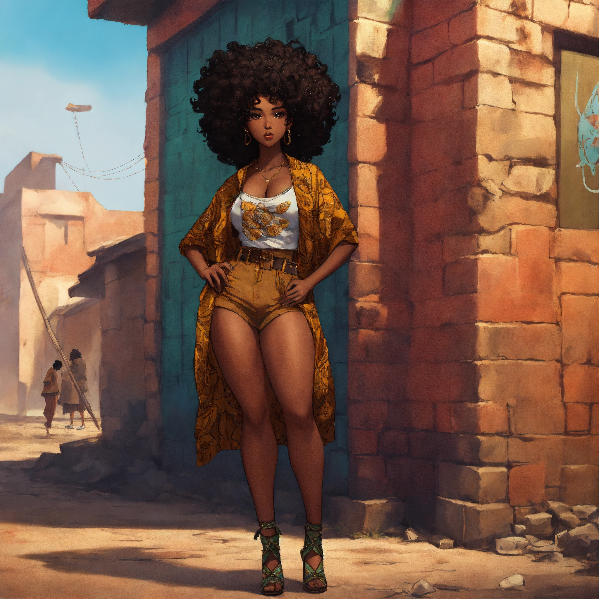 Full body black woman with full lips and a wide nose and full dark curly textured hair dressed in feathers drawn in the style of tite kubo, african features, soi fun, animation, standing in the ghetto in front of a wall