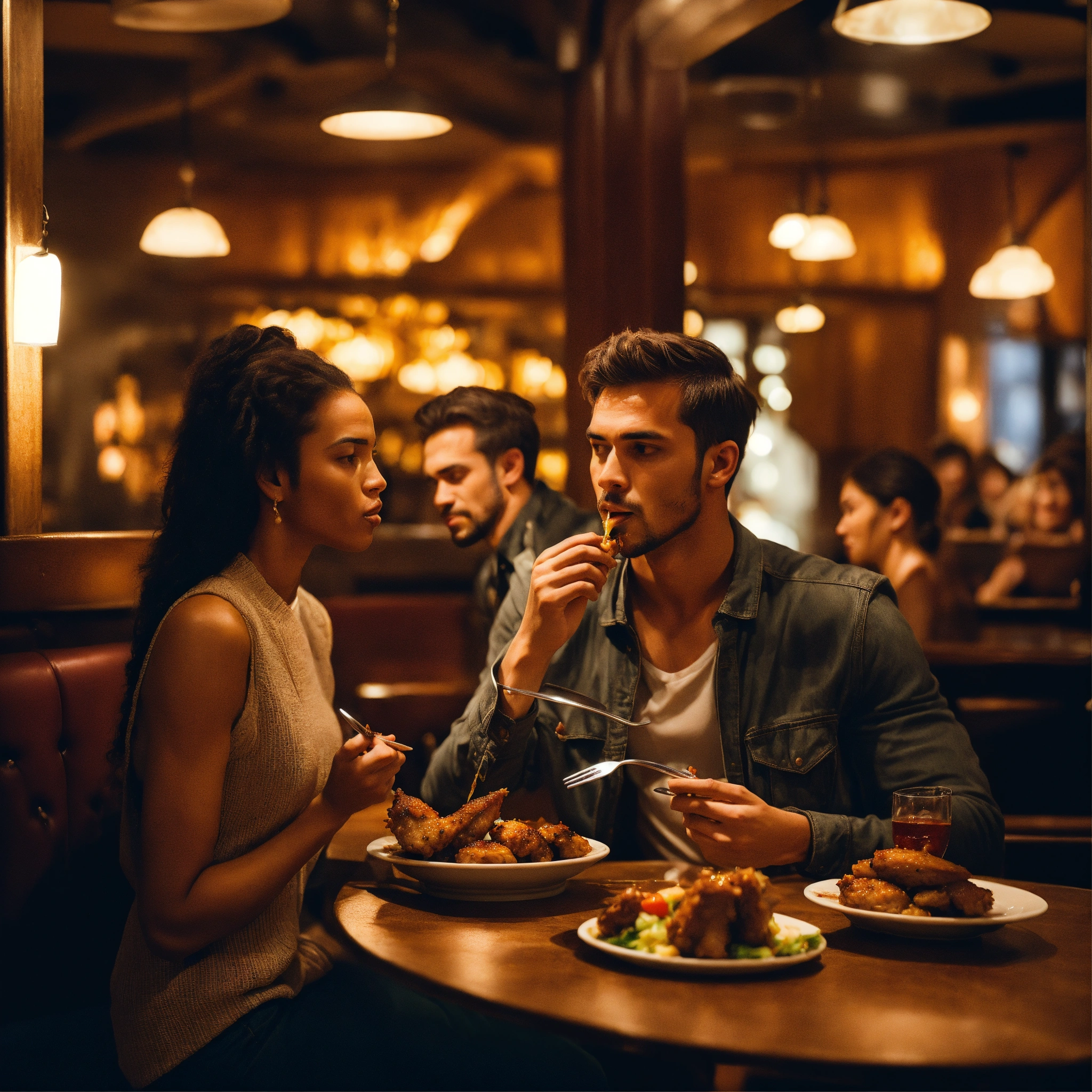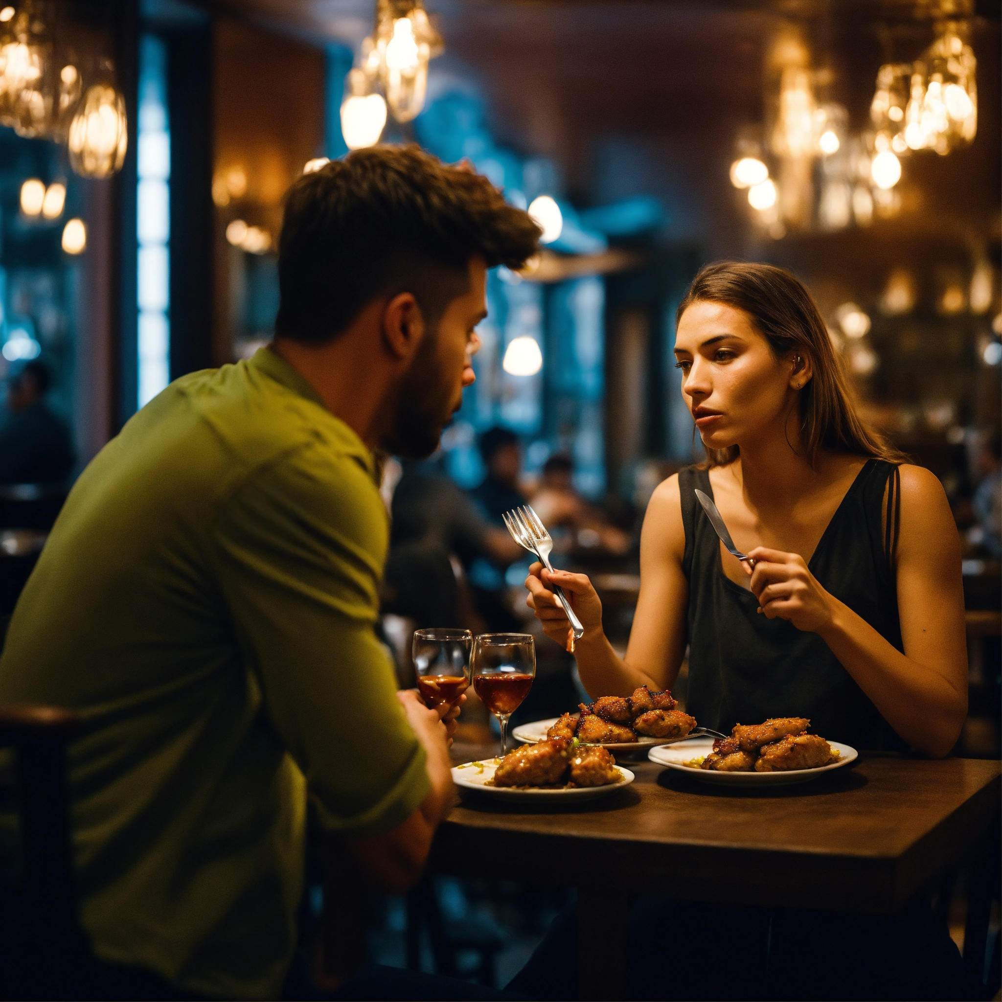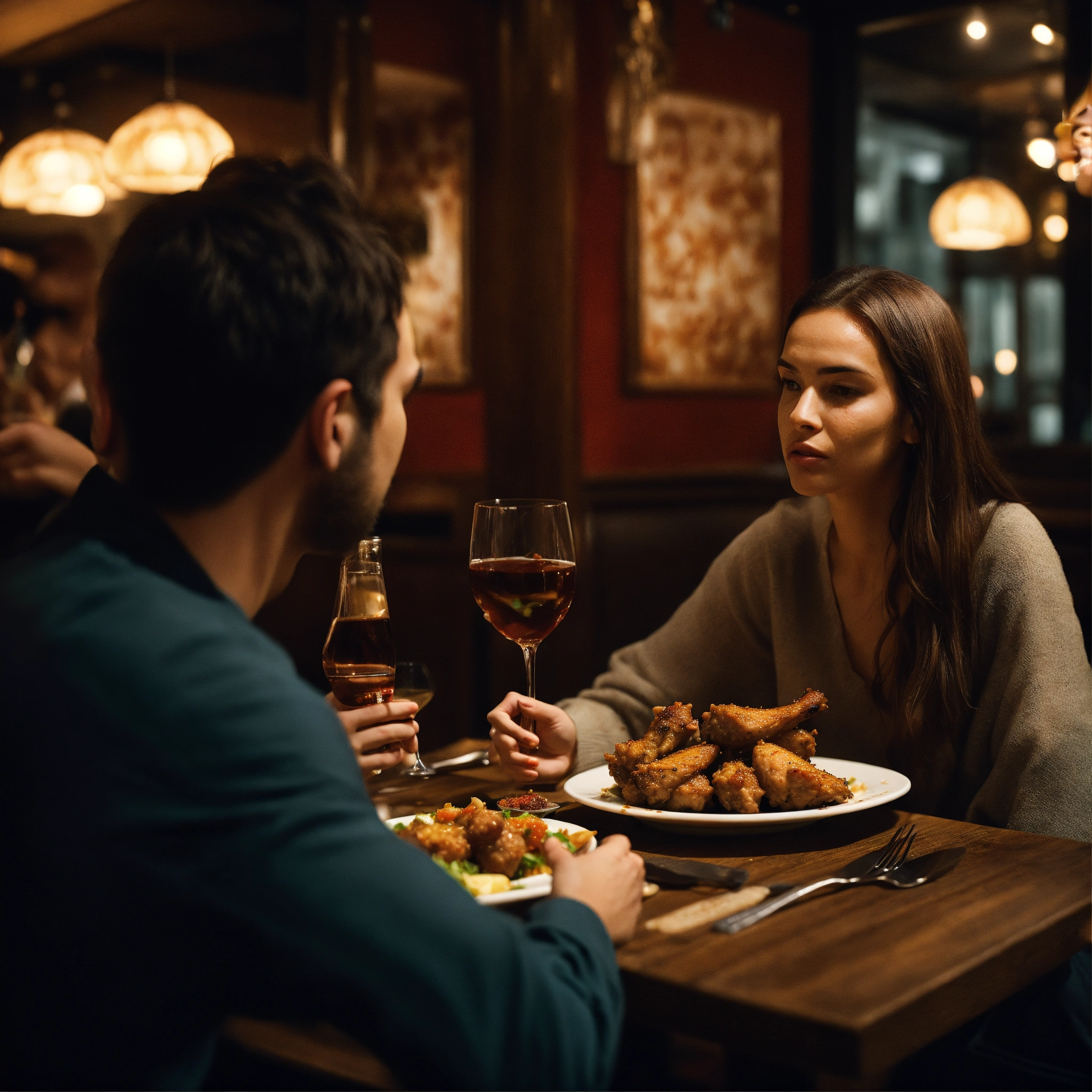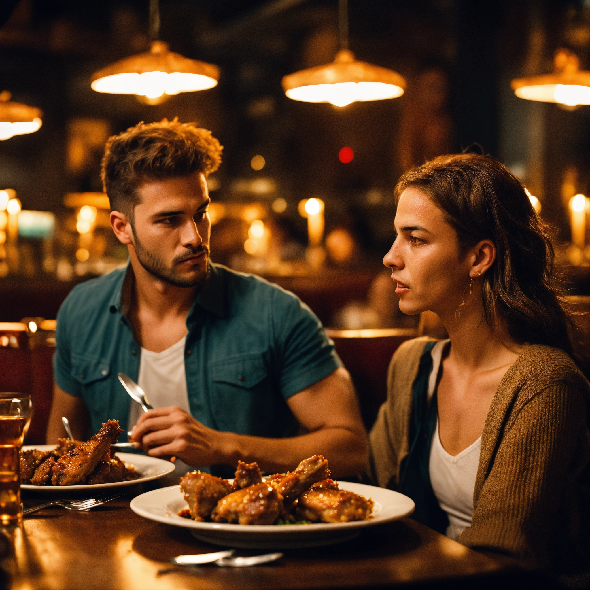A young man and woman eating chicken wings in a romantic restaurant, the man is visible only from his back, camera is looking over the shoulder of the man, and the atmosphere is modern, the woman is watching the man with a face of disgust, woman looking at man with a face of disgust, man is holding cutlery