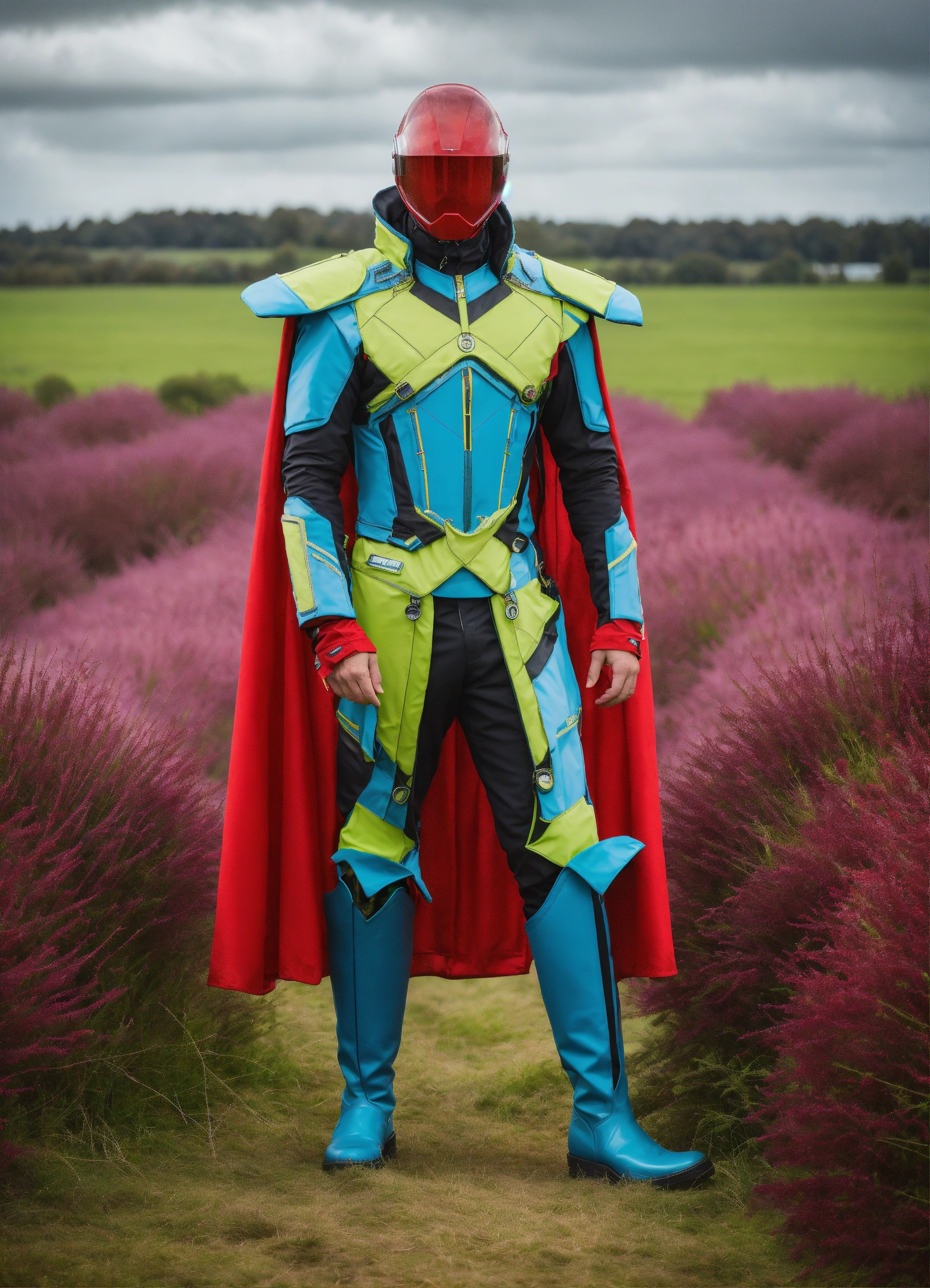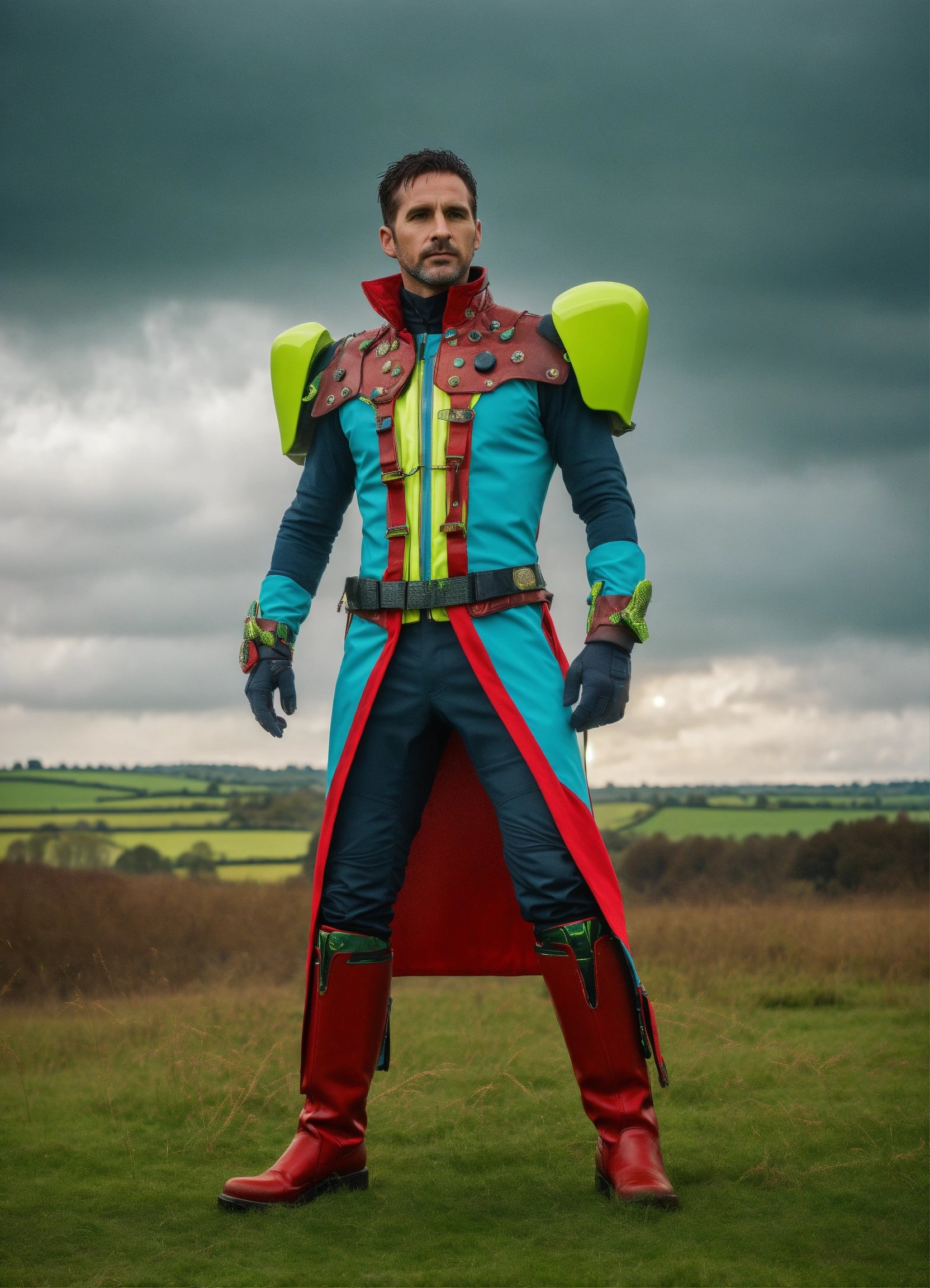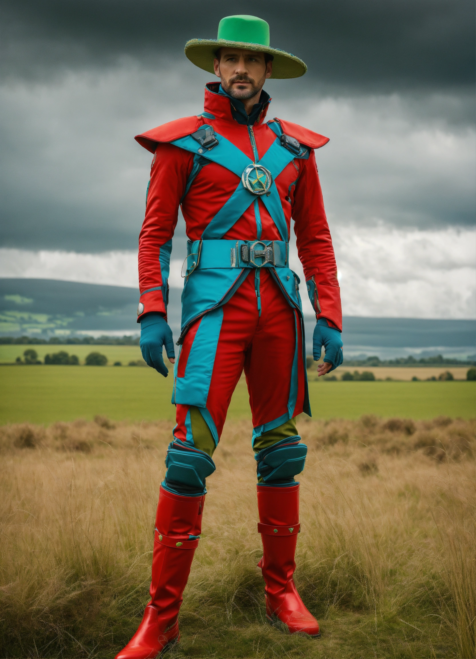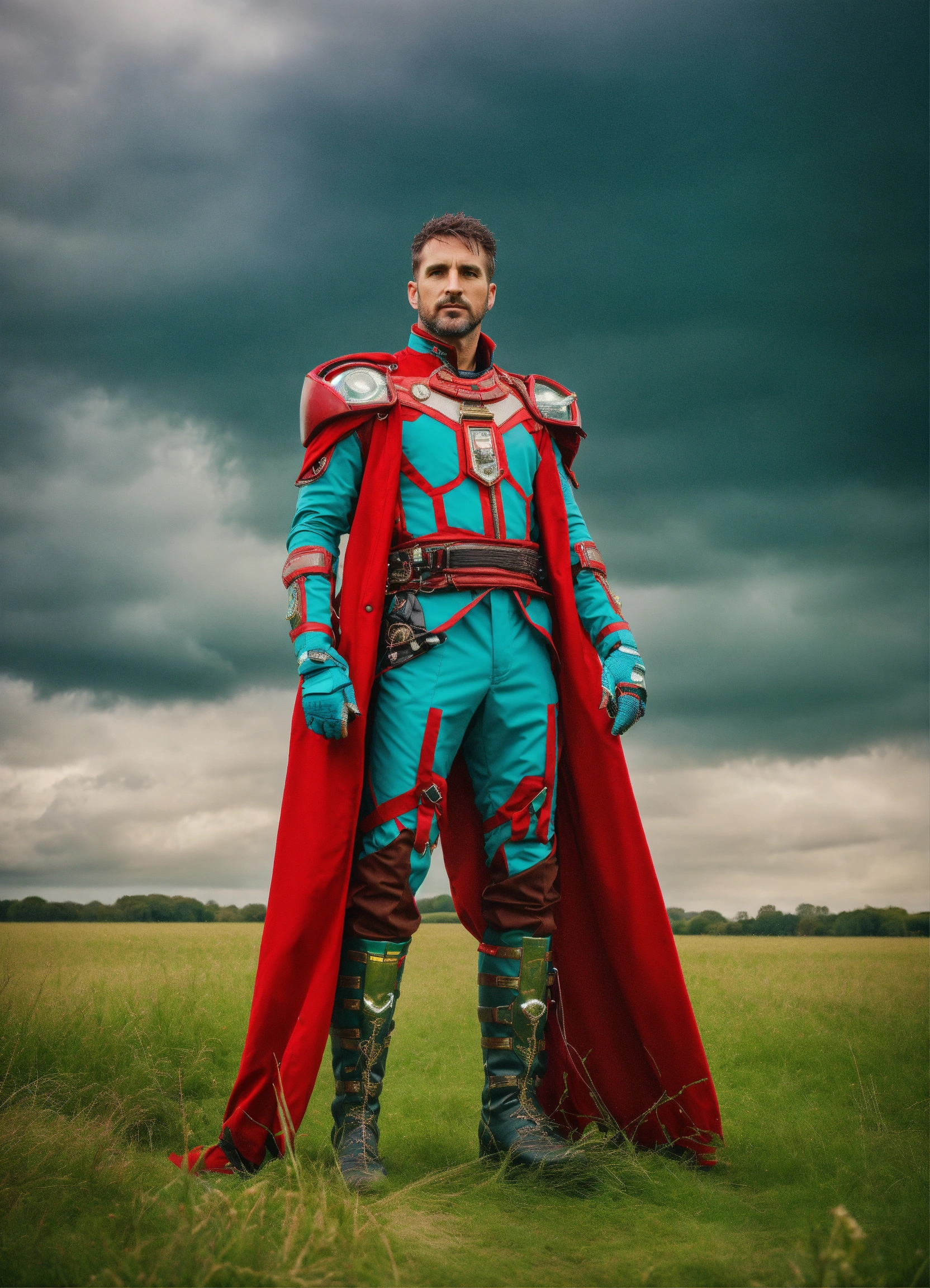 Highly detailed full body of a sci fi aristocrat, royalty, red and light blue and volt green futuristic outfit and boots, standing in a field on a cloudy day in england, male, handsome, 35 years old, highly detailed