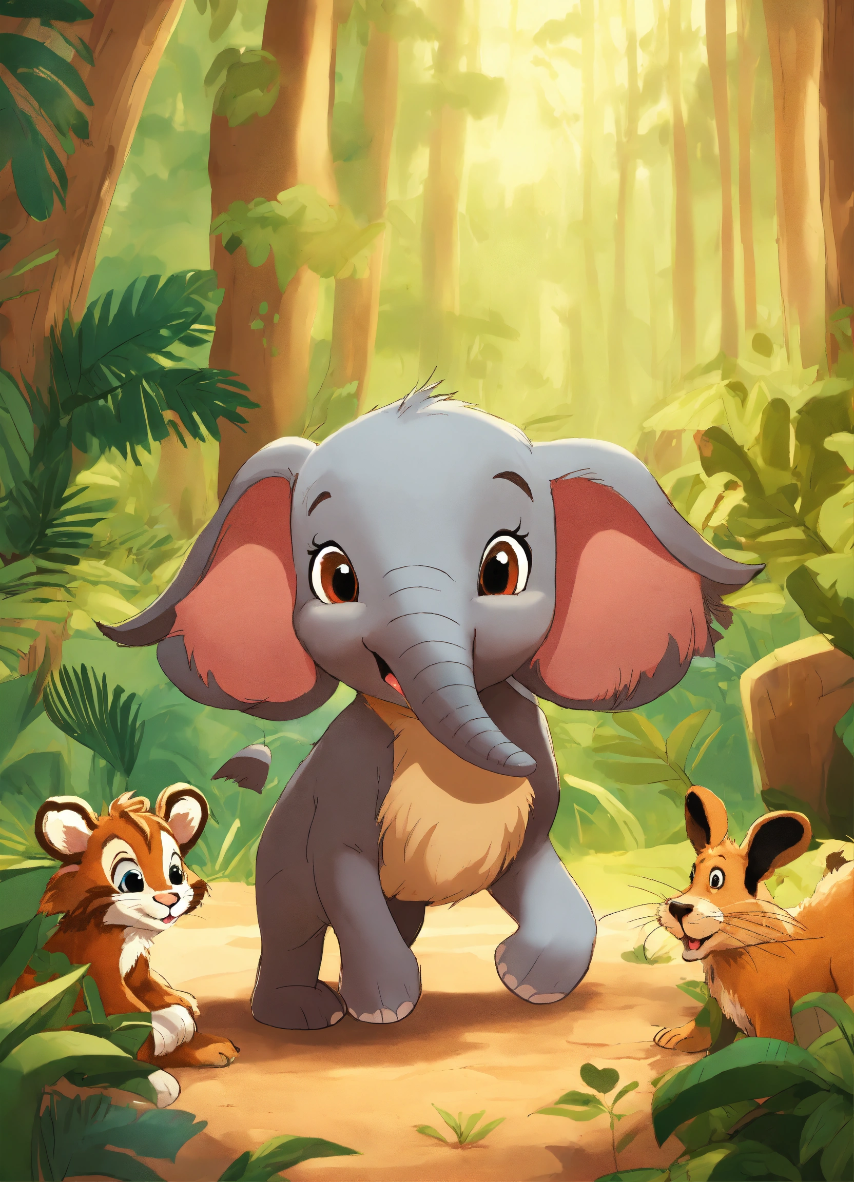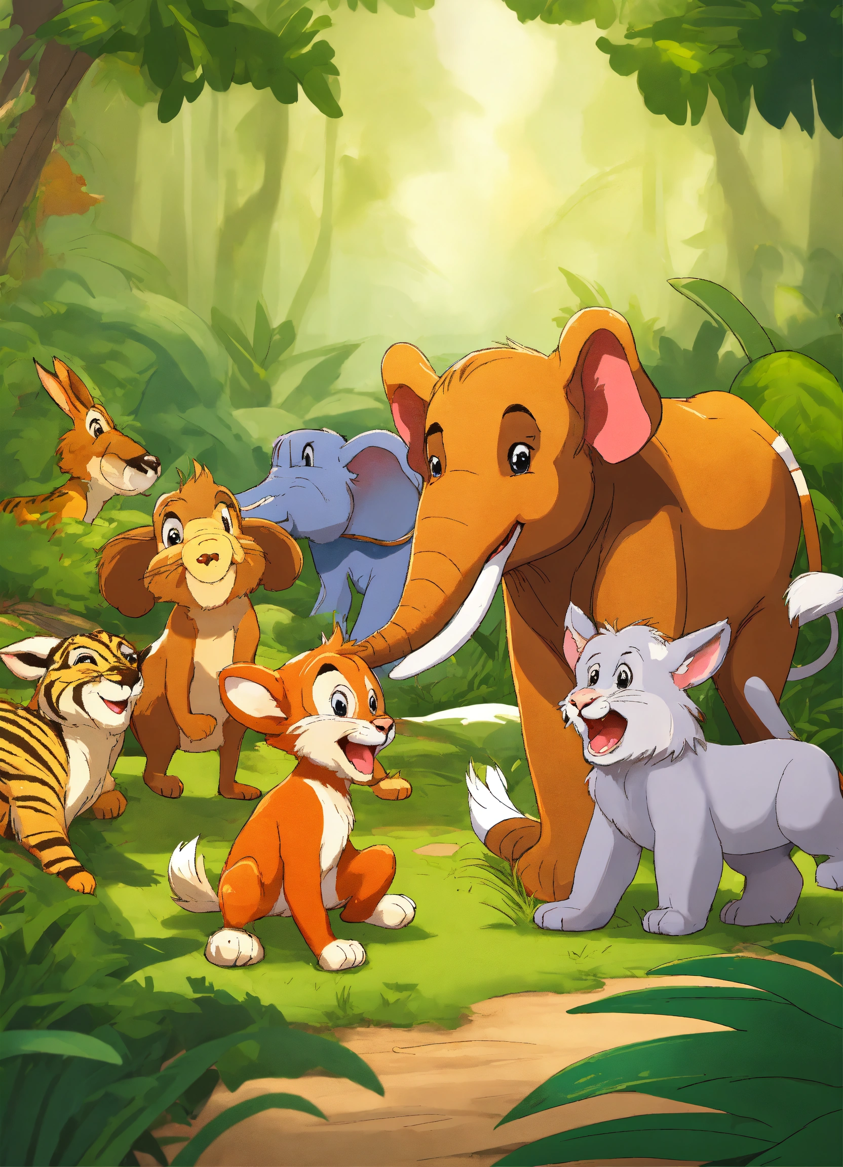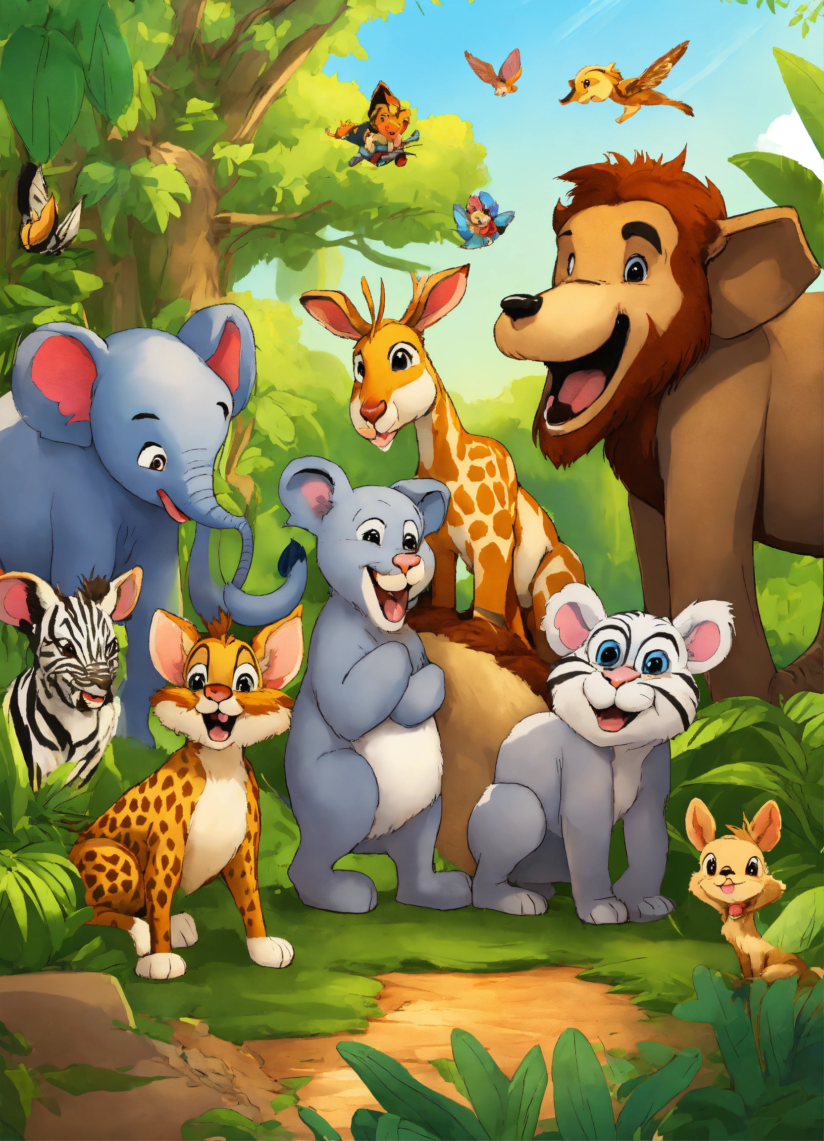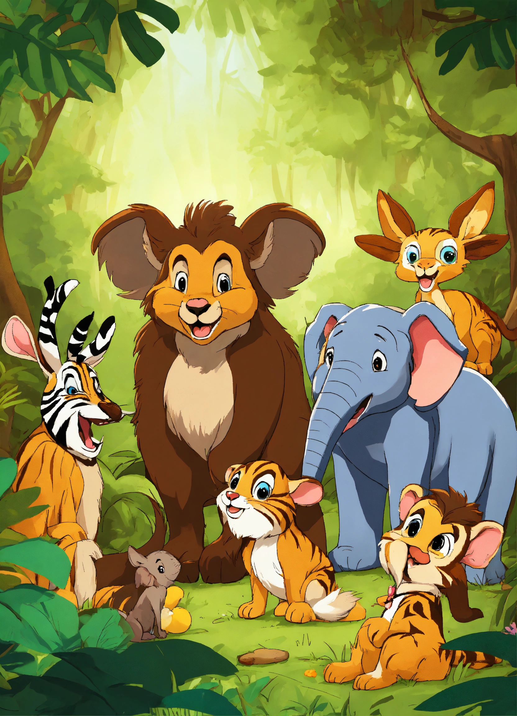 Cartoon rabbit is very happily talking to other jungle animals elephant wolf deer lion monkeys zebra bear for being faster