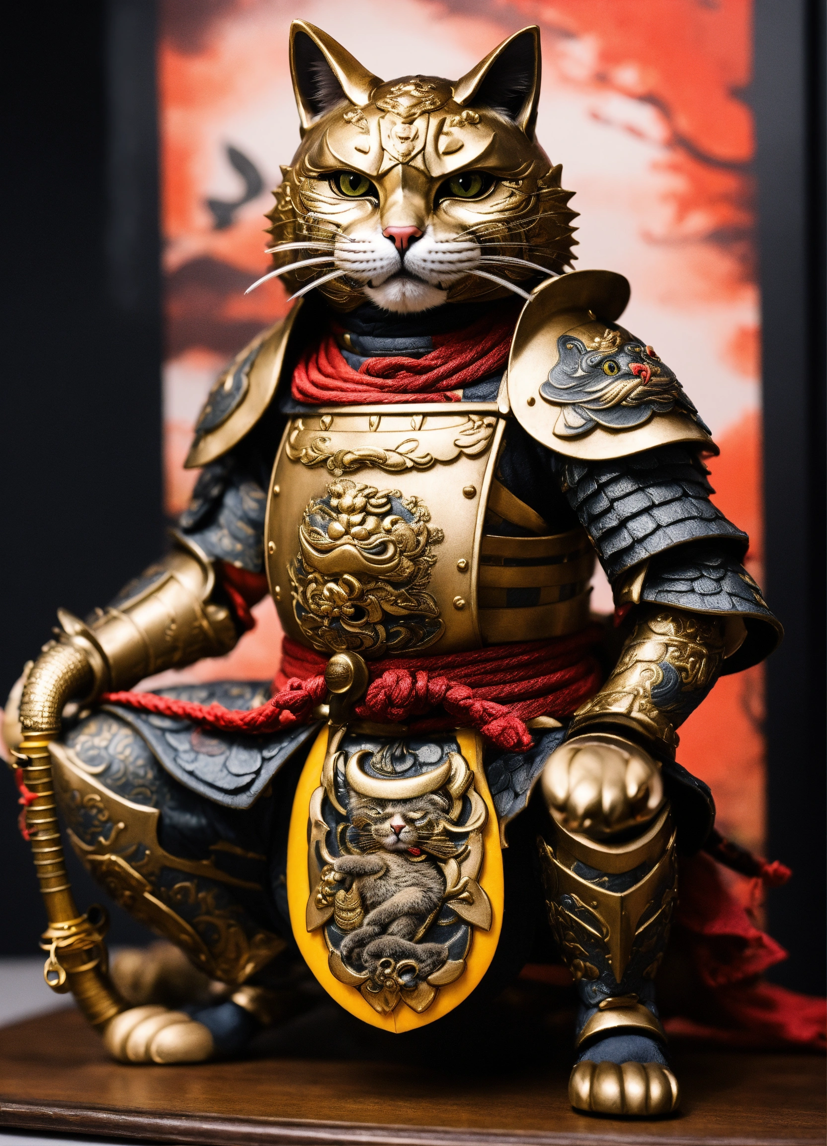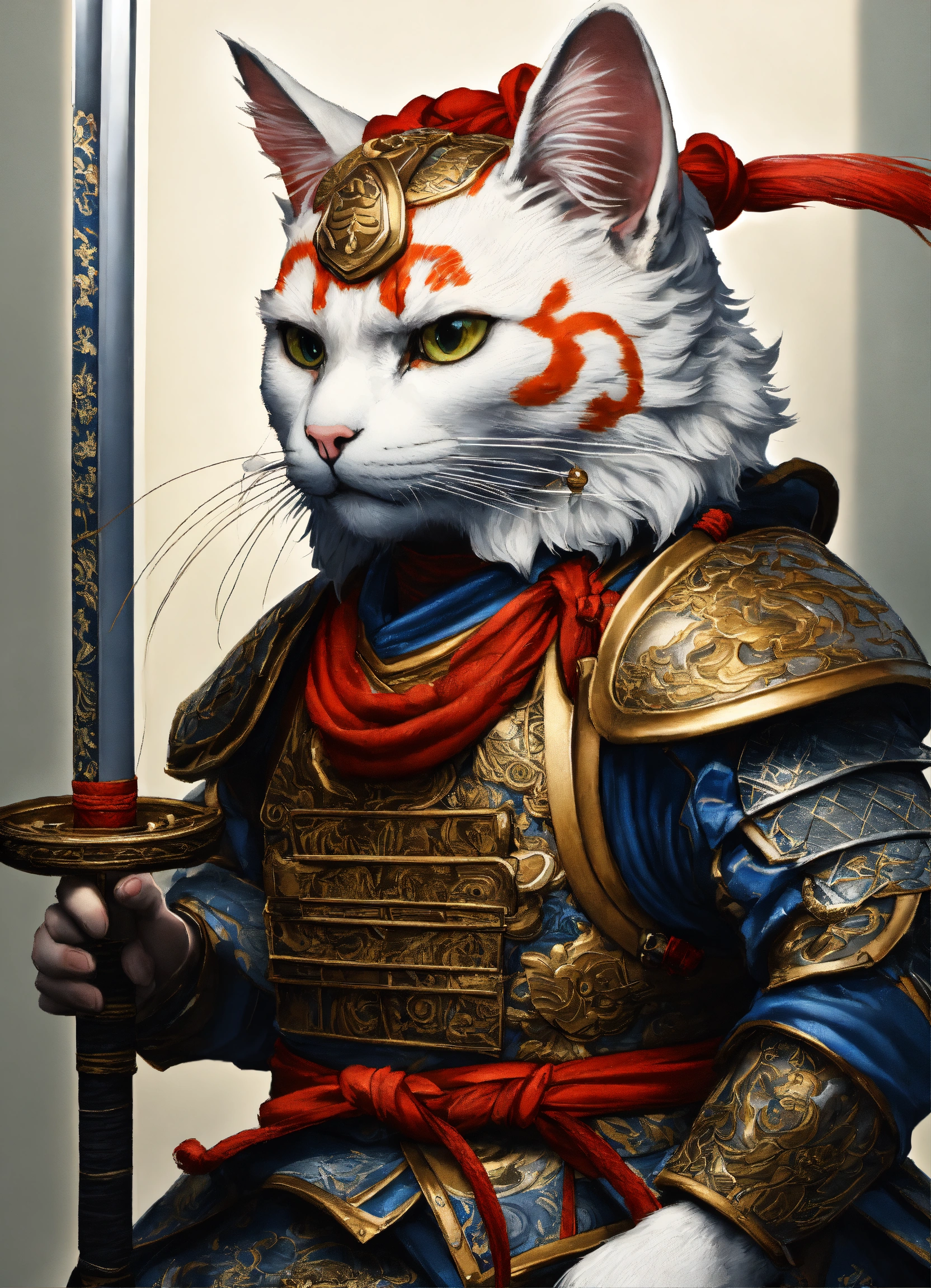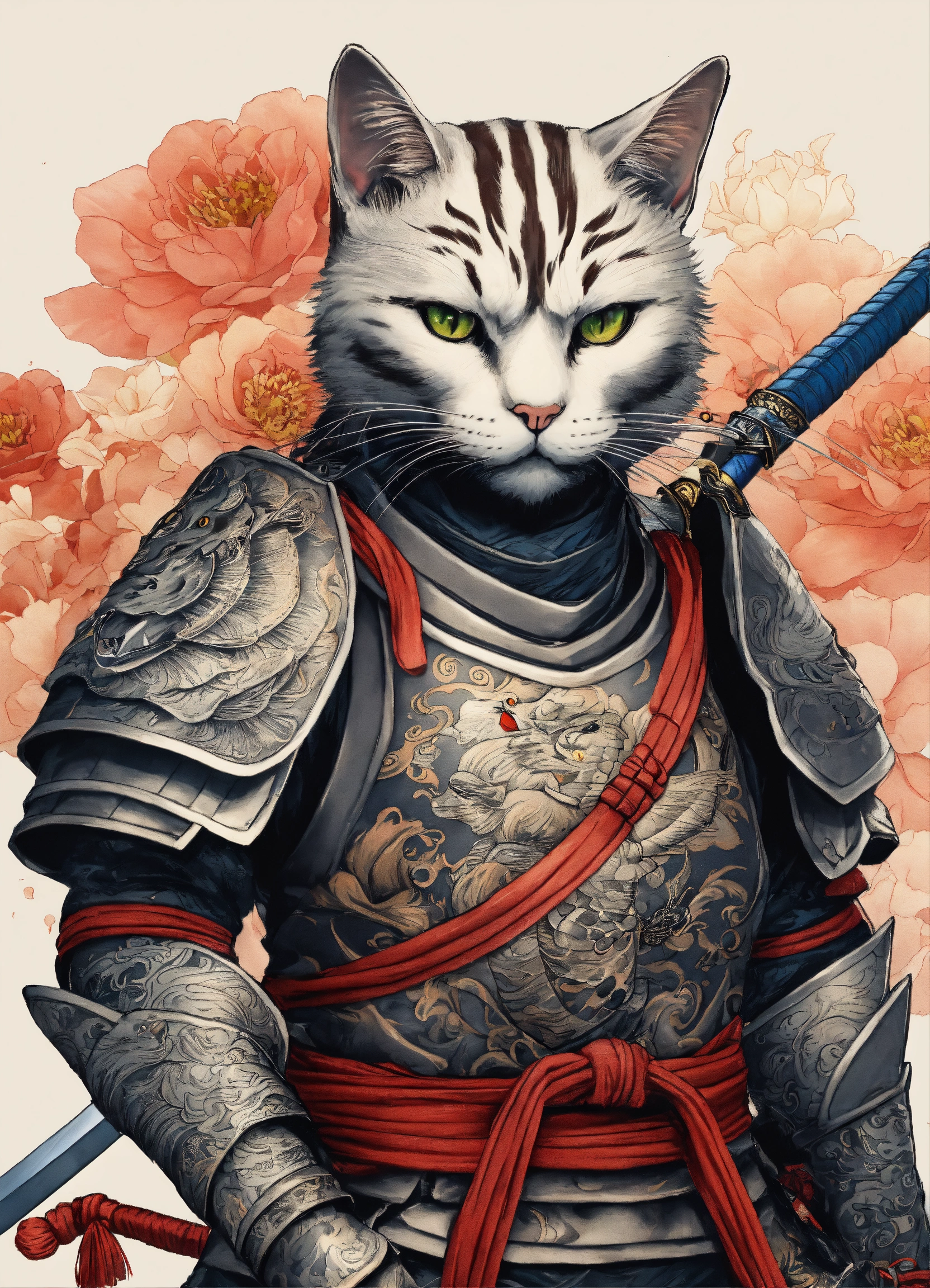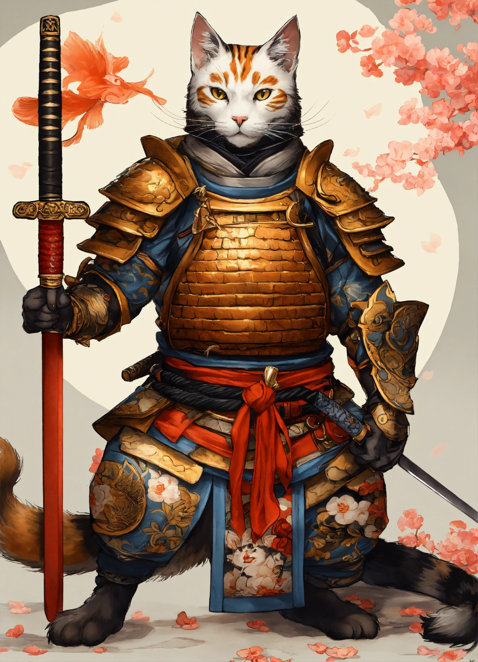 There is a cat with a big fish and a sword on a white background, samurai cat, cat warrior, armored cat, anthropomorphic cat ninja, samurai deity with koi armor, by kanō tan'yū, highly detailed, model tattoo