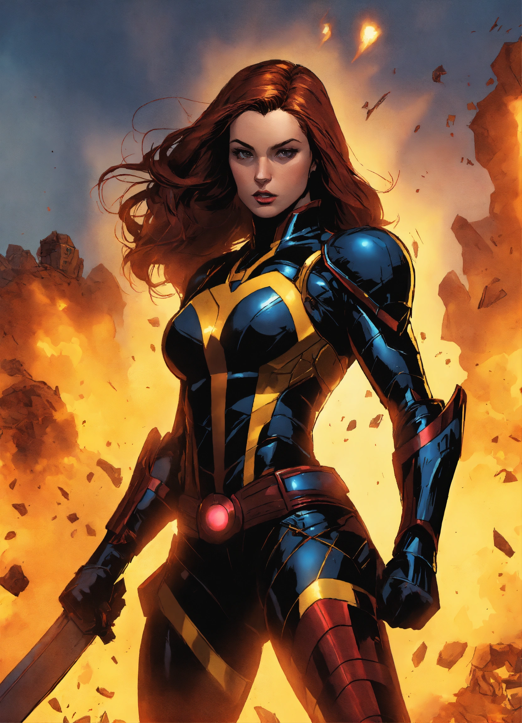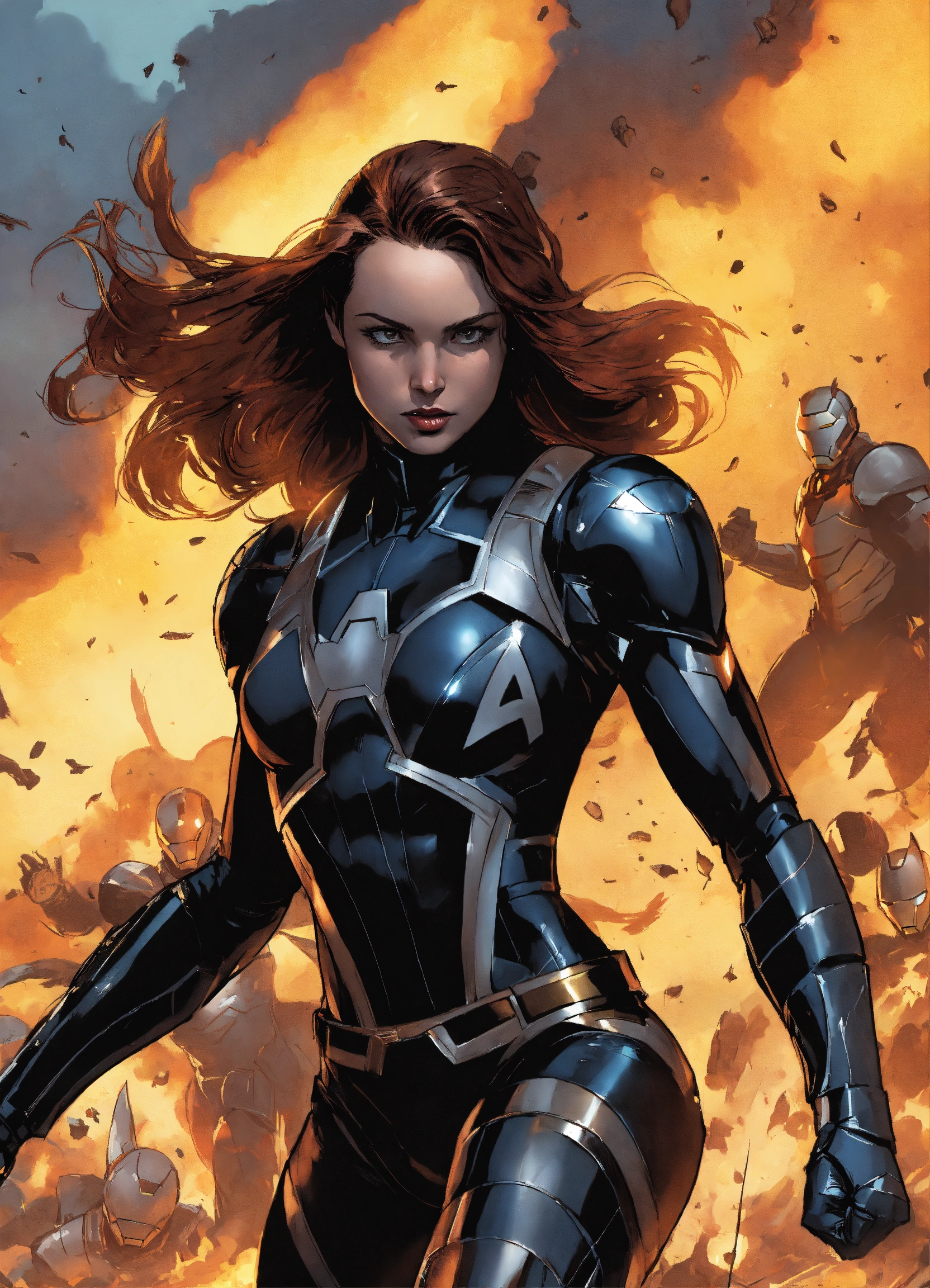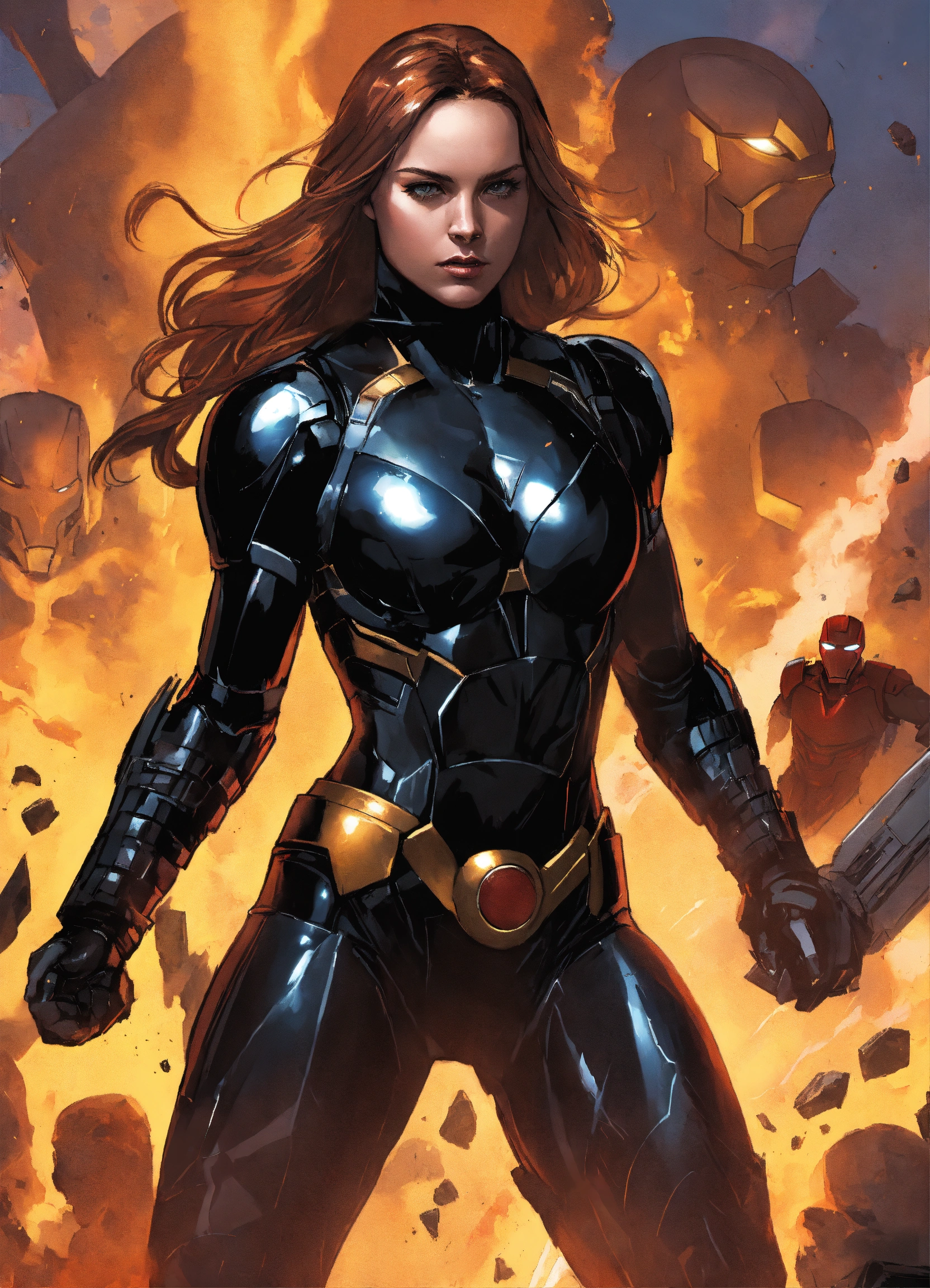 Female x-men shadowcat wearing black metal iron man armor waging war on the enemy