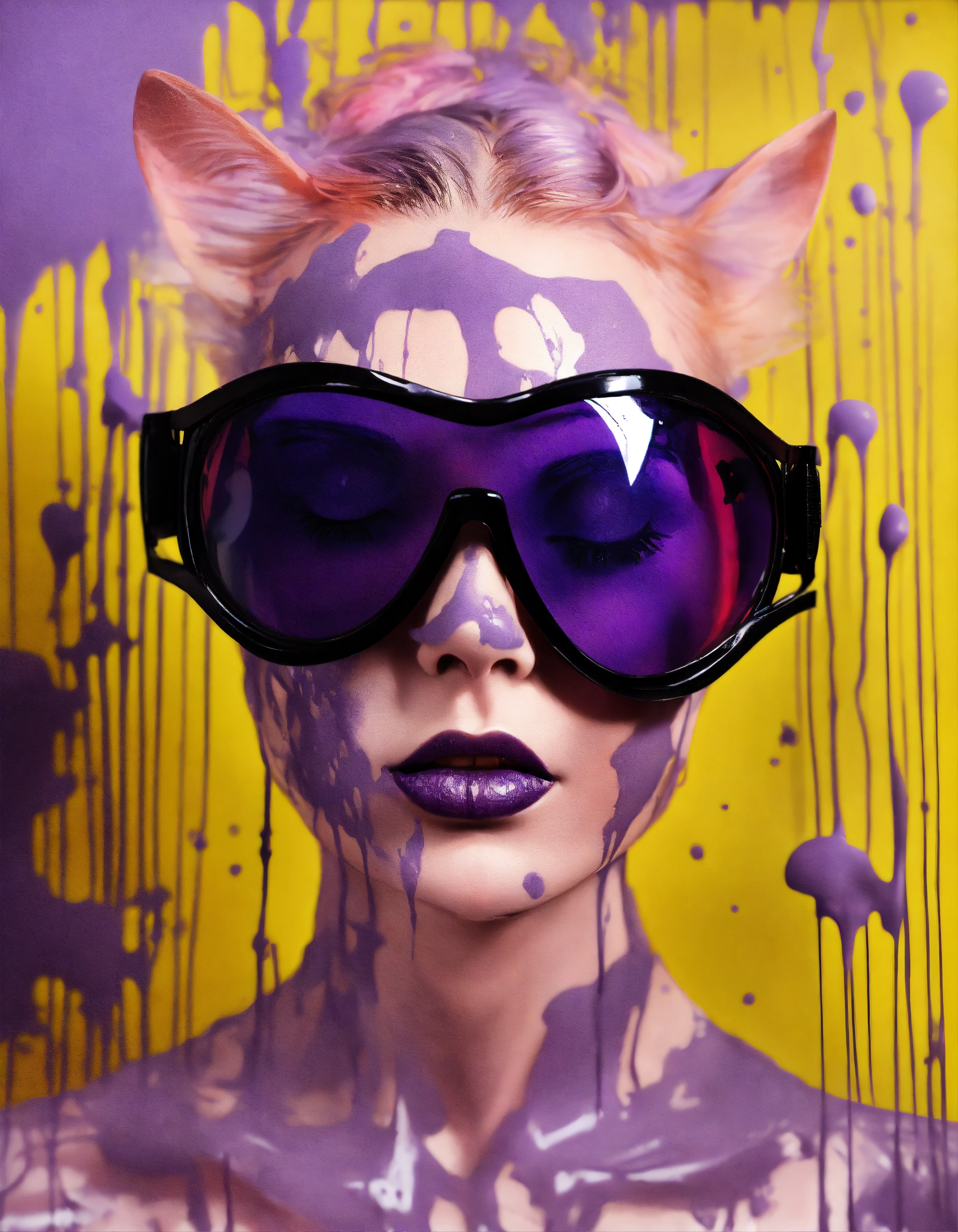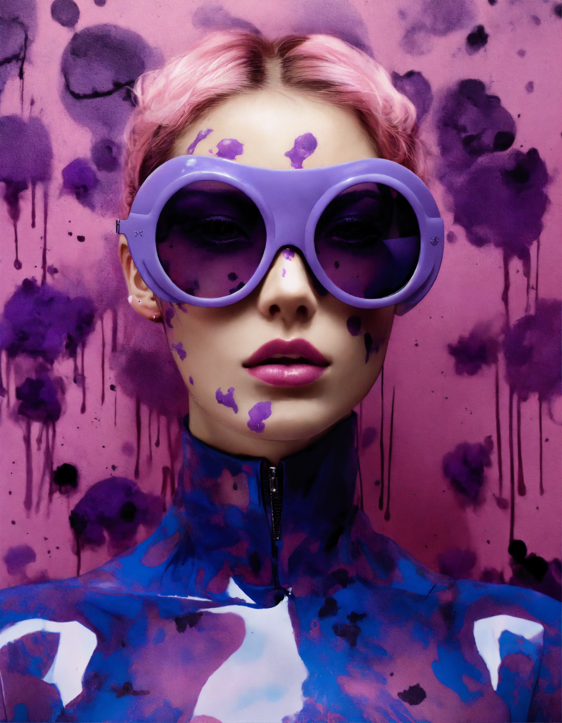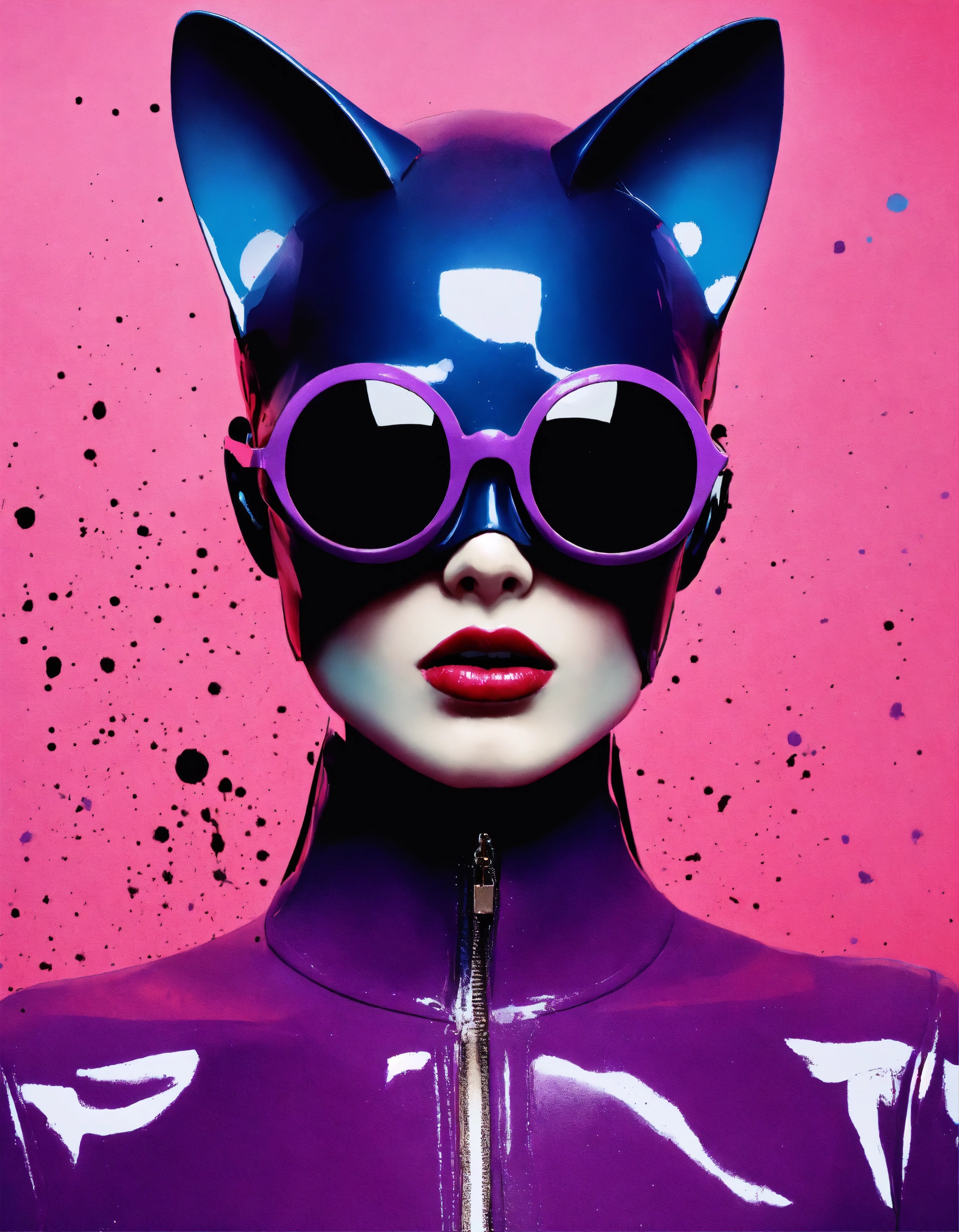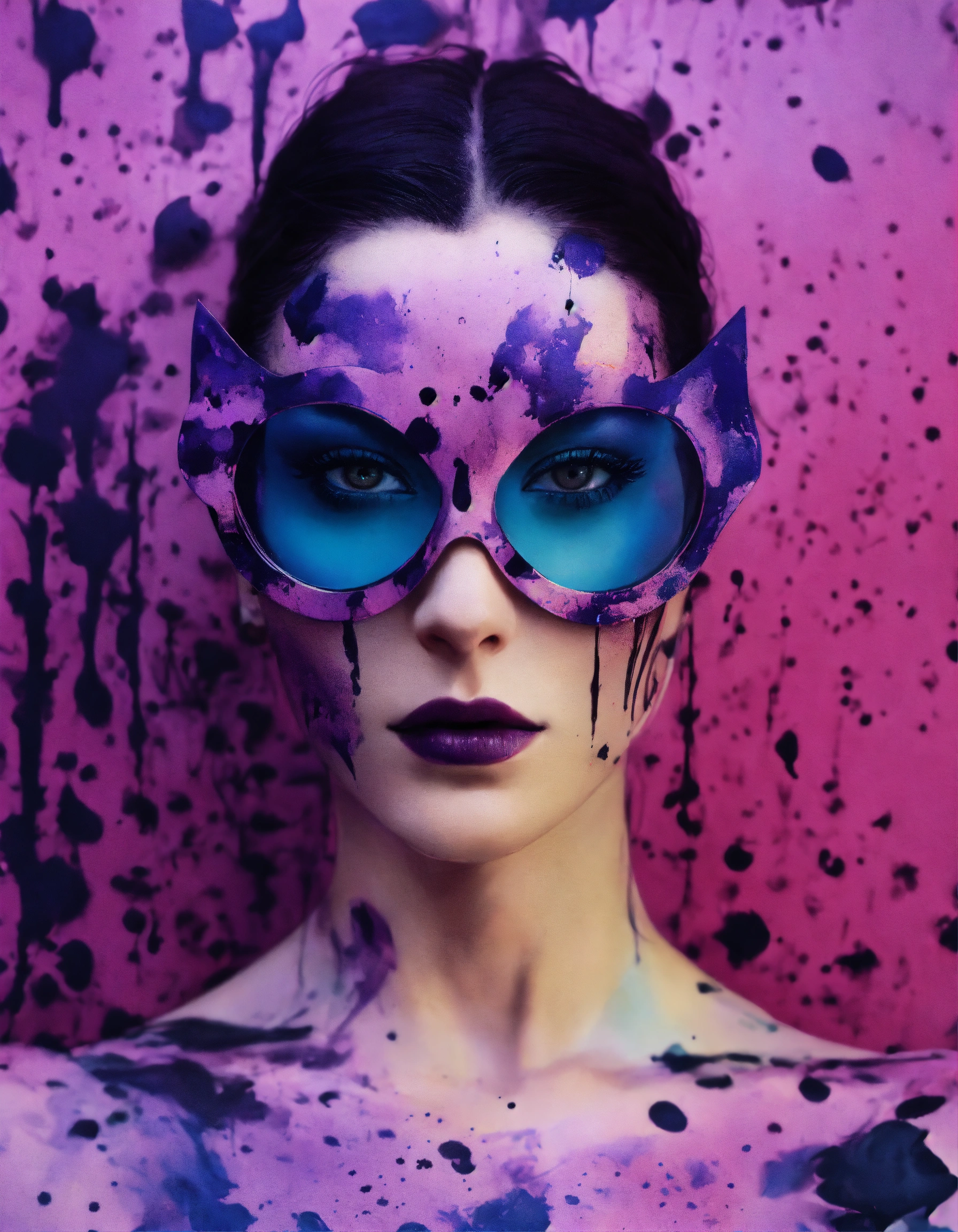 Violet army and pastel color front portrait photography, a woman's face in an euro american cat woman mask with sunglasses, emerges from black ink splatters, an attractive plexiglass body, 80 degree view, art by sergio lopez, natalie shau, james jean and salvador dali
