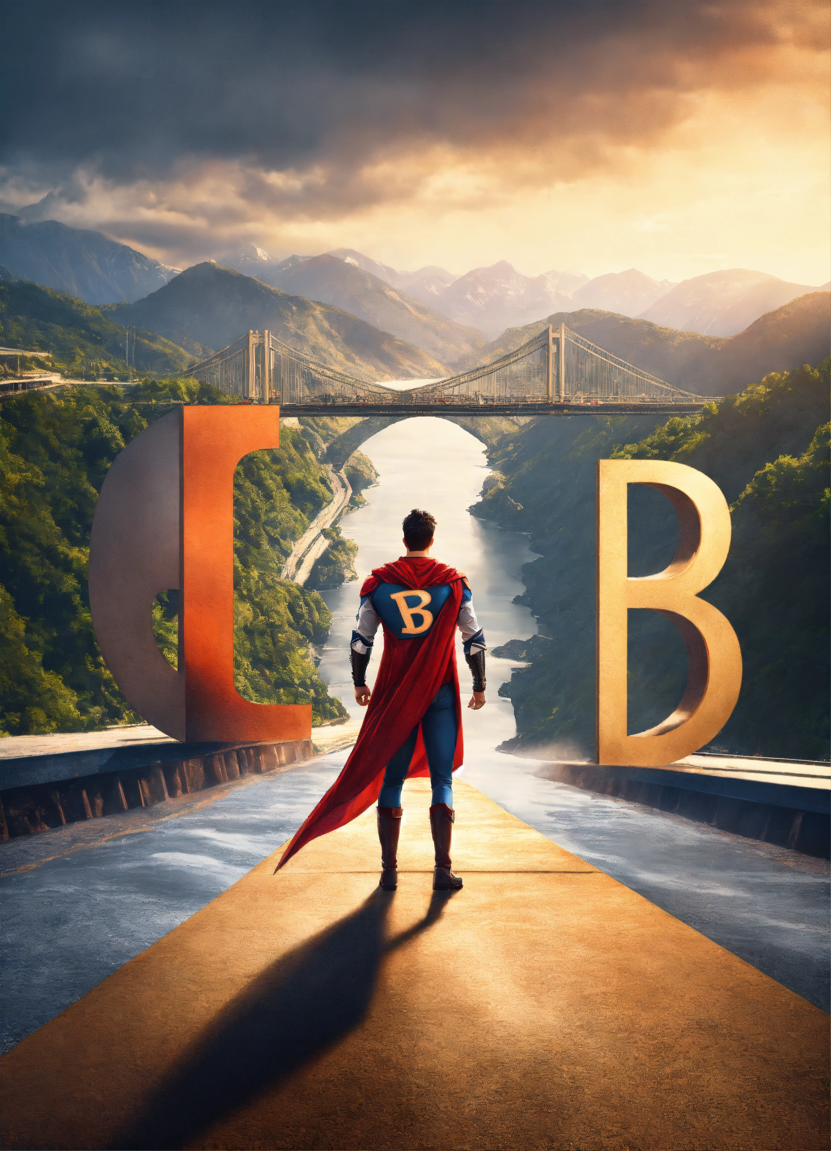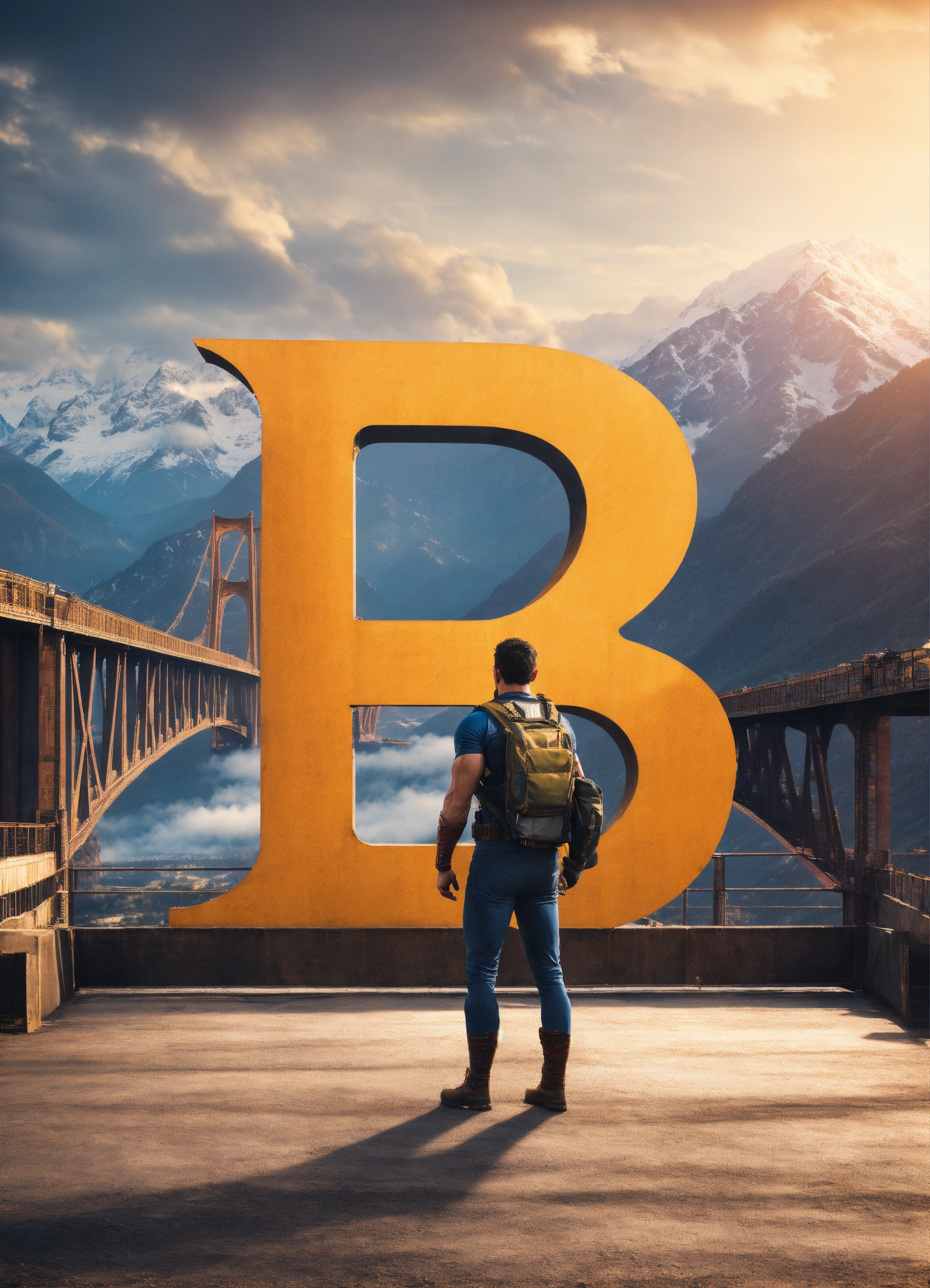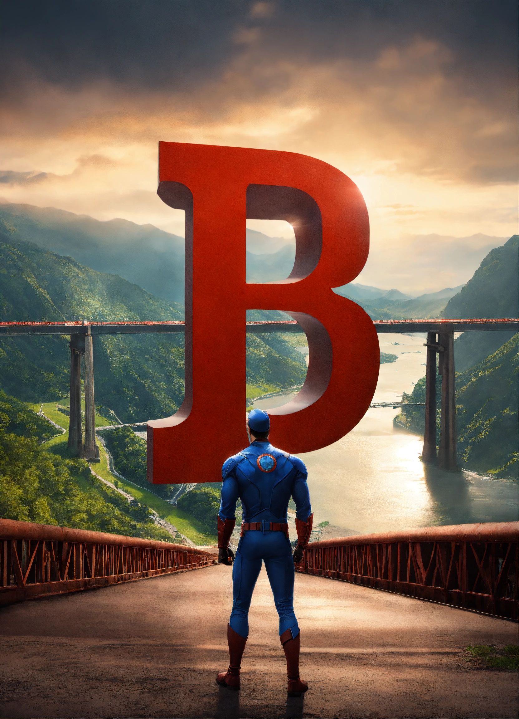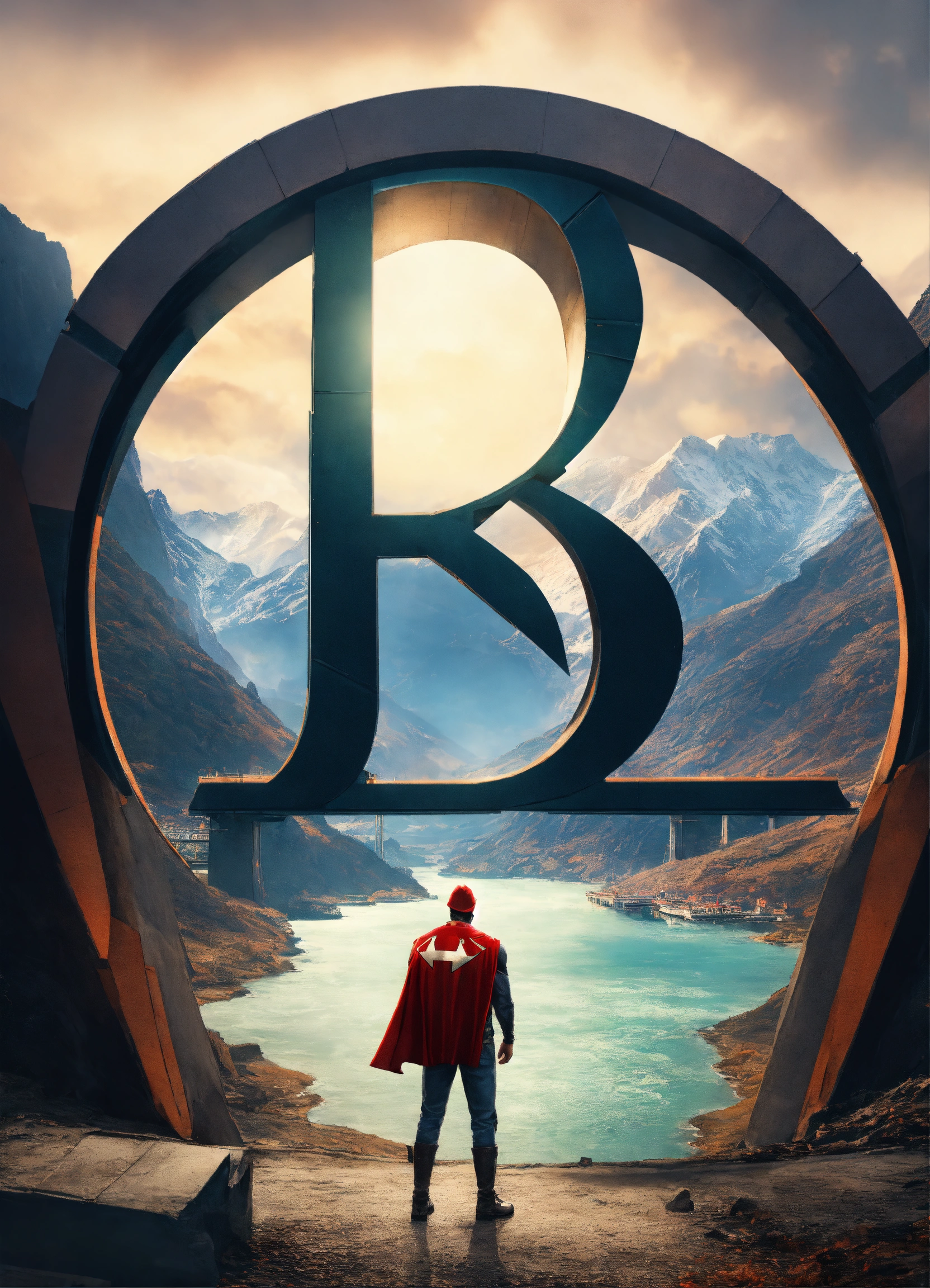 Engineer with big letter b, background huge bridges, mountains, epic composition, superhero vibes, photograph, realistic, 8k