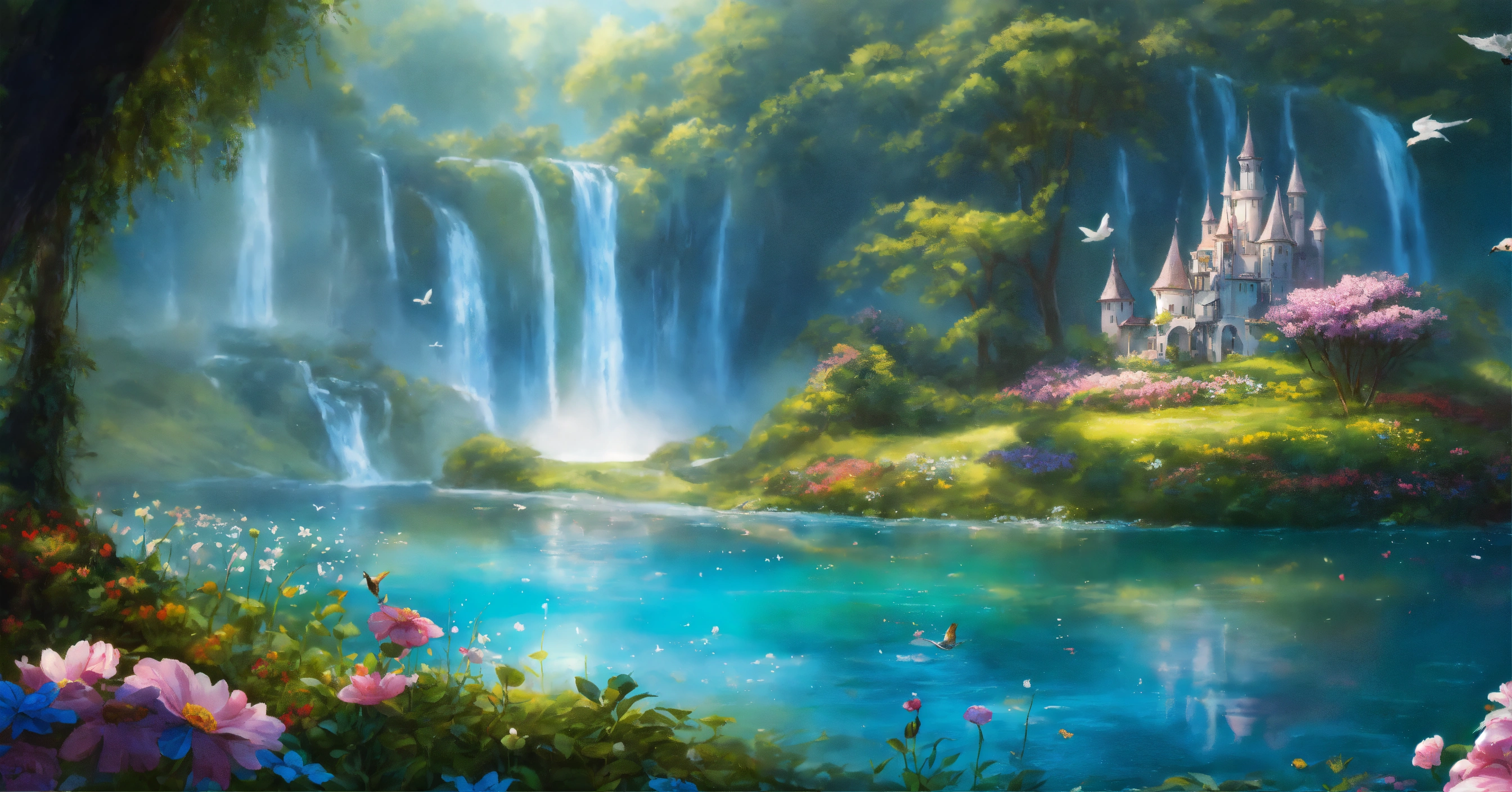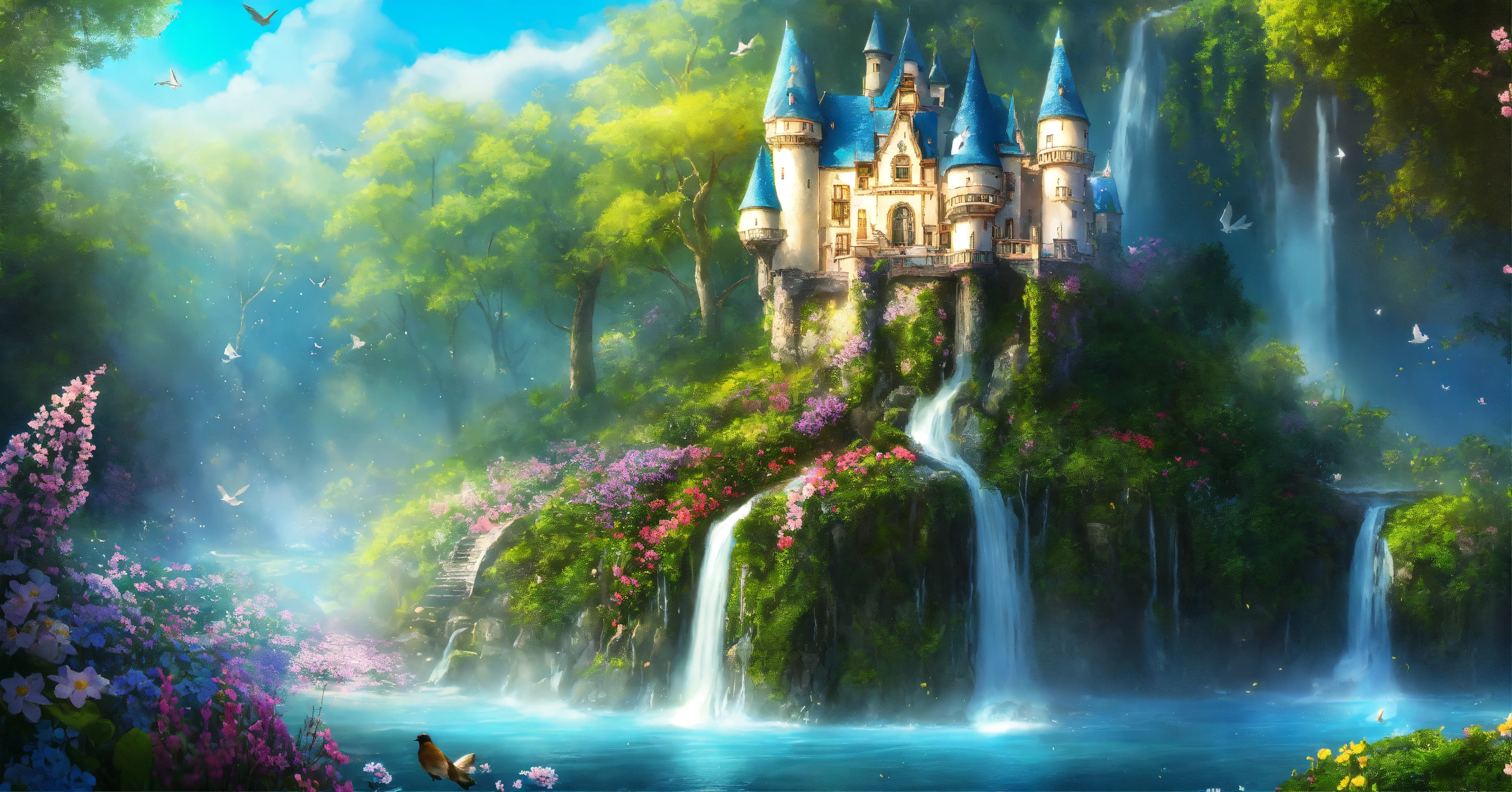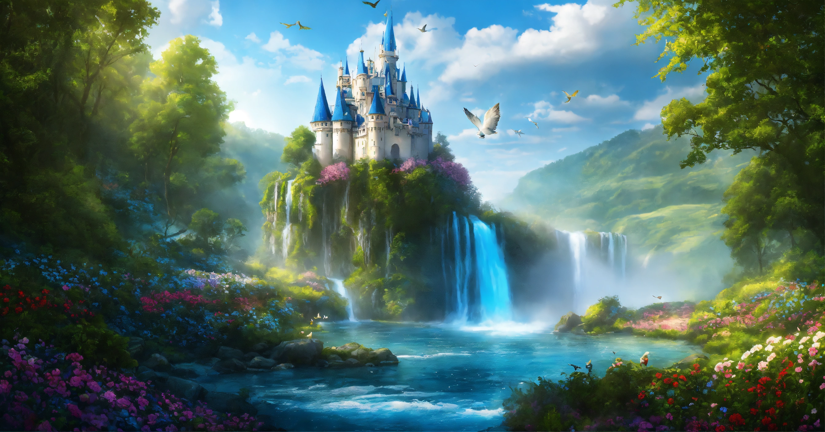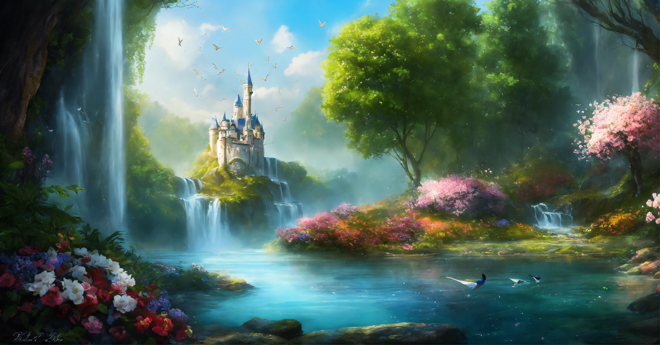 Magical and very light atmosphere forest and country, very réalist, emerging from the water with a light, floral, hd, blu sky+white and blues big flowers - fairy castel - flowery waterfalls - whitw birds