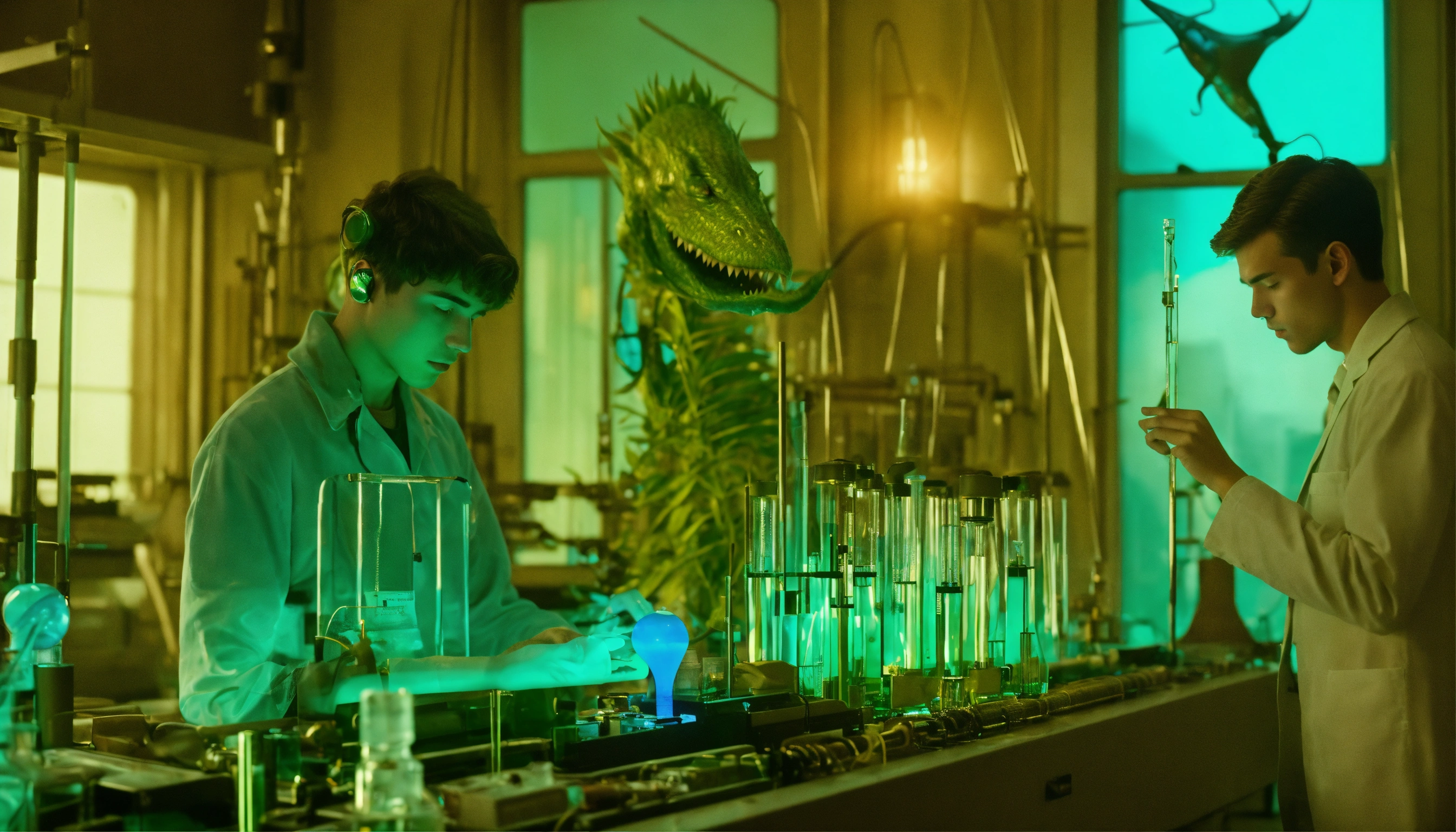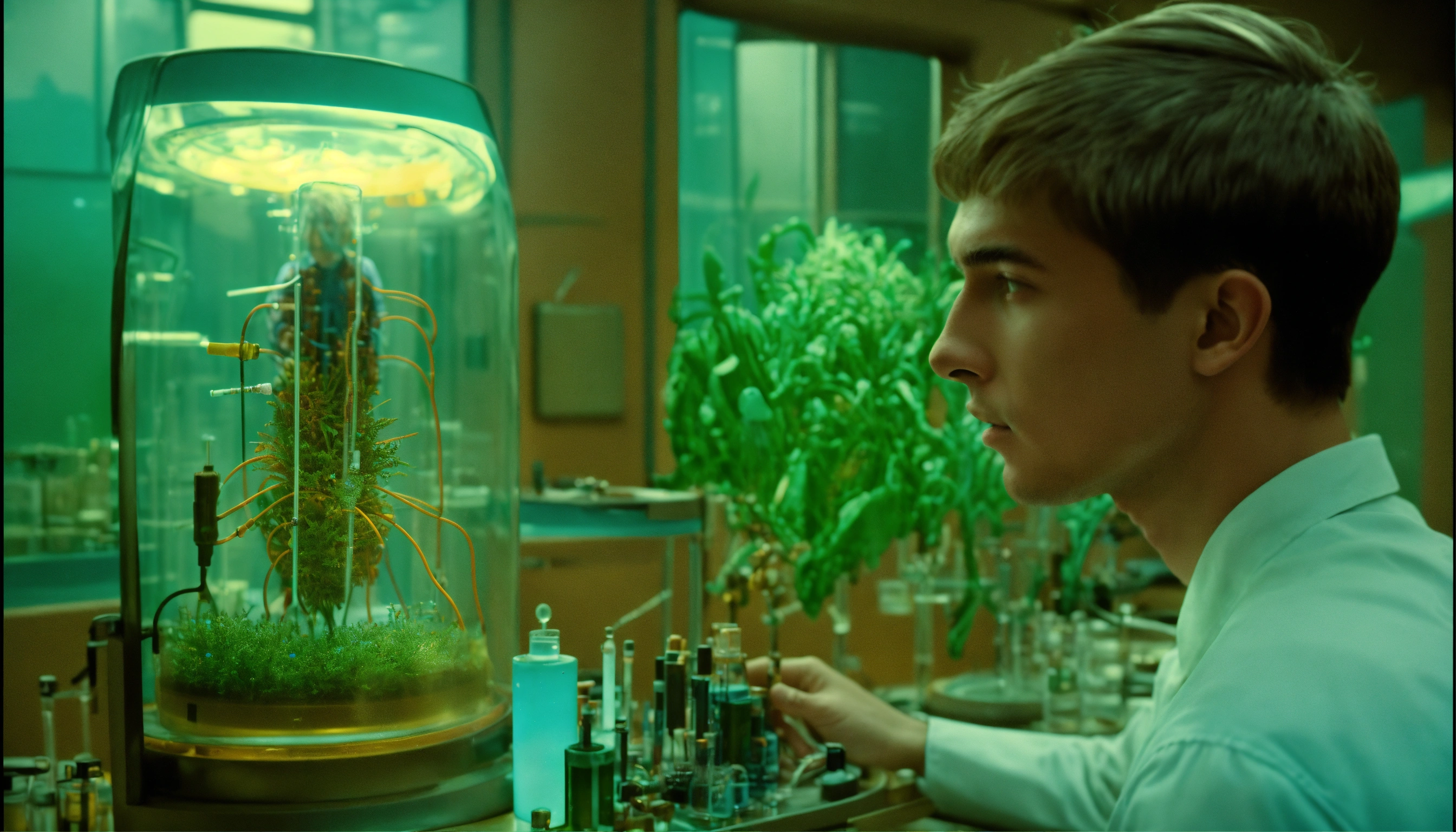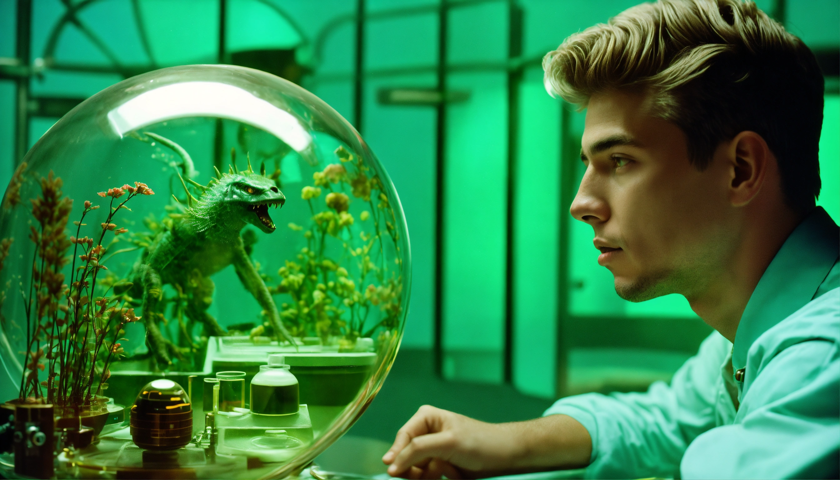 1964, old photography, kodak film colour, surreal sci fi, old film, unknown handsome 18 years old futuristic researcher boy with a big unknown beast monster, futuristic glass lab with myriad of research instruments, a myriad of futuristic test tubes, pale blue emerald green, regenerative plants and ai