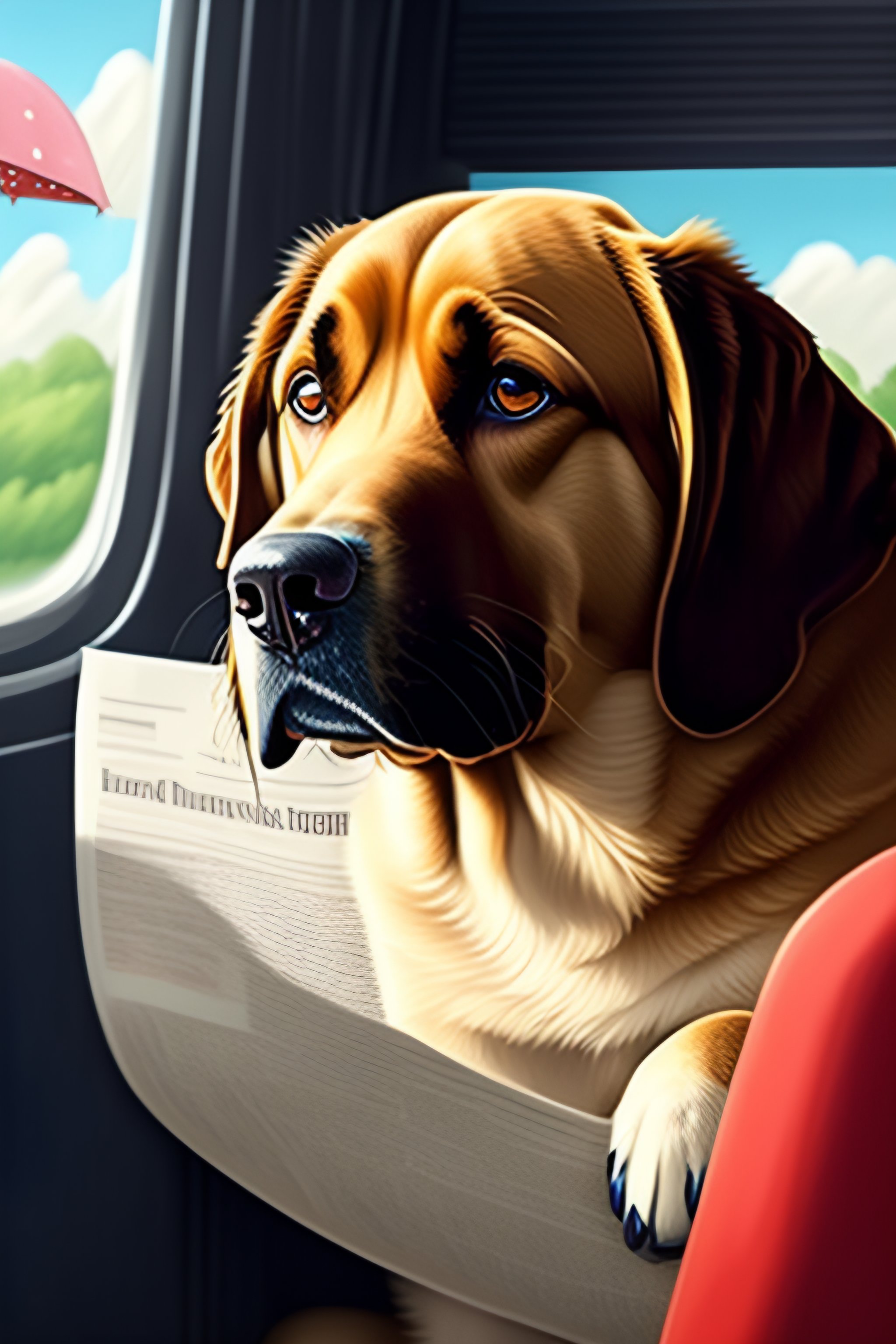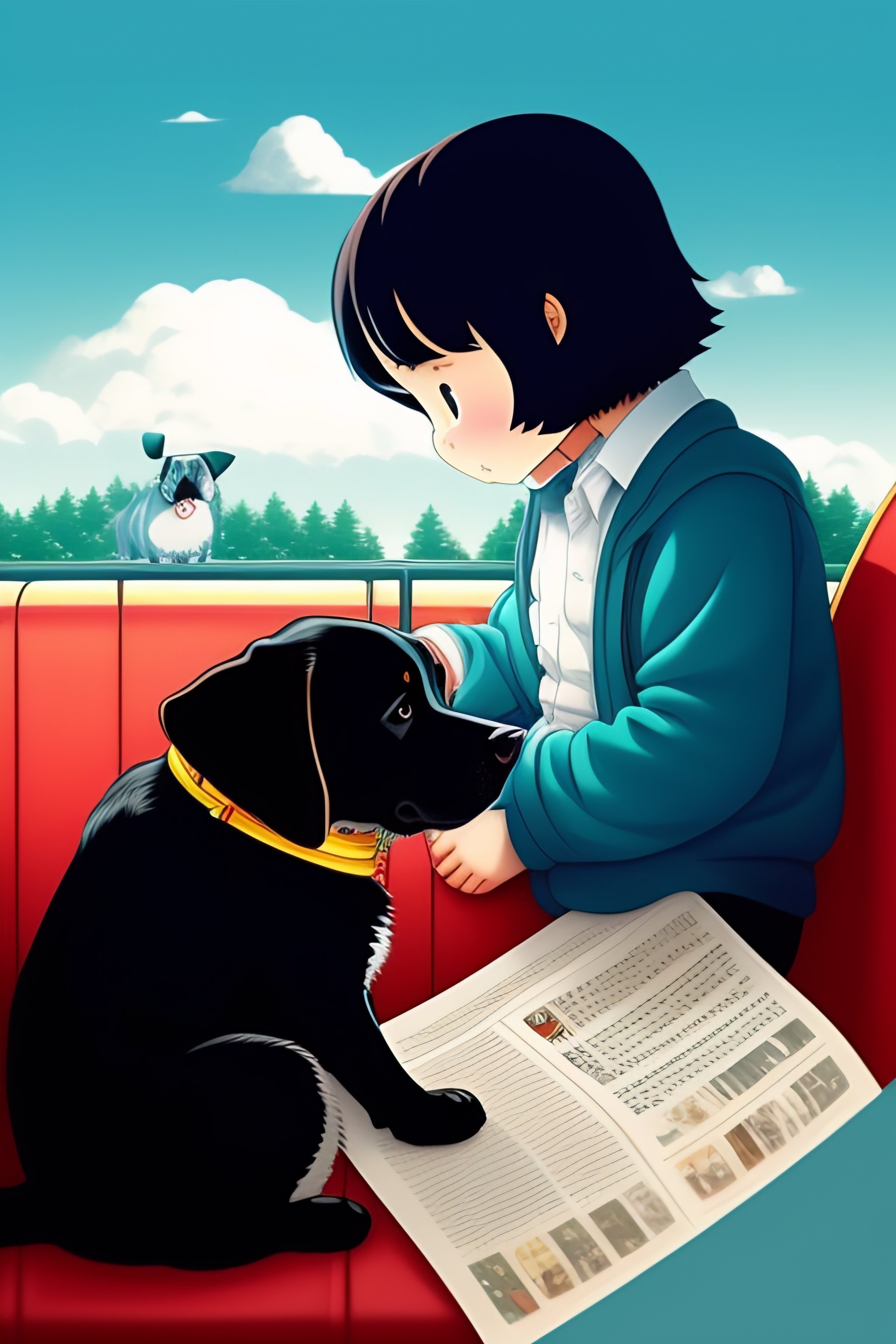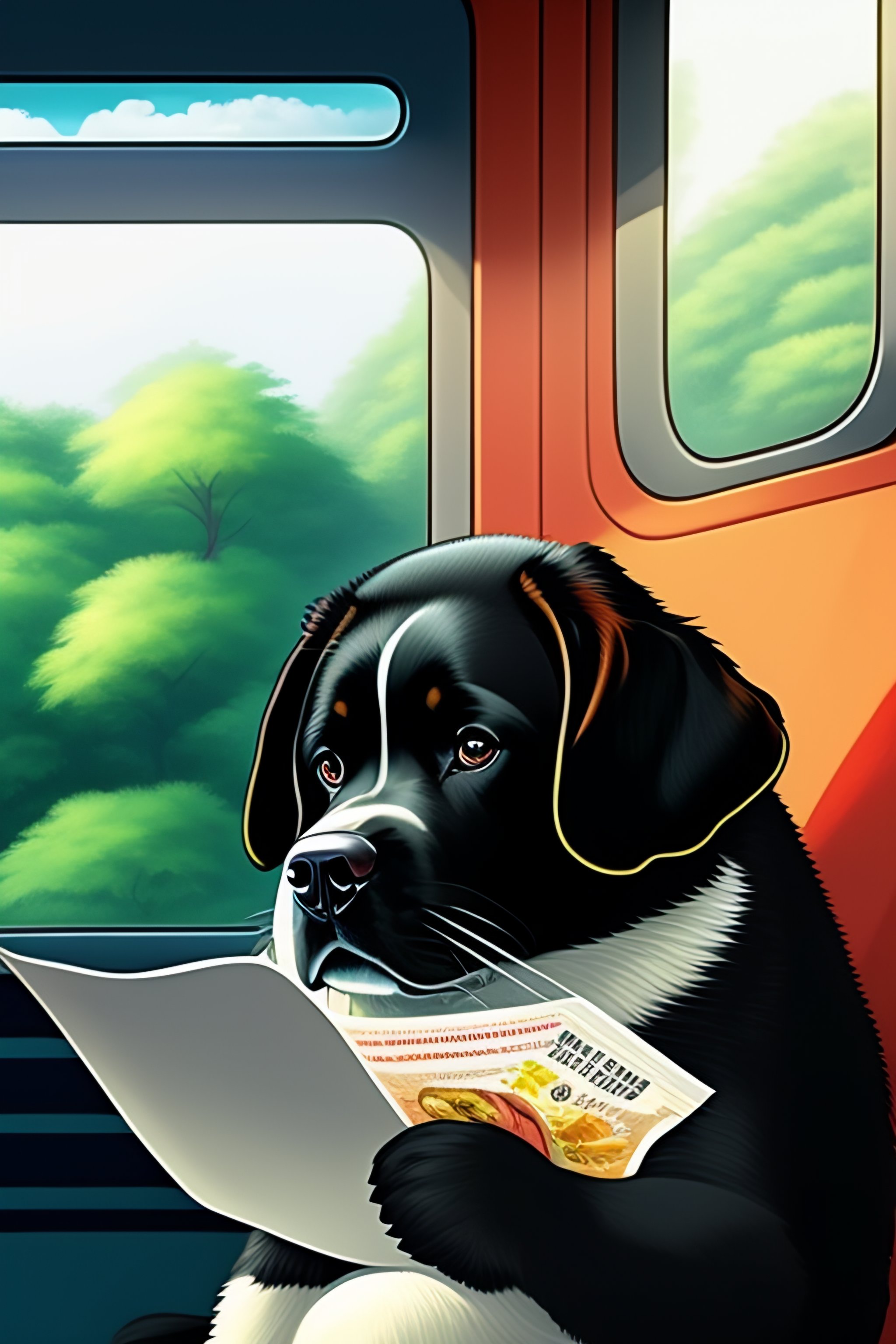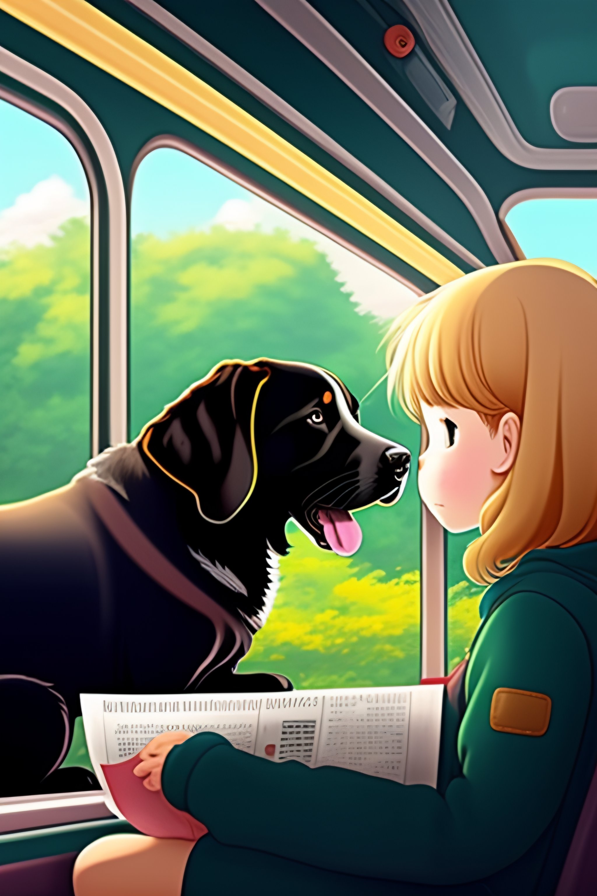 Cute labrador dog black beside totoro. reading newspaper in the bus