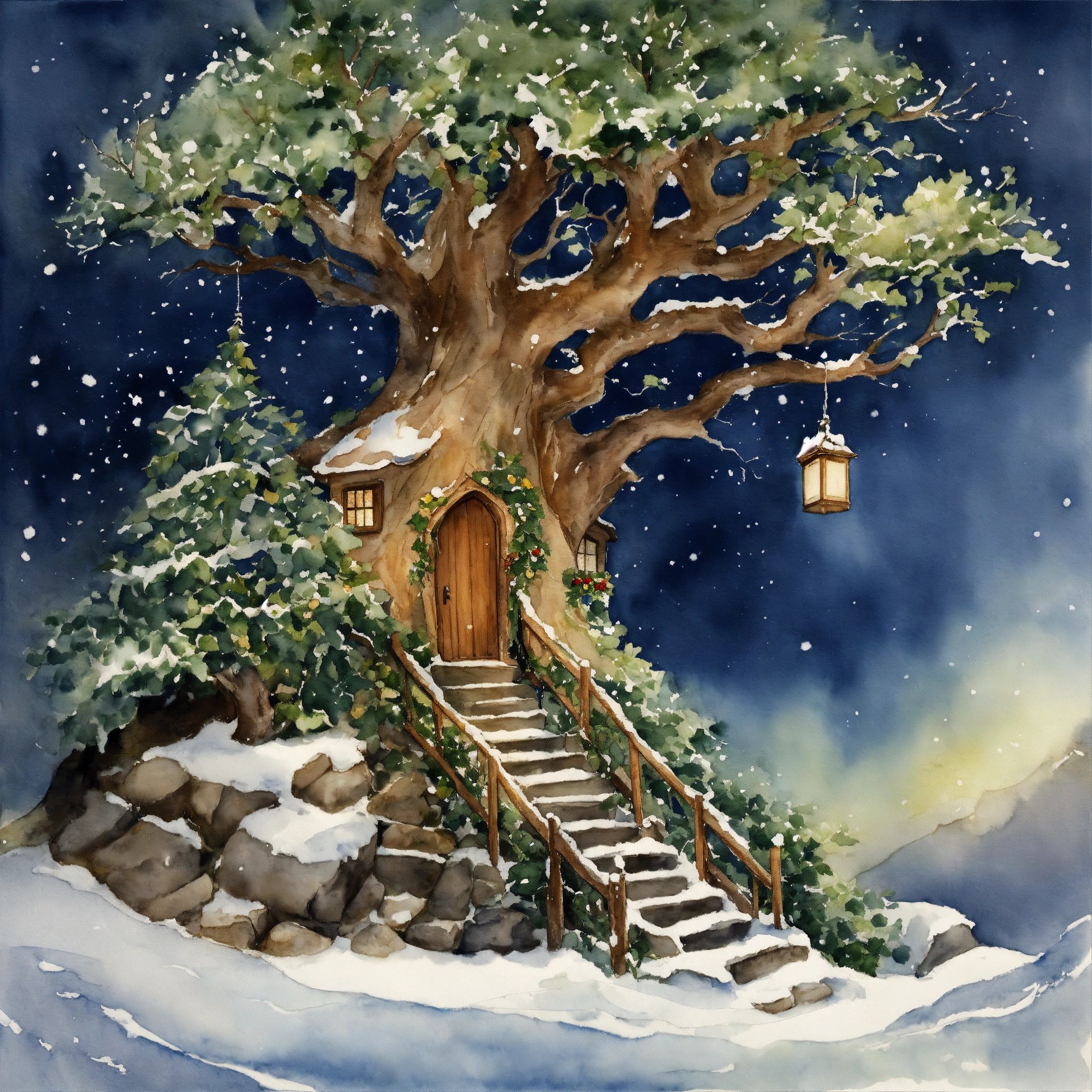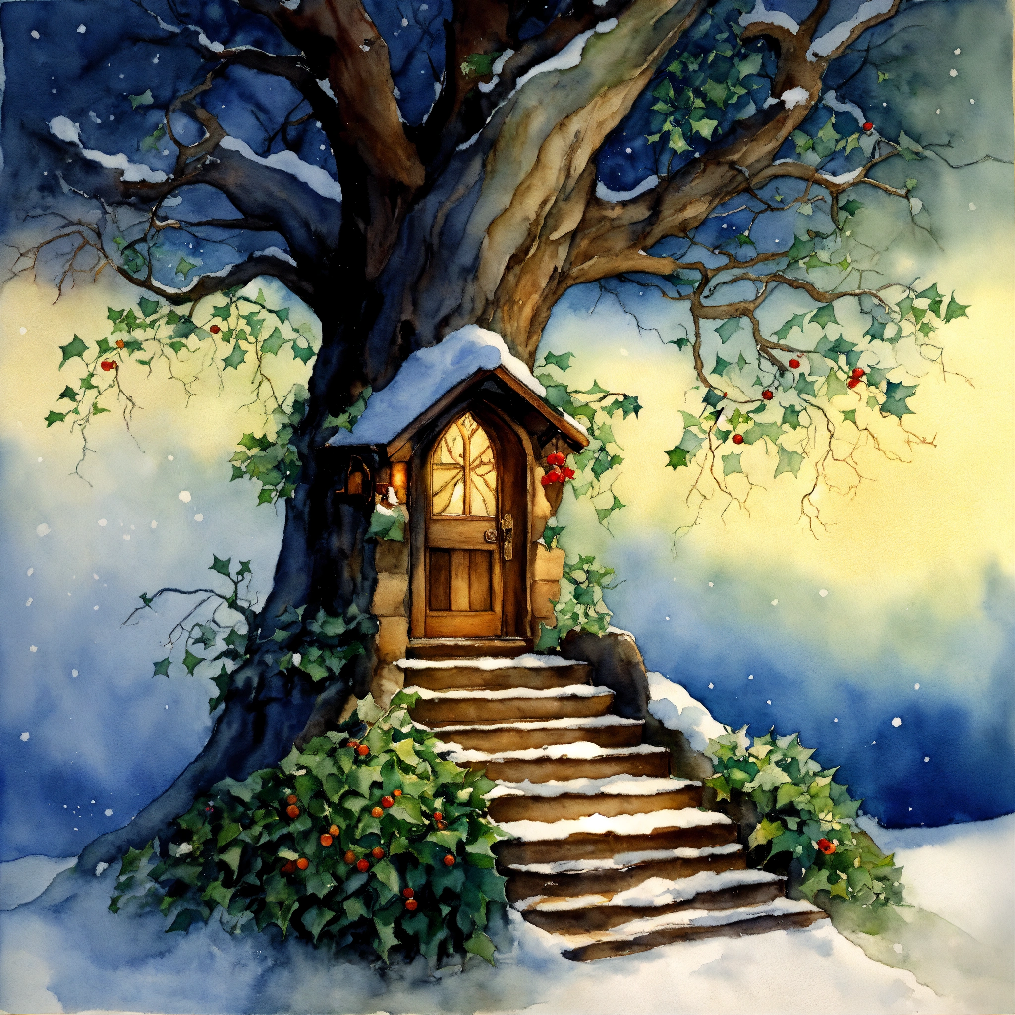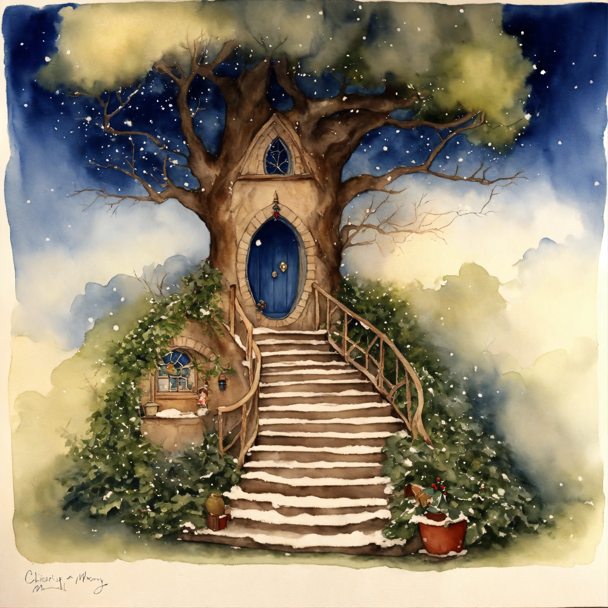 The inside of a elvish house, stairs carved on the outside leading to a elfs a workshop within the tree. the branches should reach out across the sky, a christmas story, ivy and holly around the tree, a snow storm forming in the dark blue sky, watercolour painting by cicely mary barker