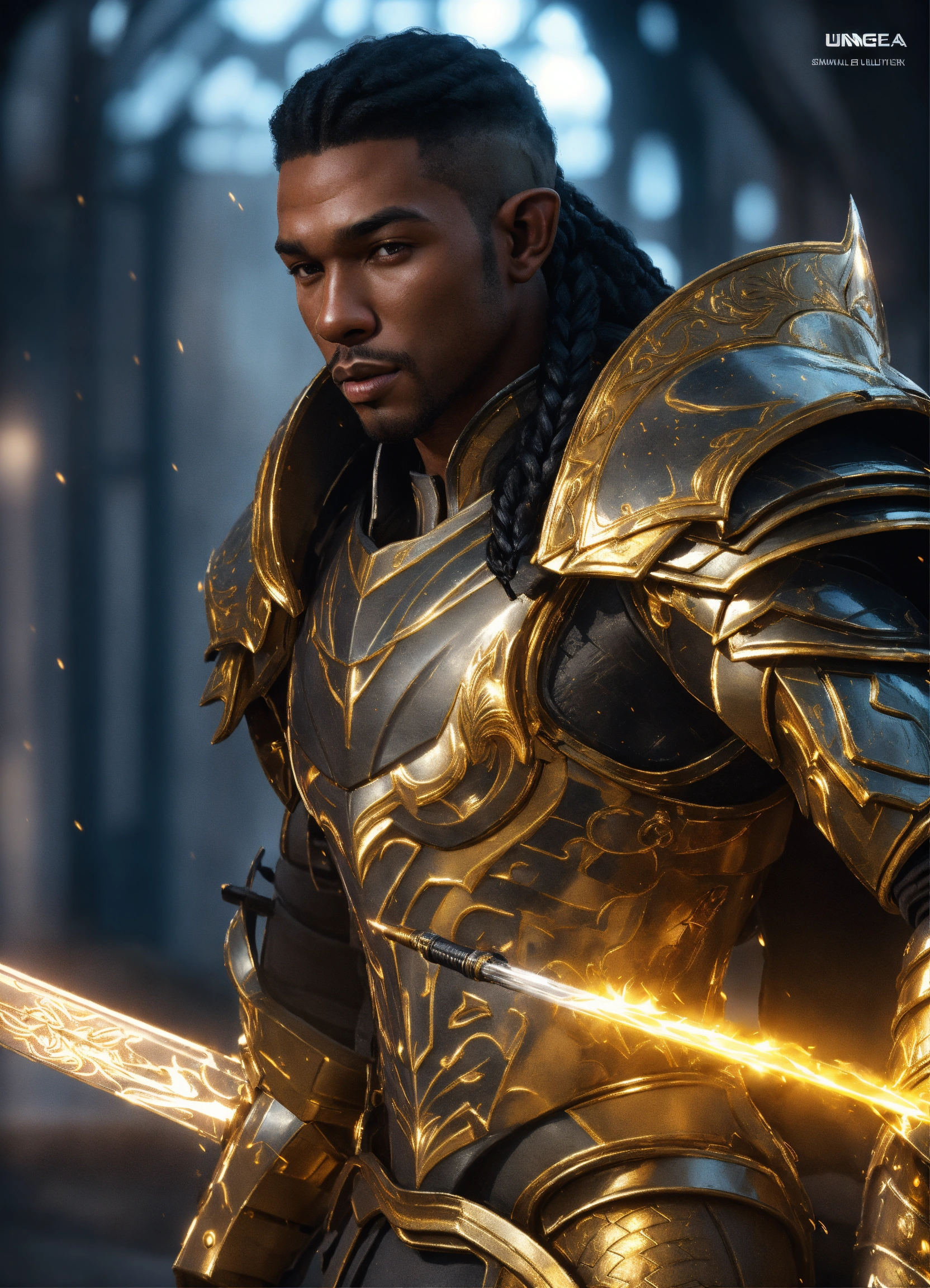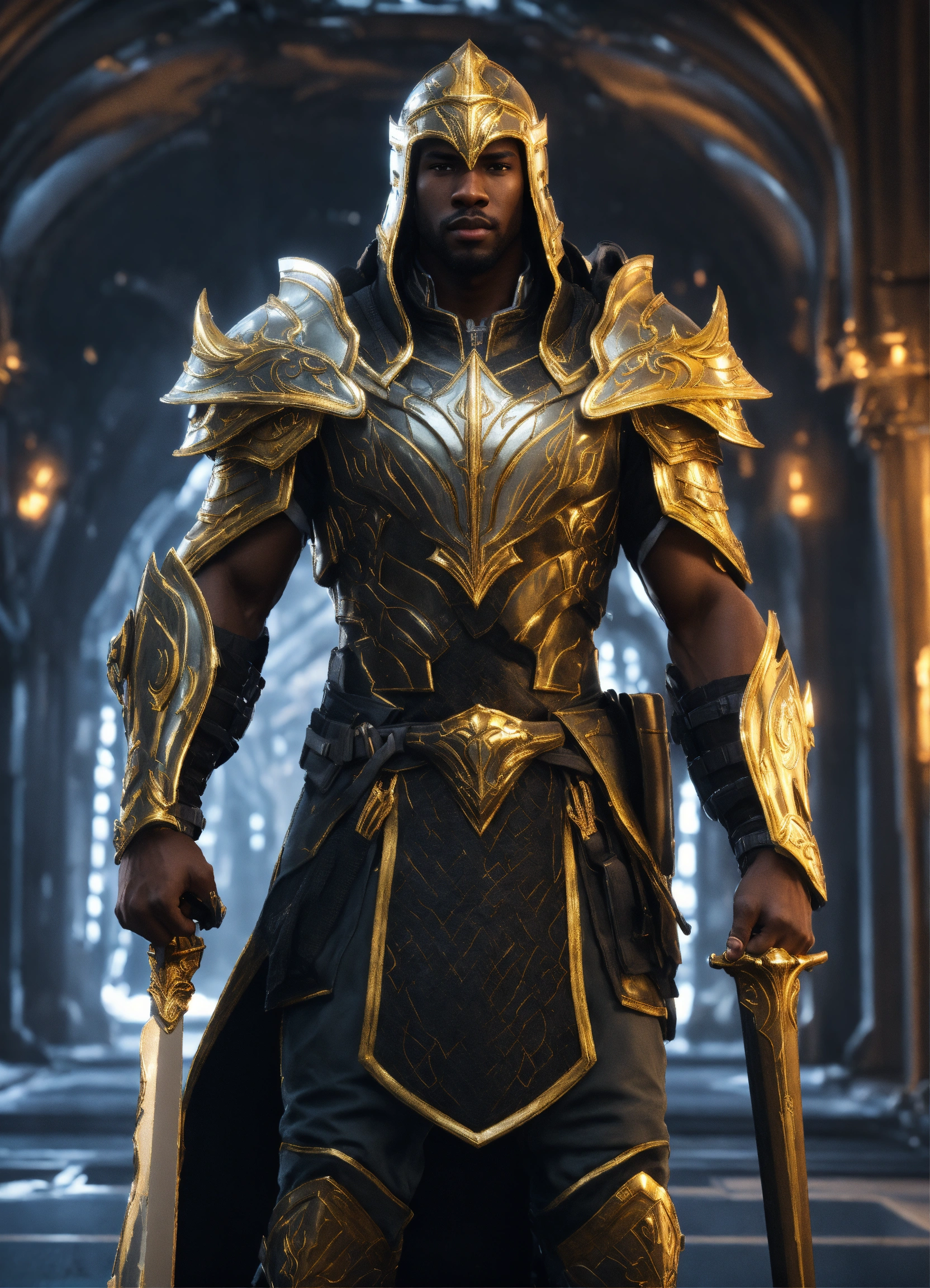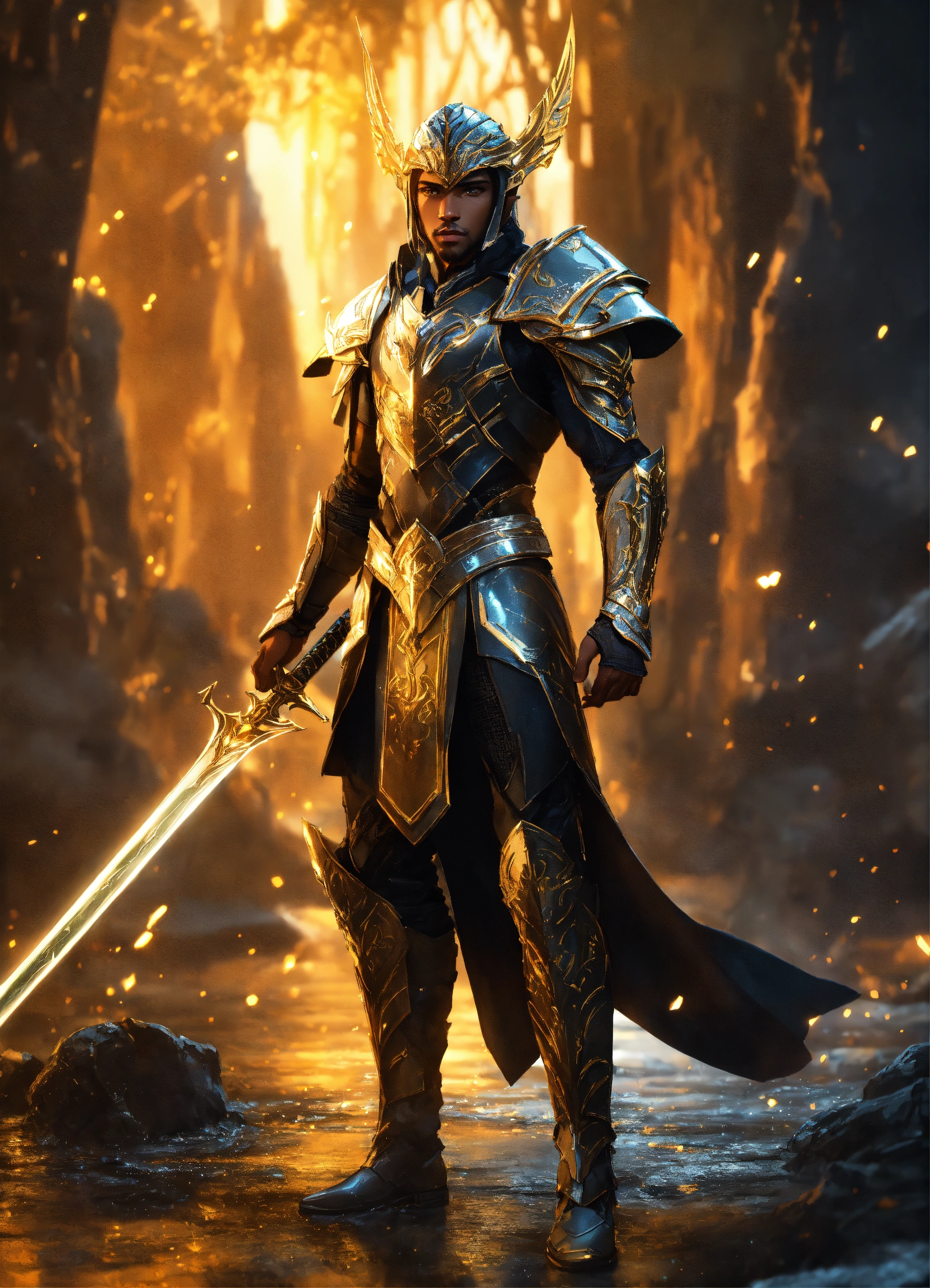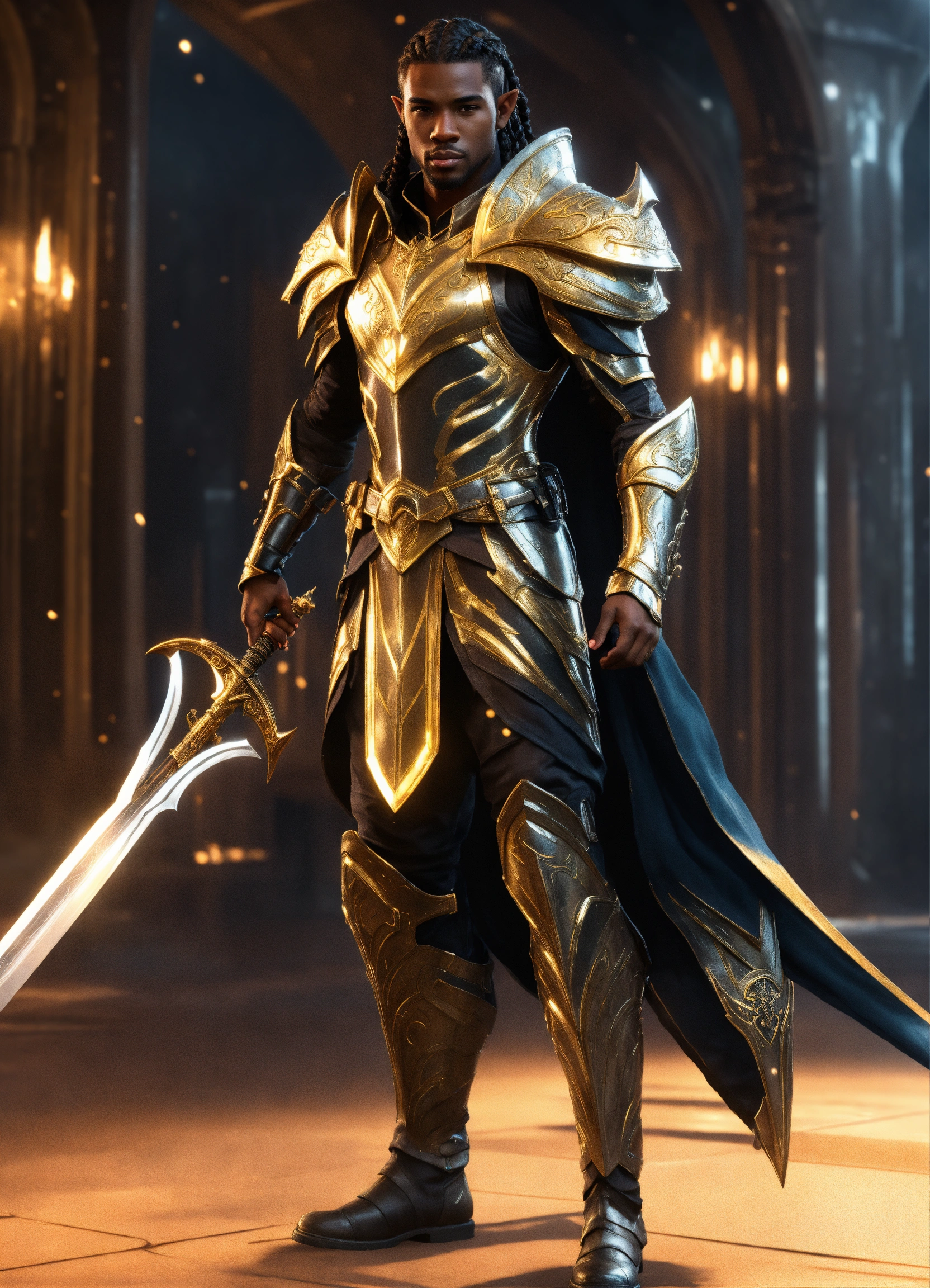 Full body of a handsome black male high elf, long braided hair, muscular, sci fi soldier wearing heavy sci fi elven armor, black and gold armor and helmet, visor, boots, male, holding a sword, full body, 8k resolution concept art portrait dynamic lighting hyperdetailed intricately detailed splash art trending on artstation unreal engine 5 volumetric lighting