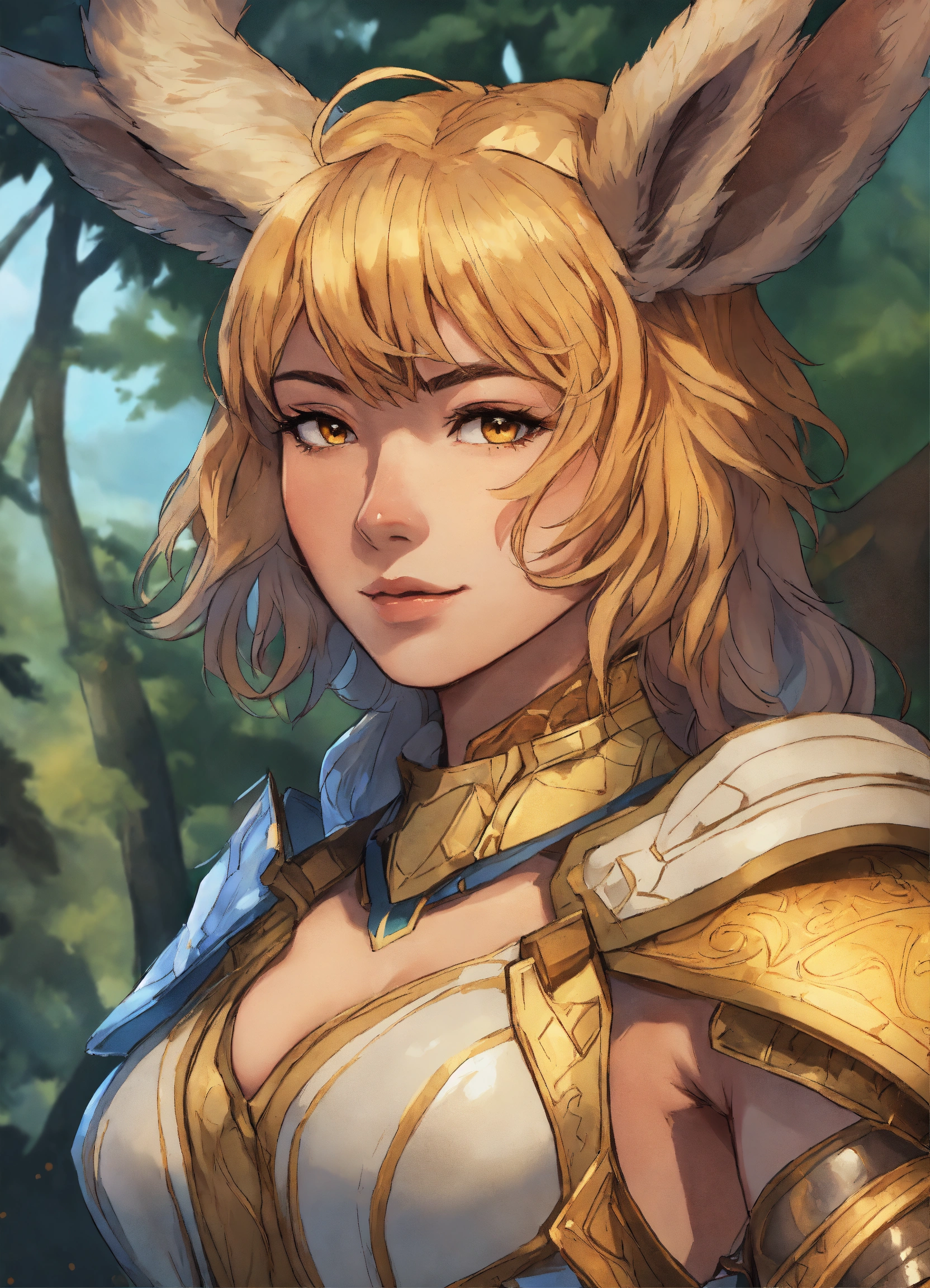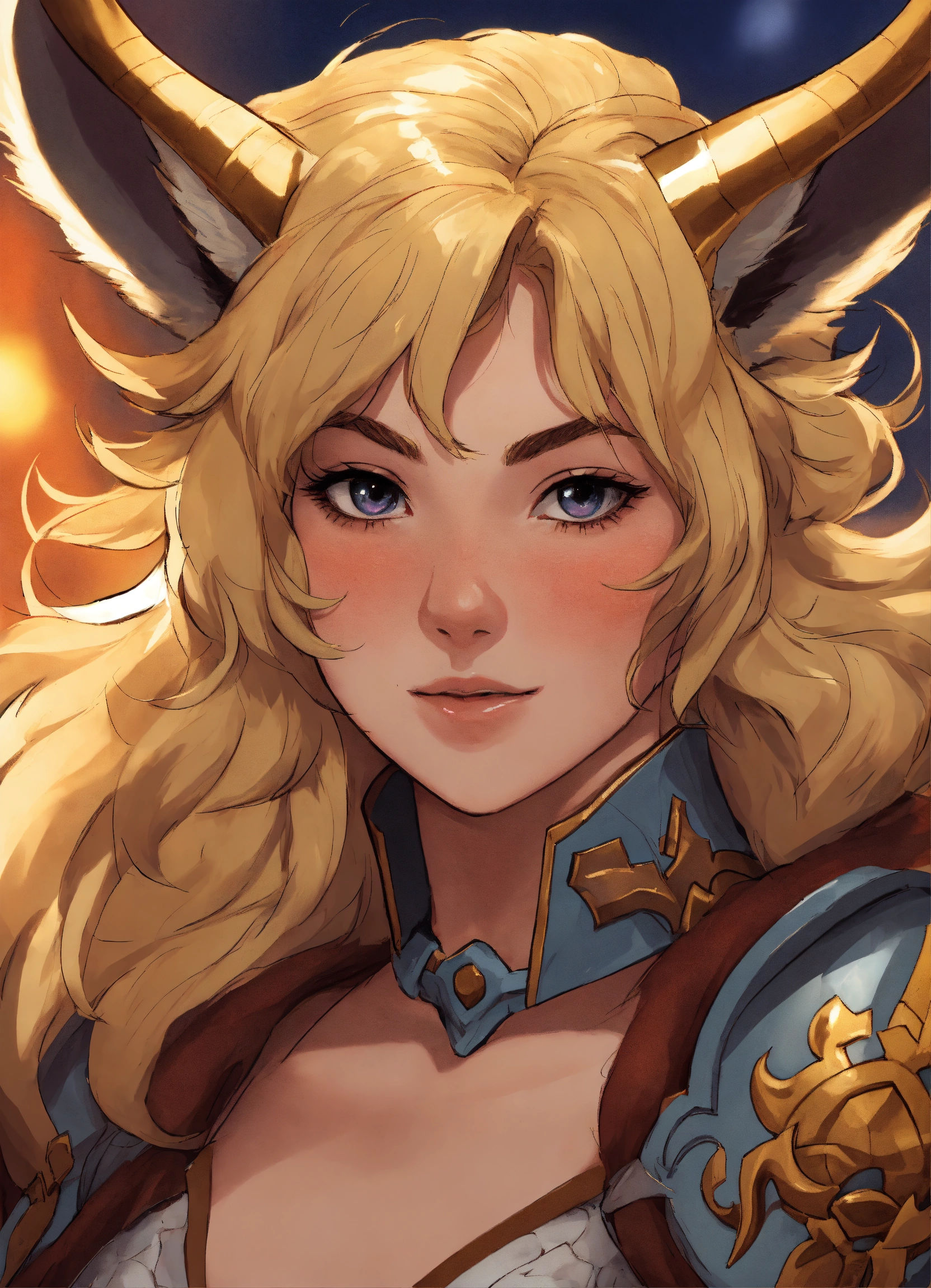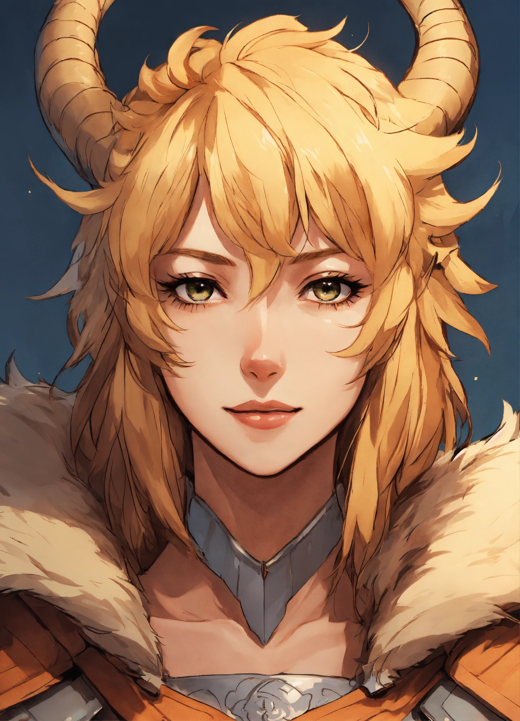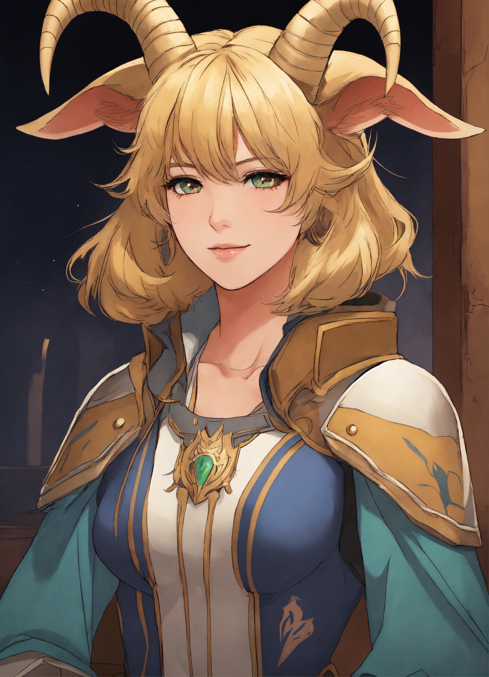 Full-color anime drawing of a friendly-looking woman in her 30s. her face is framed by short, blonde tousled hair with side-swept bangs. she possesses long, floppy, goat-like ears, and horizontal slits mark her eyes. a pair of long, straight impala horns is prominently displayed from her forehead. her body, covered in fur, is encased in heavy paladin armor, reflecting her strength and bravery. her unique, mythical origin is highlighted by her cloven feet