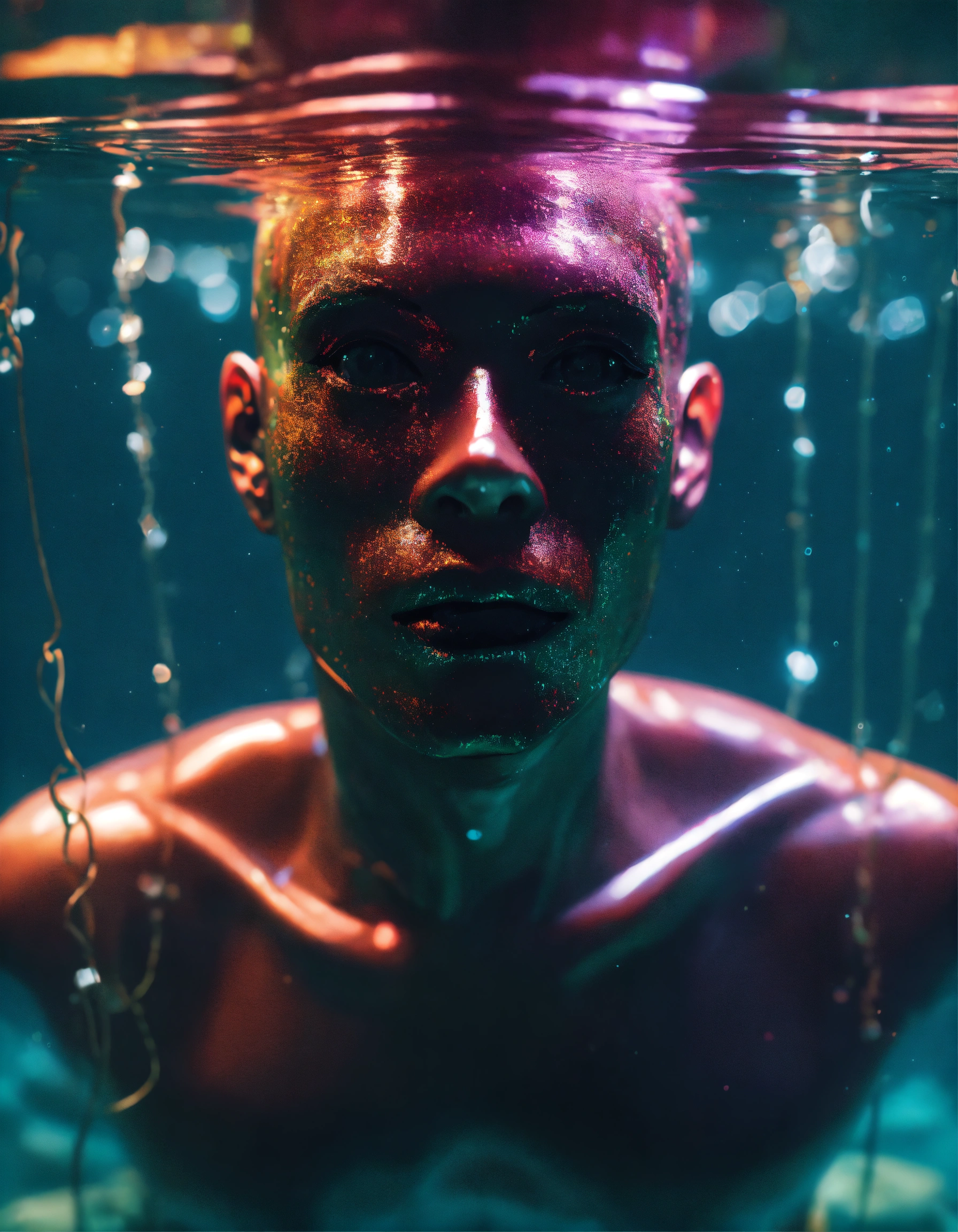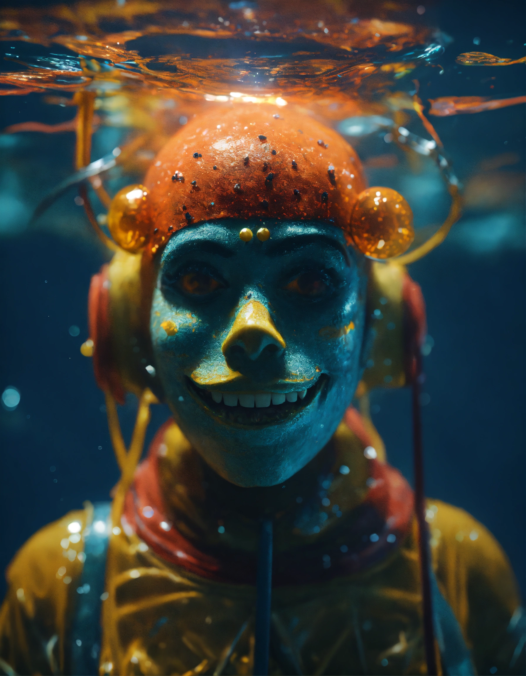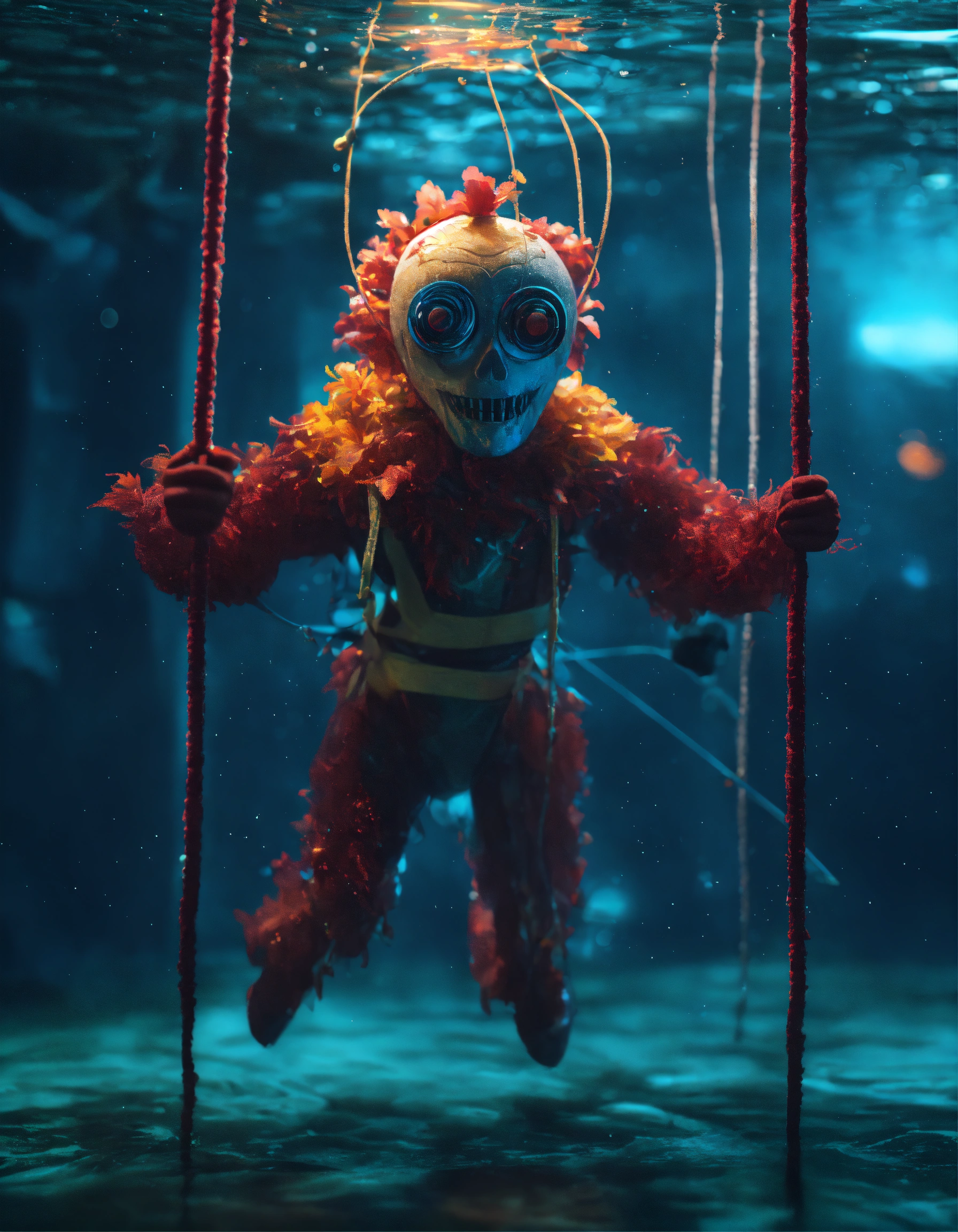 Scary puppet on a string under water, halloween, unreal engine render, 8k resolution, hyper realistic, day, 35mm film, editorial, high fashion, 2023, off white by virgil abloh, beautiful, highly detailed, sharp focus, studio photography, xf iq 4, 150 mp, 50 mm, iso 200, 1/1 60 s, realistic, colorful disco lights, octane render, adobe lightroom, rule of thirds, symmetrical balance, depth layering, polarizing filter, sense of depth, ai enhanced