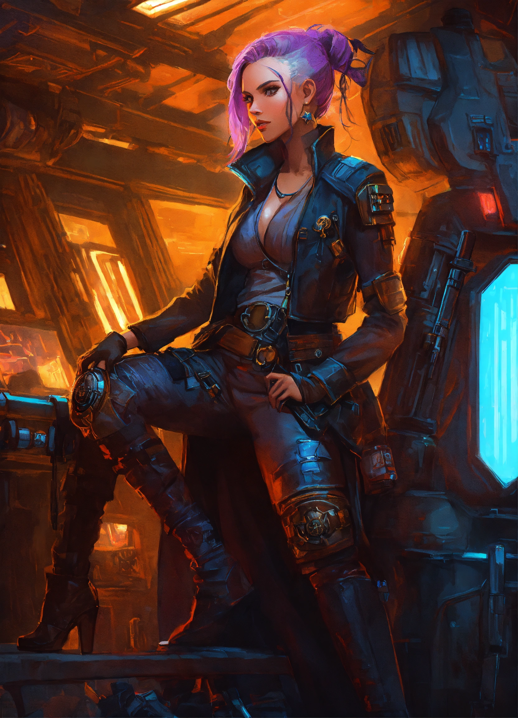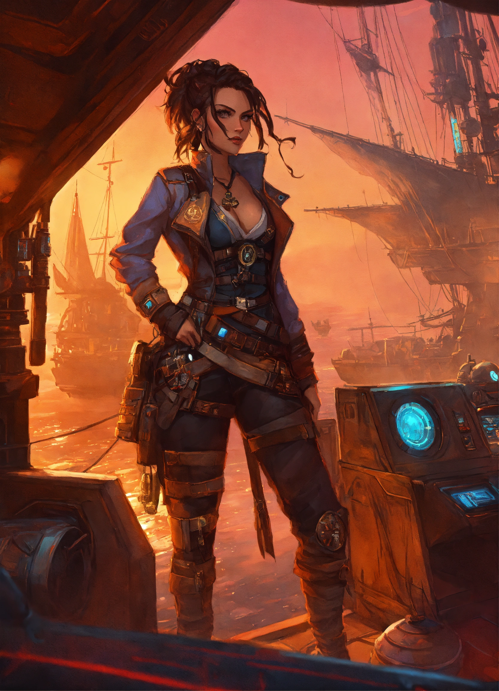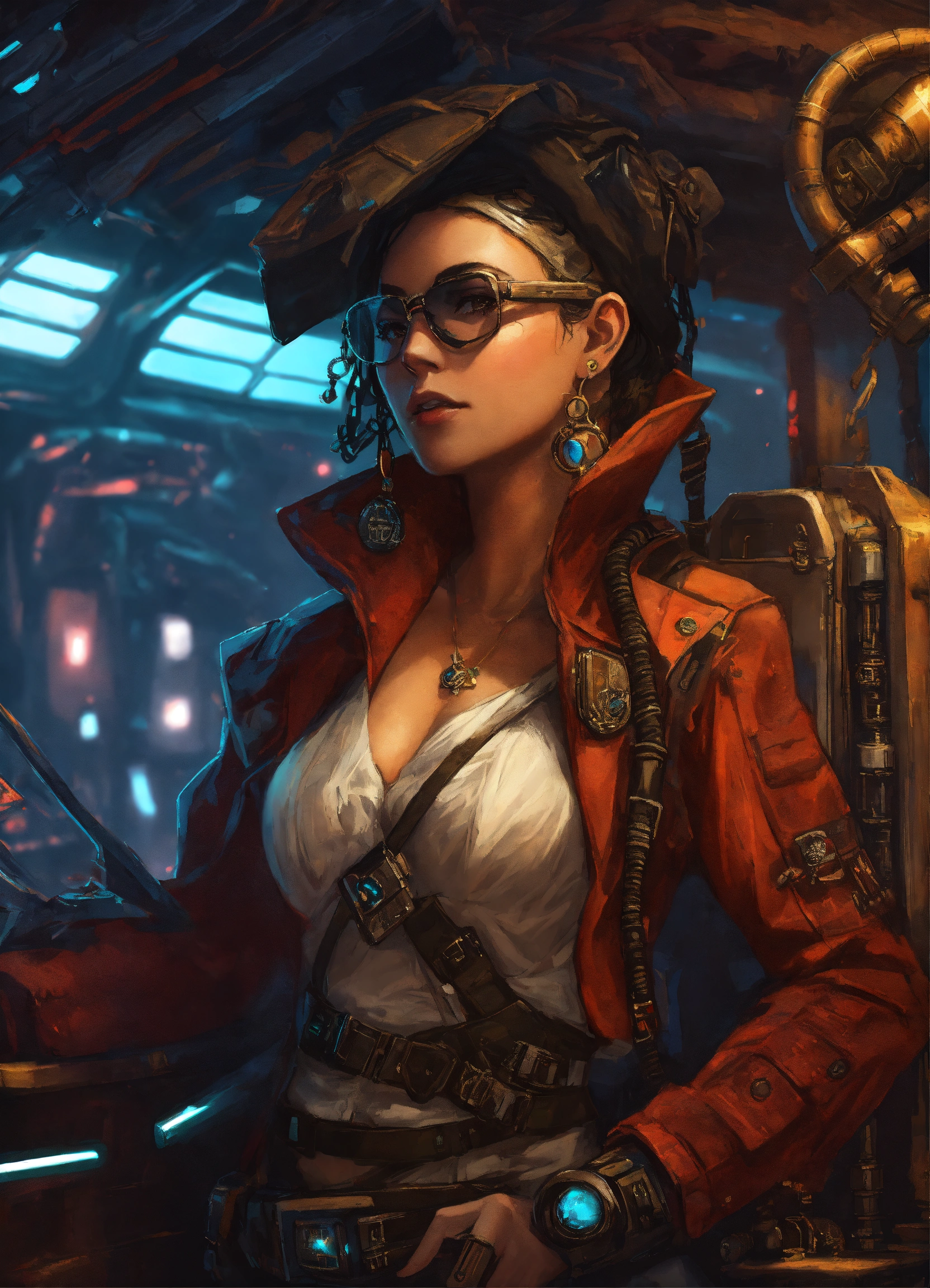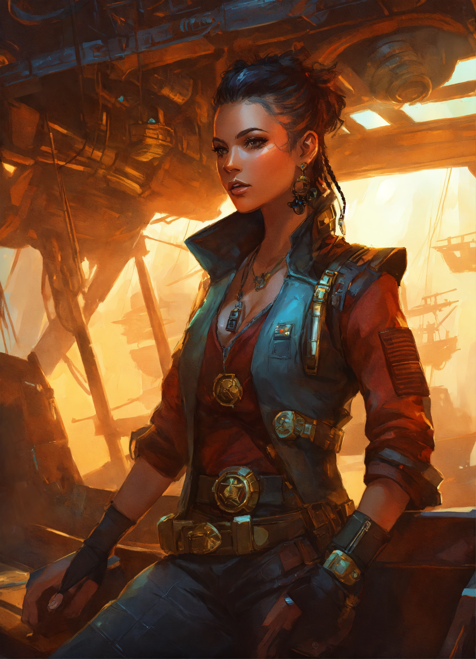 Character art of a cyberpunk female pirate in a star wars treasure ship