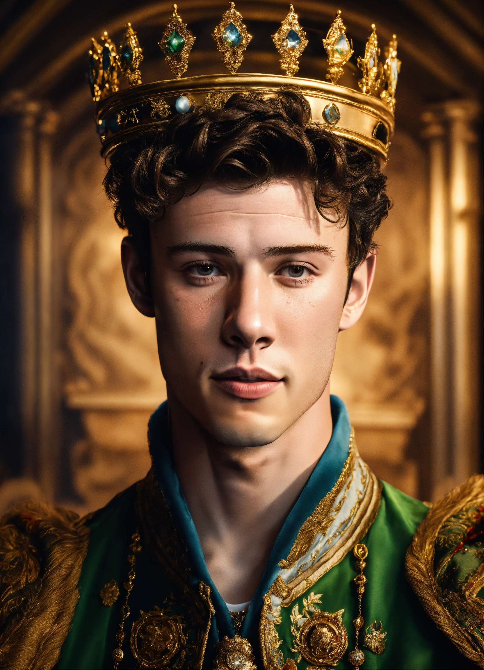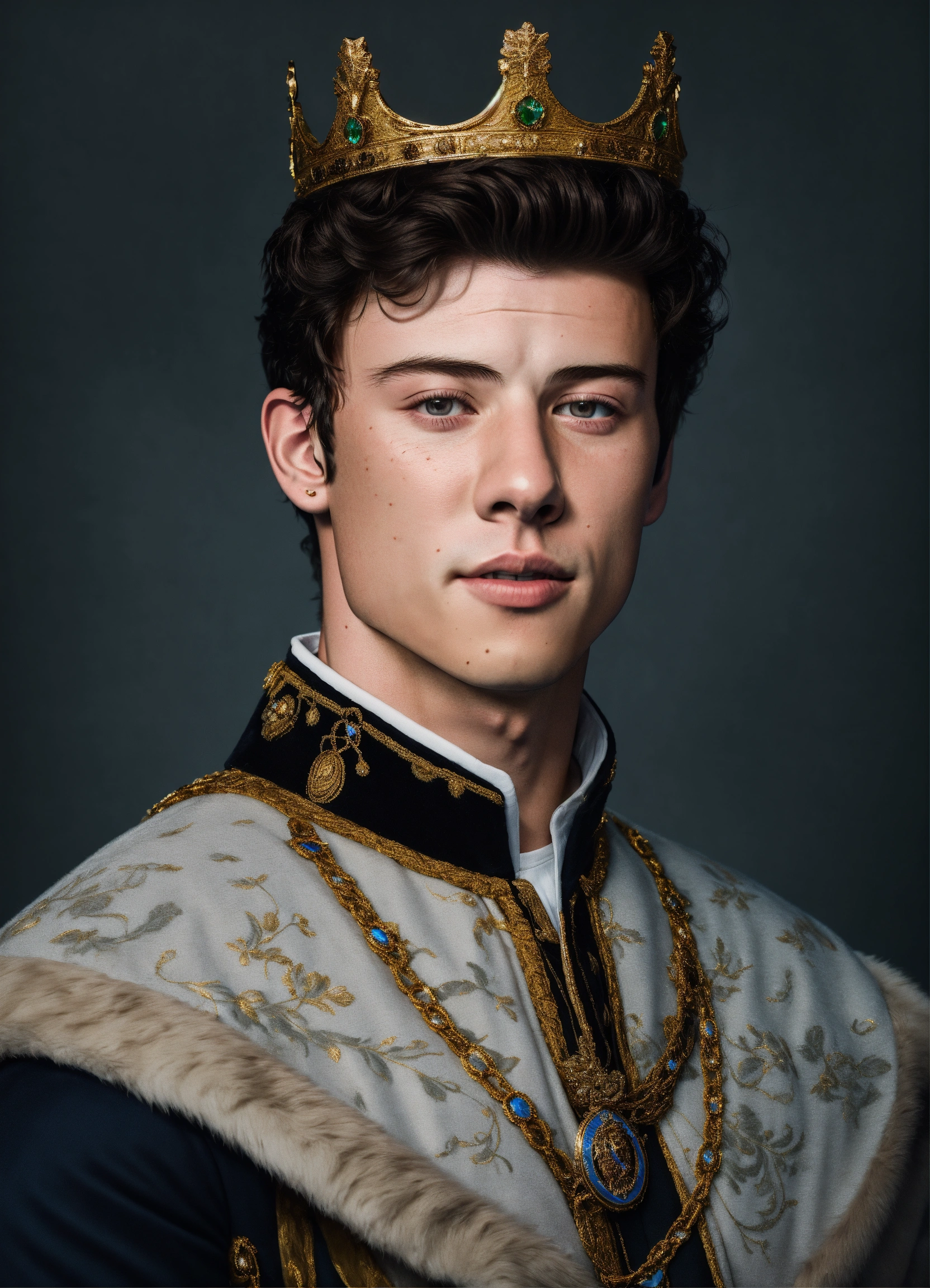 Realistic portrait of shawn mendes as king, in frame, very detailed, studio lighting, 8k, realistic, smooth