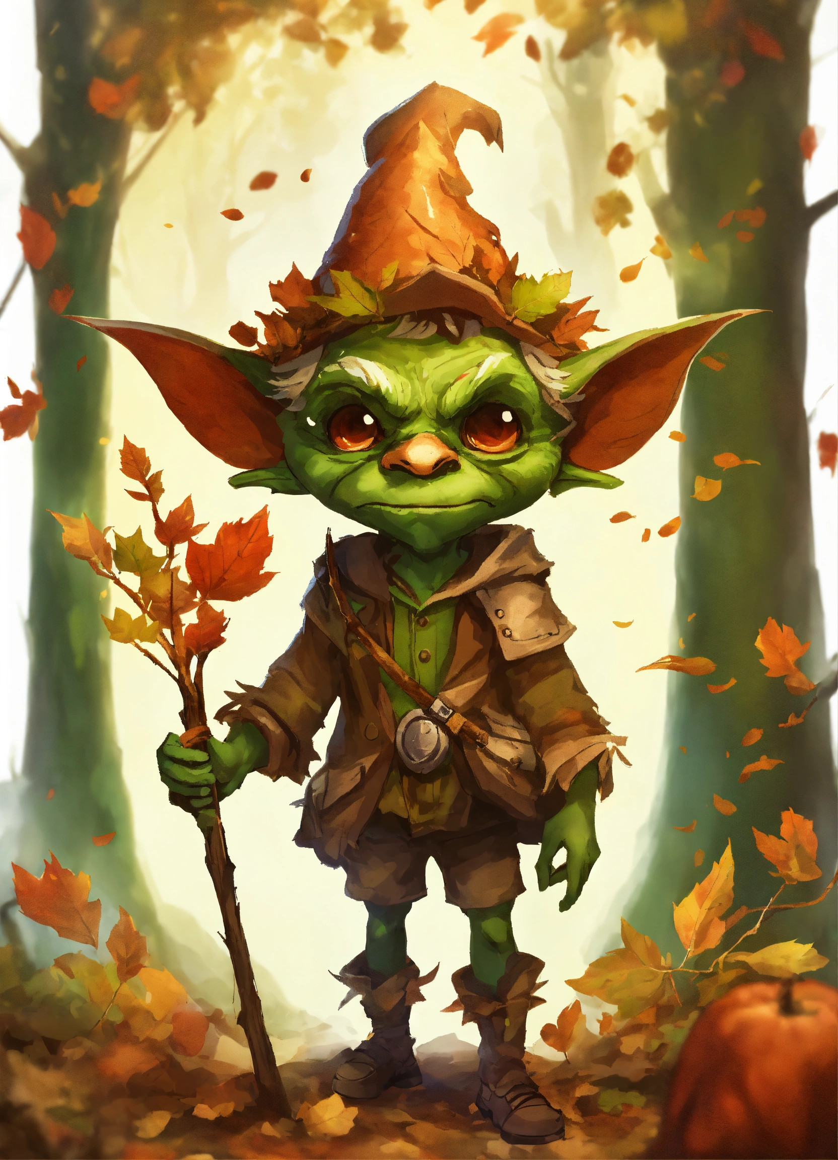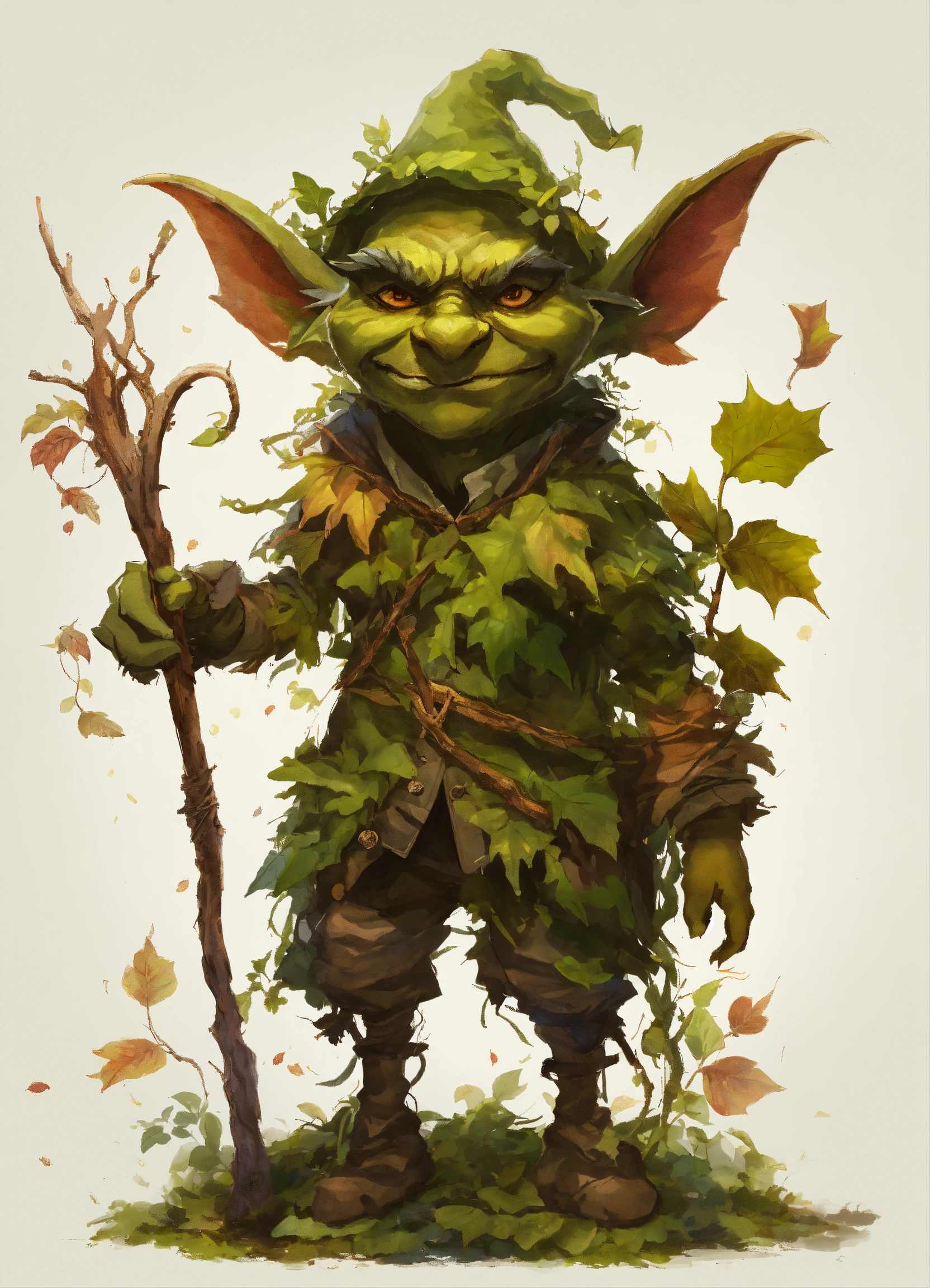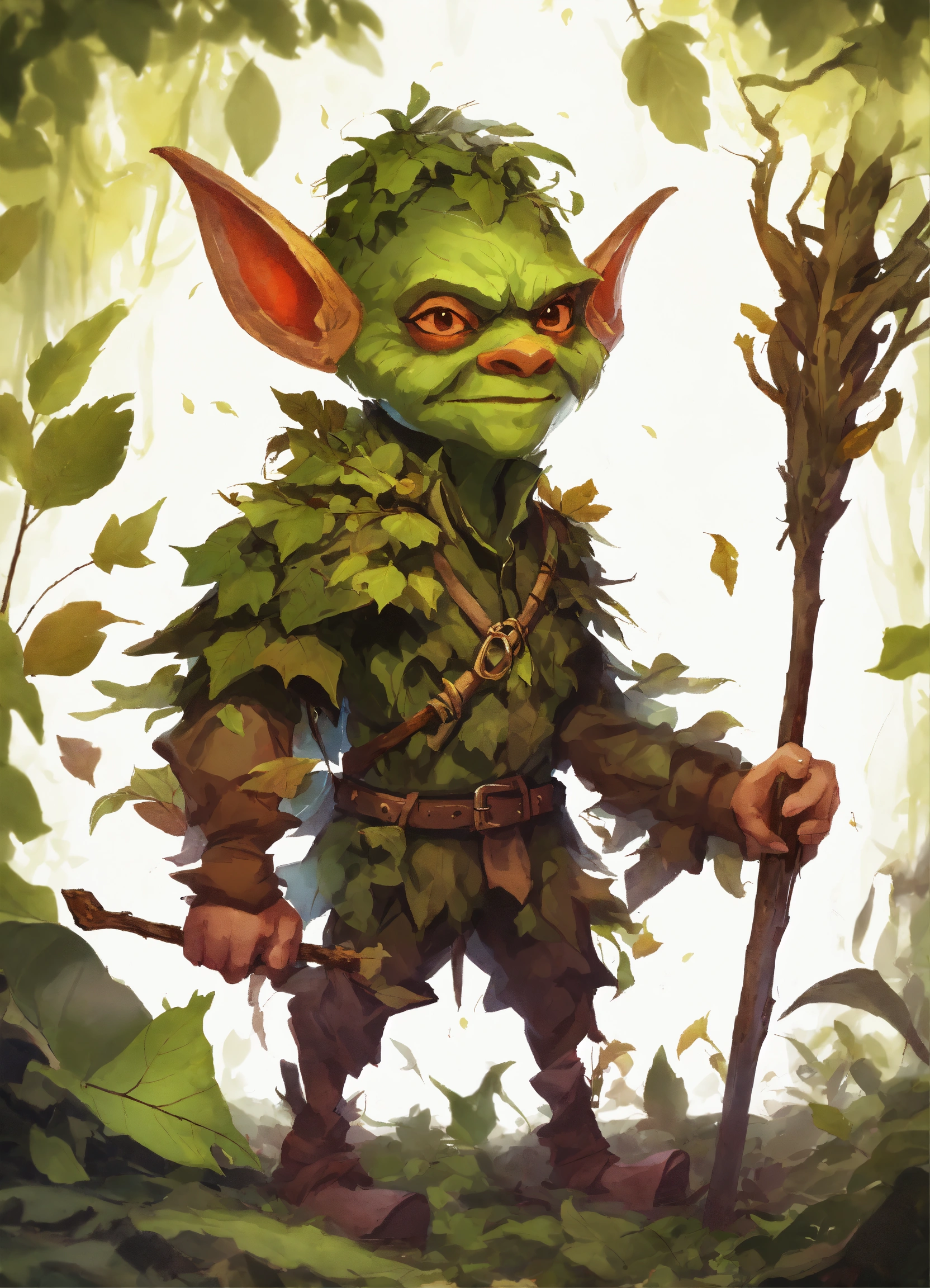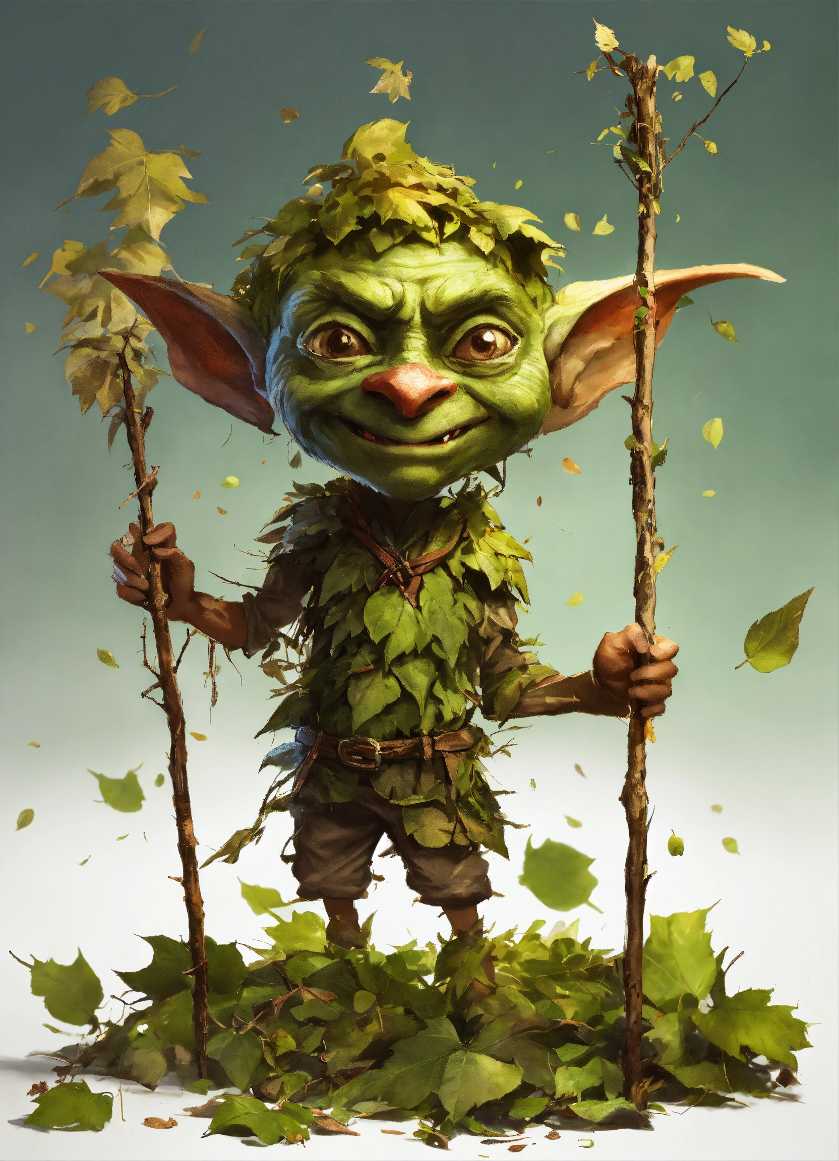 Child's drawing, computer game character, evil forest goblin with a big nose, standing in clothes made of leaves and twigs, holding a staff in one hand, focus on 3/4, view from bottom to top, white background