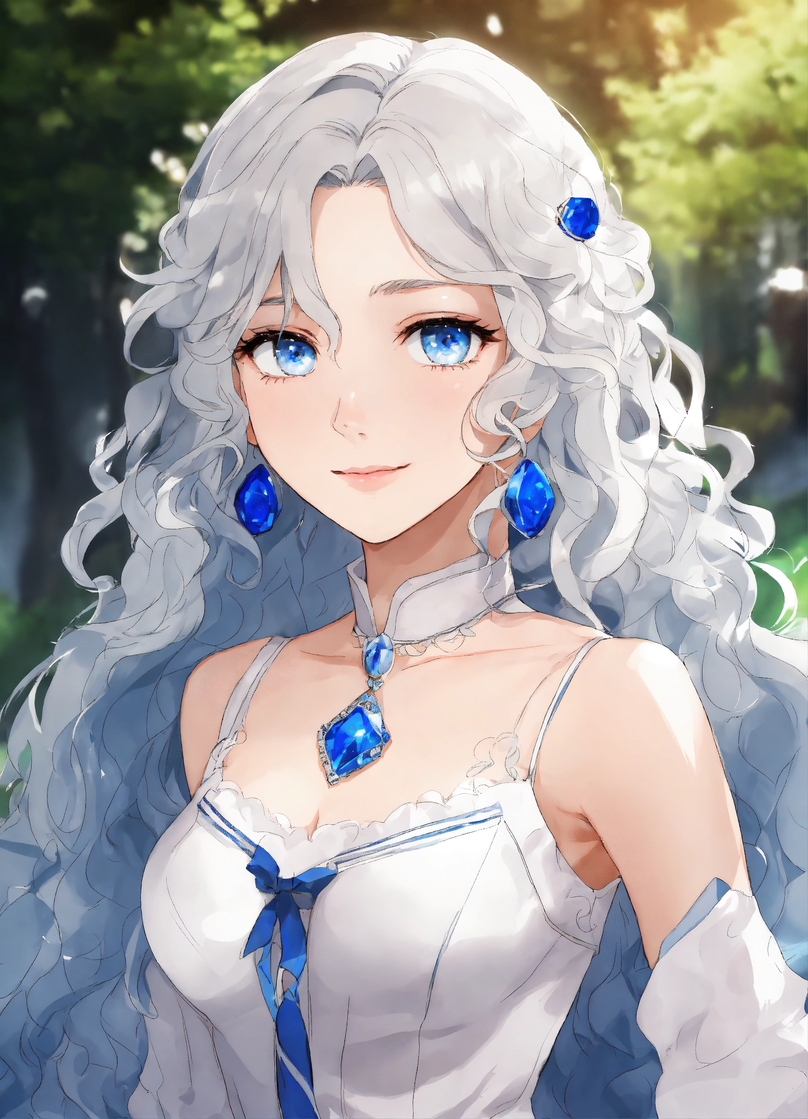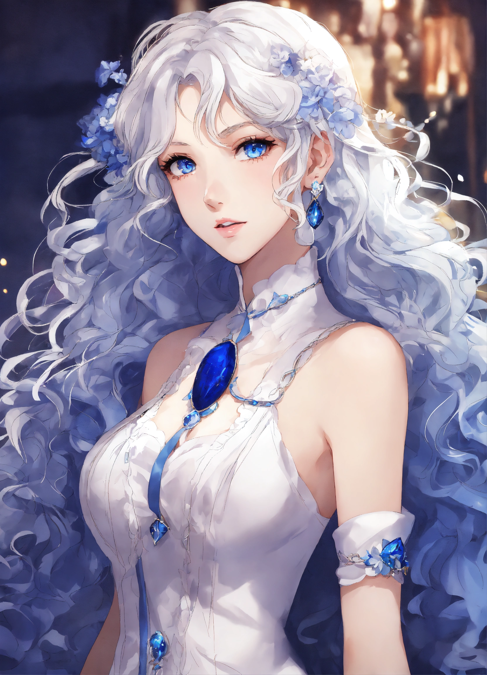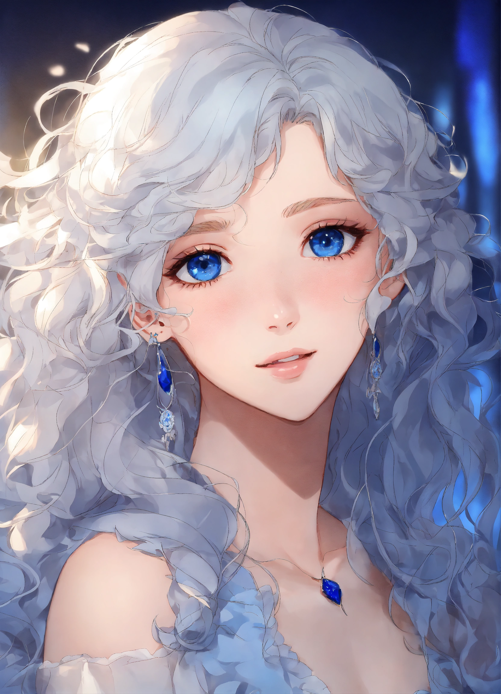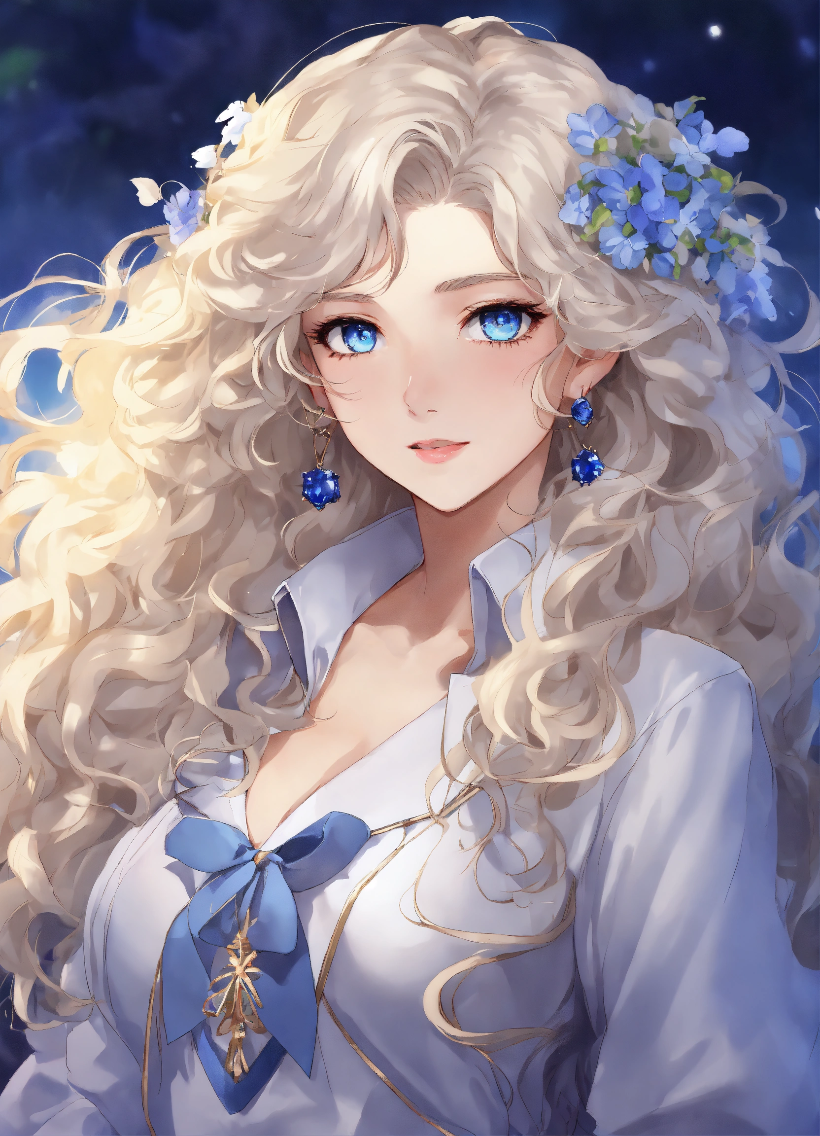 Girl 18 years old. white curly long hair. beautiful face. hard facial features. height 175. feminine figure. blue, sapphire eyes. anime reskin style