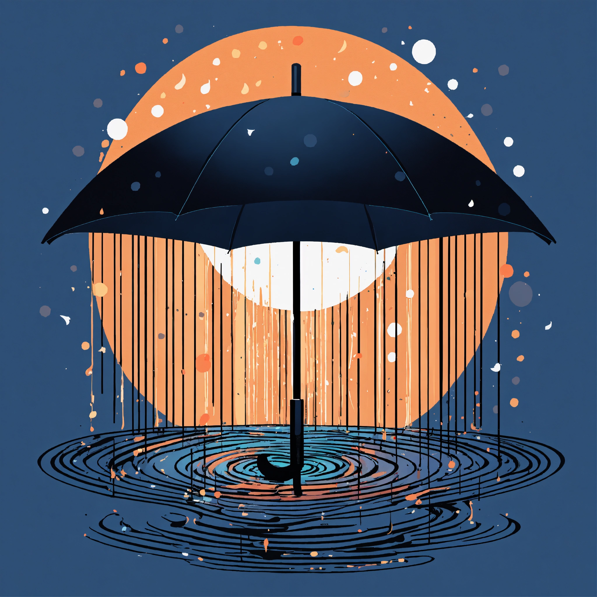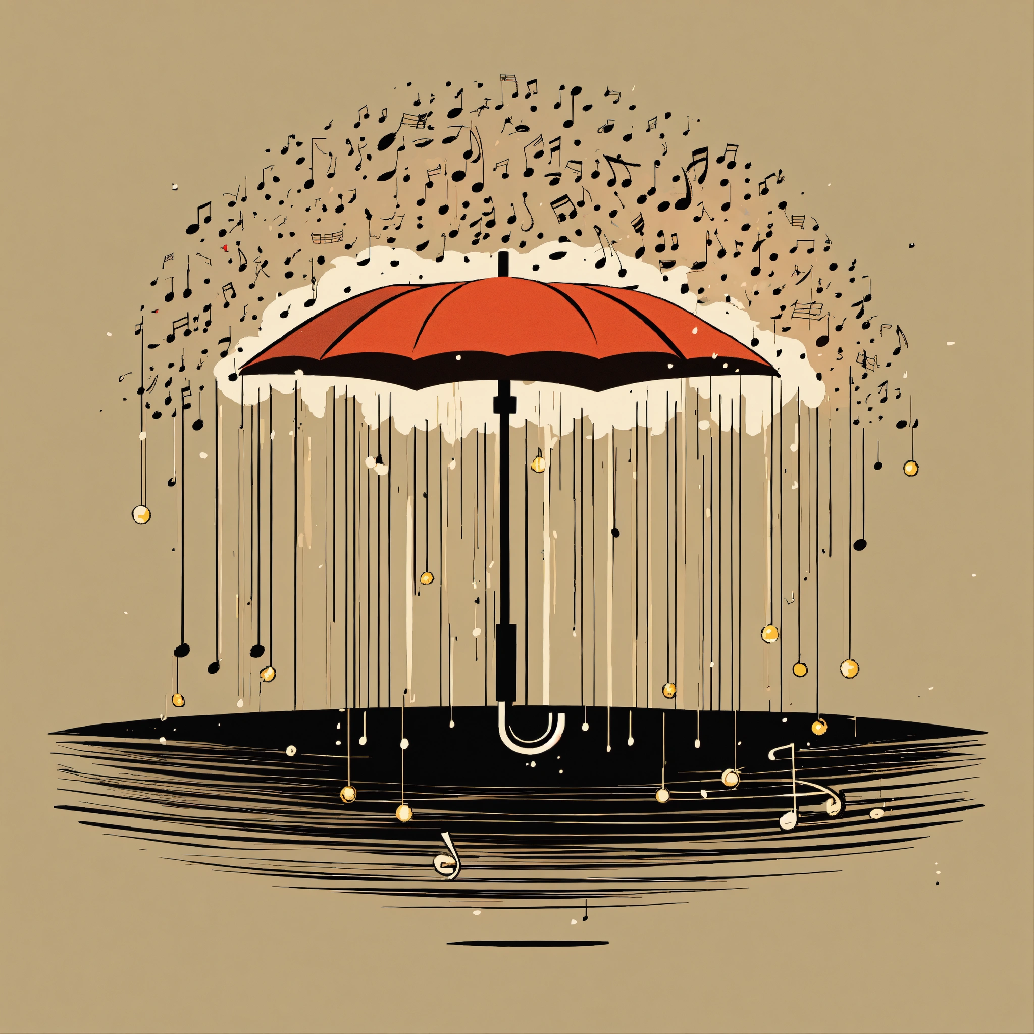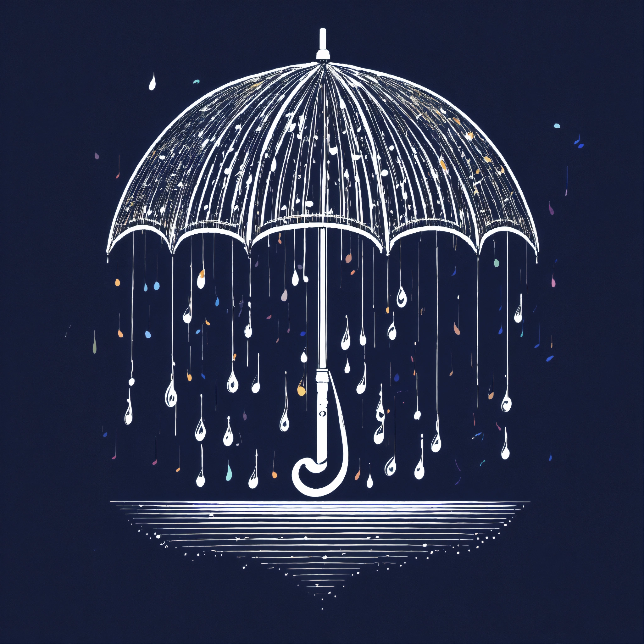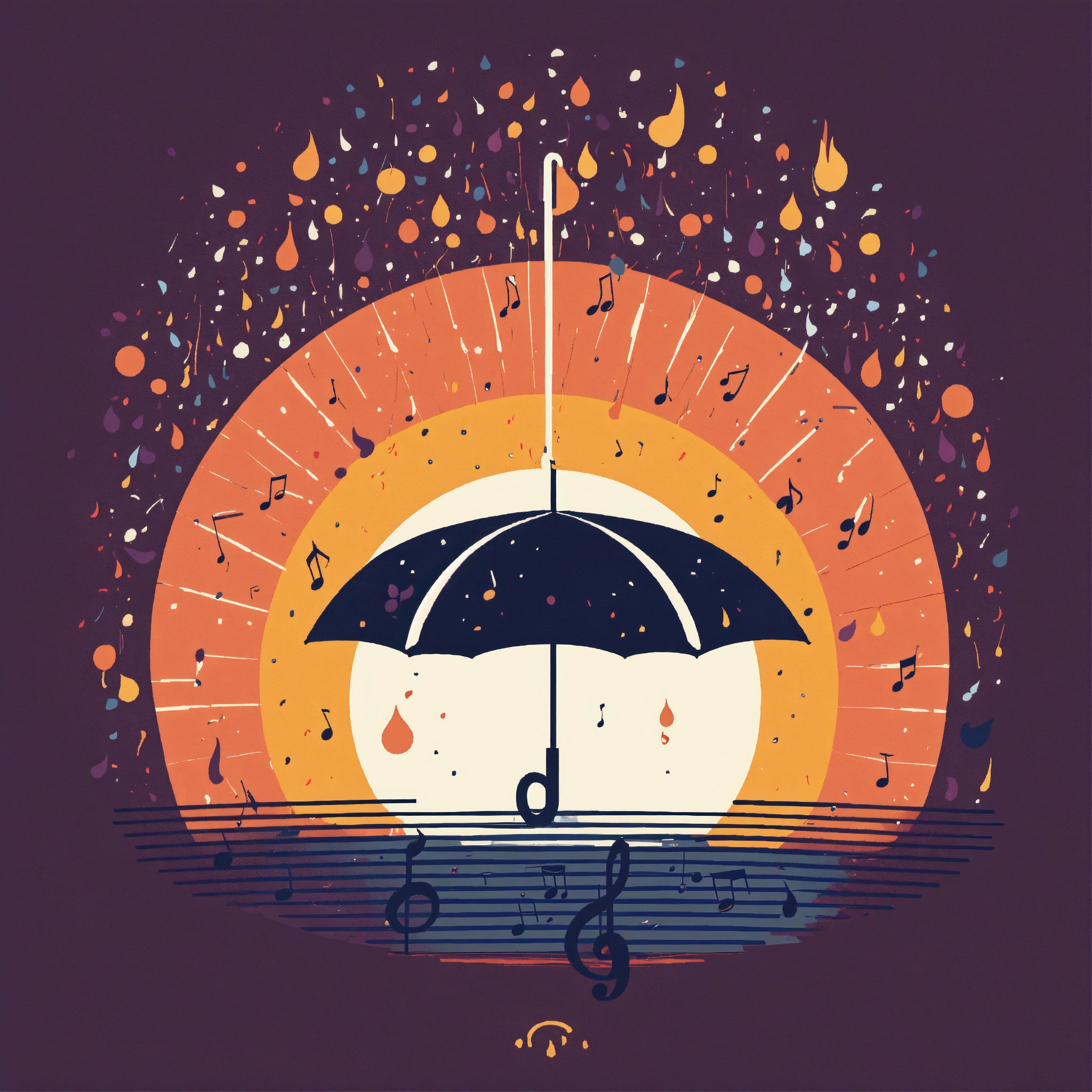 T-shirt vector illustration, centered design of a minimalist umbrella, where the raindrops form a cascade of musical notes, set against a symphonic storm. evoking melodies in nature. simplistic, centered vector illustration, solid background color.