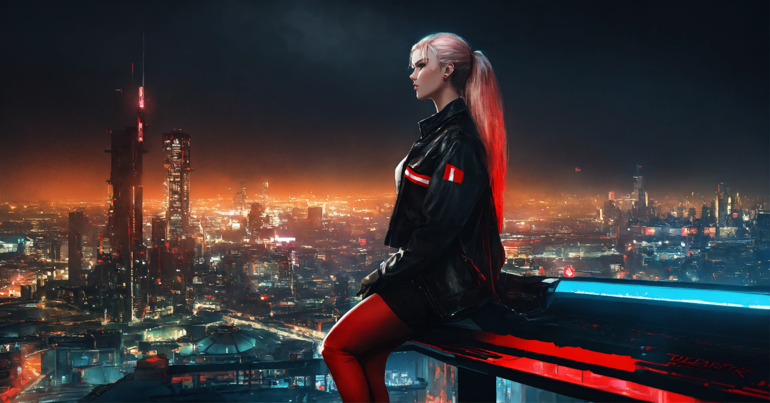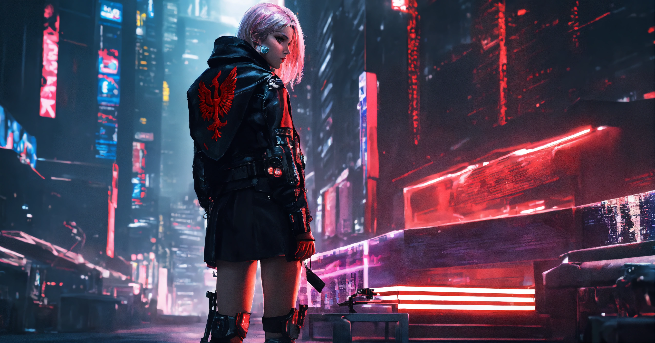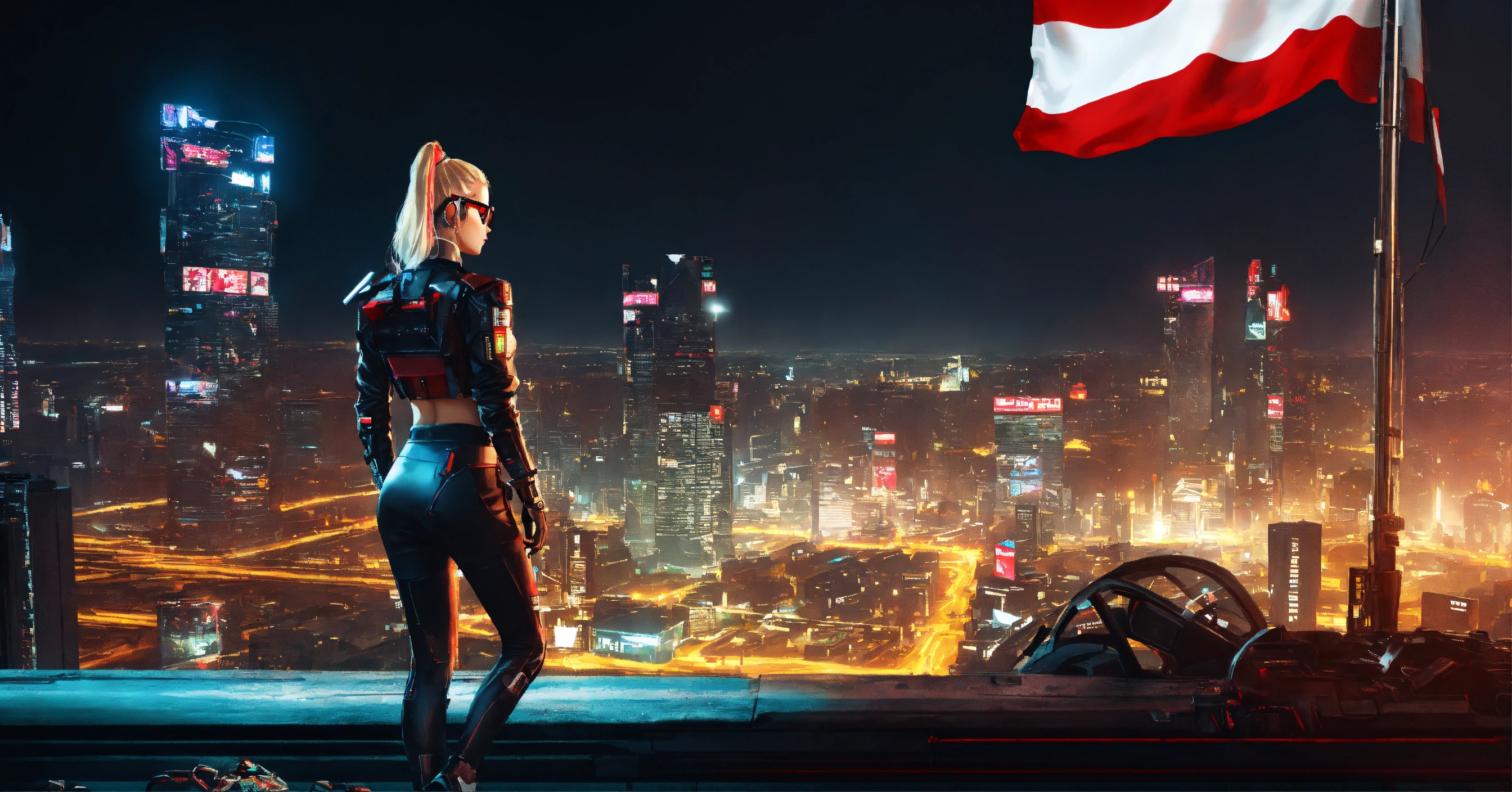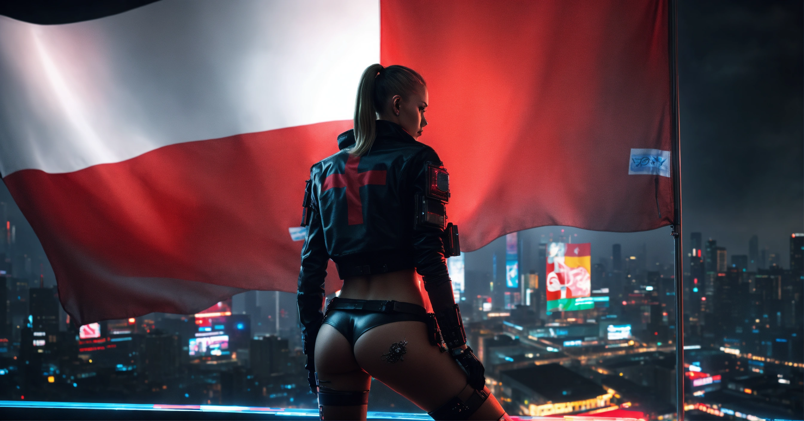 Cyberpunk style, woman nice man on cyberpunk, cyberpunk style, cyberpank city, add flag poland, black background, with poland flag, light hair, ong legs