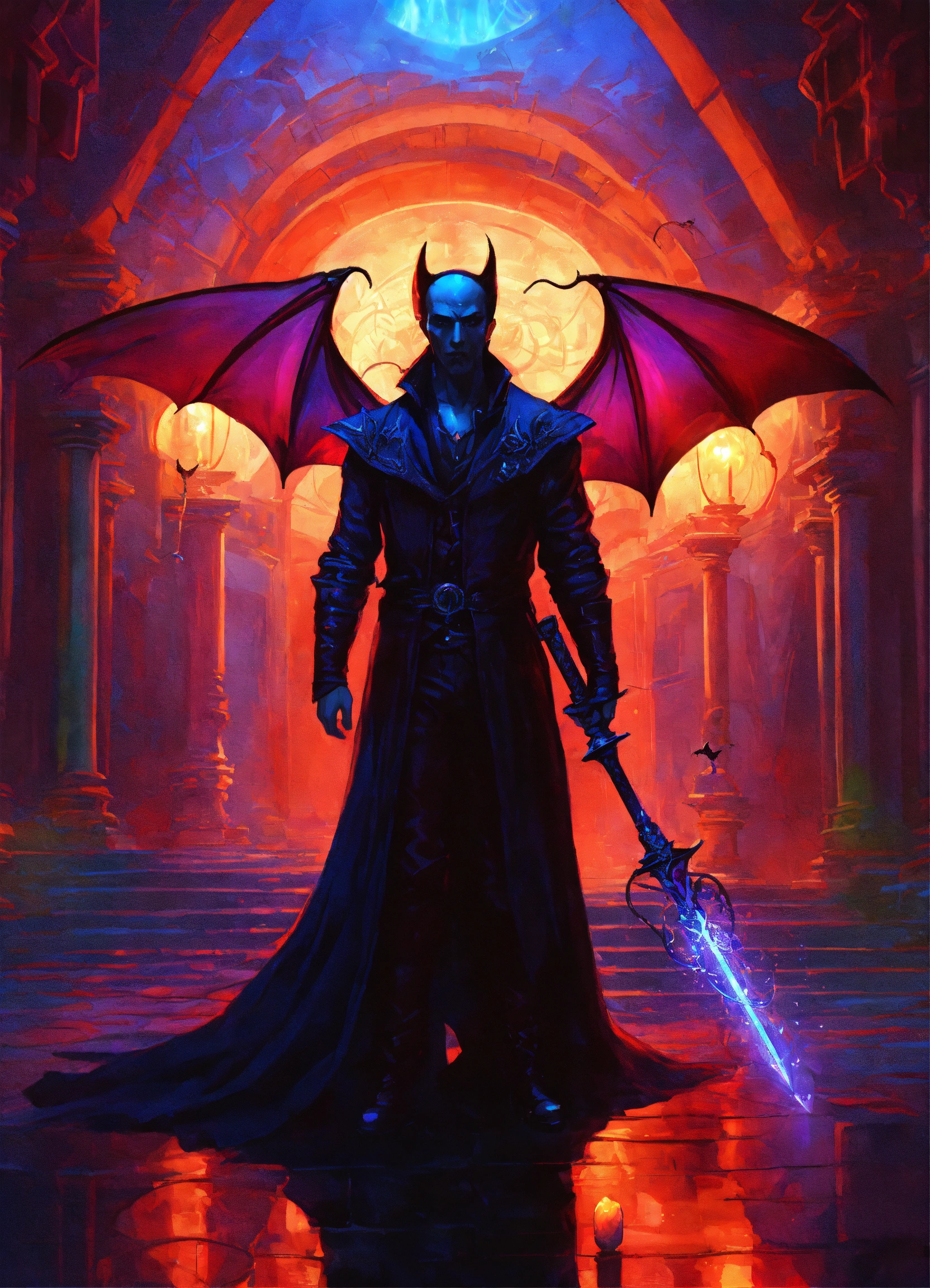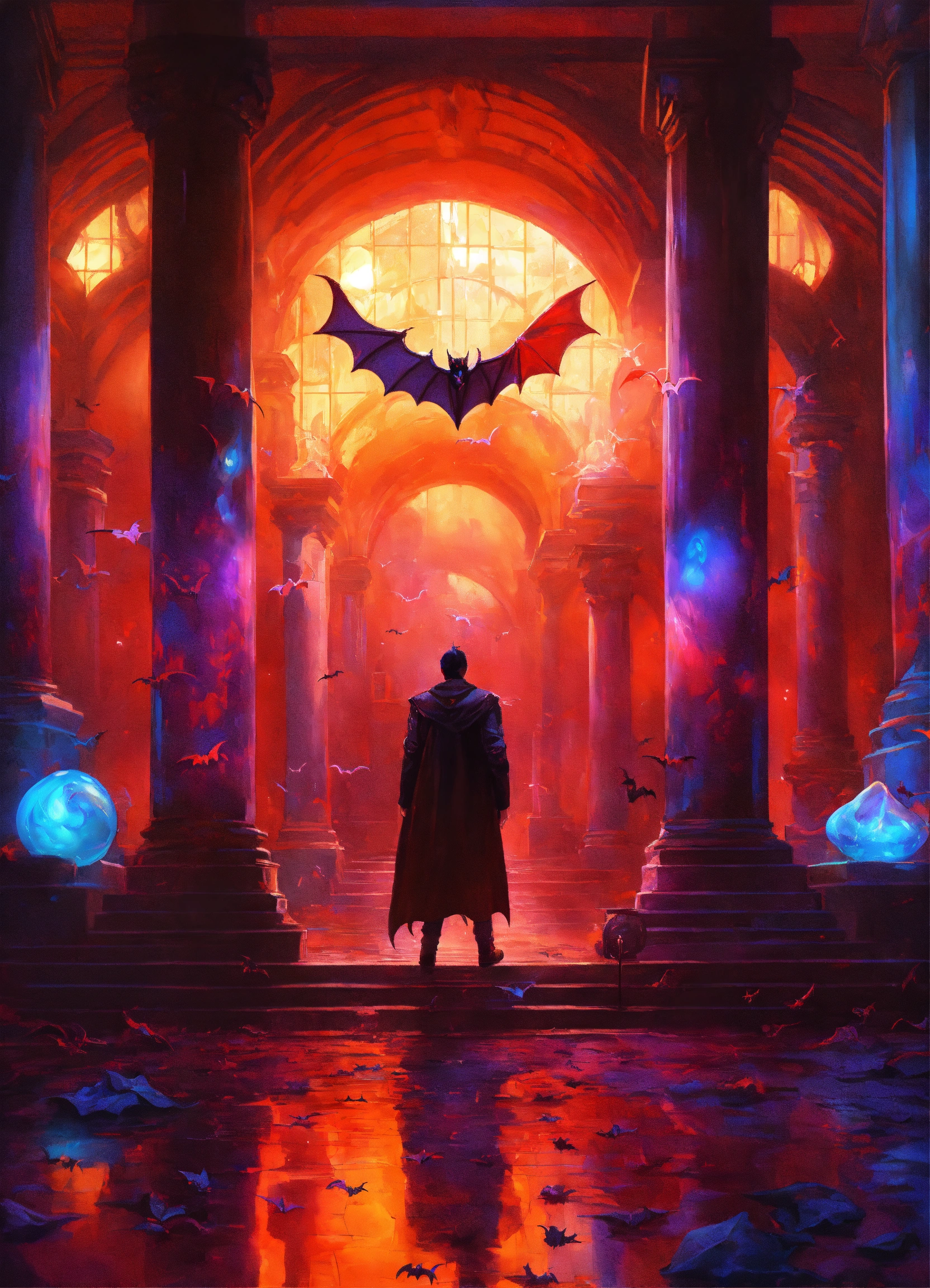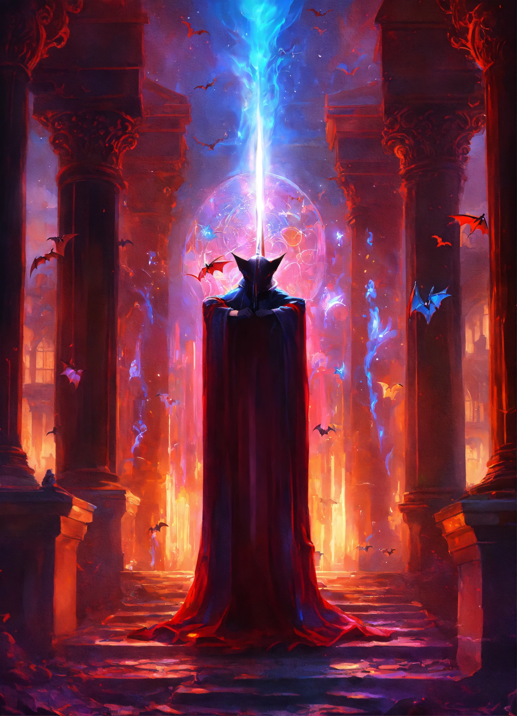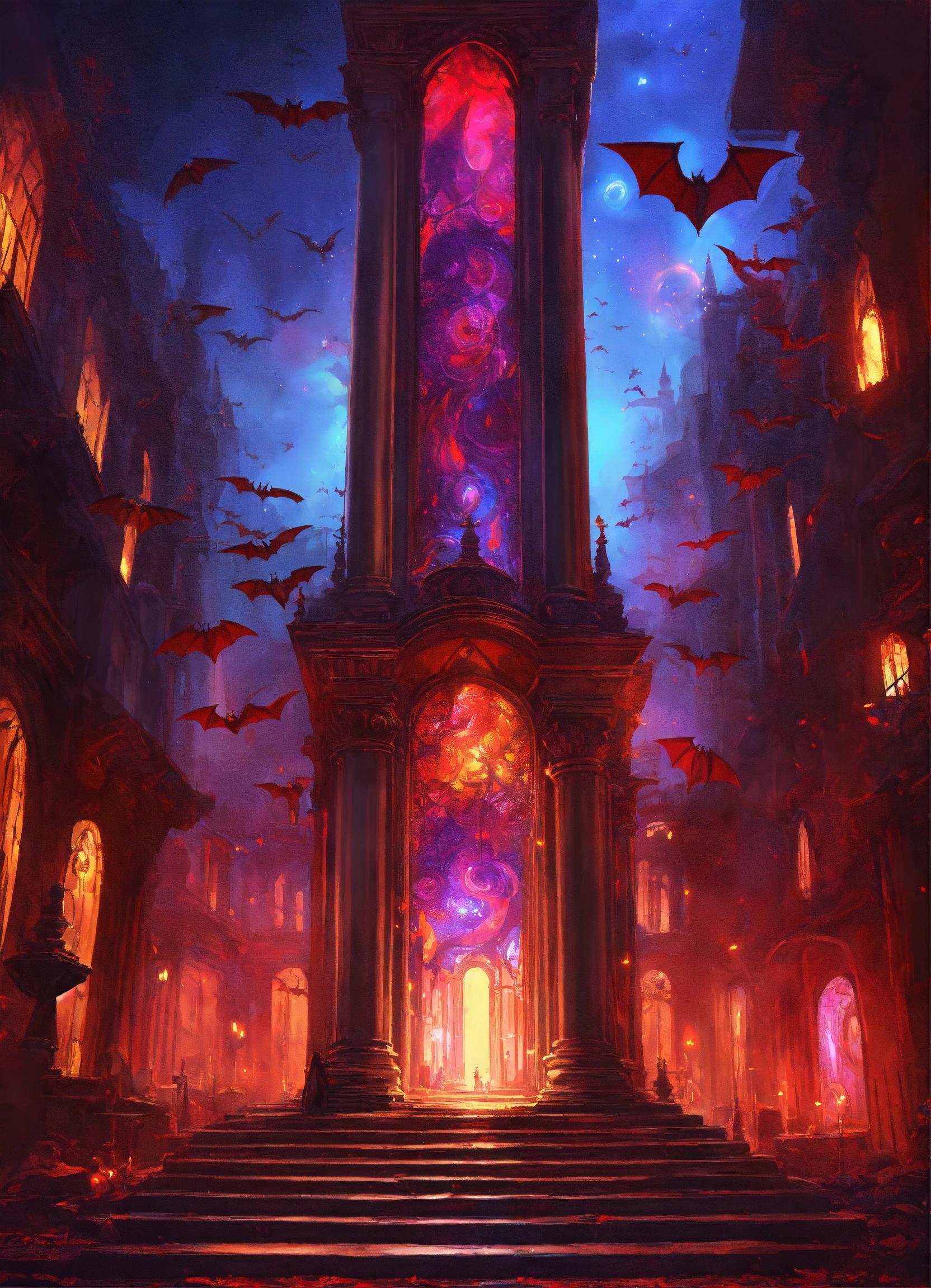 All glassblowing superrealism style urban vampire style only one vampire, huge sword in the center, strong light beam in spiral around multicolored lights rubis stone many bats flying astral realm interdimensional palace columns some flying little bats outdoor red purple blue glow feeling