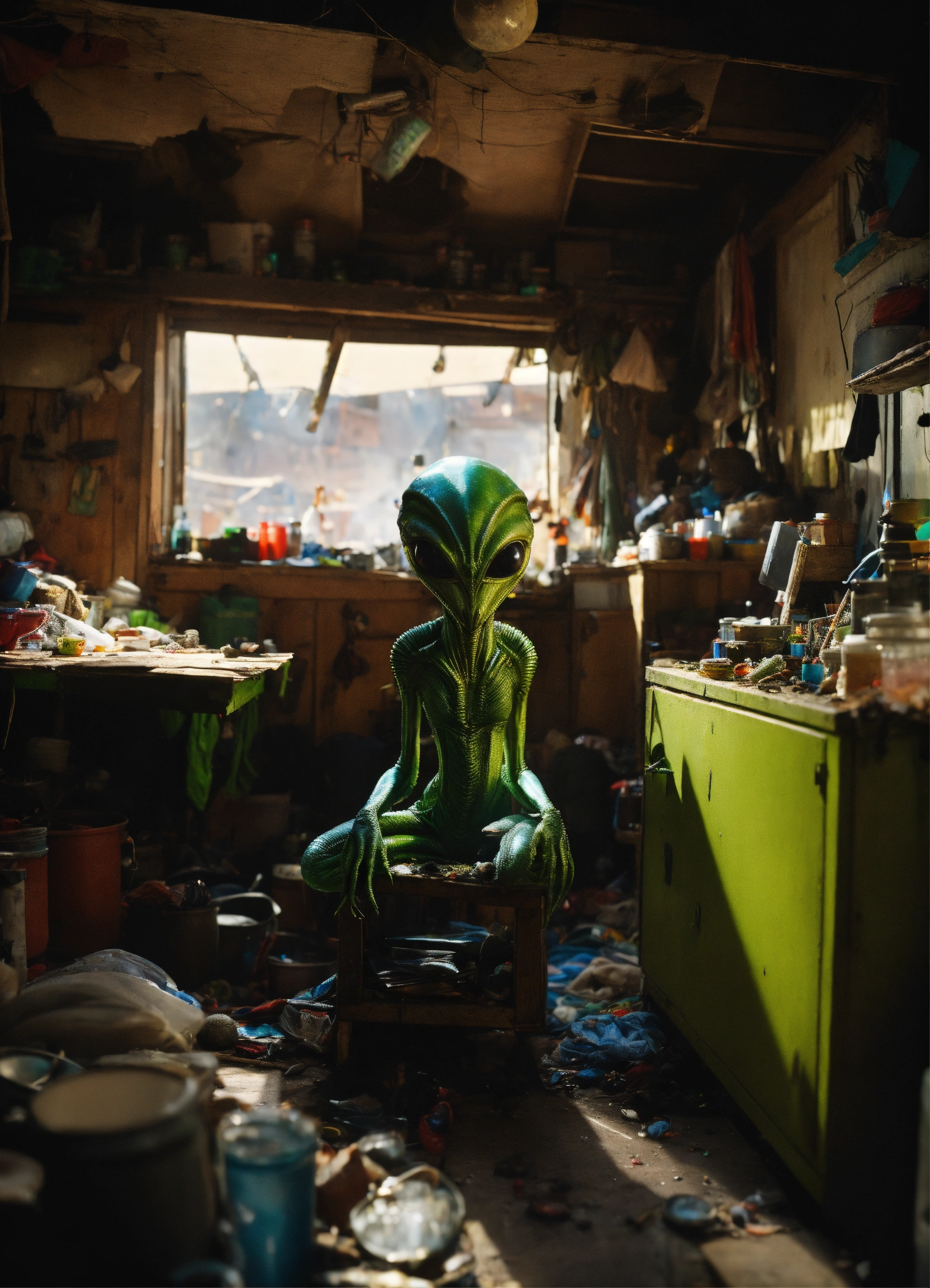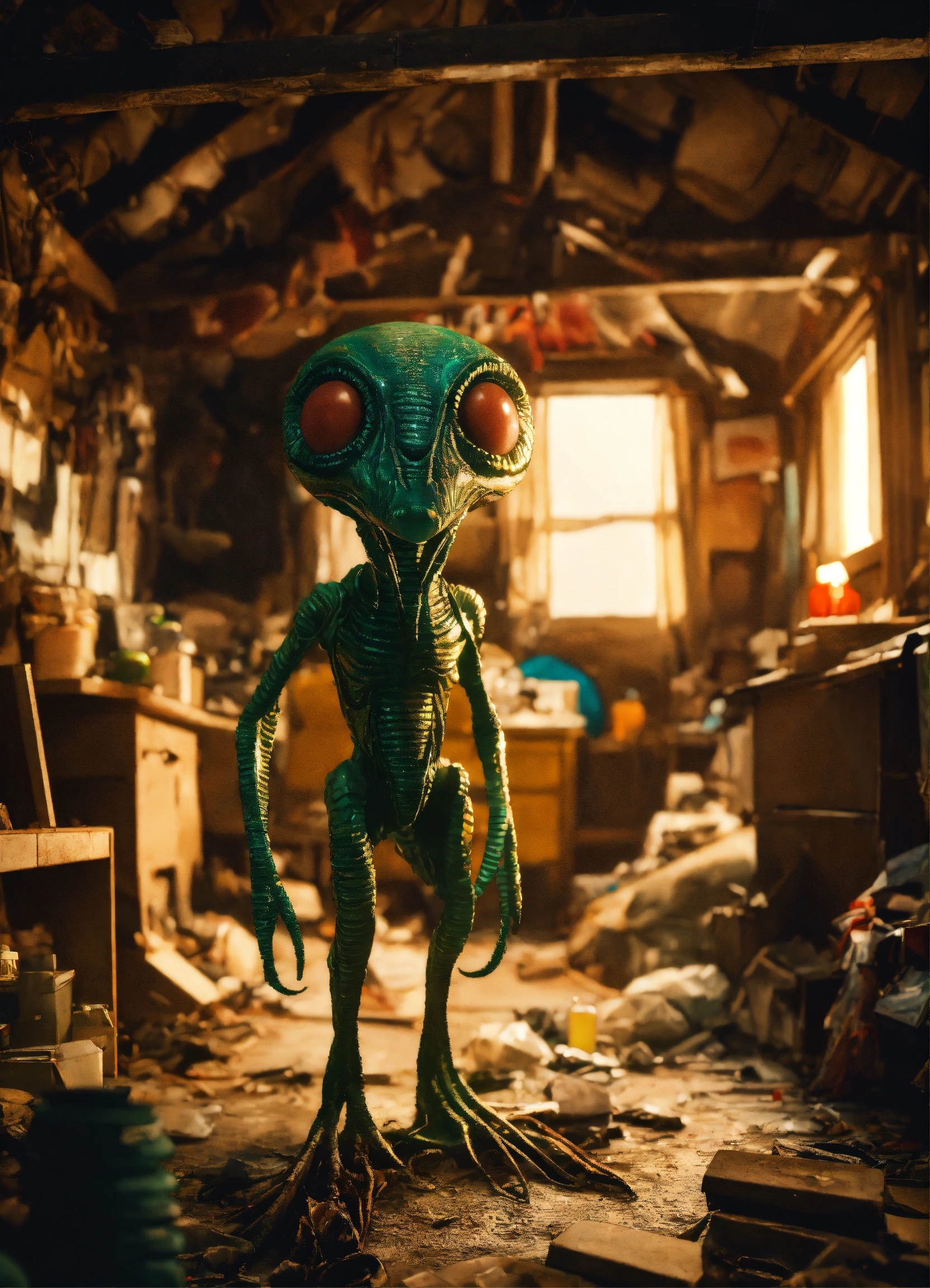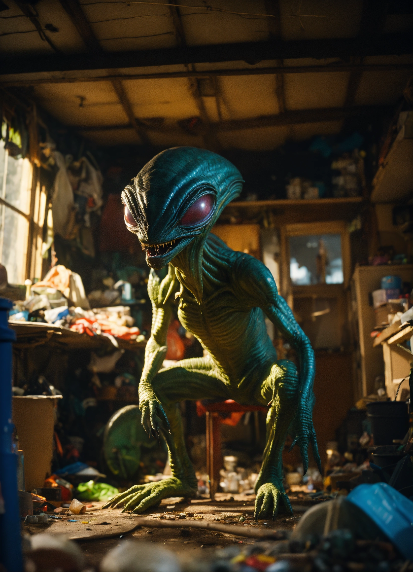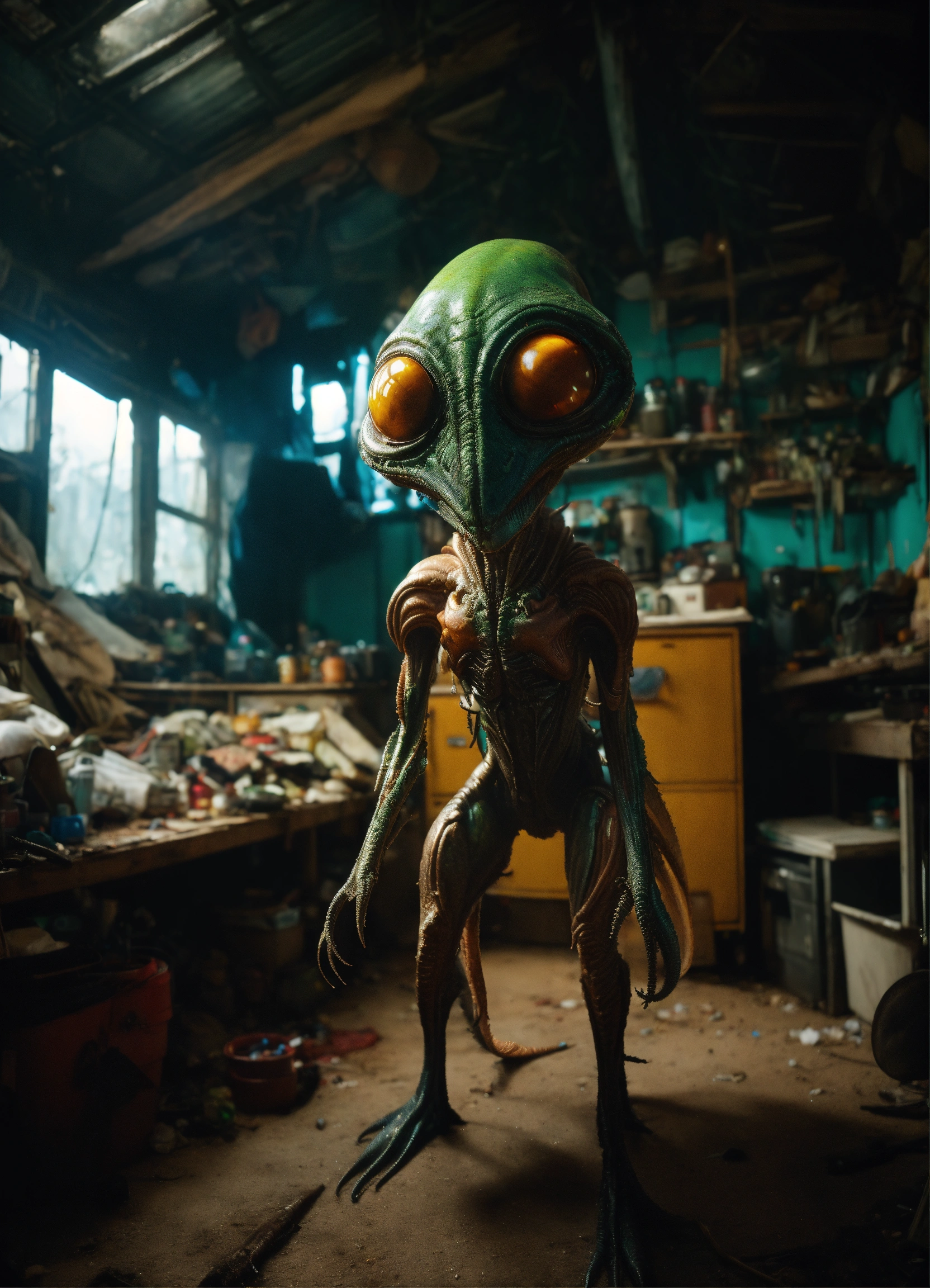 Wide angle environmental shot of alien creature in a cluttered and messy shack, chaotic shack in background. vibrant, photo realistic, realistic, dramatic, dark, sharp focus, 8k.