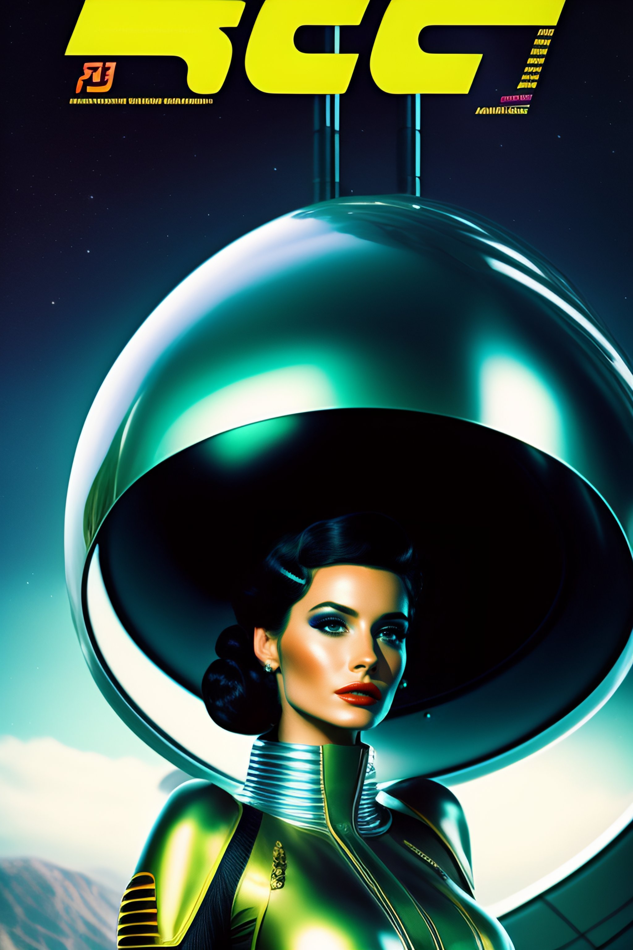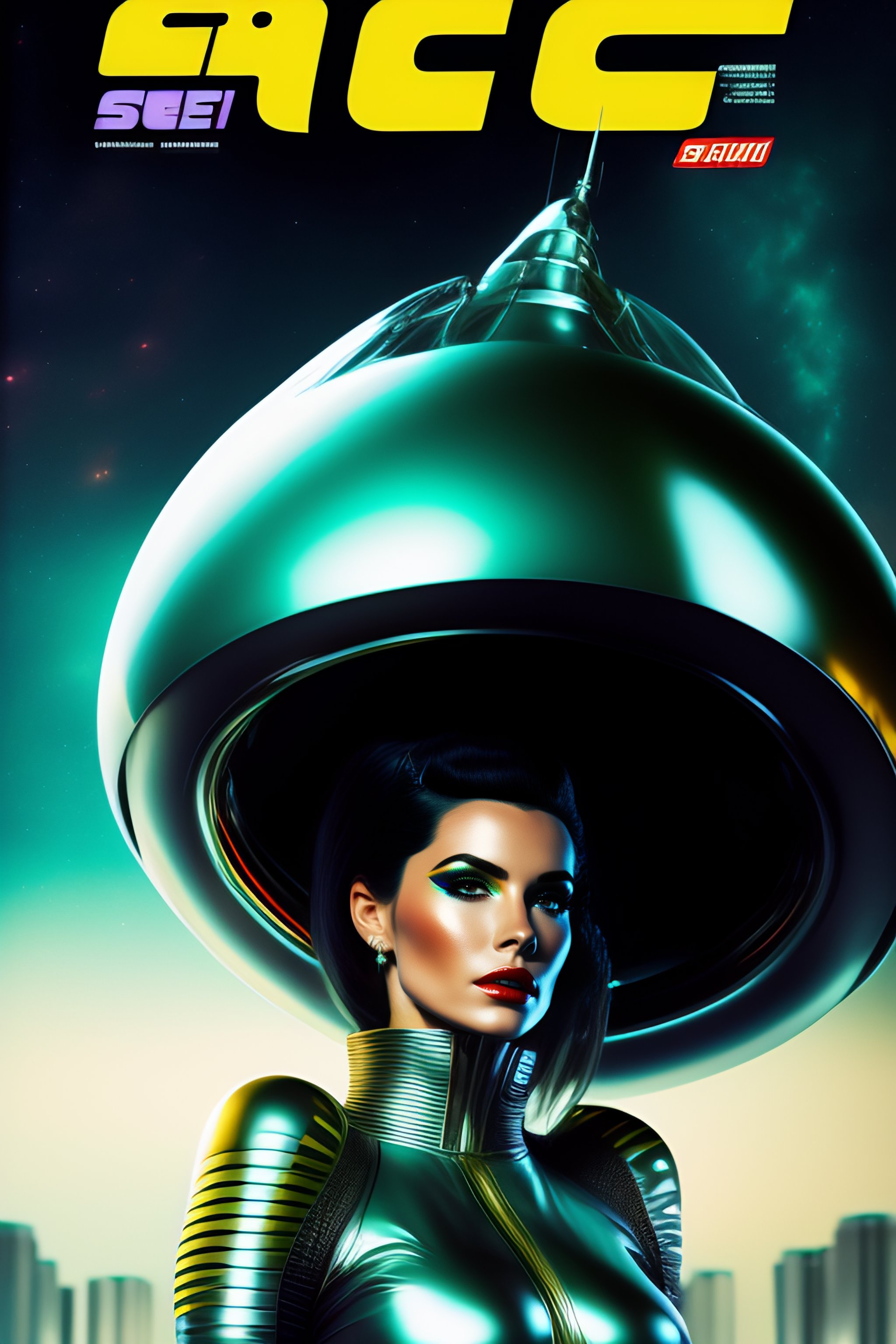 Young woman in latex costume with alien, retro sci-fi, retro futuristic, alien stripe, ufo, magazine scan, spaceport in background, cyberpunk