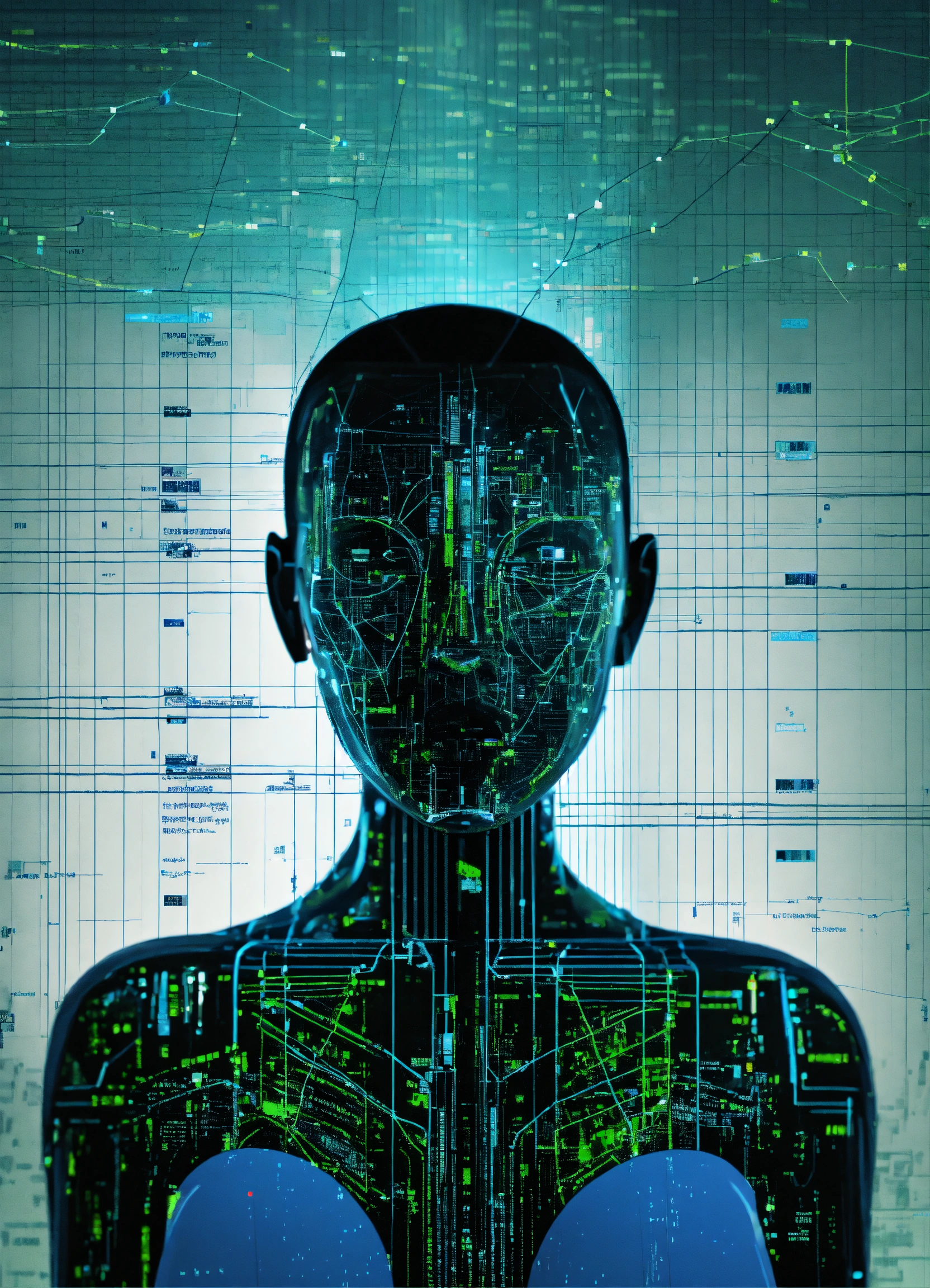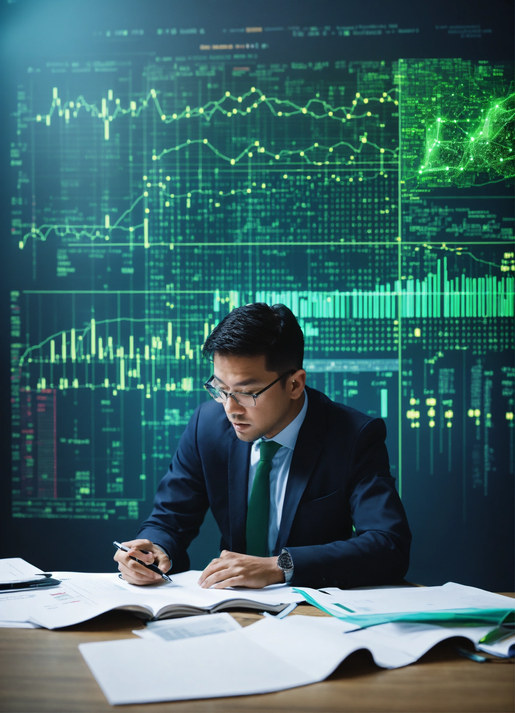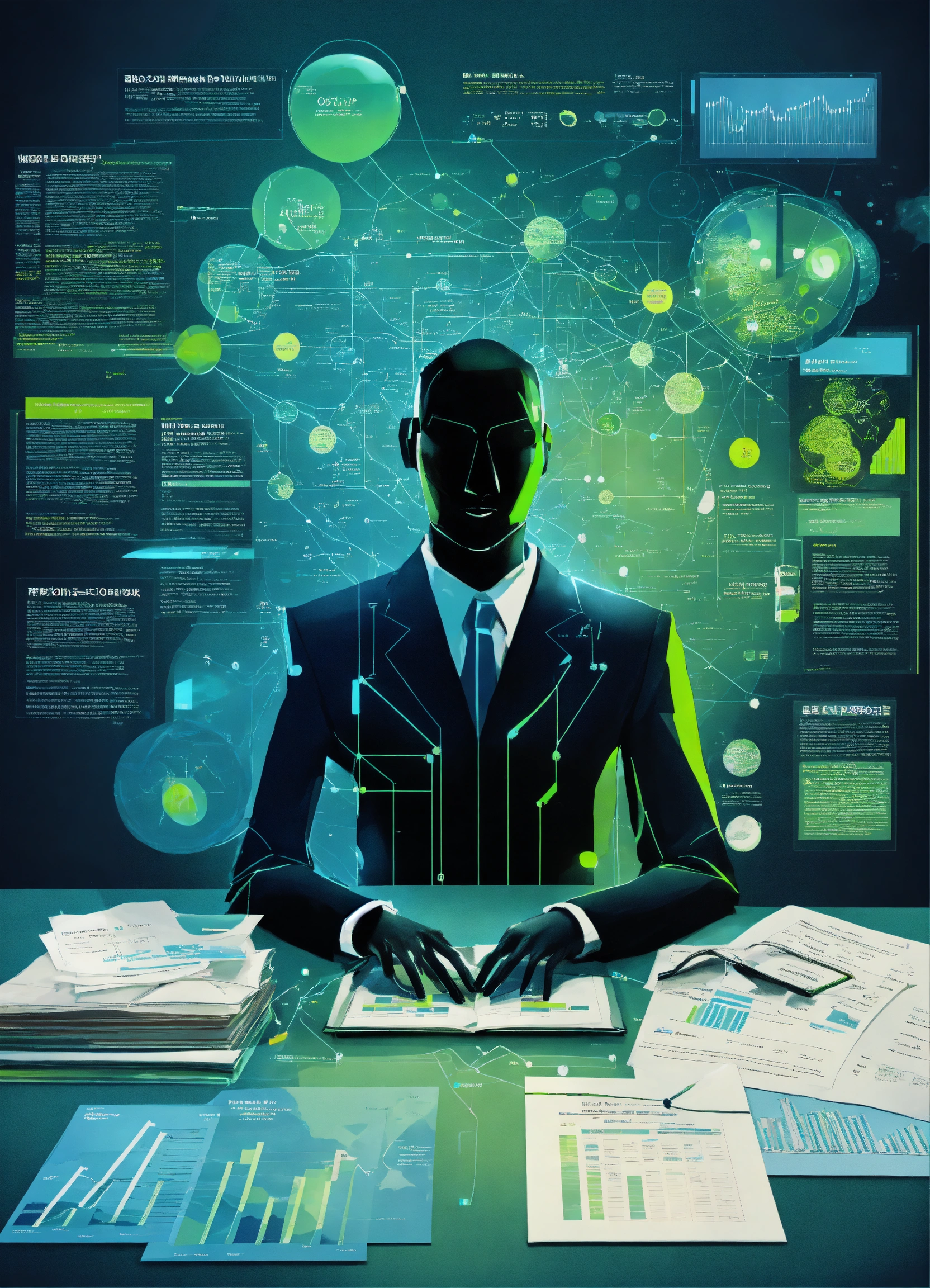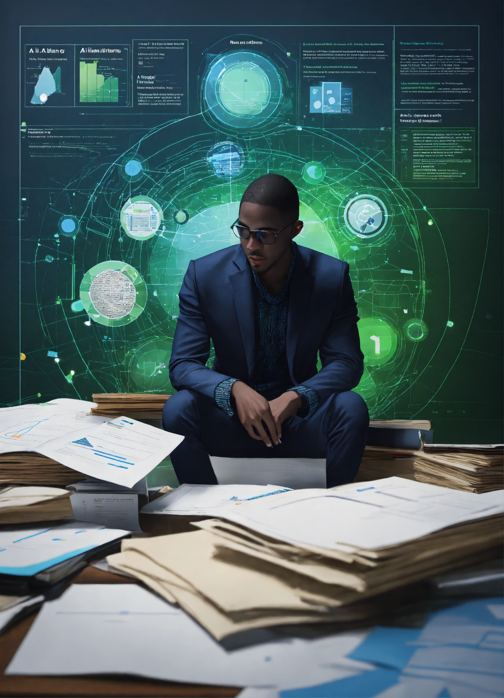Ai is surrounded by research papers, market research, data and graphs. black, blues and greens. conceptual