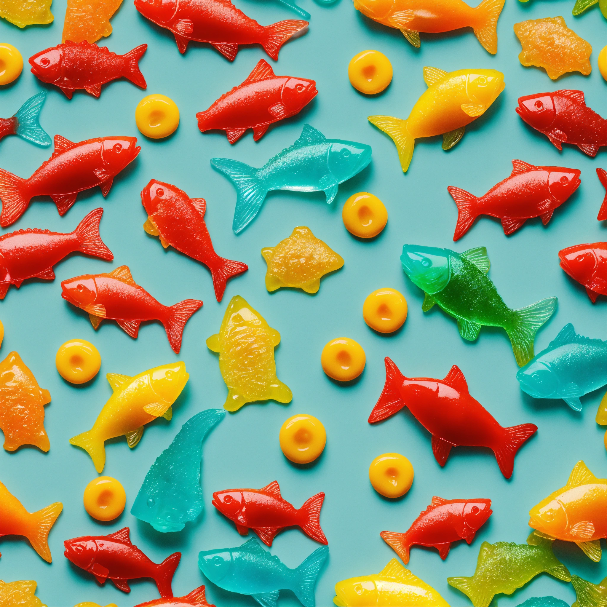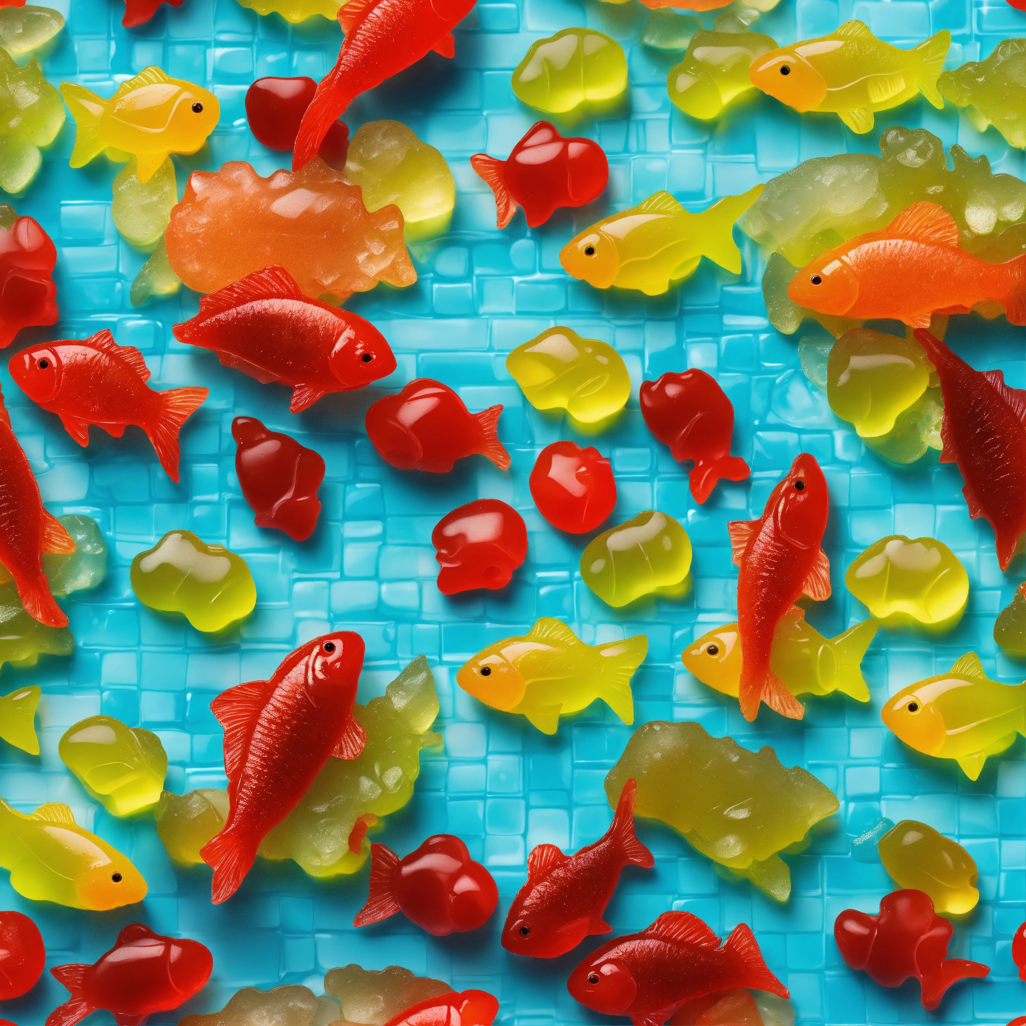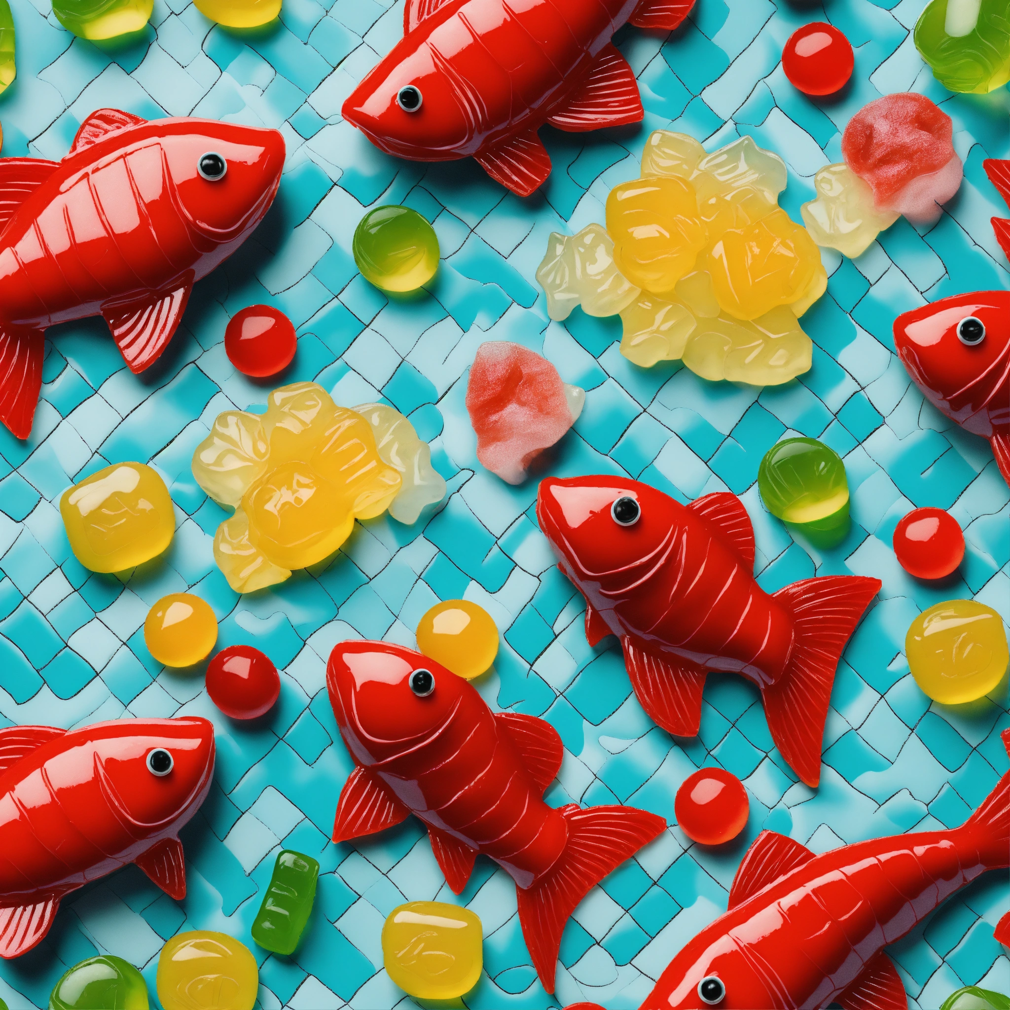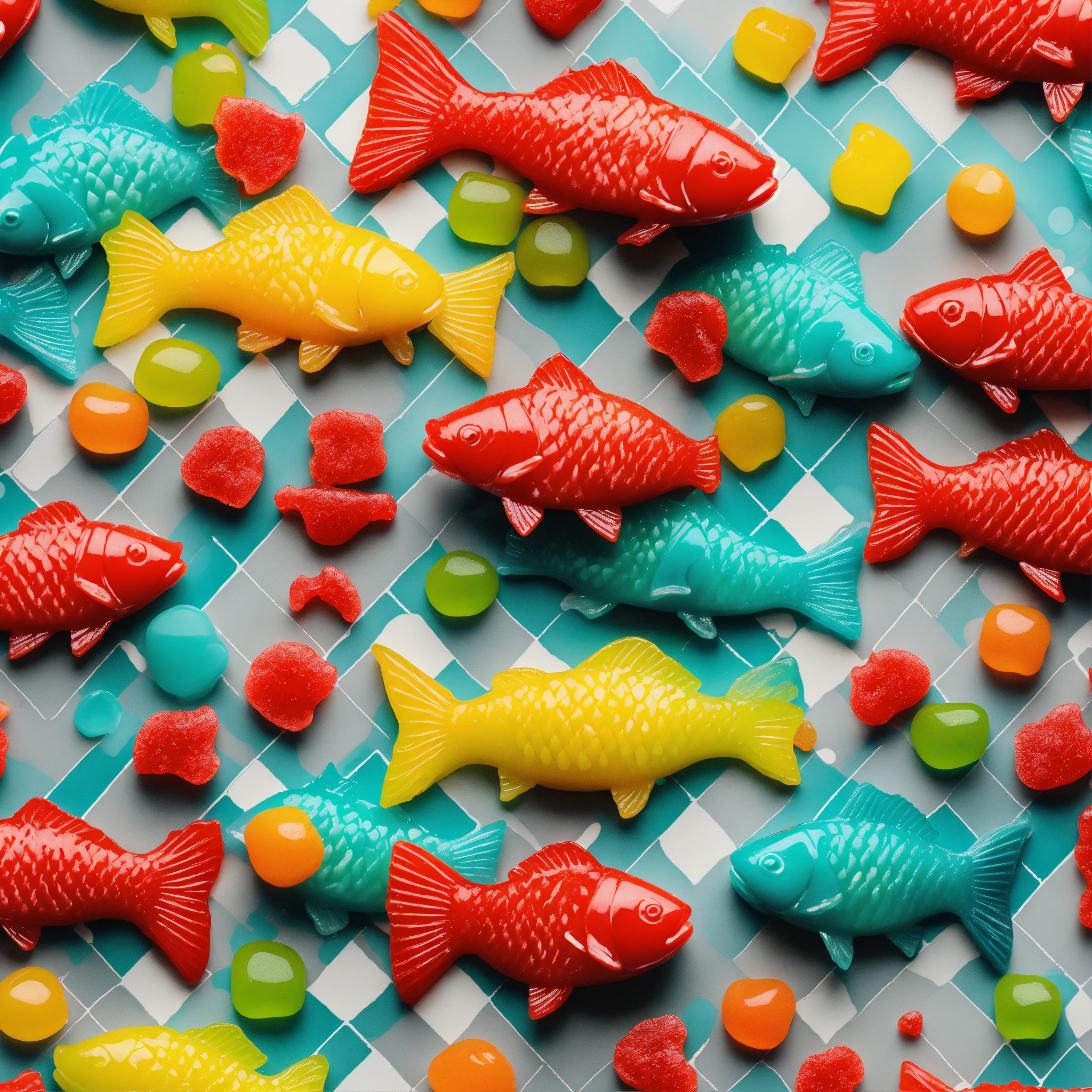 Repeating pattern of 3d hd hyper realistic swedish fish and gummy bears scattered and overlaid on a cartoonish checked grey and turquoise background